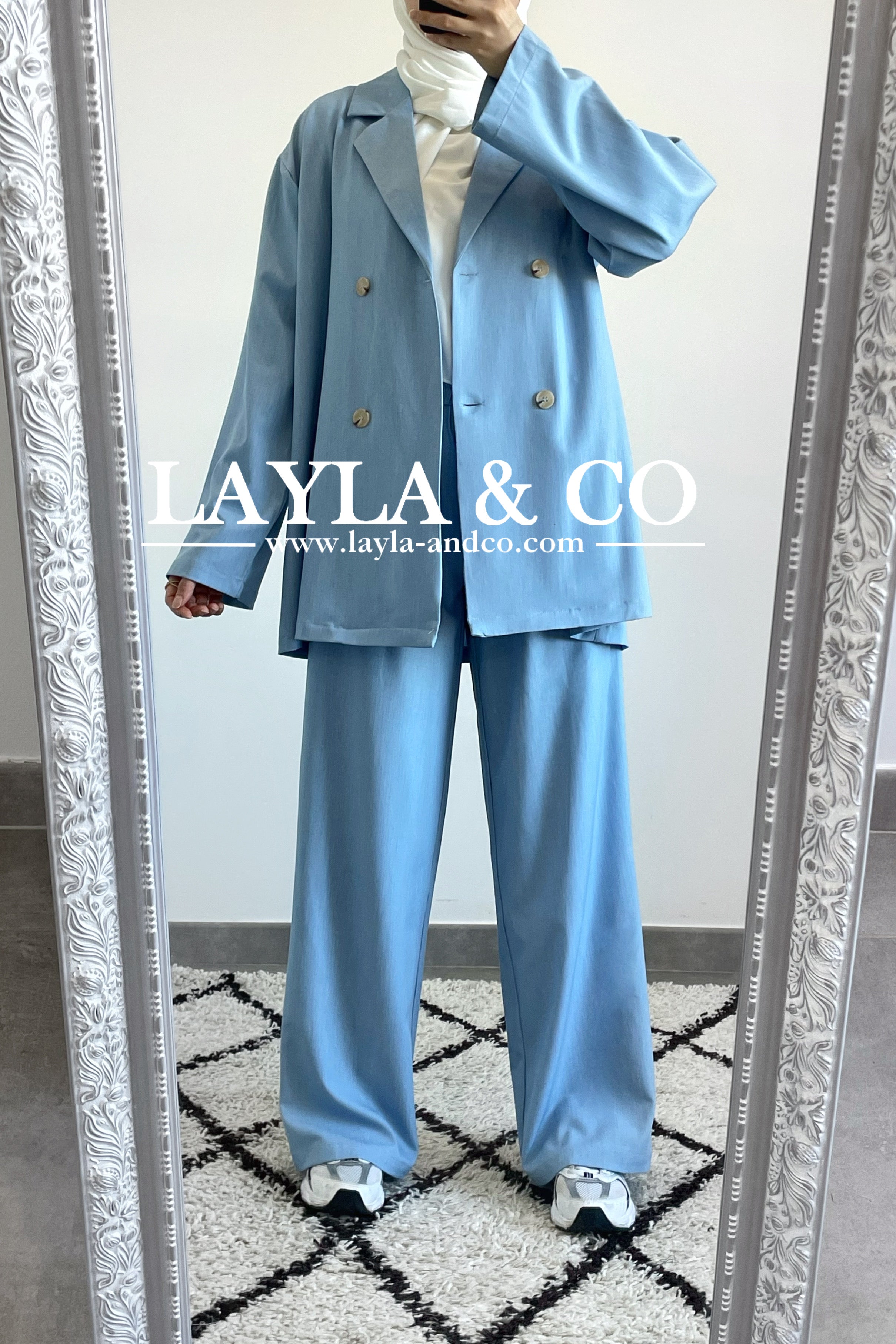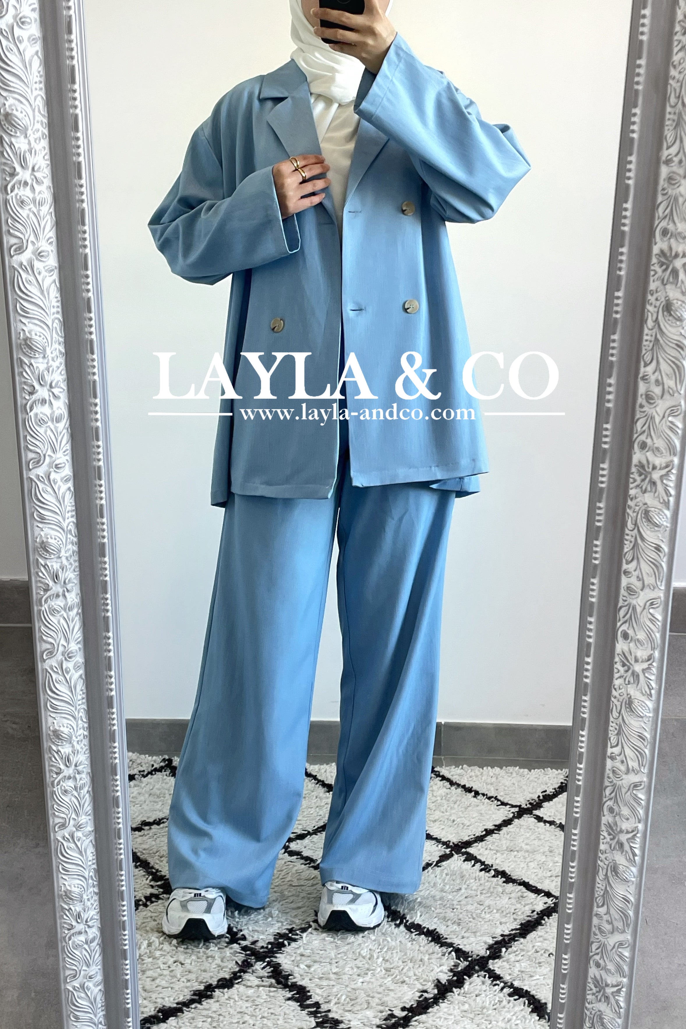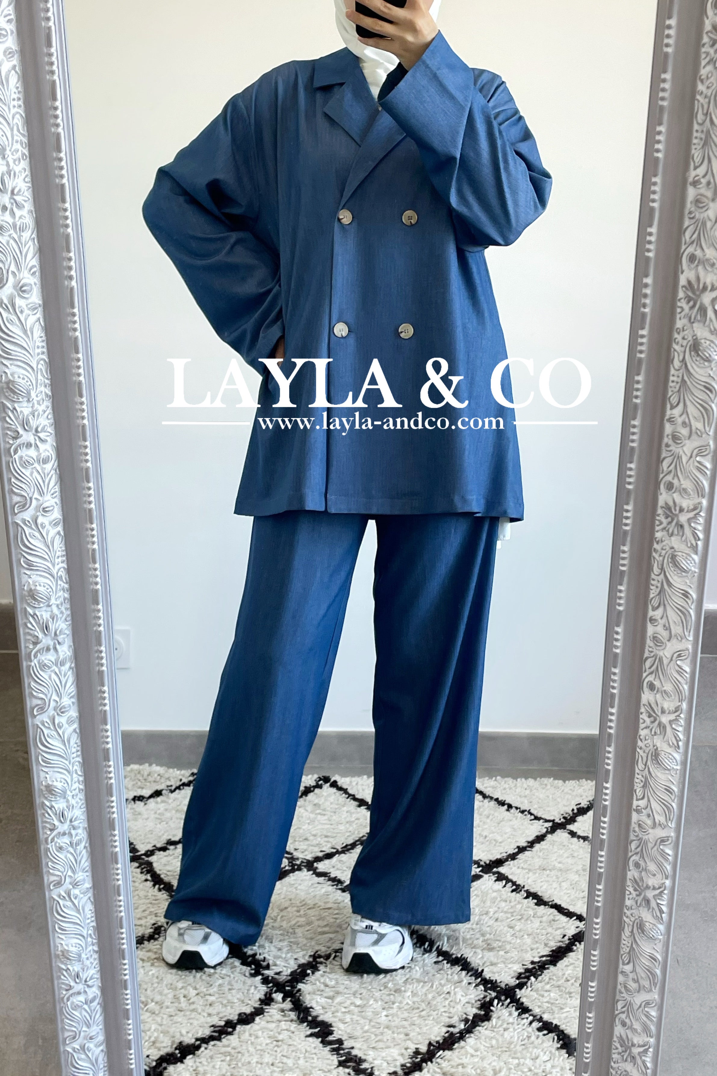 Ensemble blazer et pantalon large en tissu effet jean fluide tencel. Le pantalon dispose d’un élastique à la taille et de pôches.
