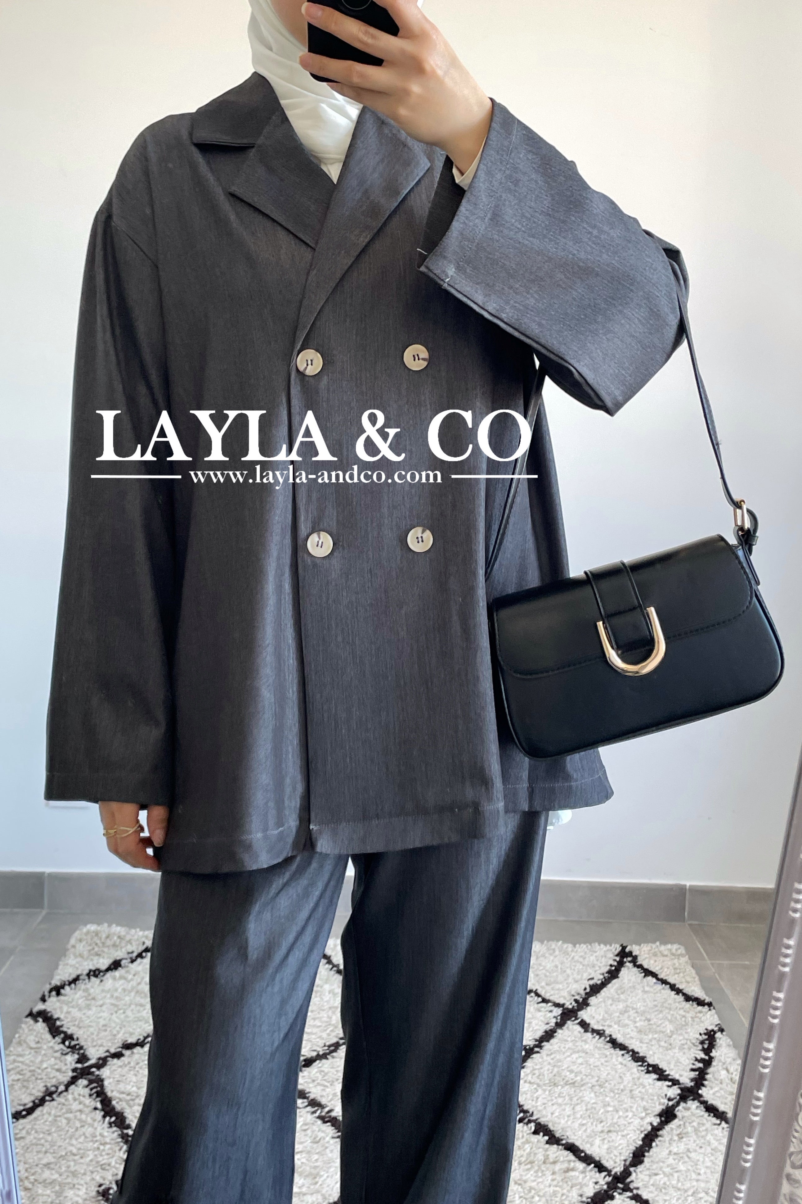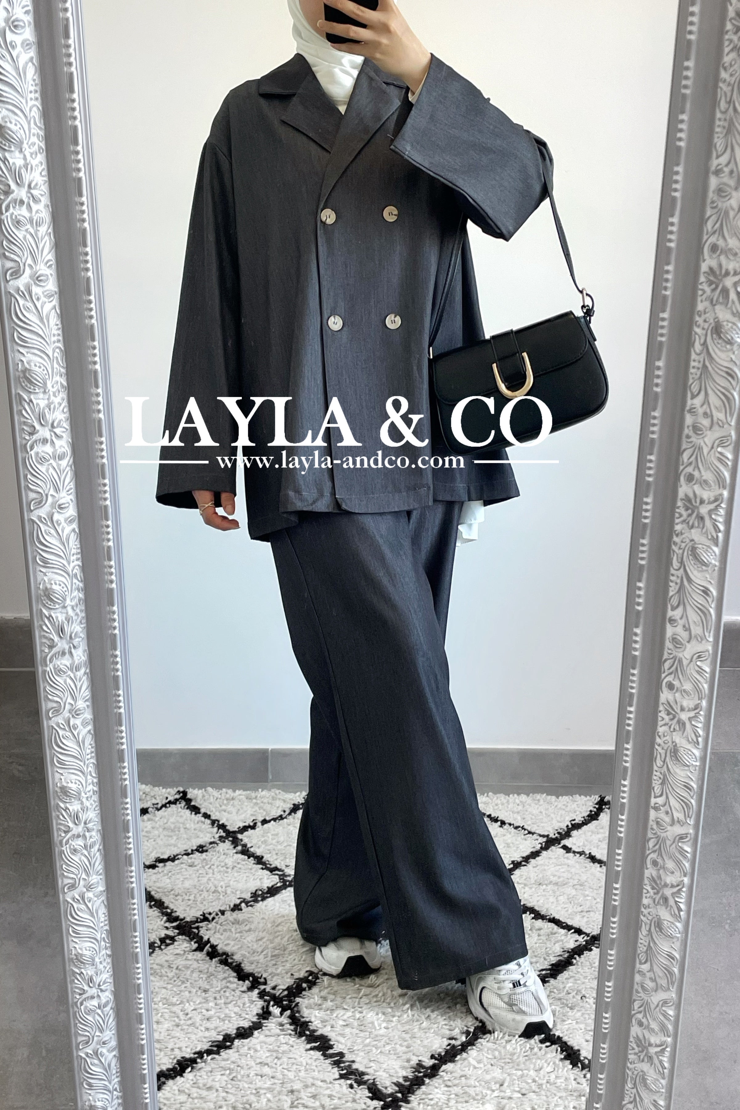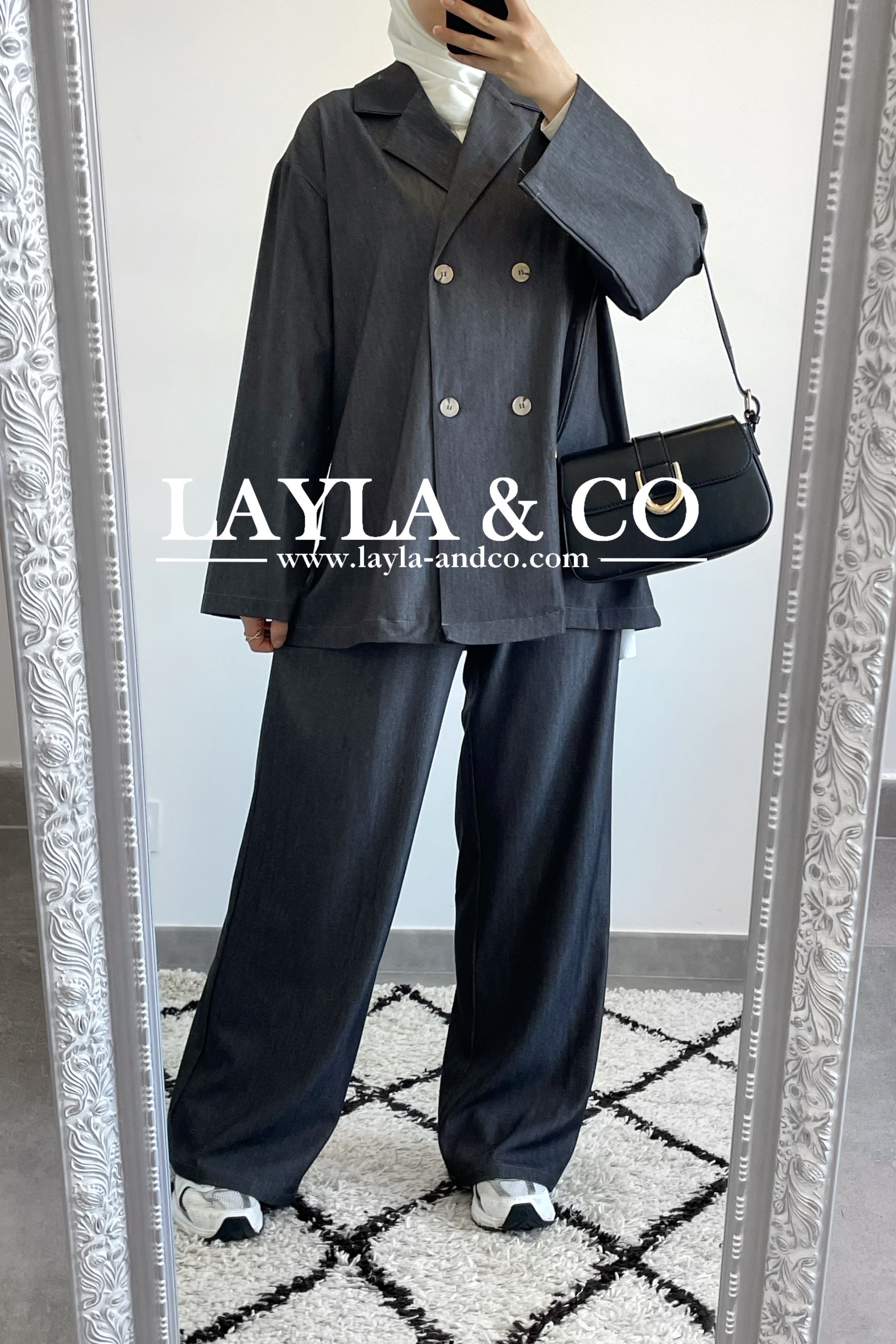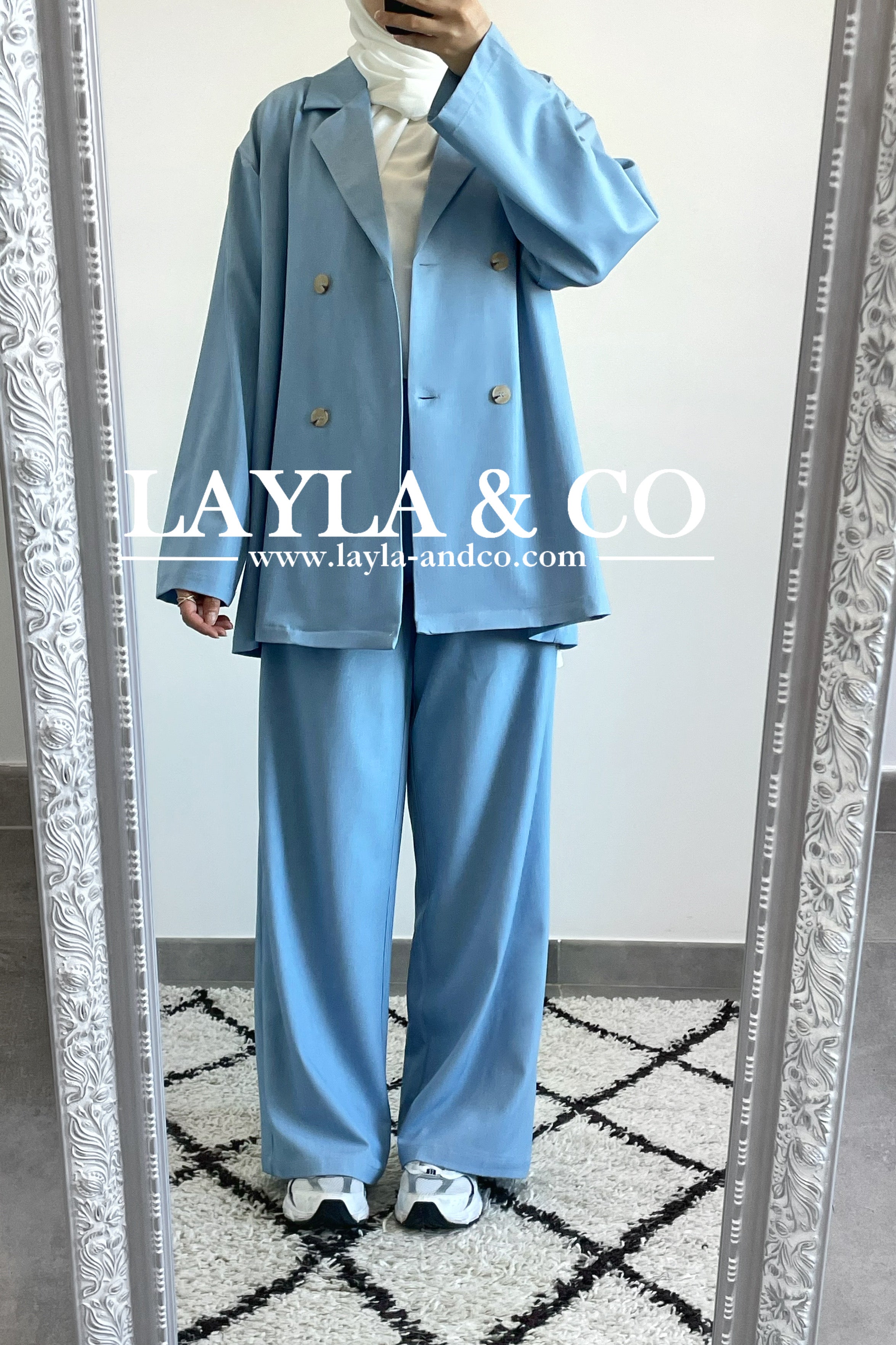 Ensemble blazer et pantalon large en tissu effet jean fluide tencel. Le pantalon dispose d’un élastique à la taille et de pôches.