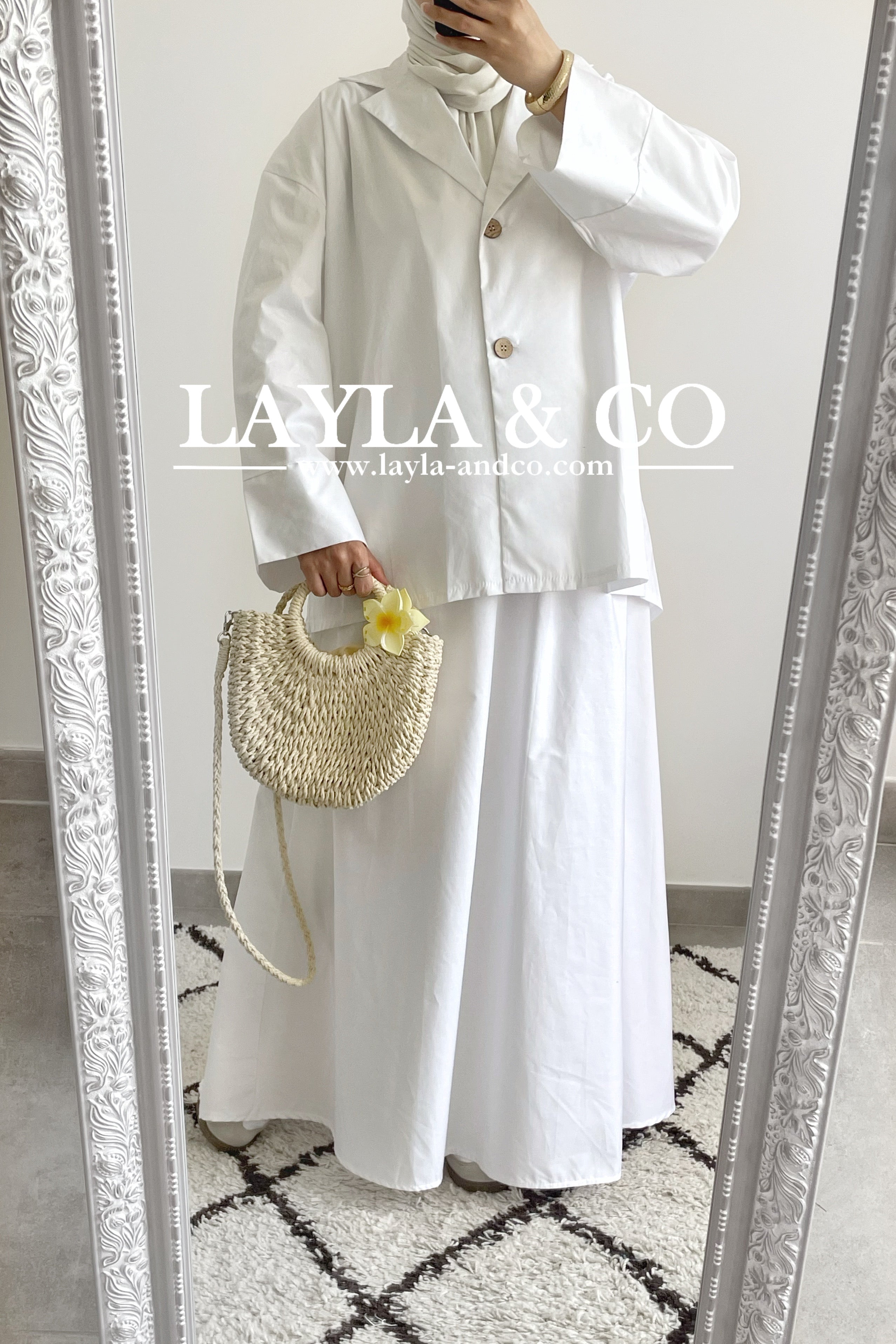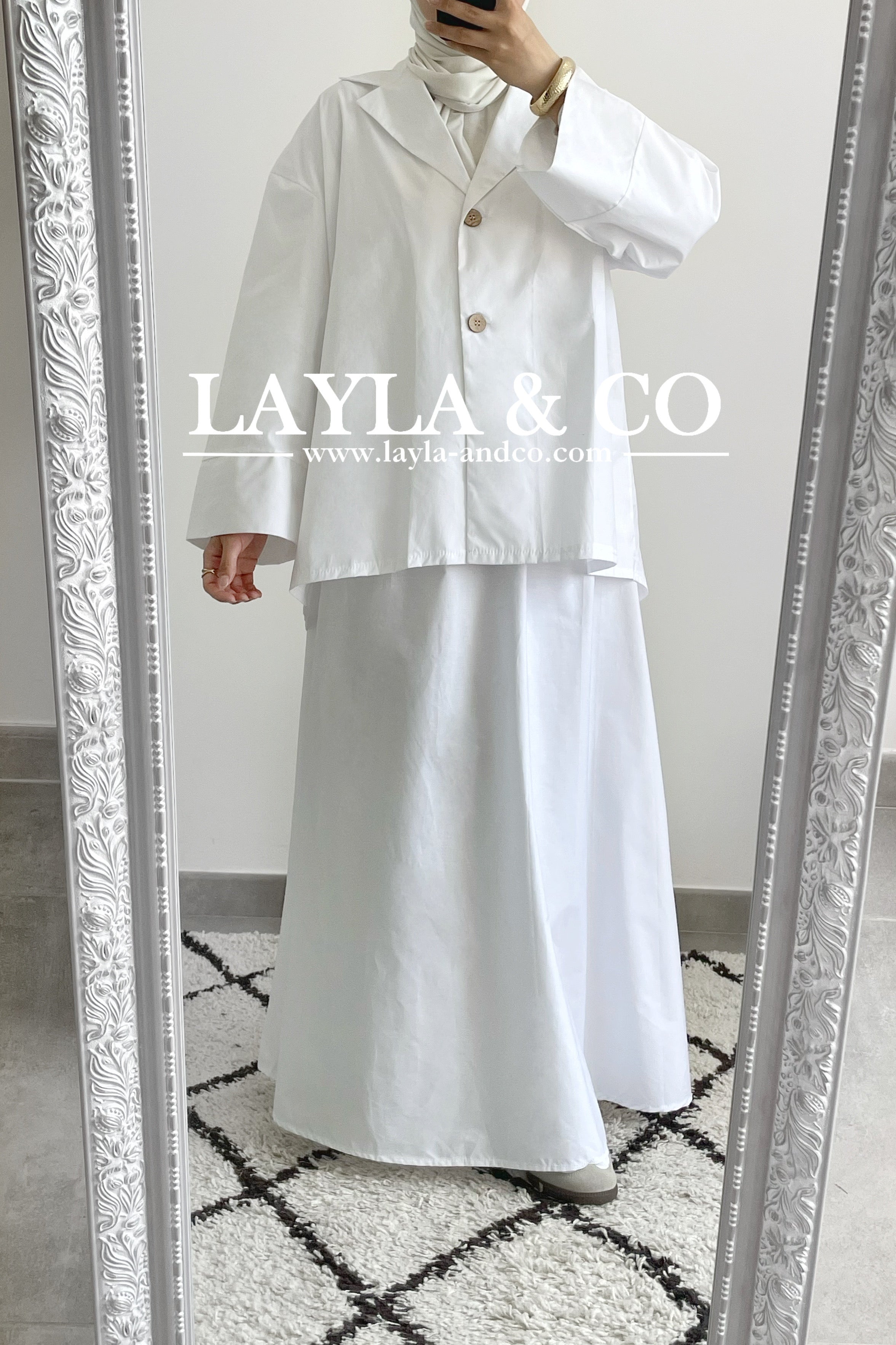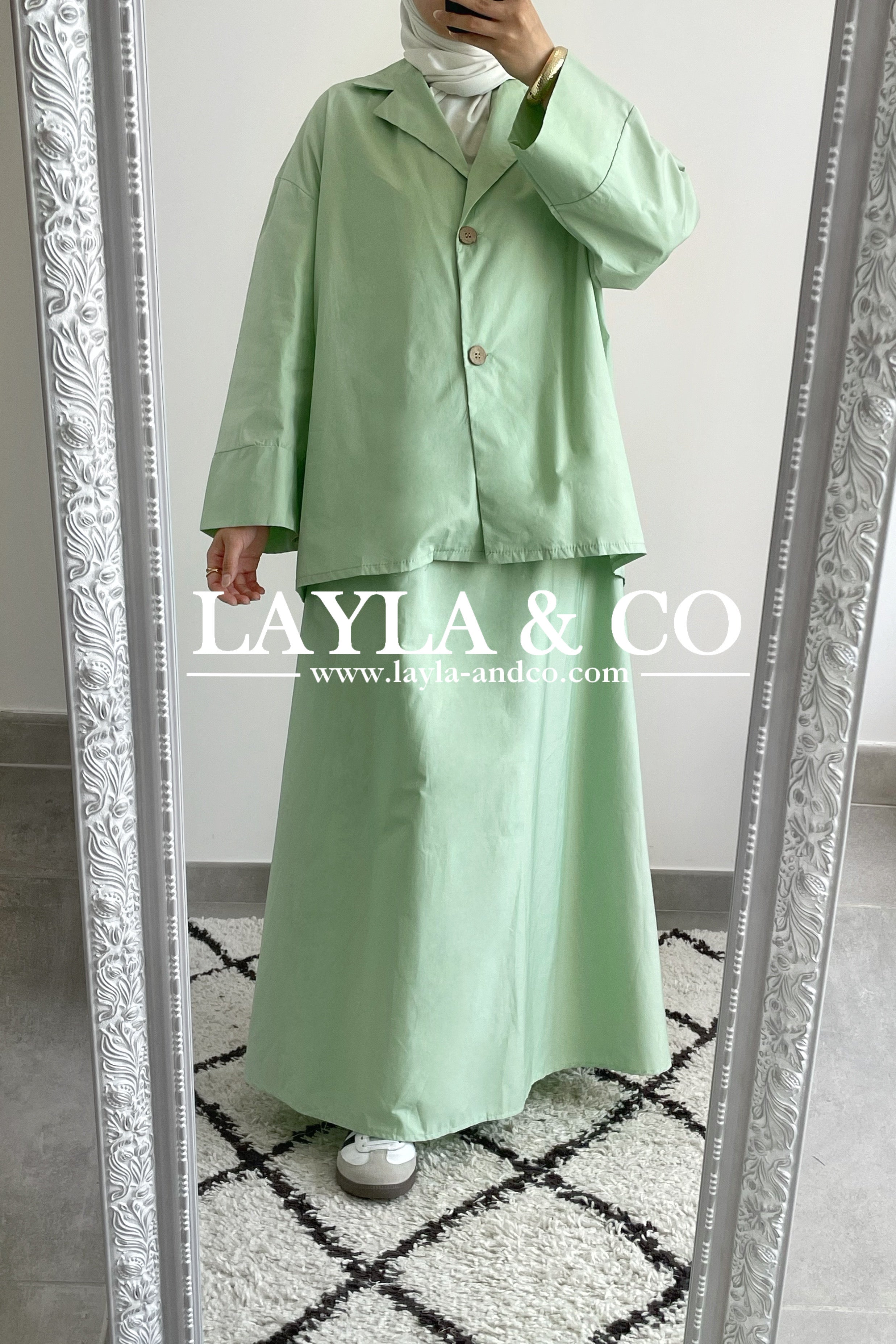 Ensemble 2 pièces composé d’un blazer avec boutons en bois et d’une jupe assortie. La jupe est élastique à la taille et dispose de pôches.