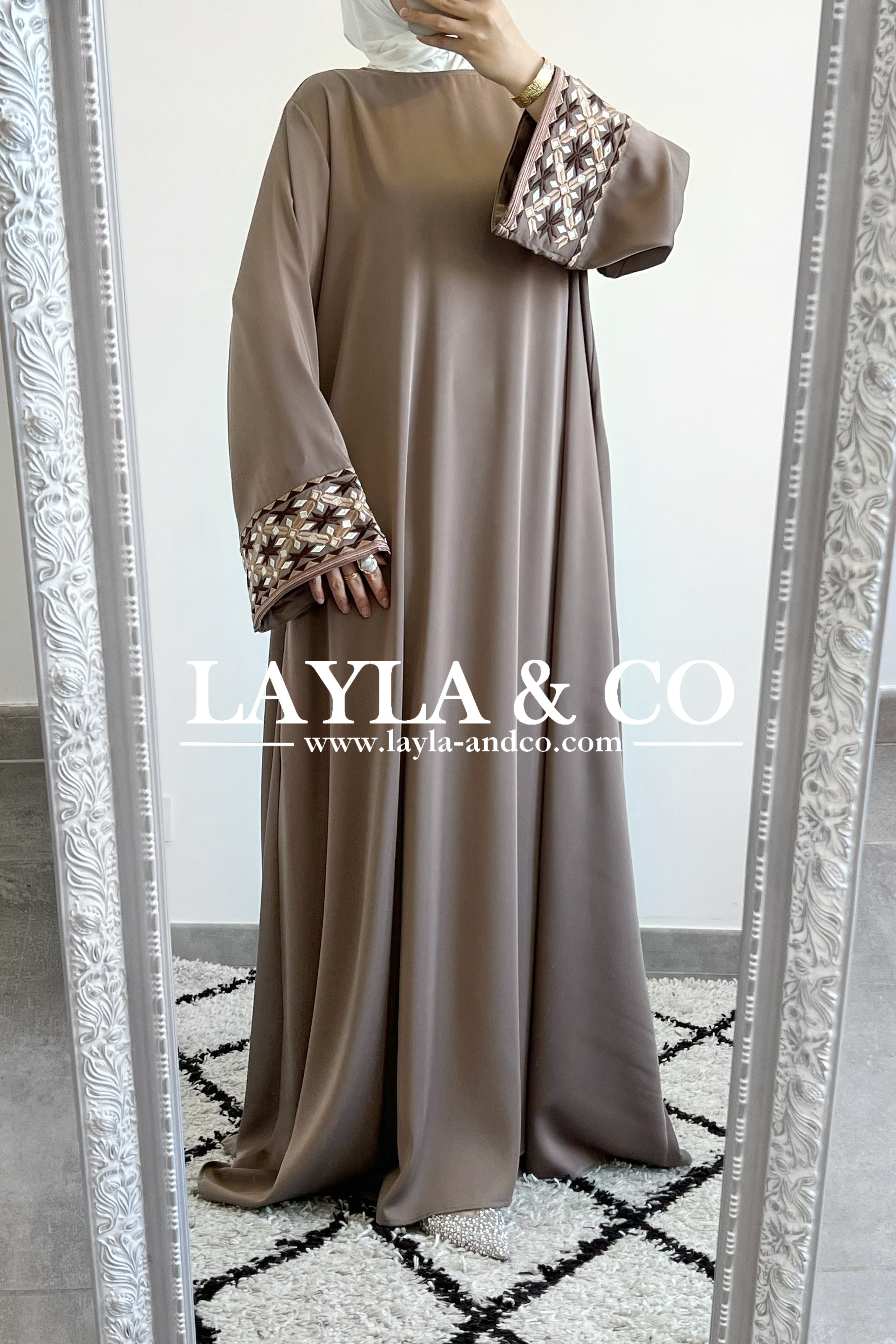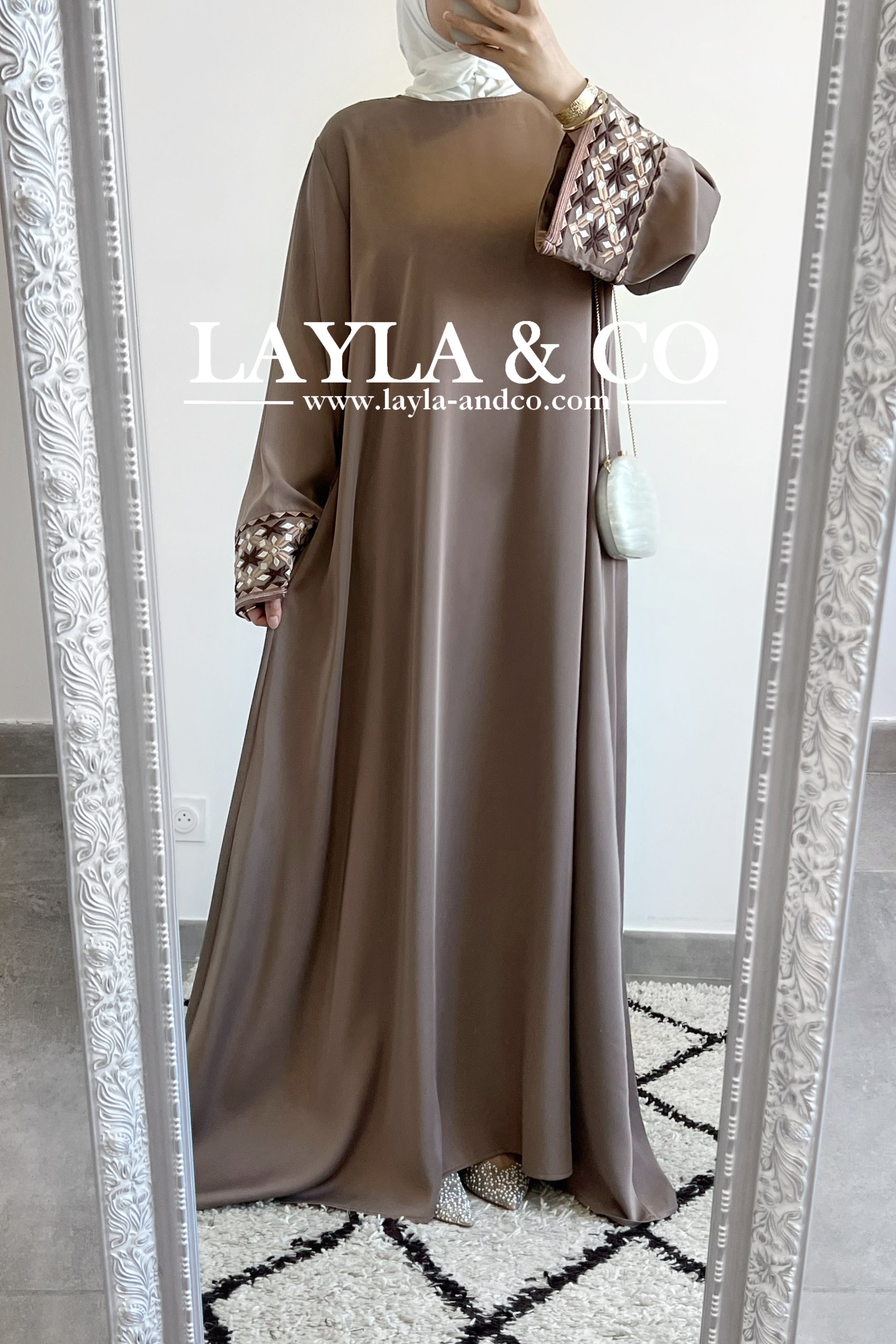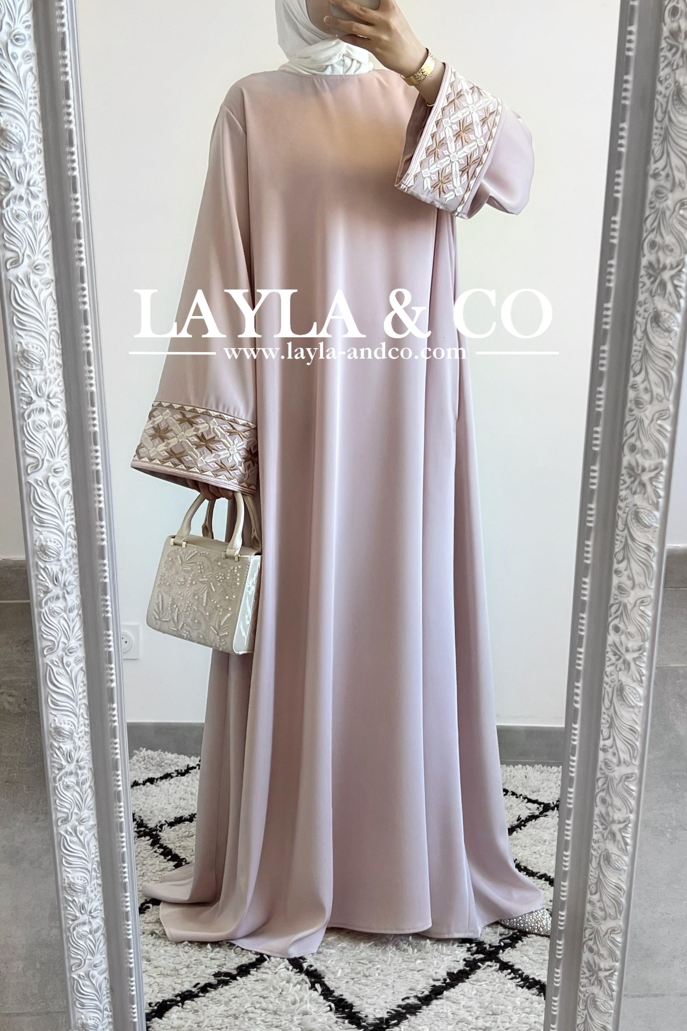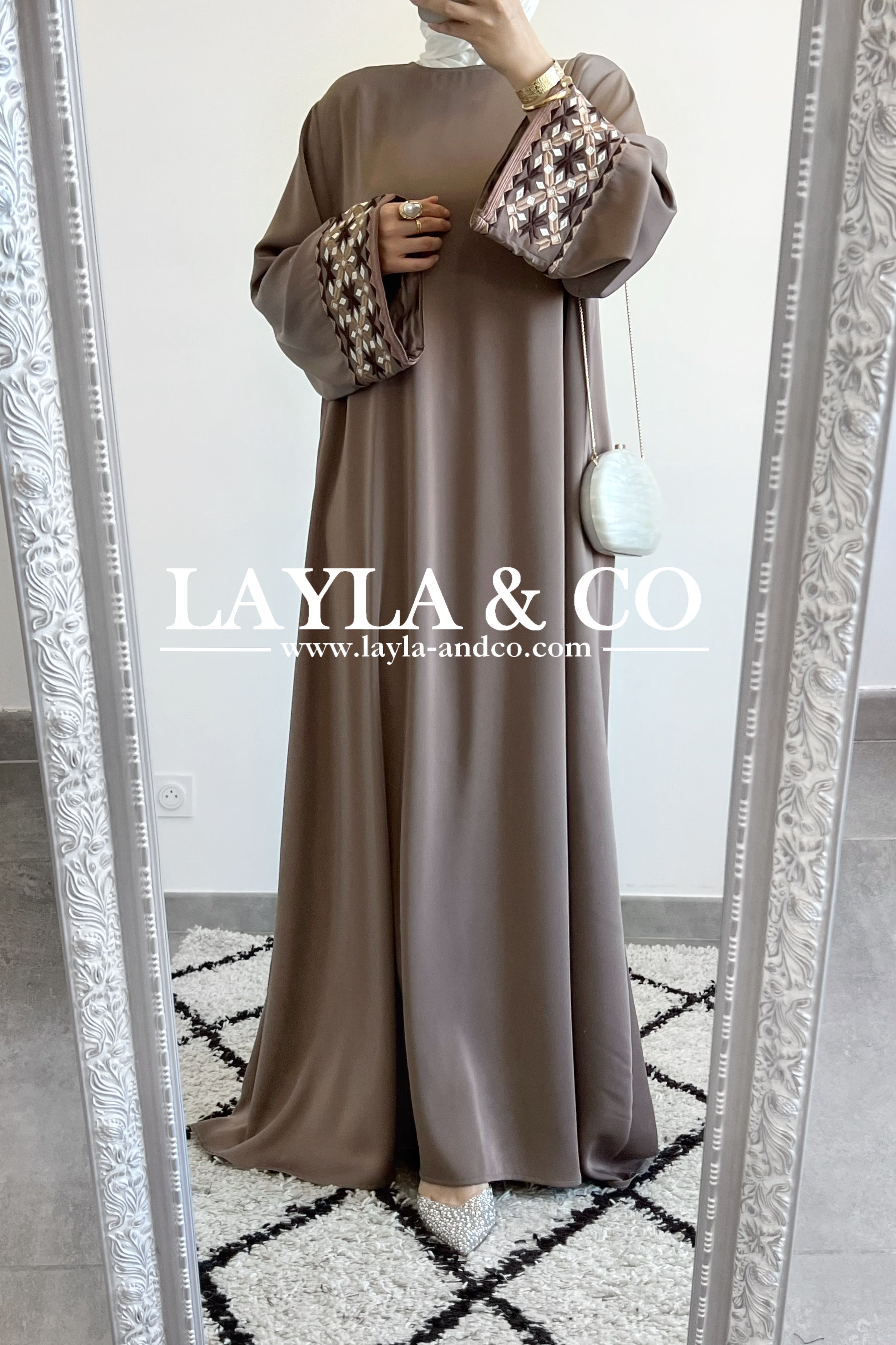 Abaya satinée qualité supérieure avec manches à broderie. Coupe évasée.