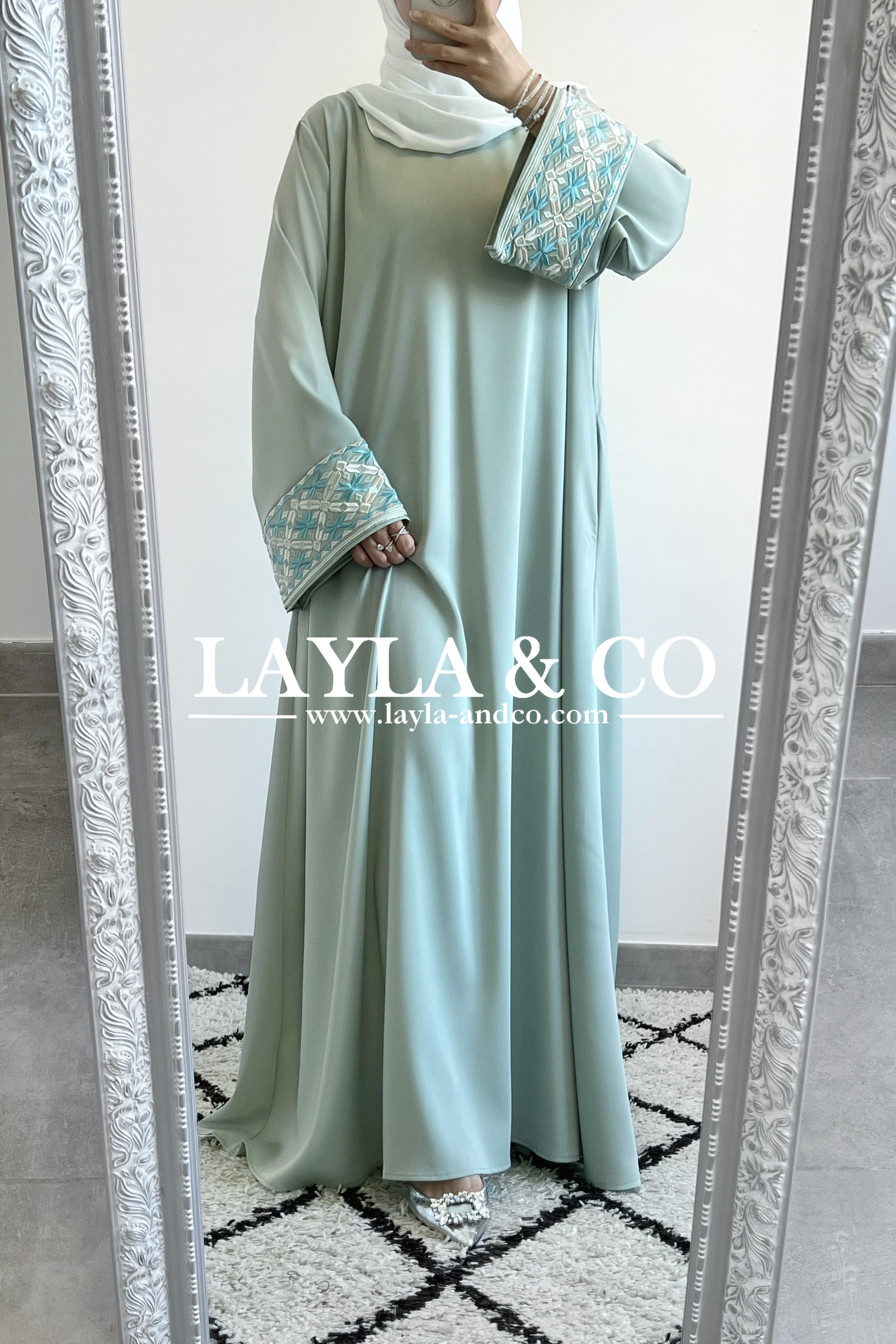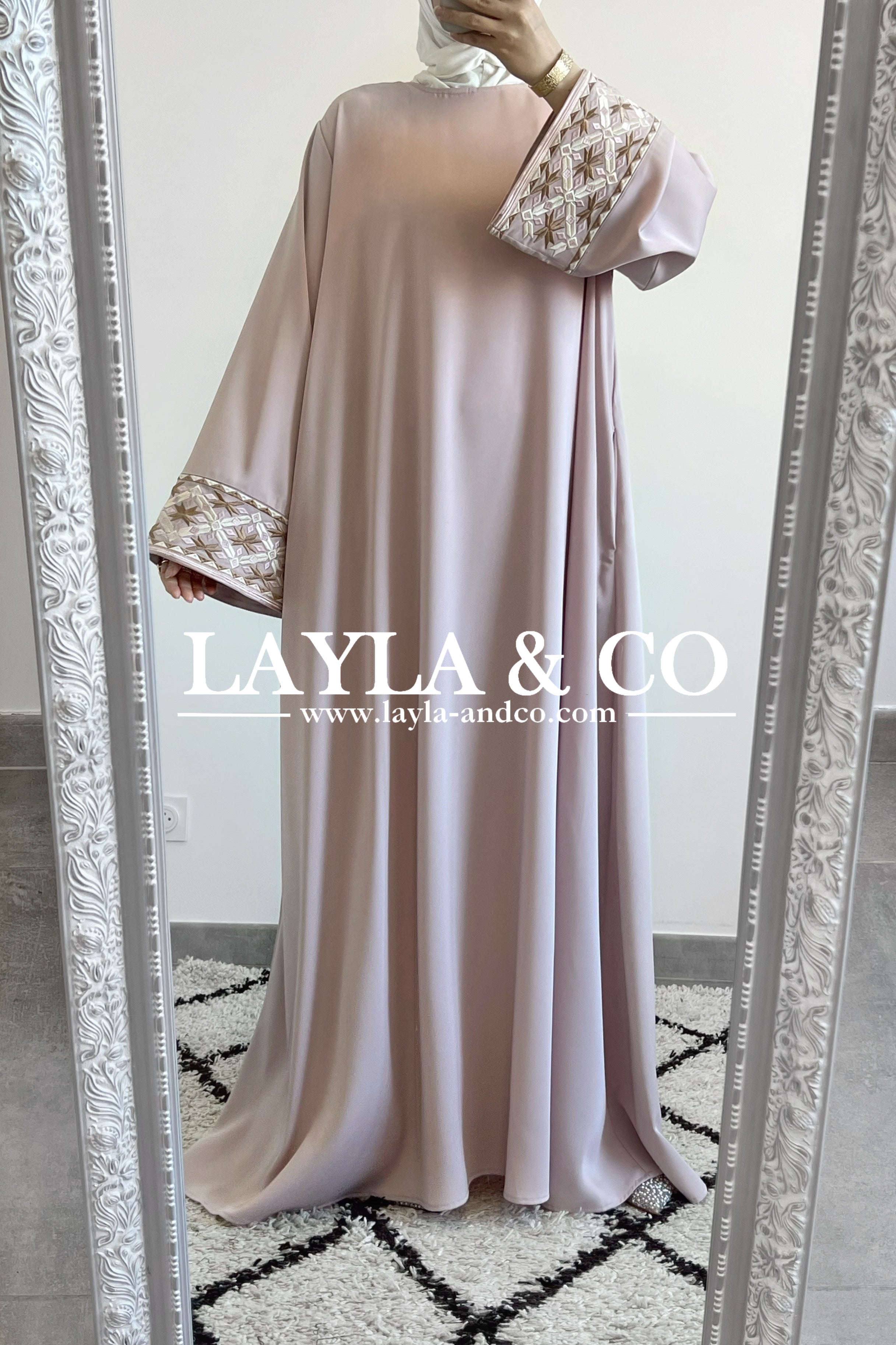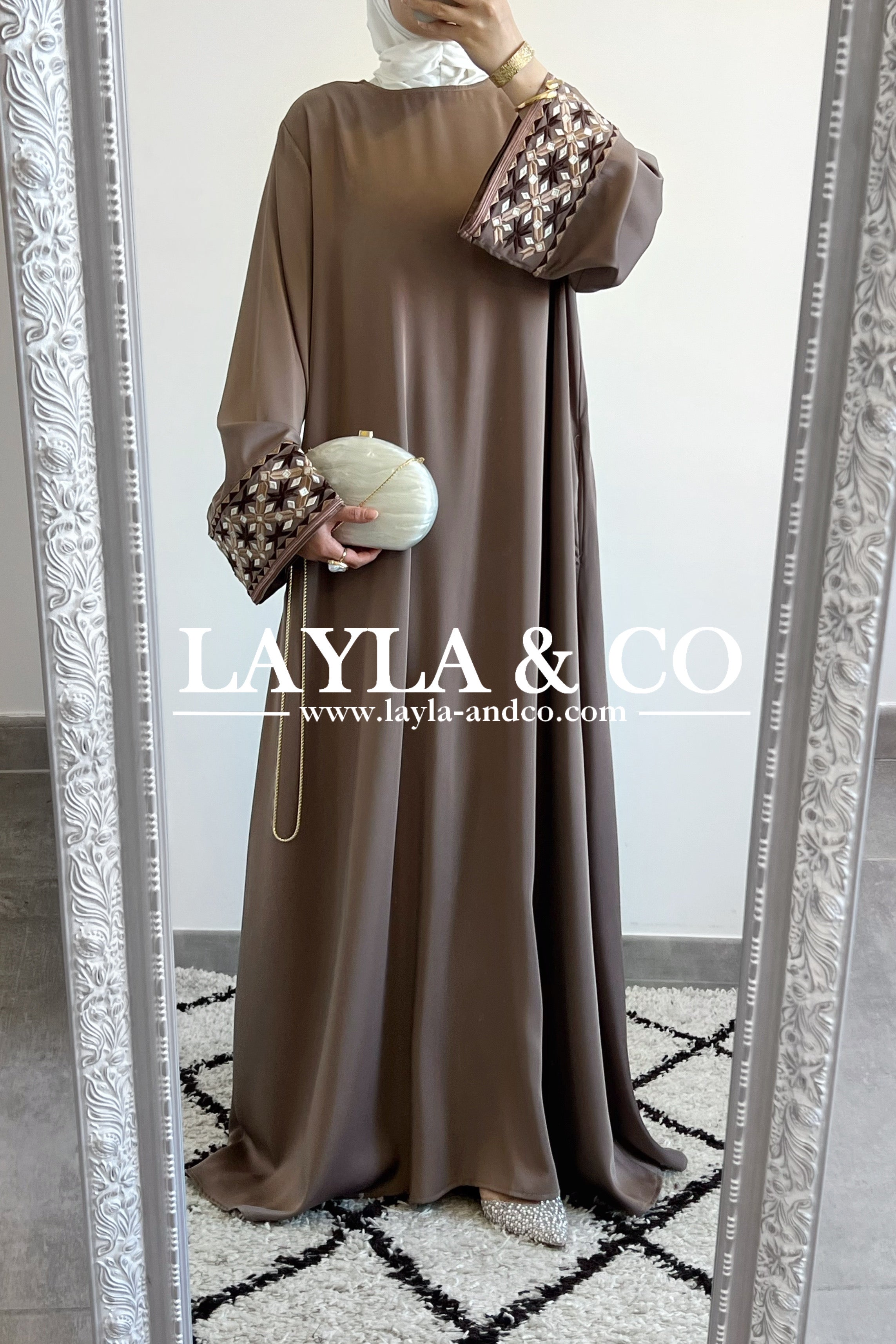 Abaya satinée qualité supérieure avec manches à broderie. Coupe évasée.