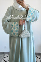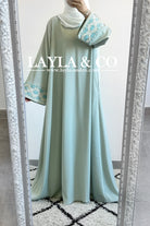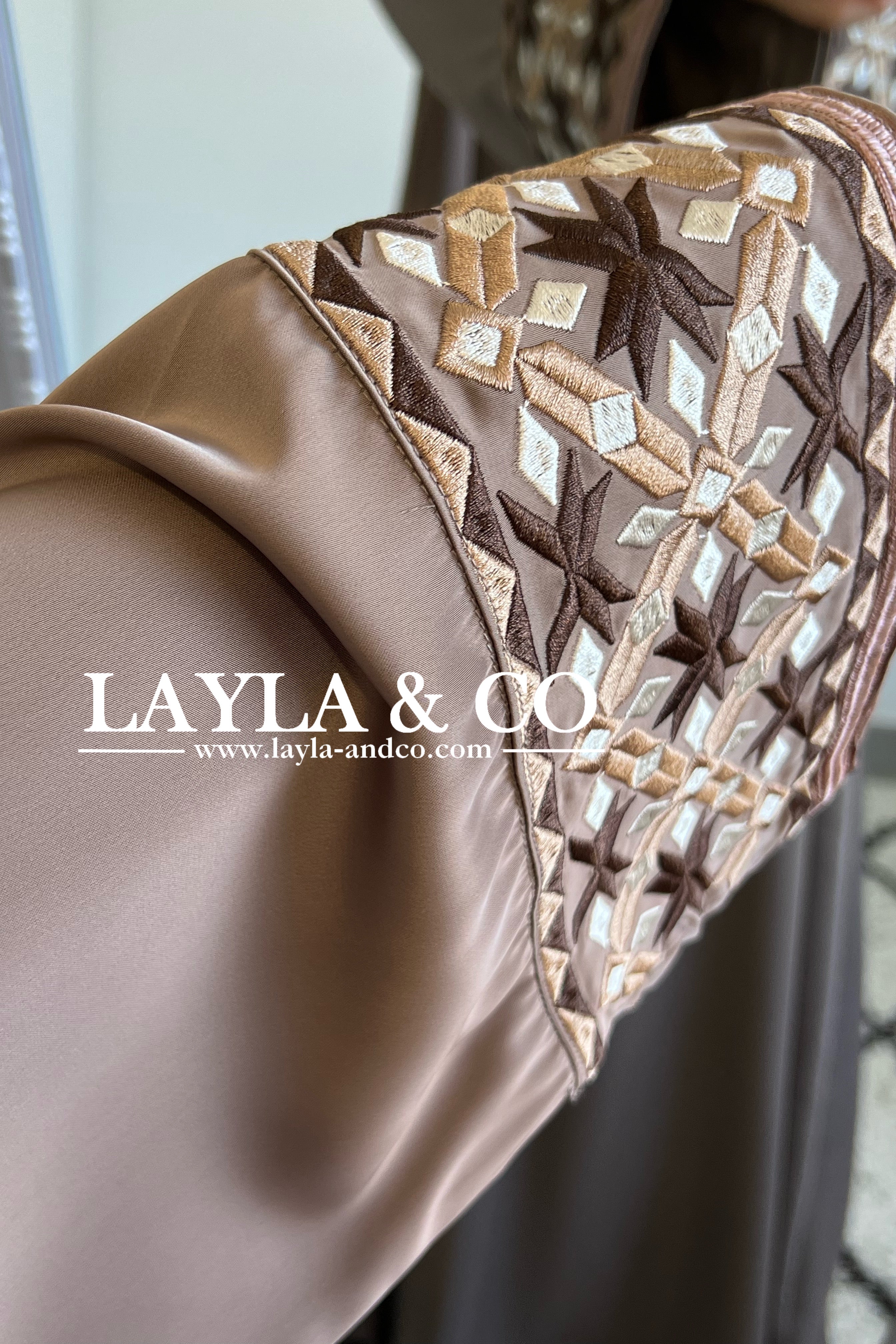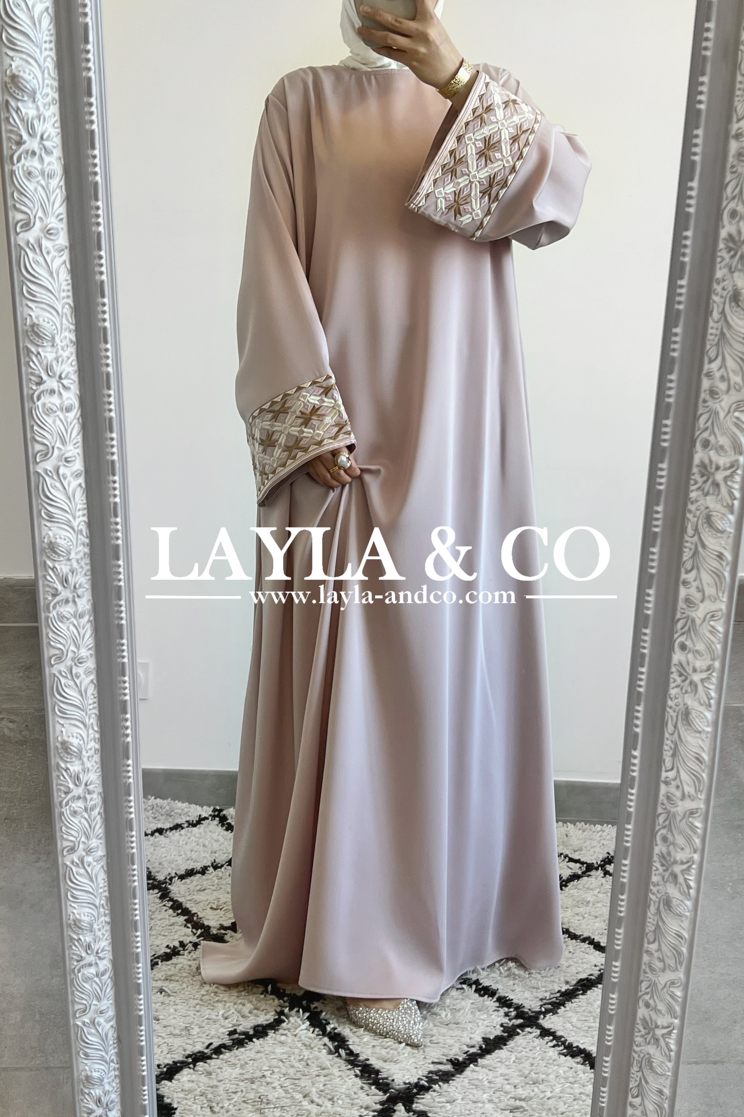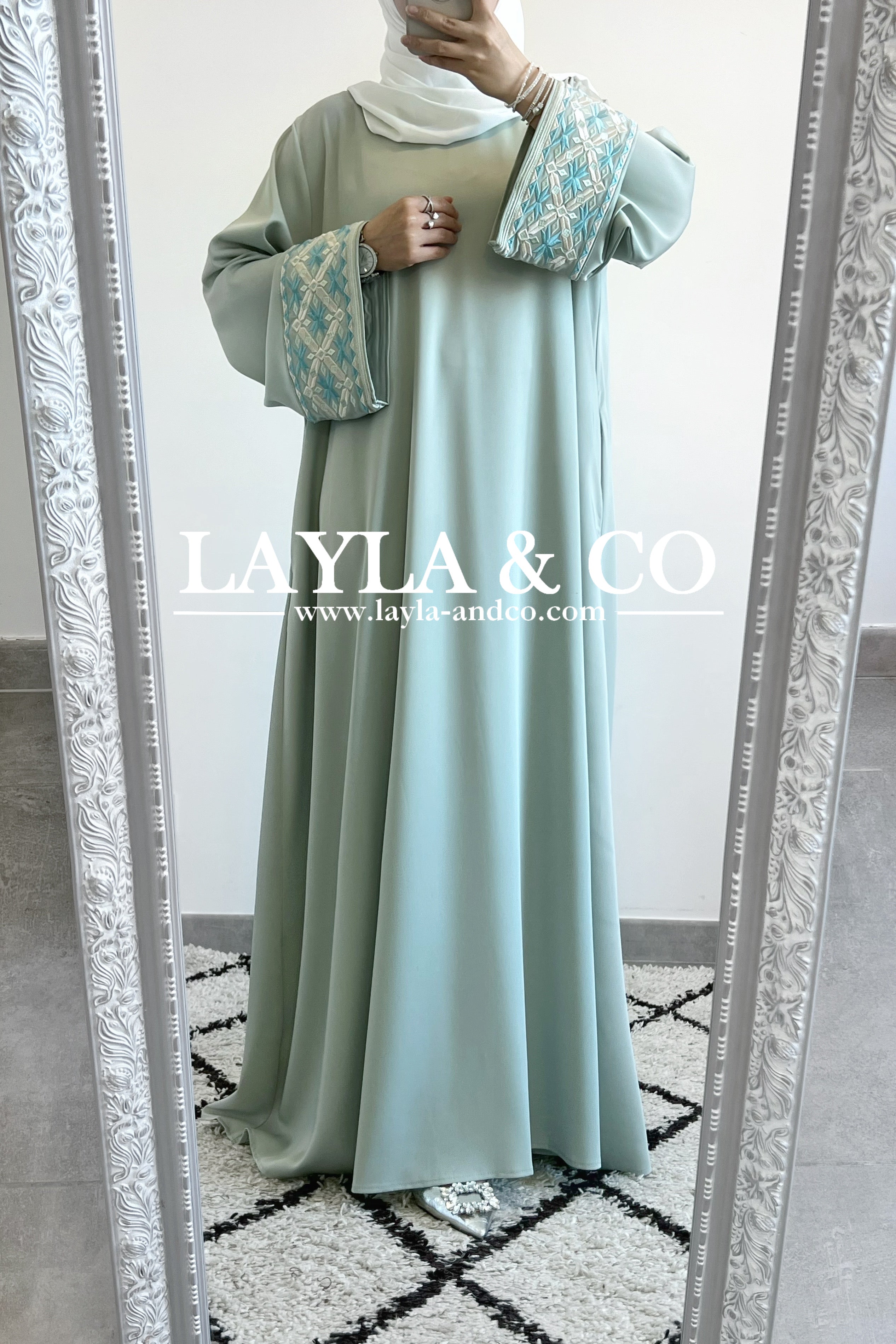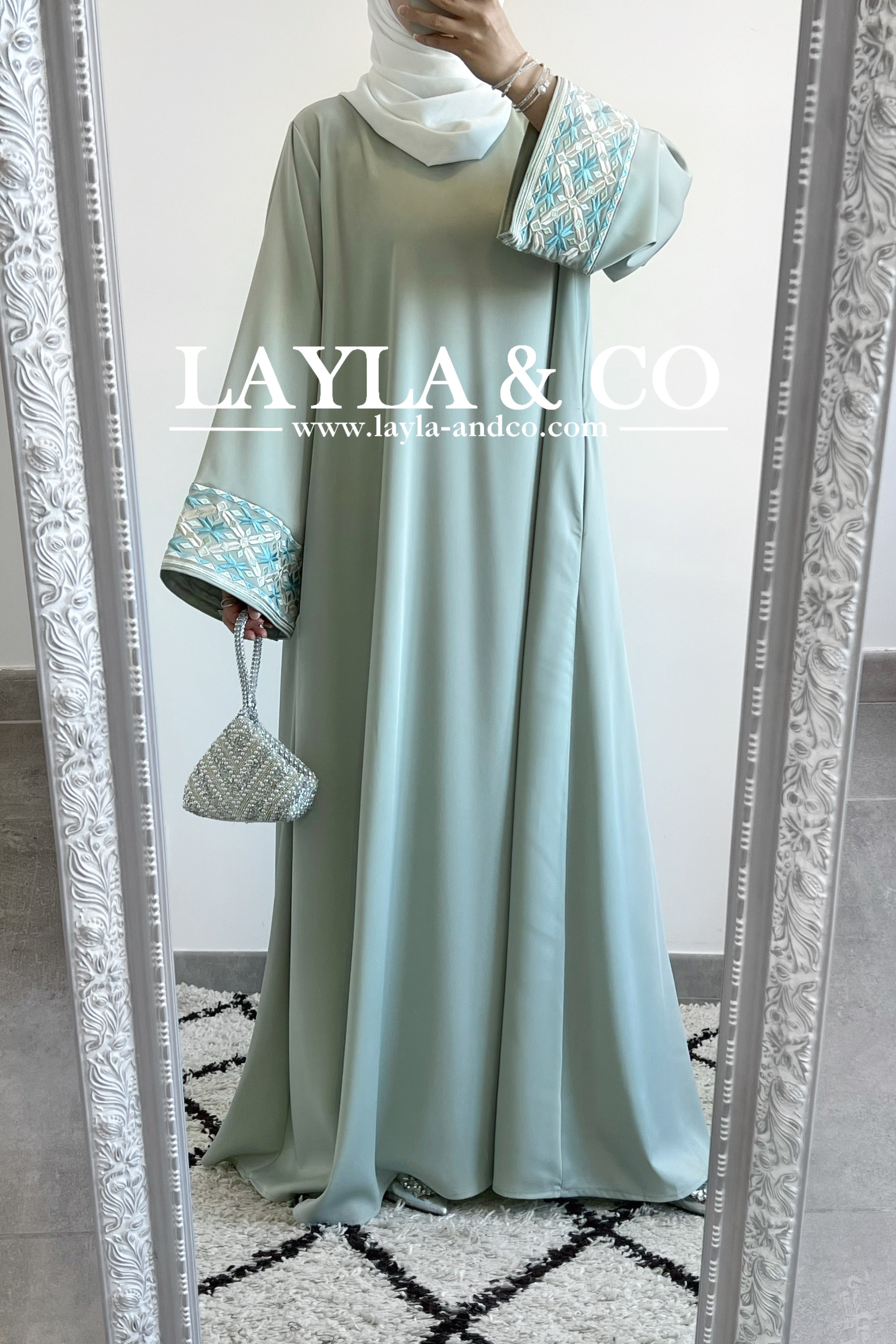 Abaya satinée qualité supérieure avec manches à broderie. Coupe évasée.