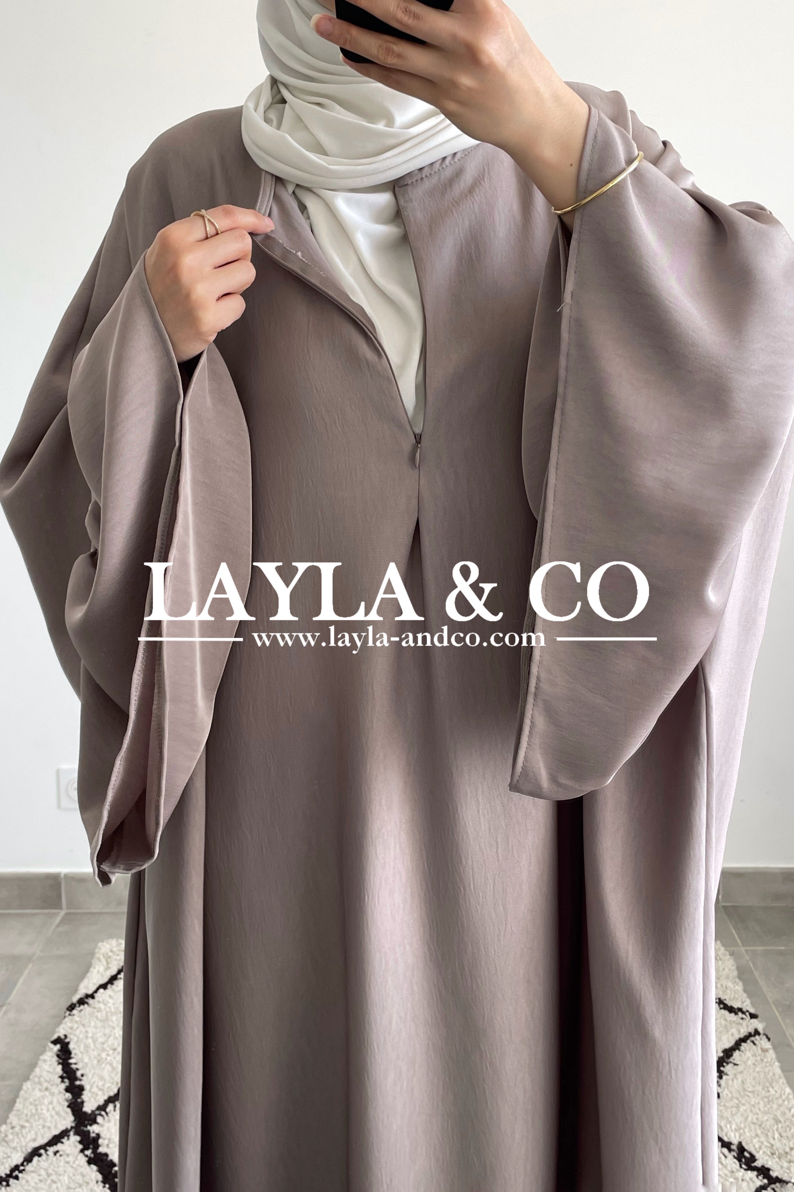Abaya coupe ample manches volants, avec zip idéal pour l’allaitement. Tissu légèrement satiné.