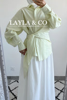 Chemise à nouer en tissu coton et tencel. Détails de plis aux manches légèrement bouffant.