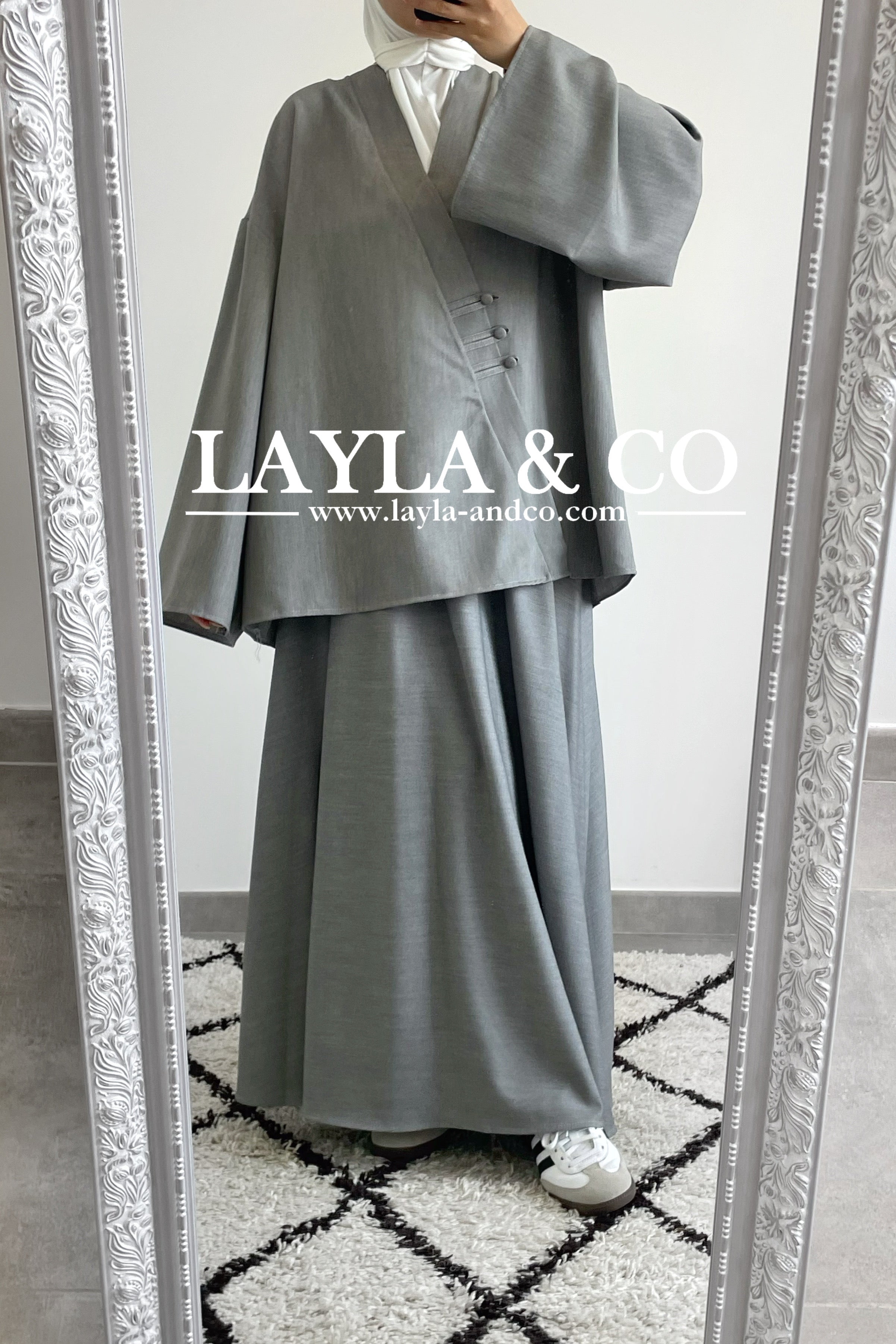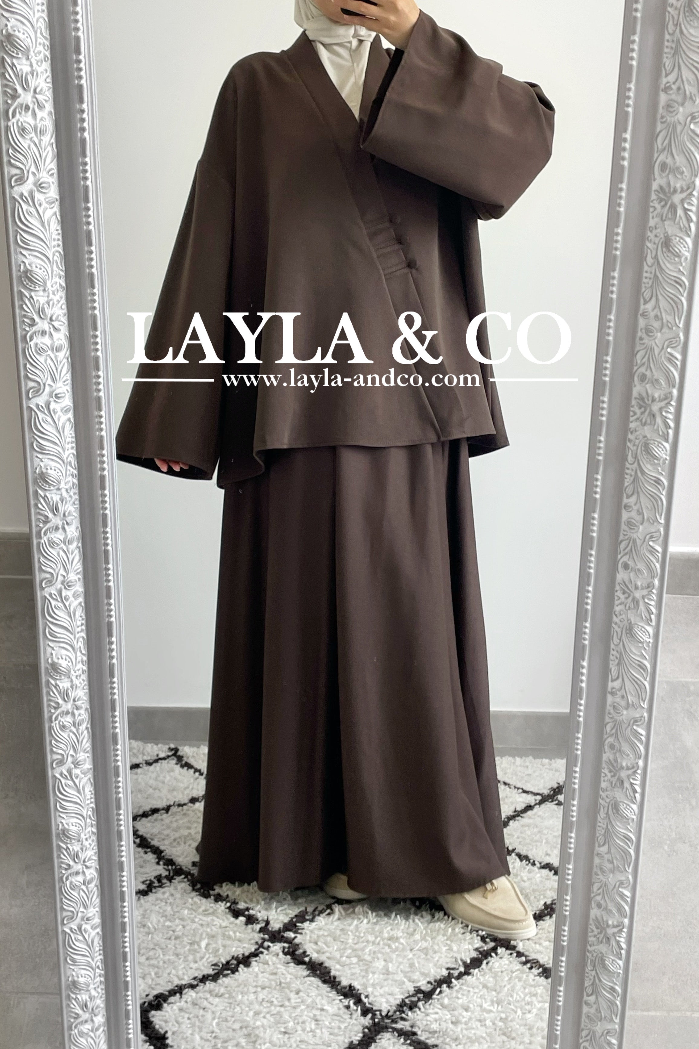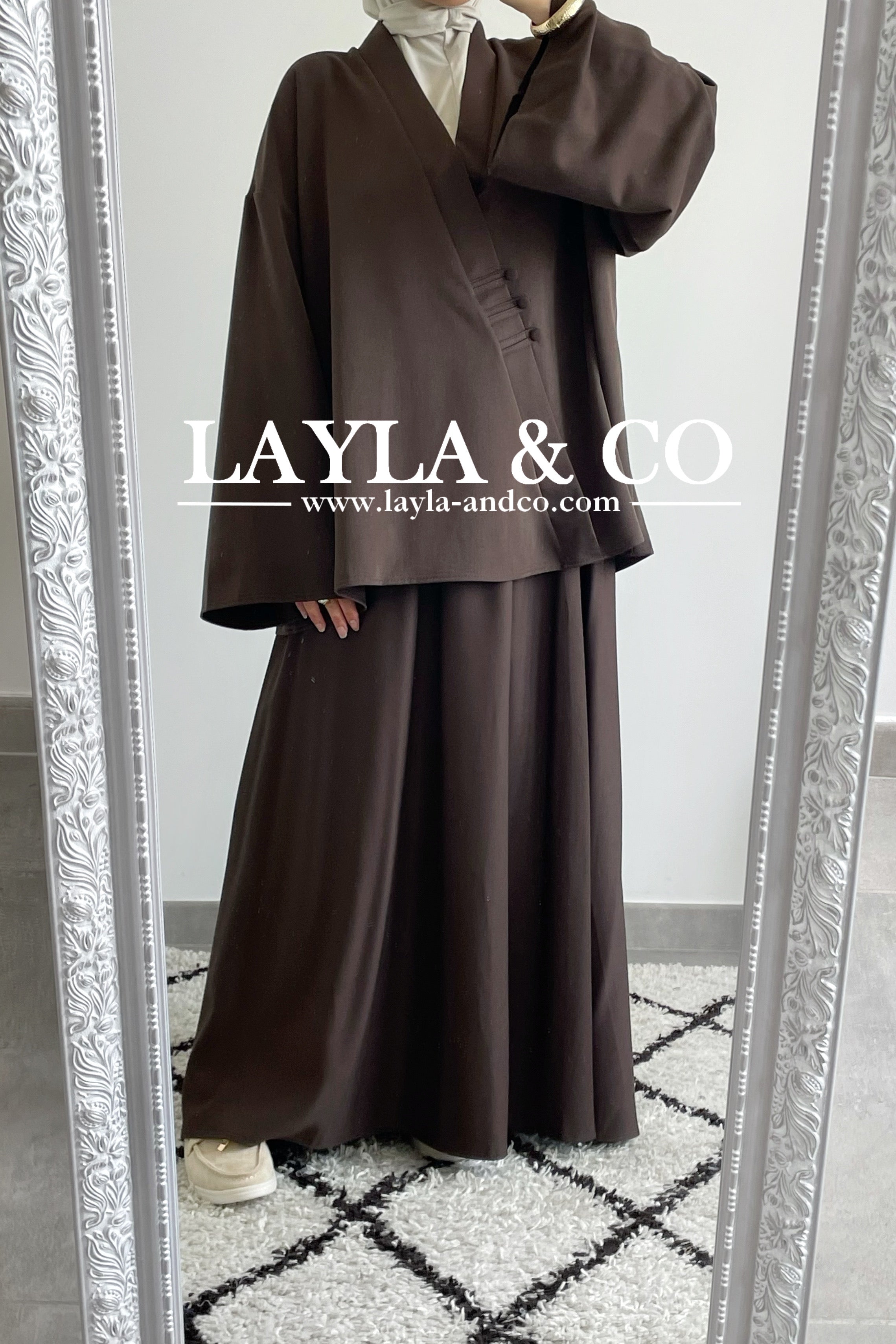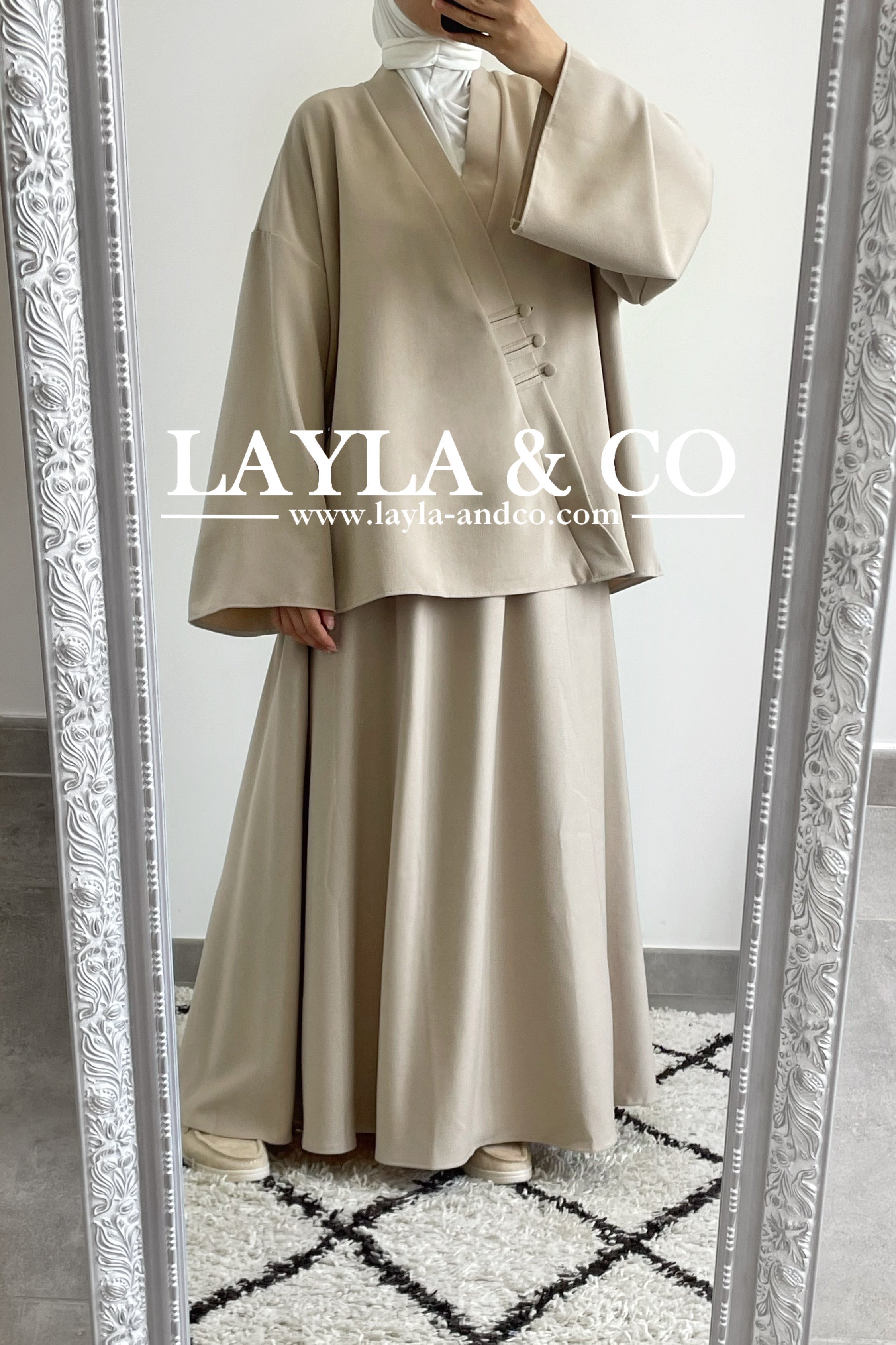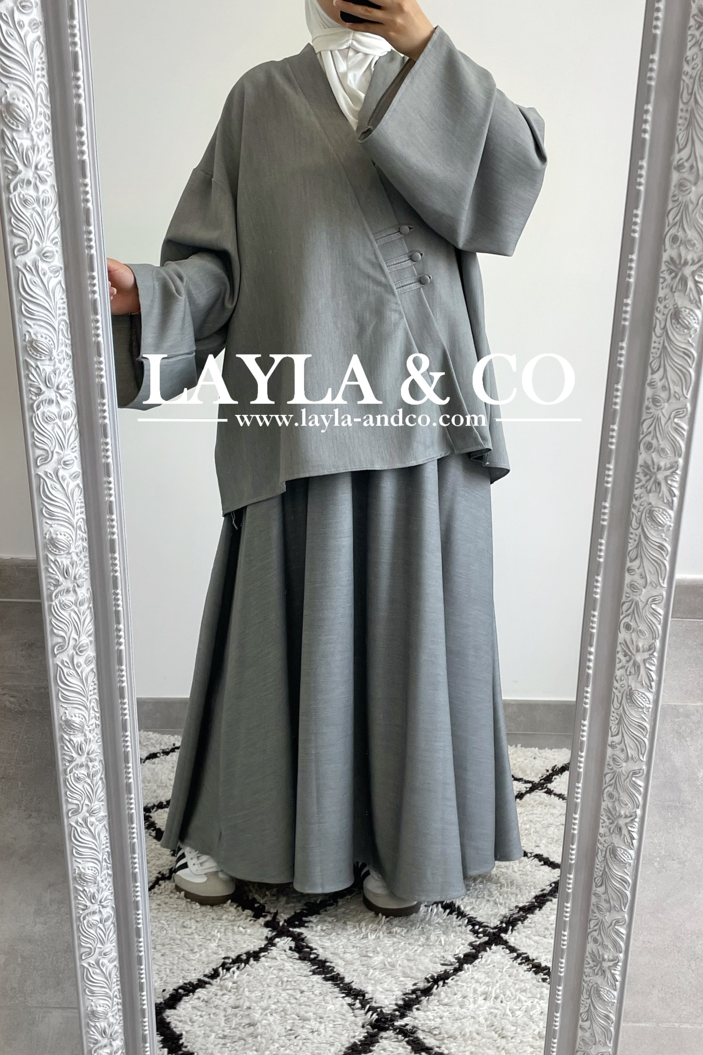 Ensemble 2 pièces composé d’un haut ample et d’une jupe évasée. Le haut est inspiré du style asiatique avec ses détails de boutons décoratifs.