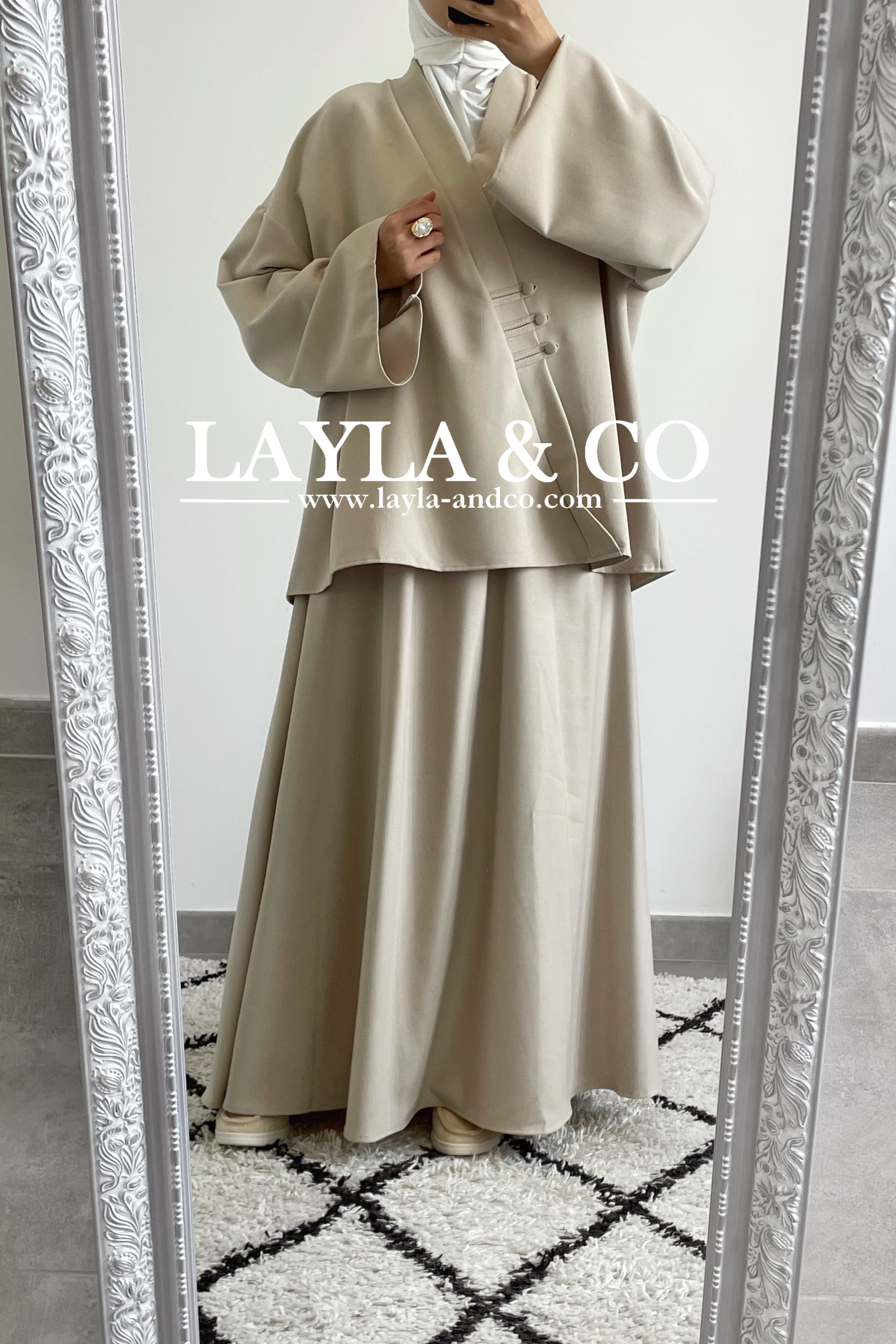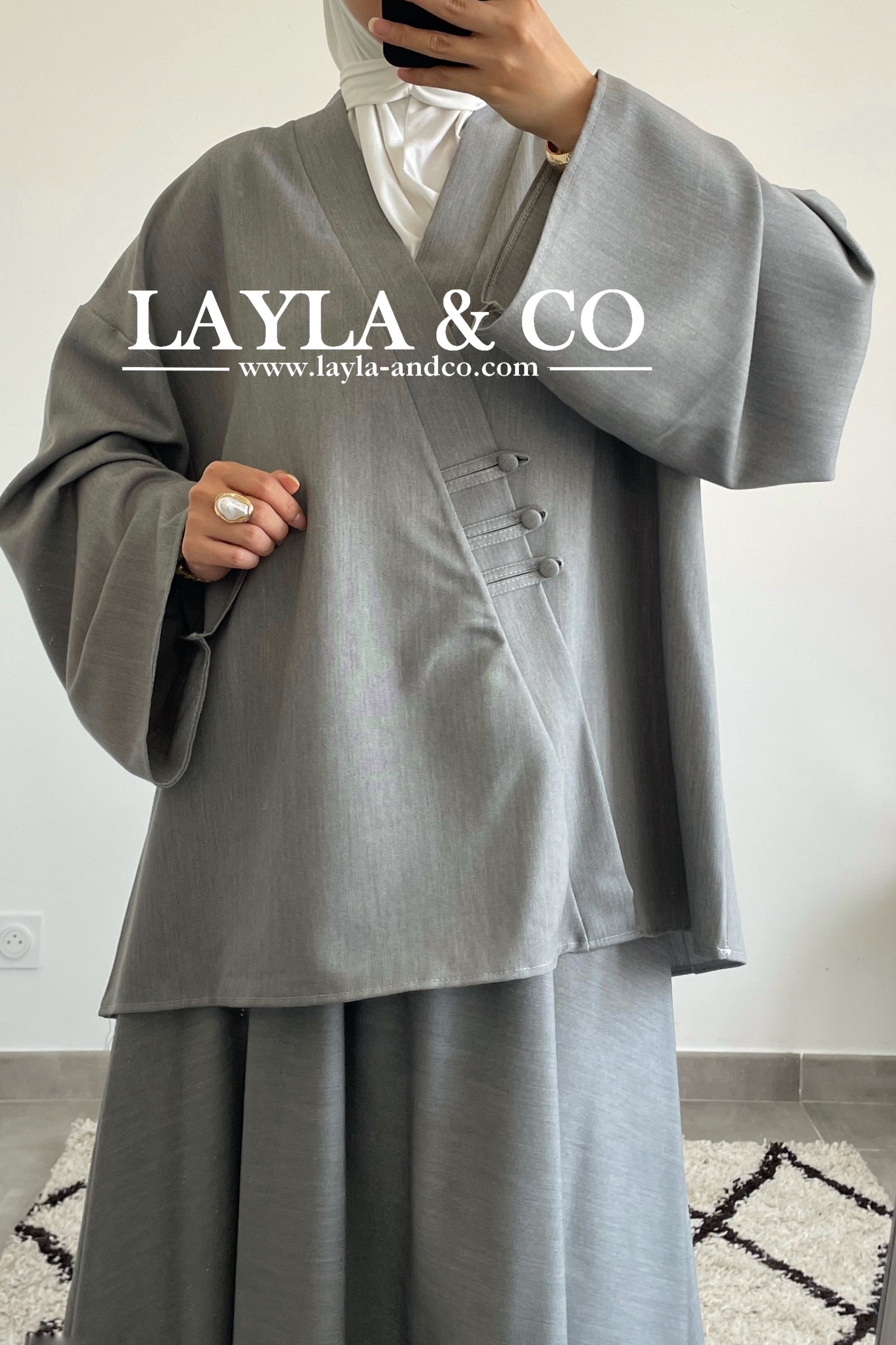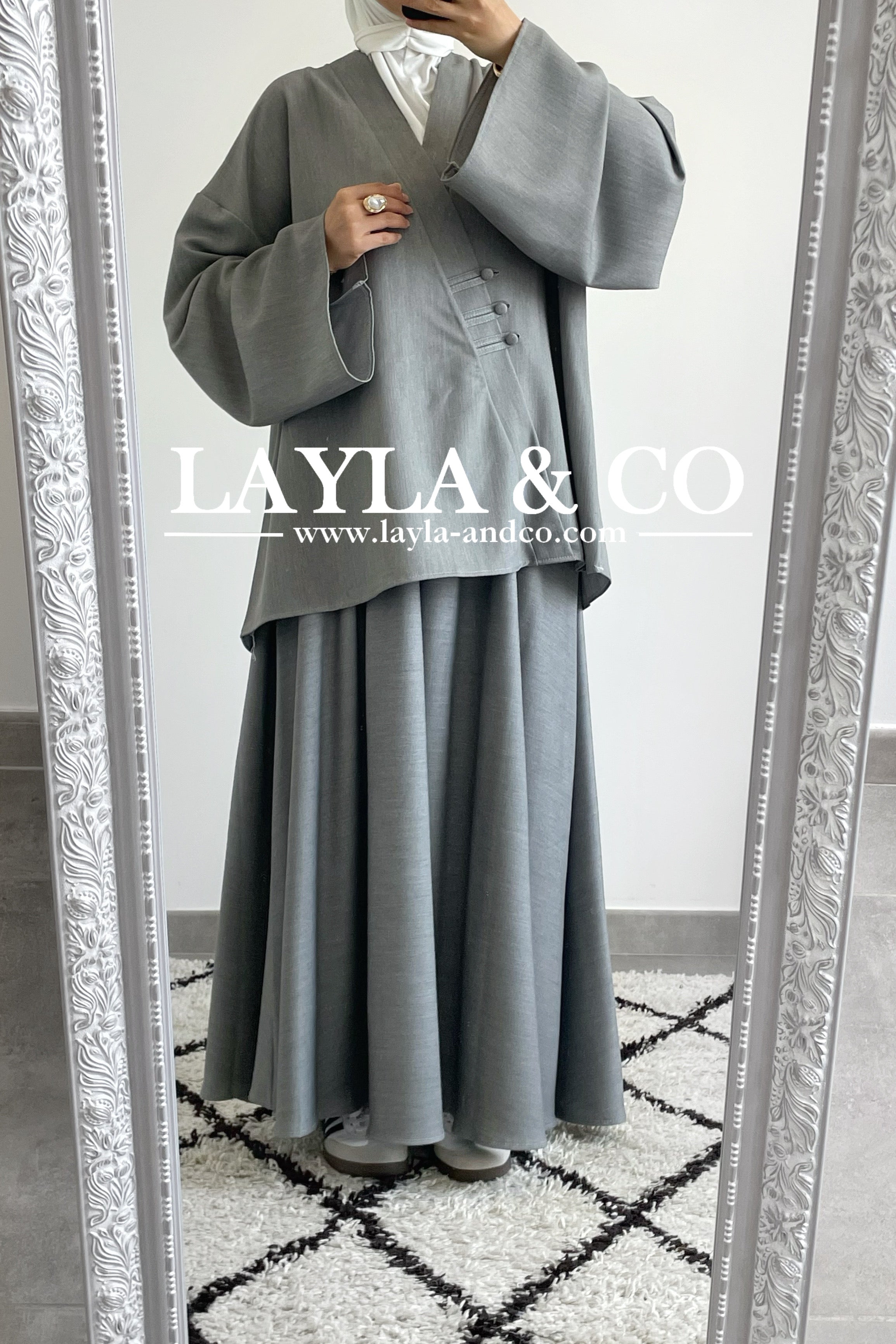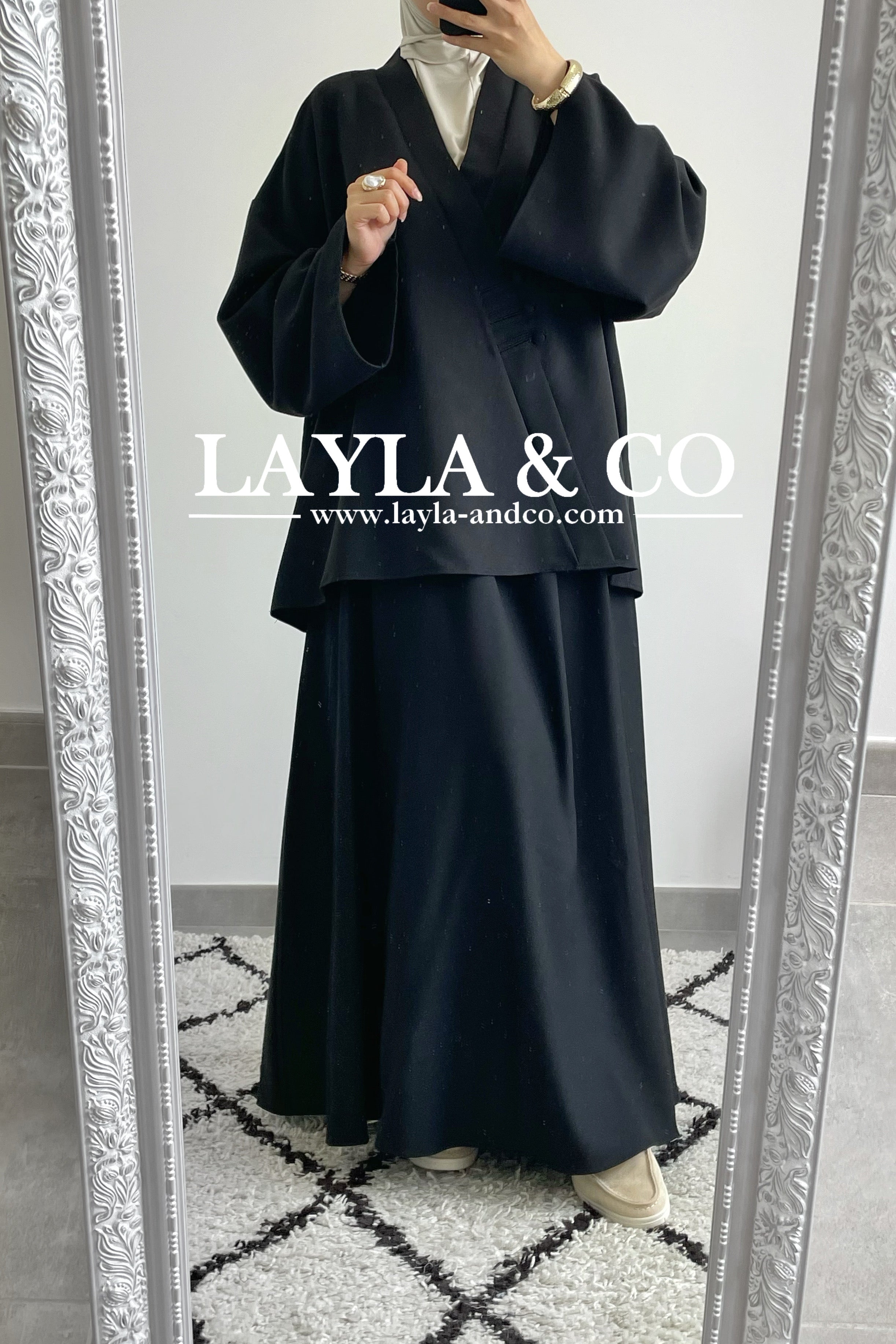 Ensemble 2 pièces composé d’un haut ample et d’une jupe évasée. Le haut est inspiré du style asiatique avec ses détails de boutons décoratifs.