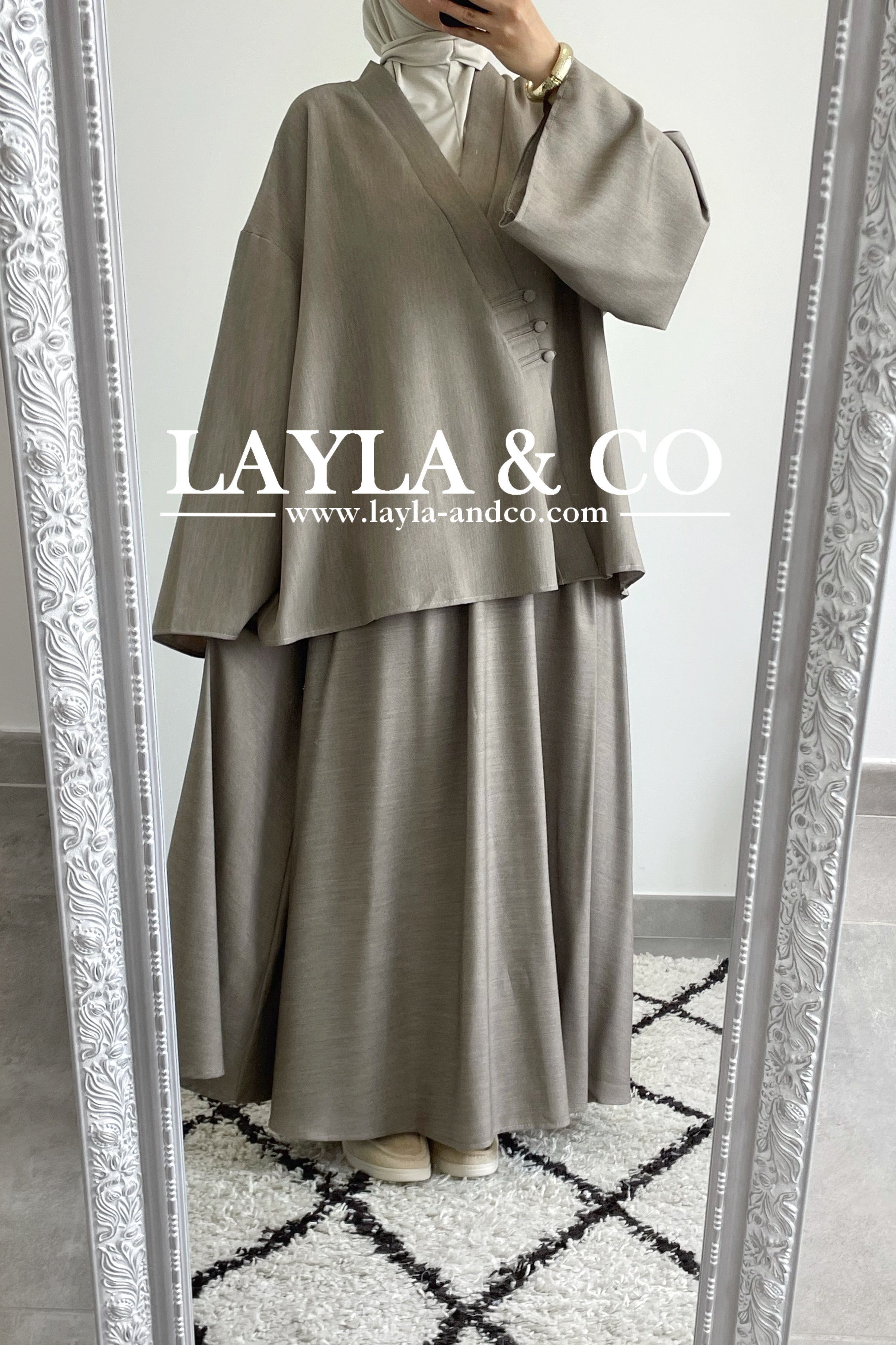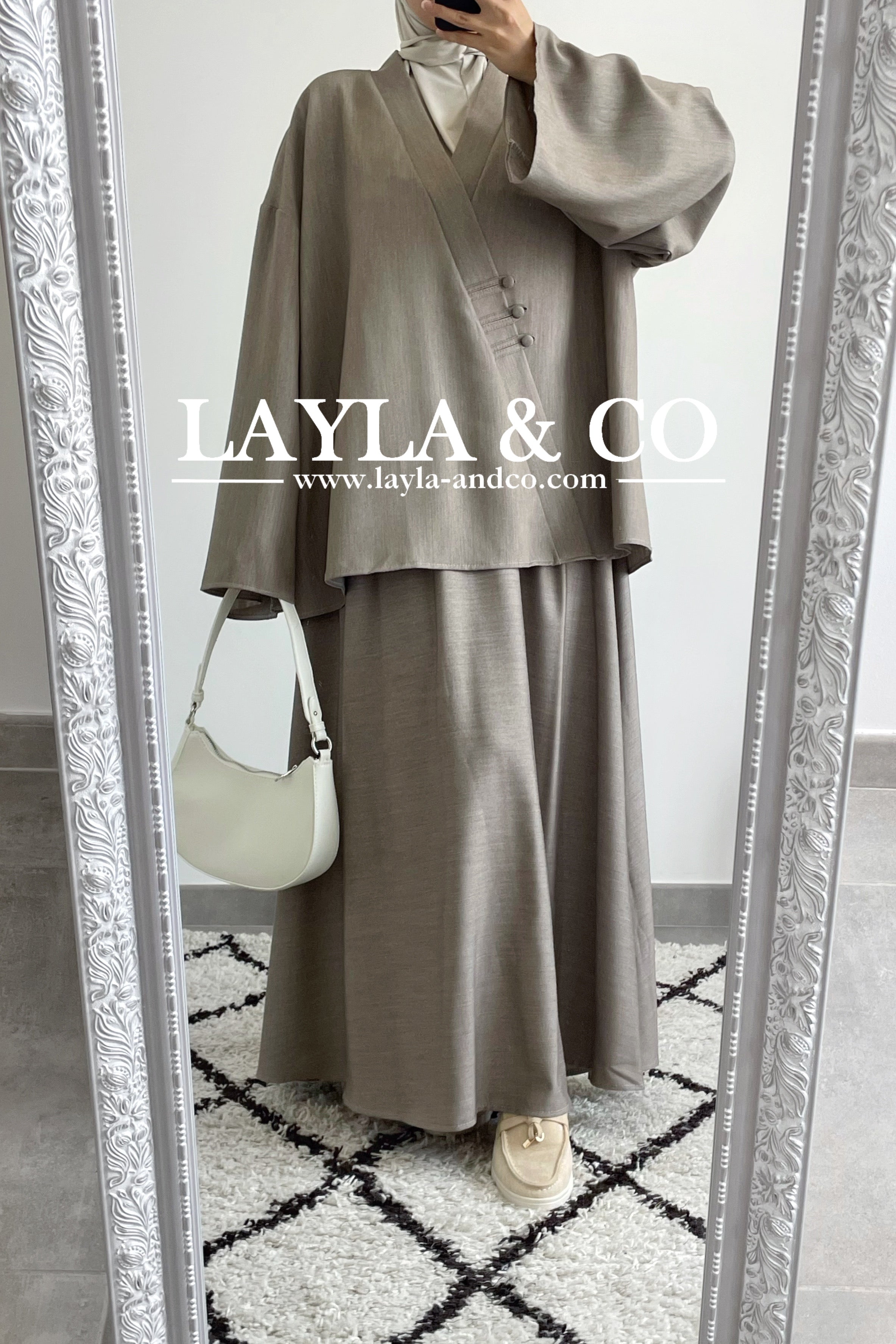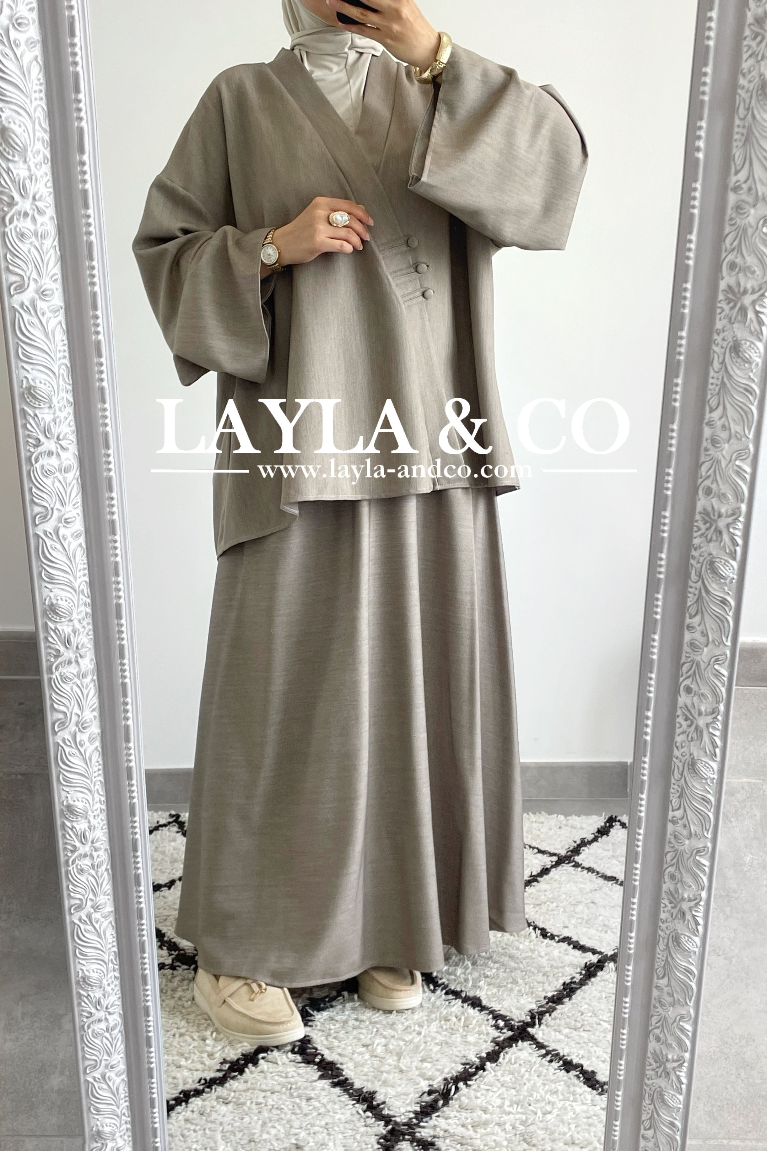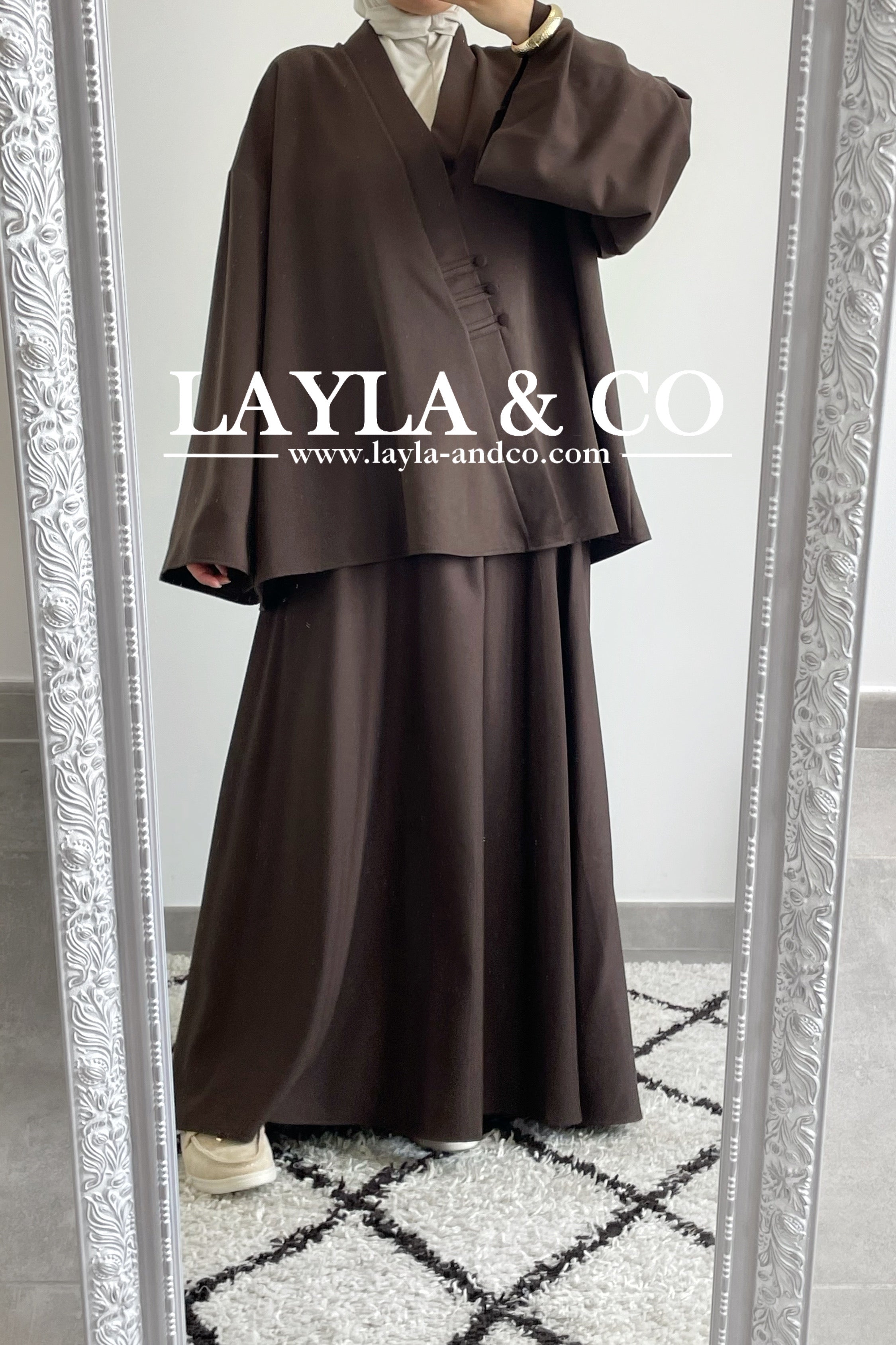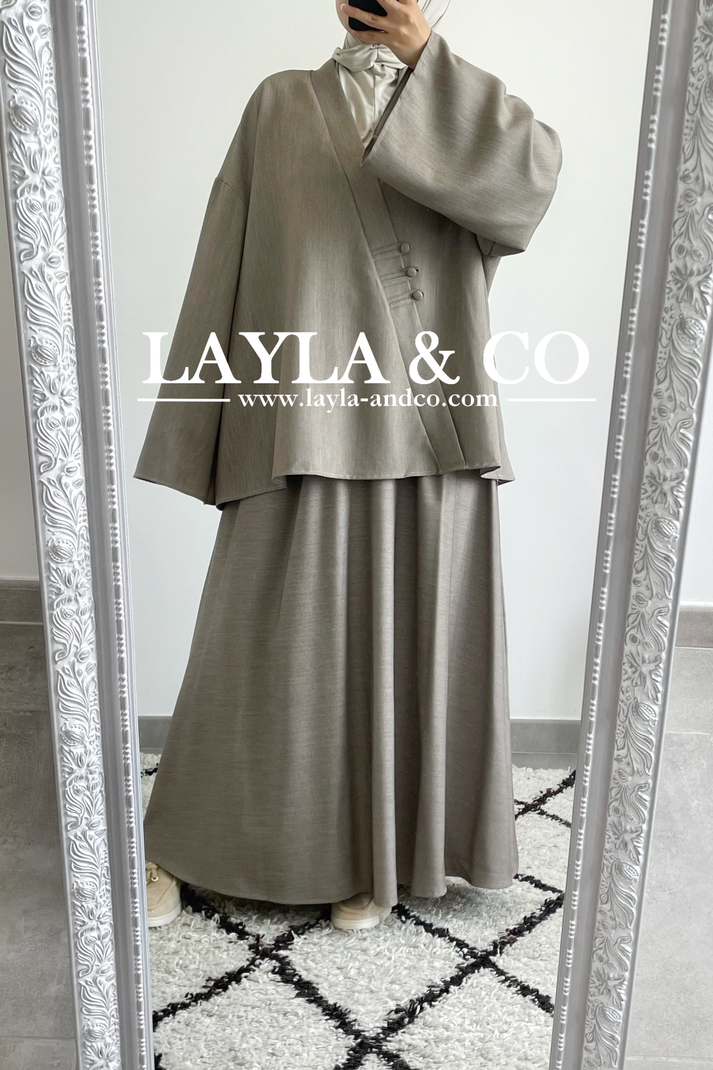 Ensemble 2 pièces composé d’un haut ample et d’une jupe évasée. Le haut est inspiré du style asiatique avec ses détails de boutons décoratifs.