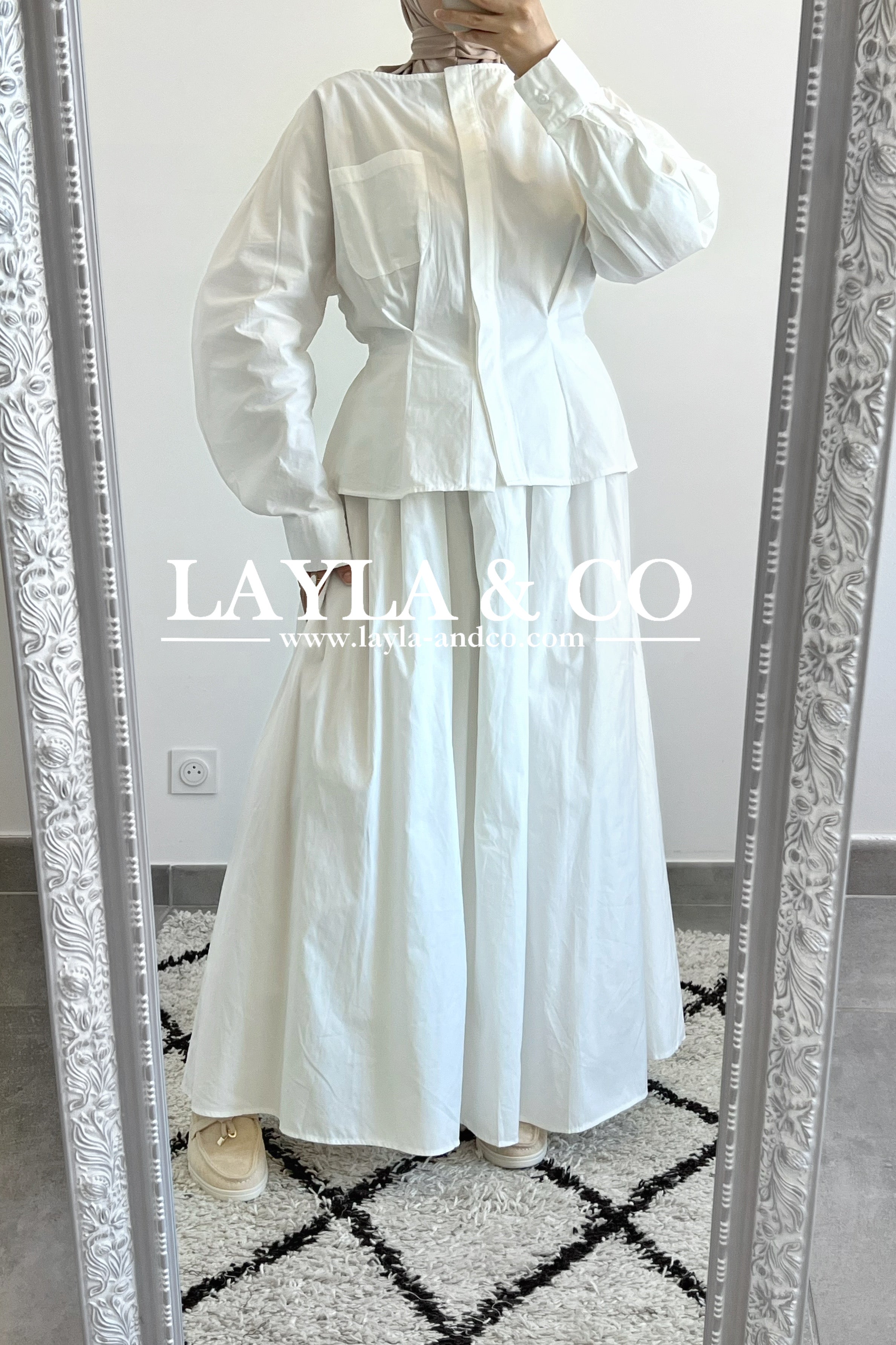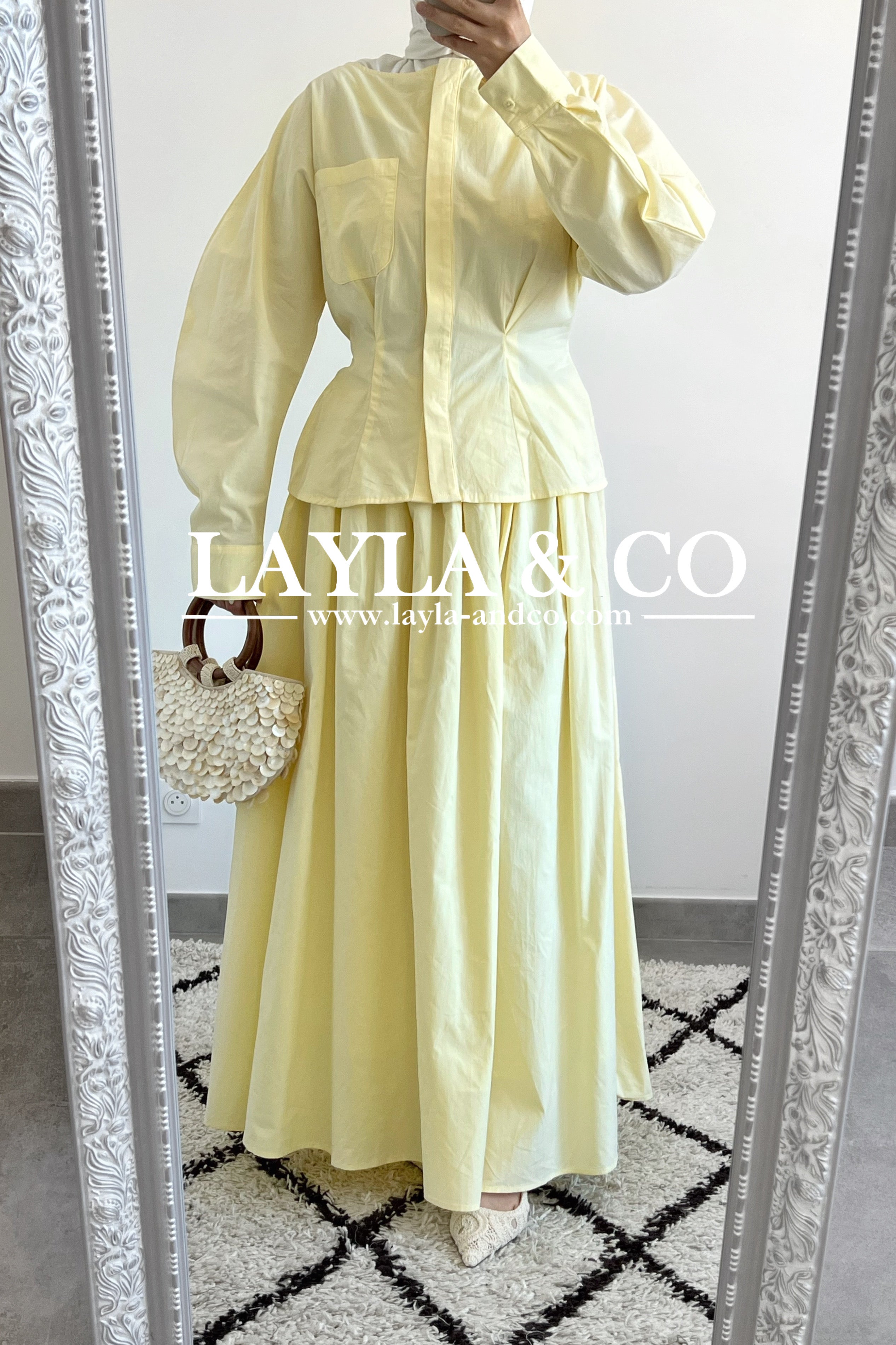 Ensemble composé d’un top à cintrer et d’une jupe ample en tissu 100% coton. La jupe dispose d’u élastique et est entièrement doublée.