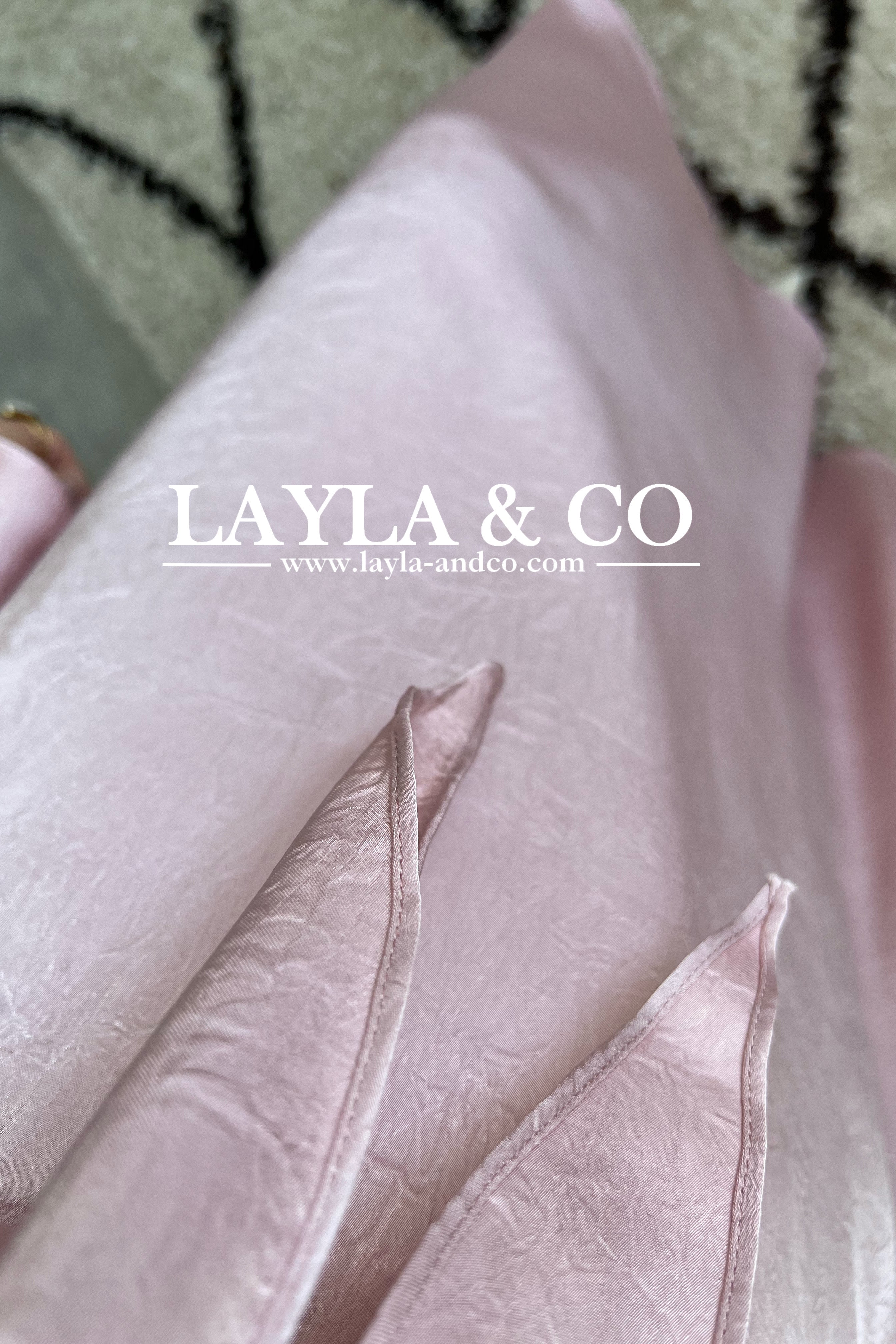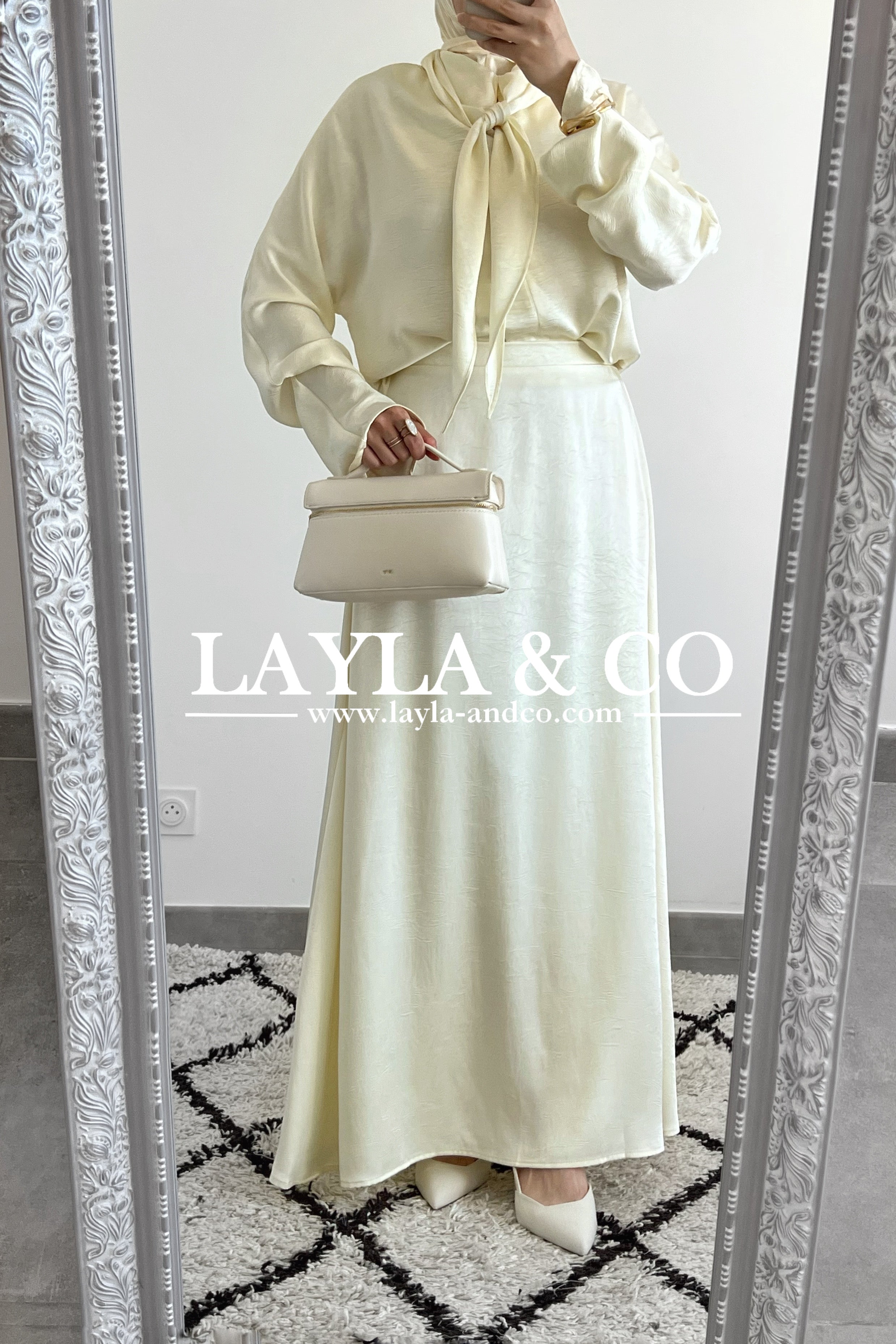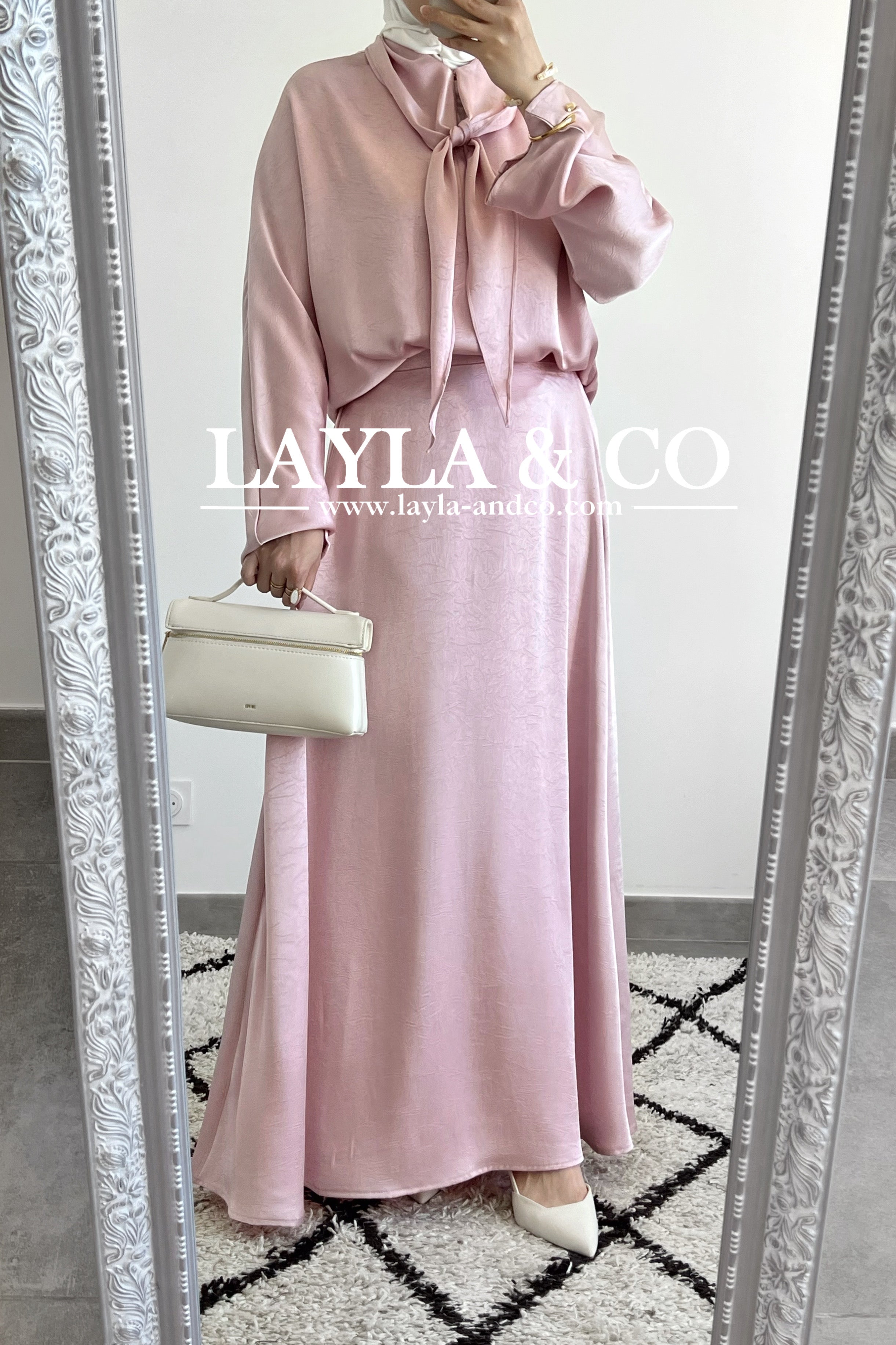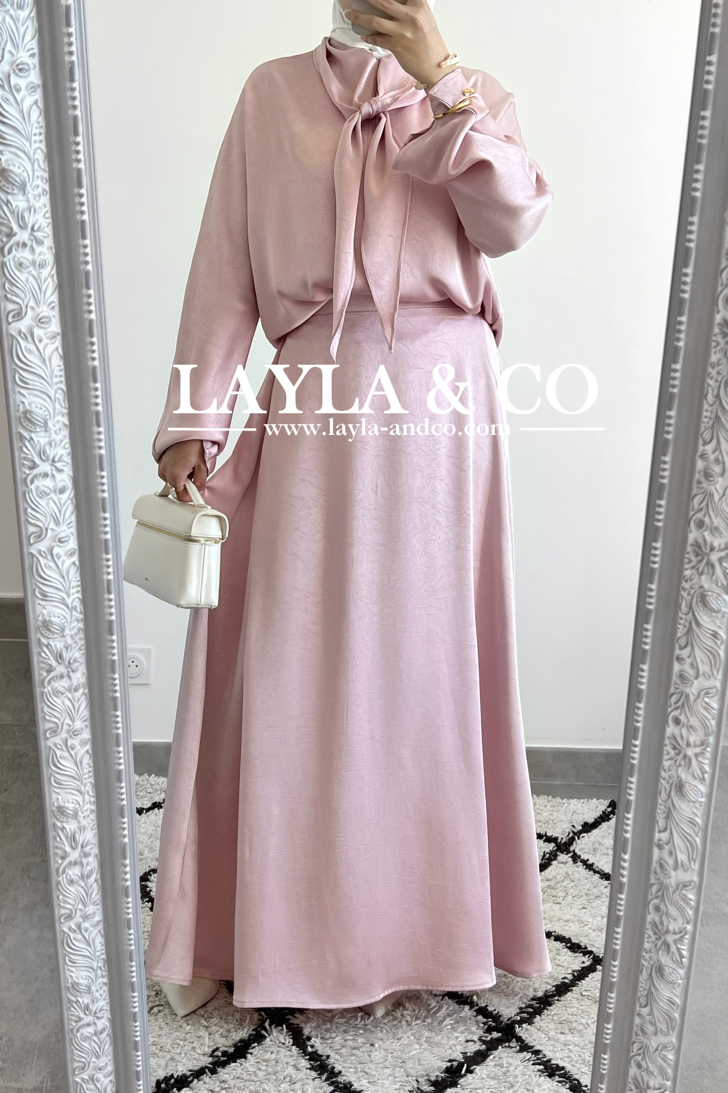 Ensemble 2 pièces composé d’une blouse avec détail noeud et d’une jupe évasée. Tissu satiné texturé.