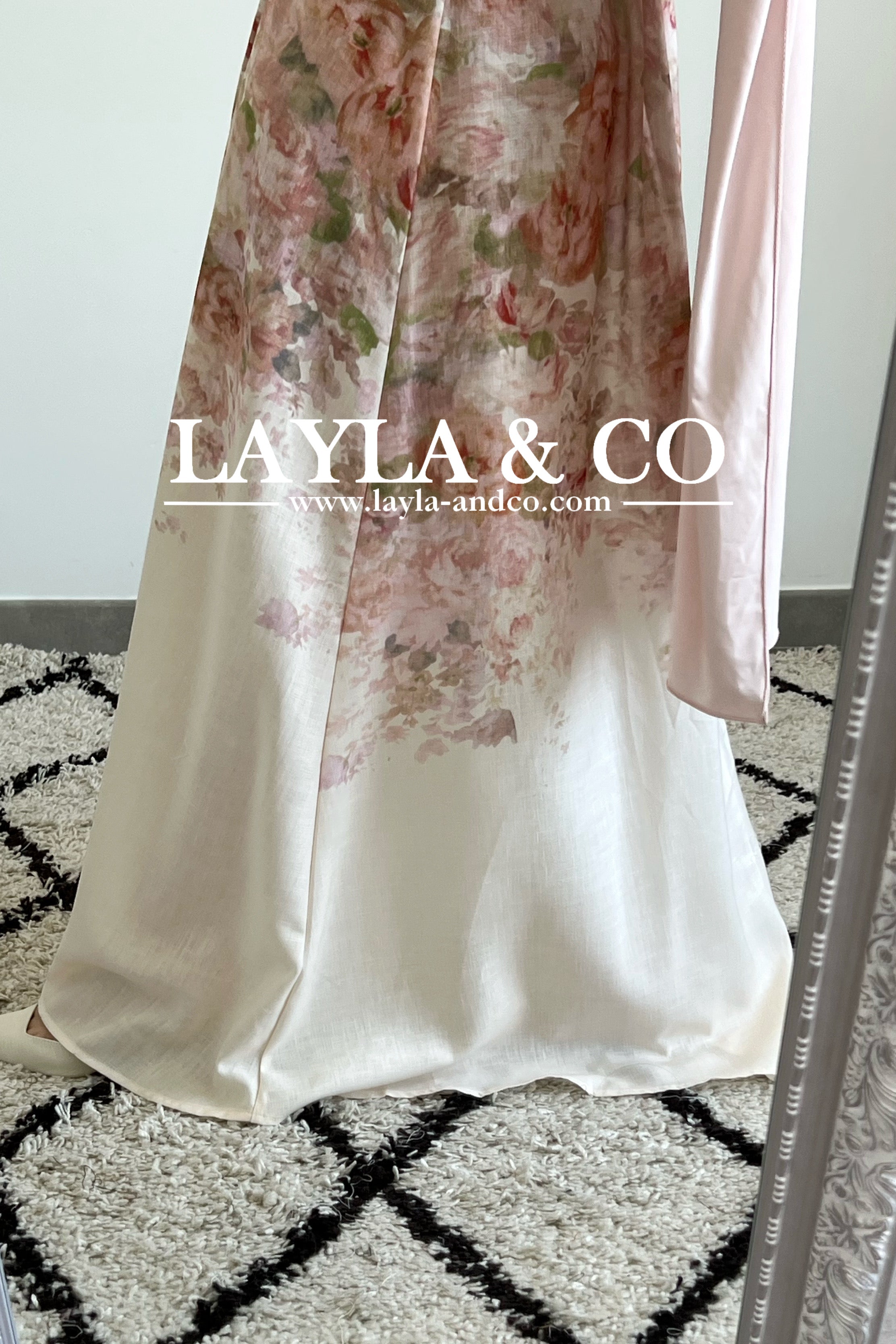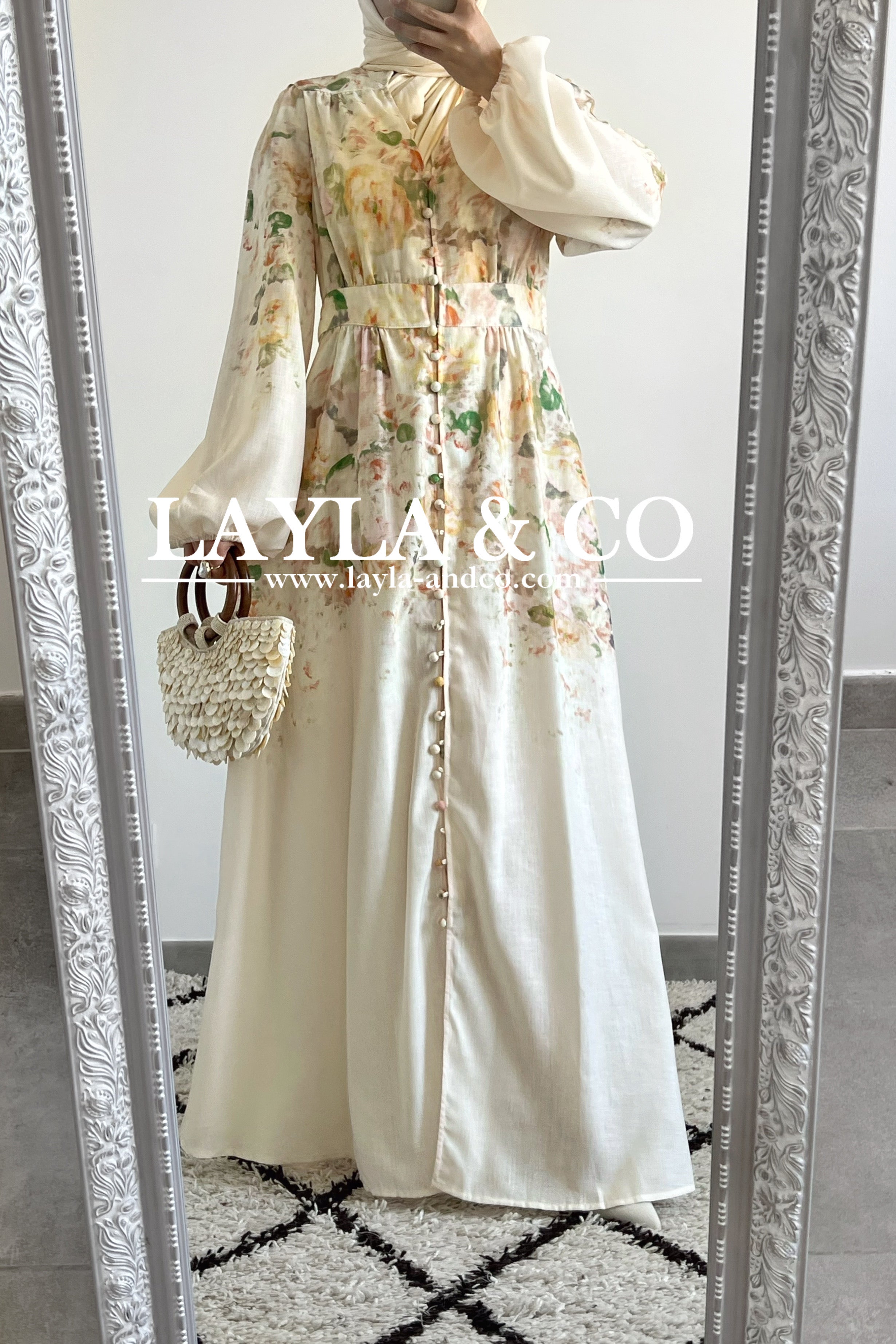 Robe imprimée fleurie avec effet cintrée à la taille. Tissu effet lin