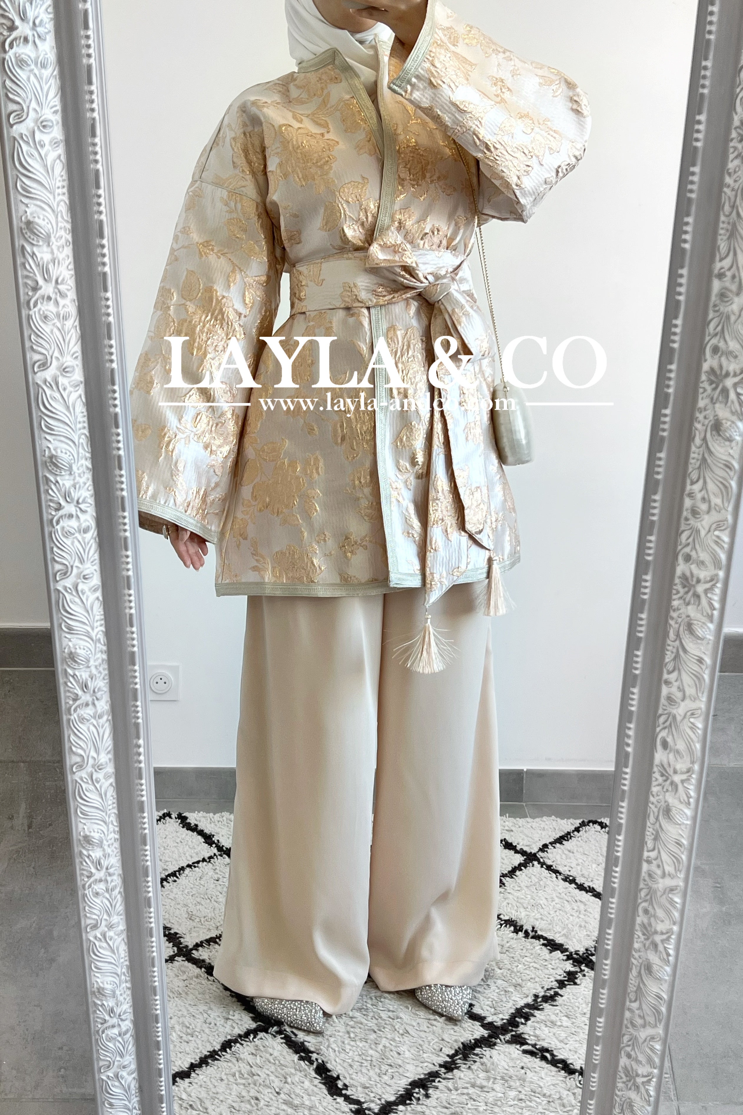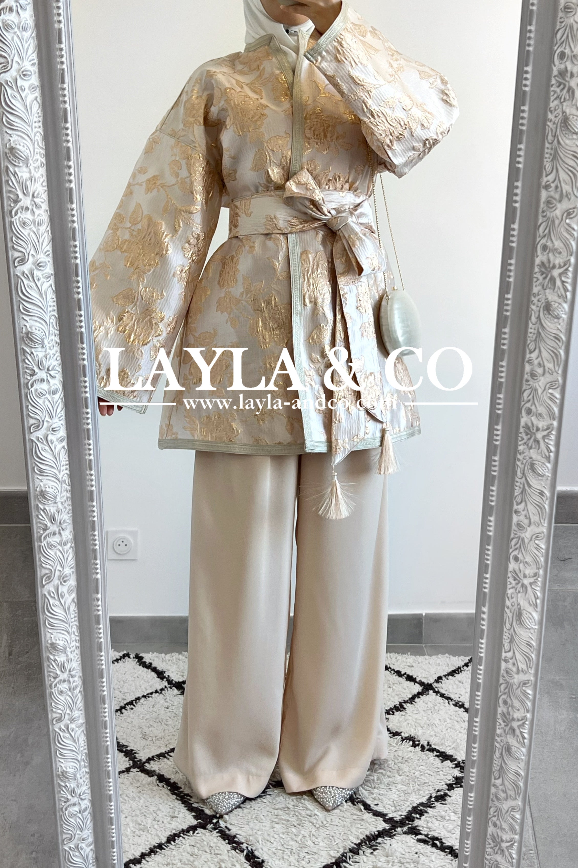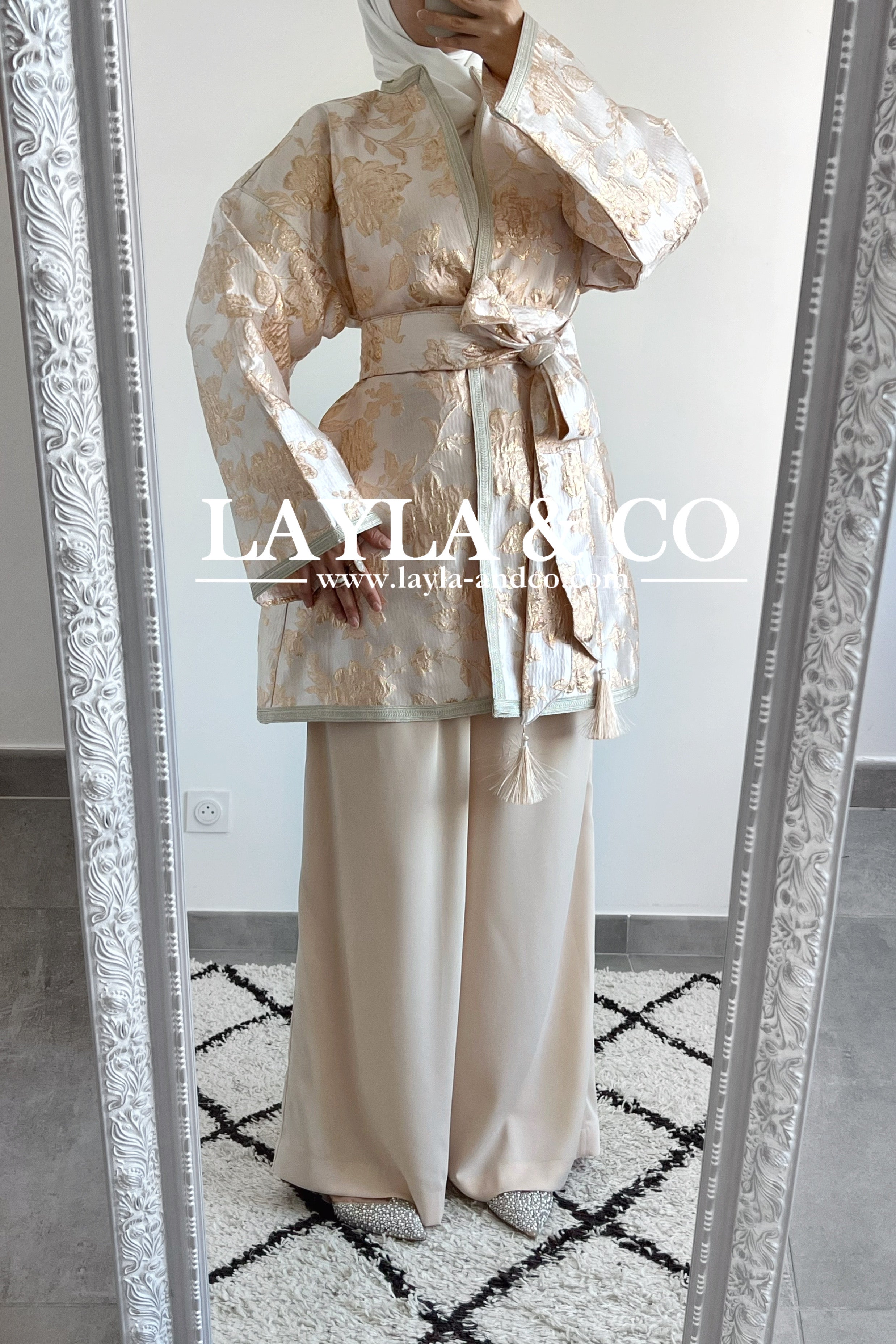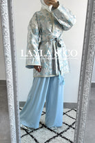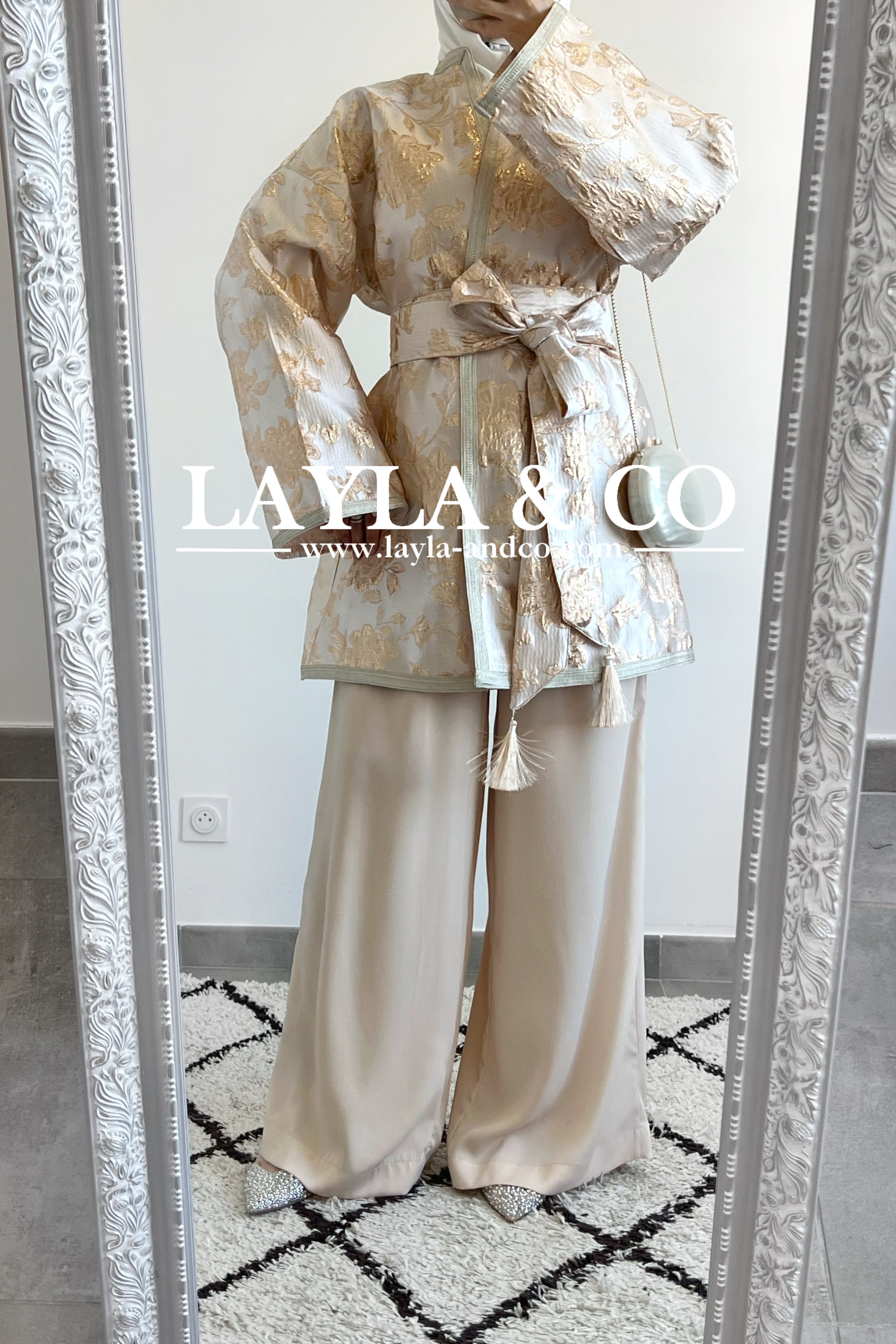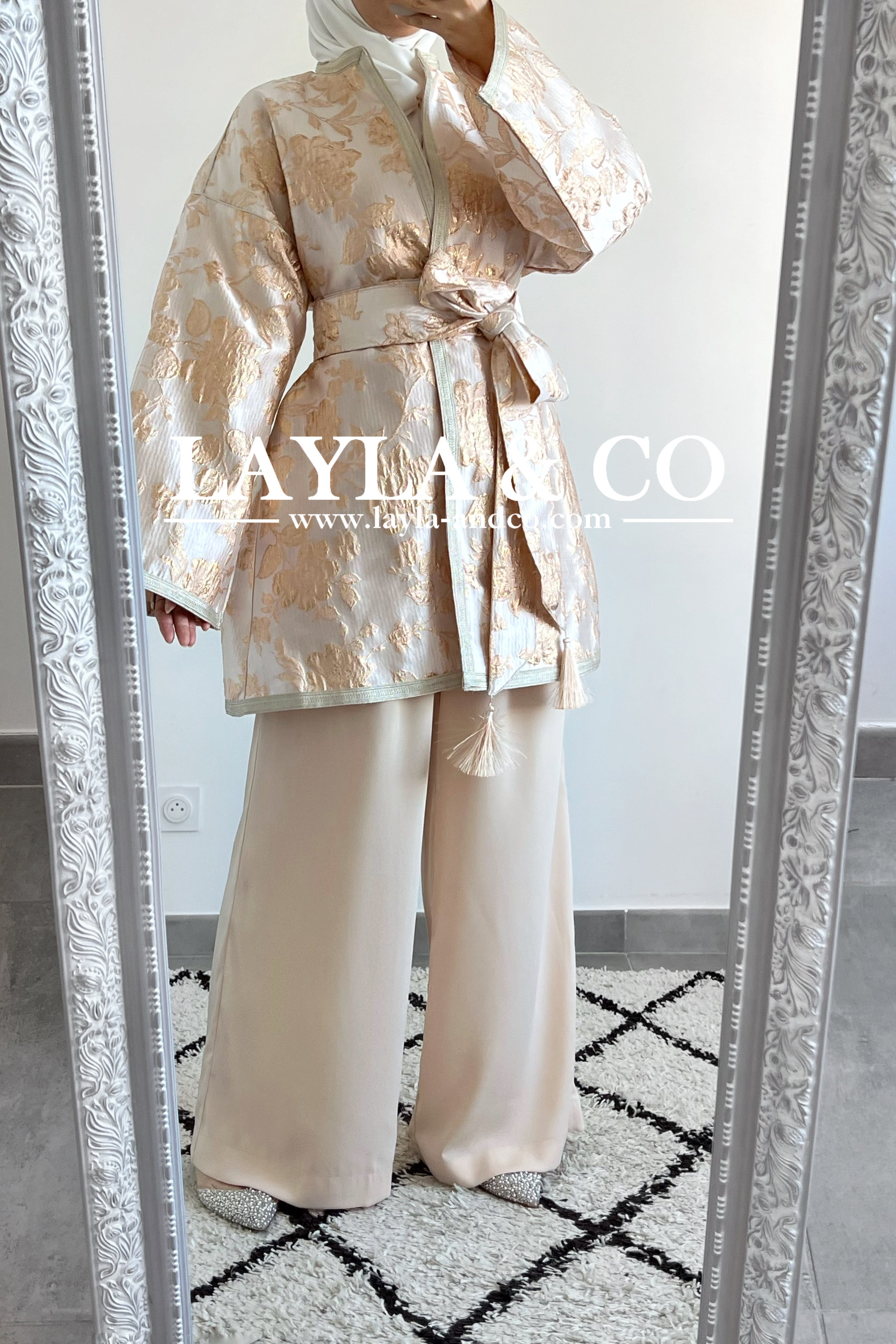 Ensemble 2 pièces composé d’un kimono brocart avec ceinture longue et pantalon satiné.