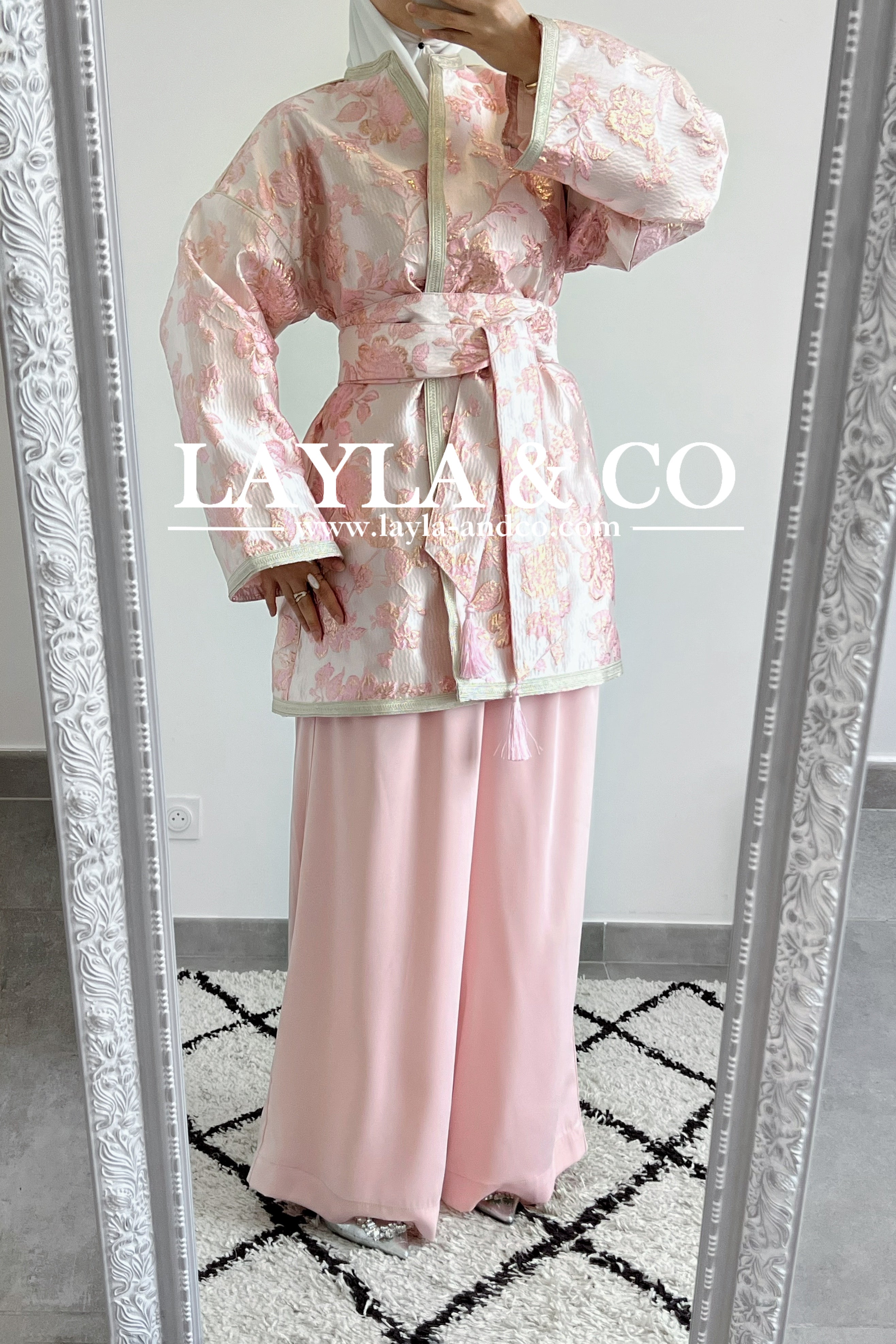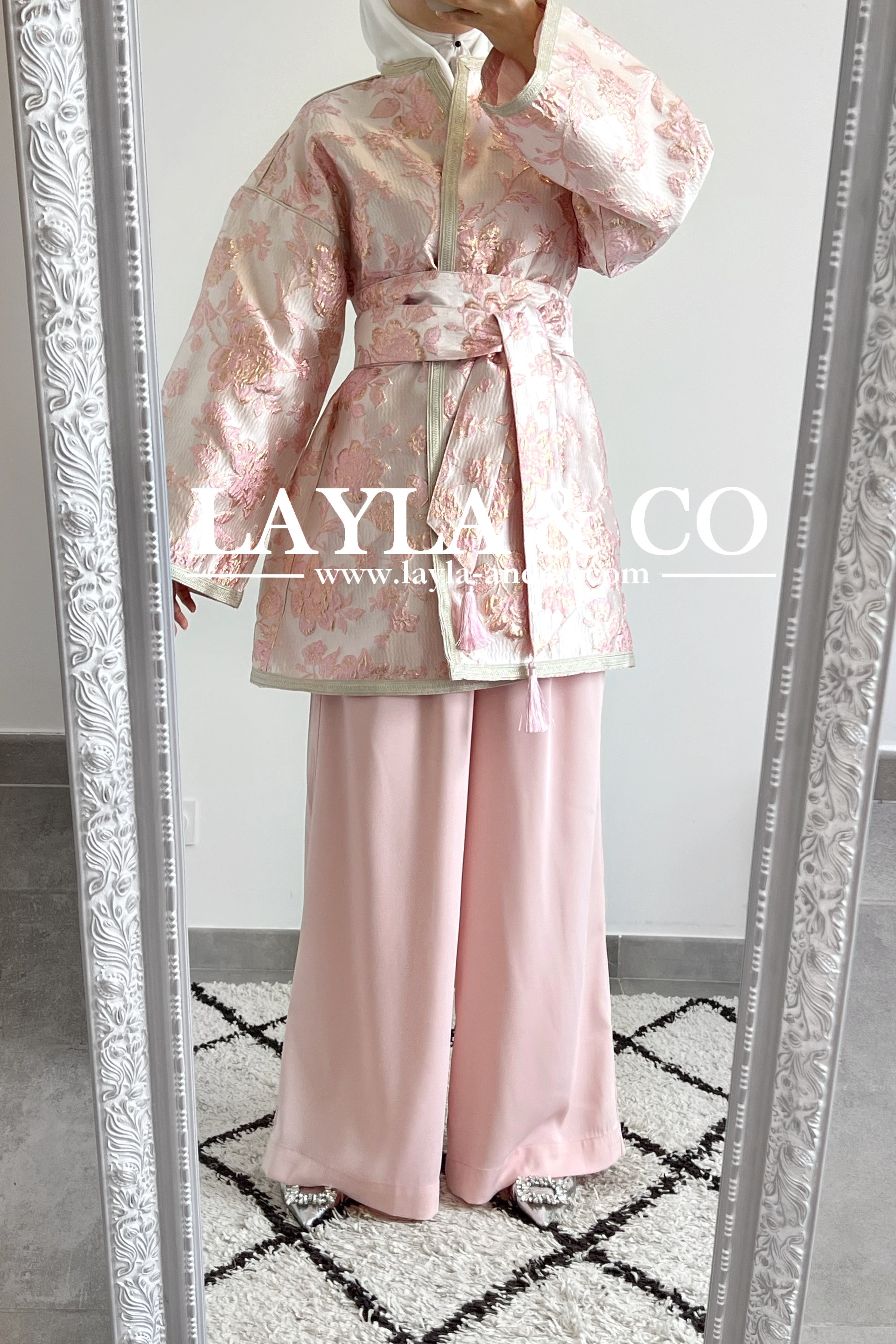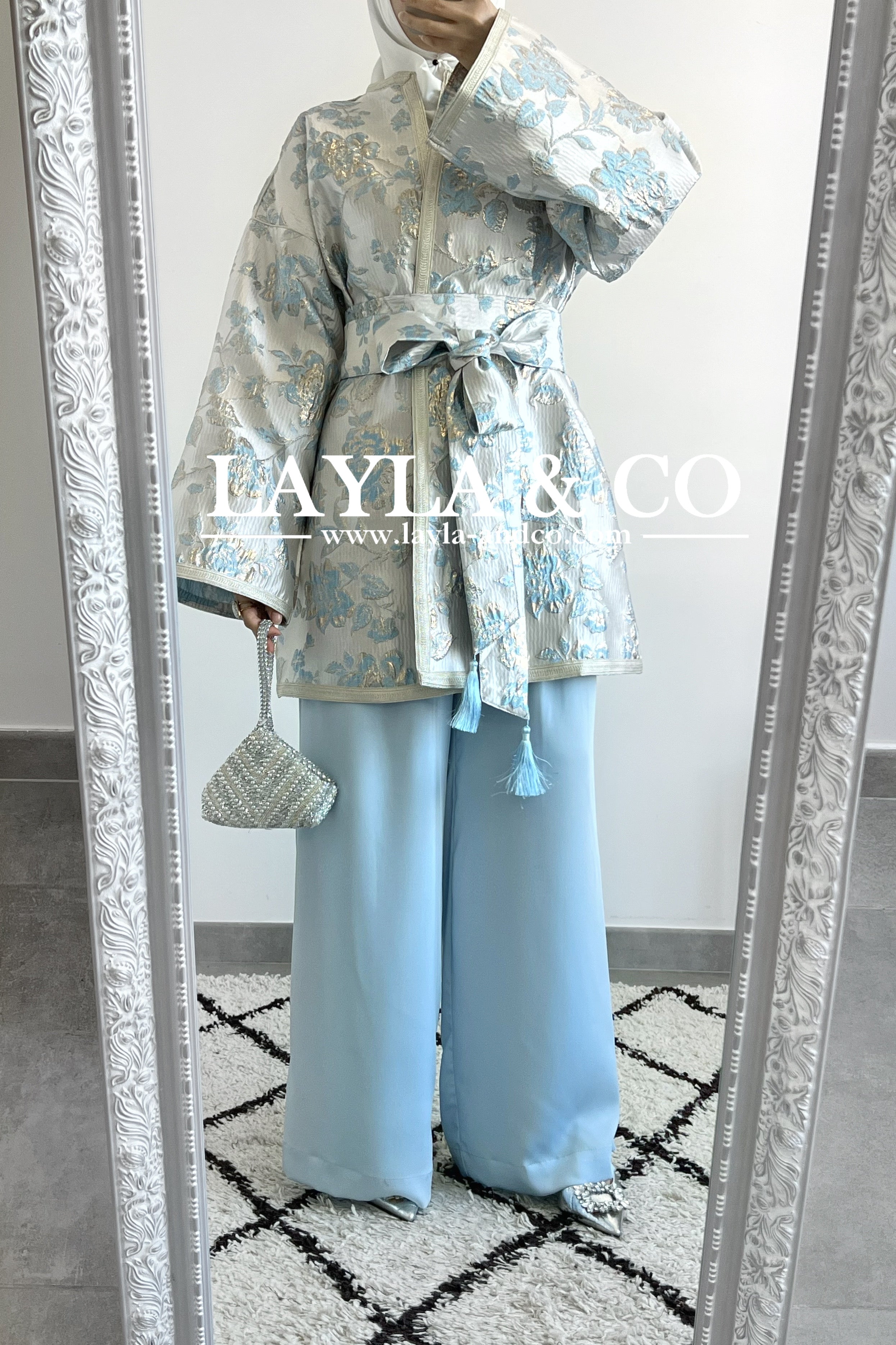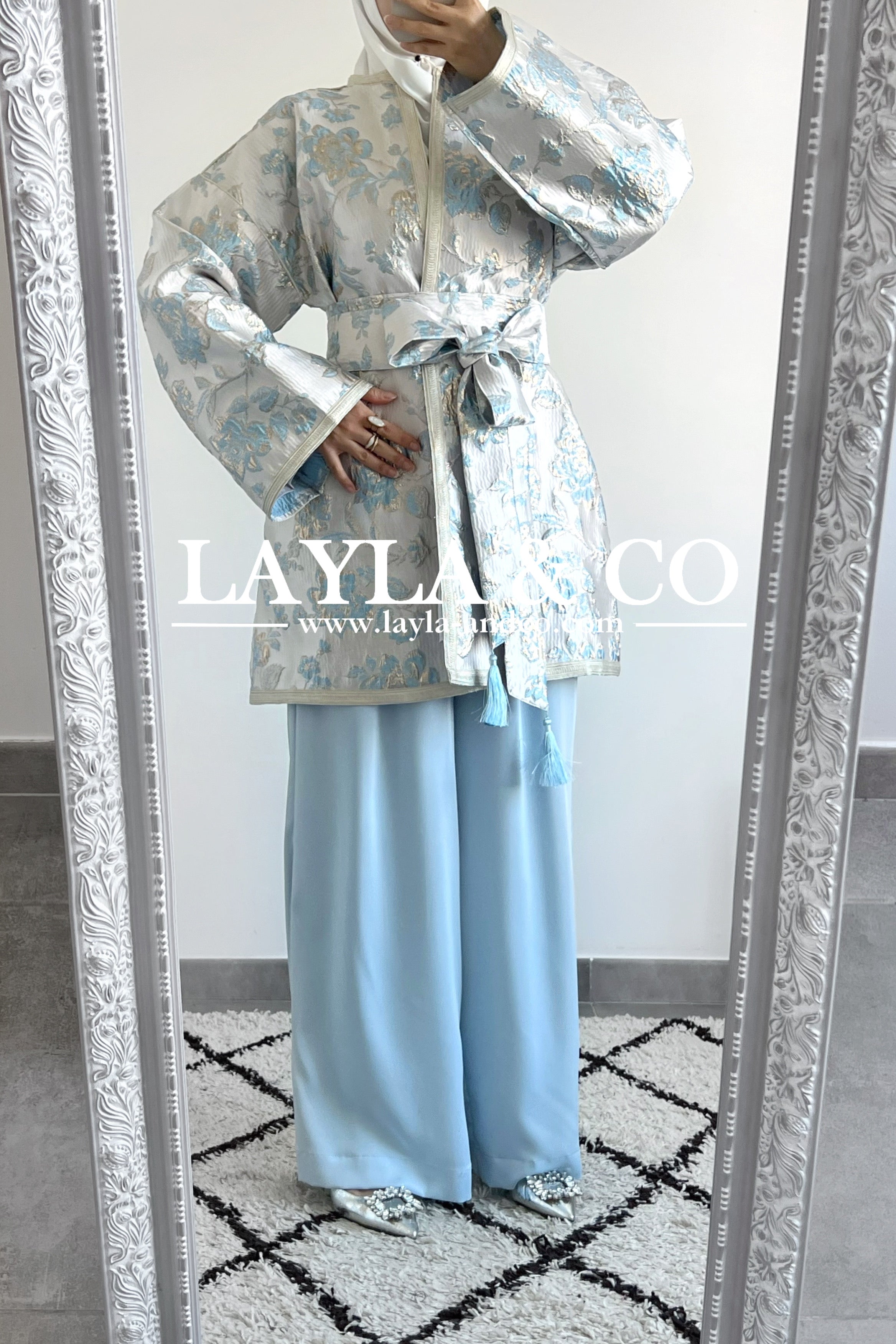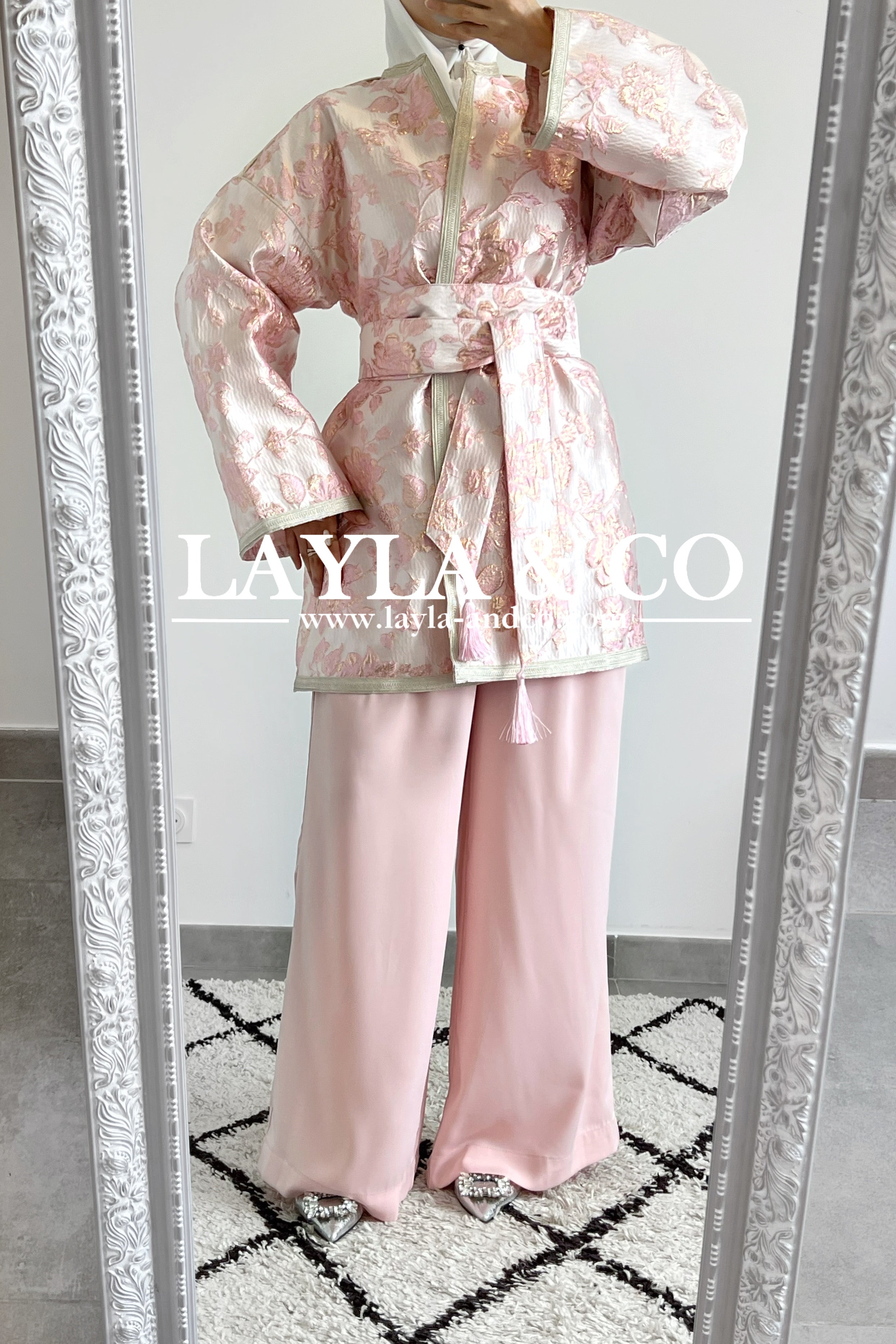 Ensemble 2 pièces composé d’un kimono brocart avec ceinture longue et pantalon satiné.