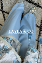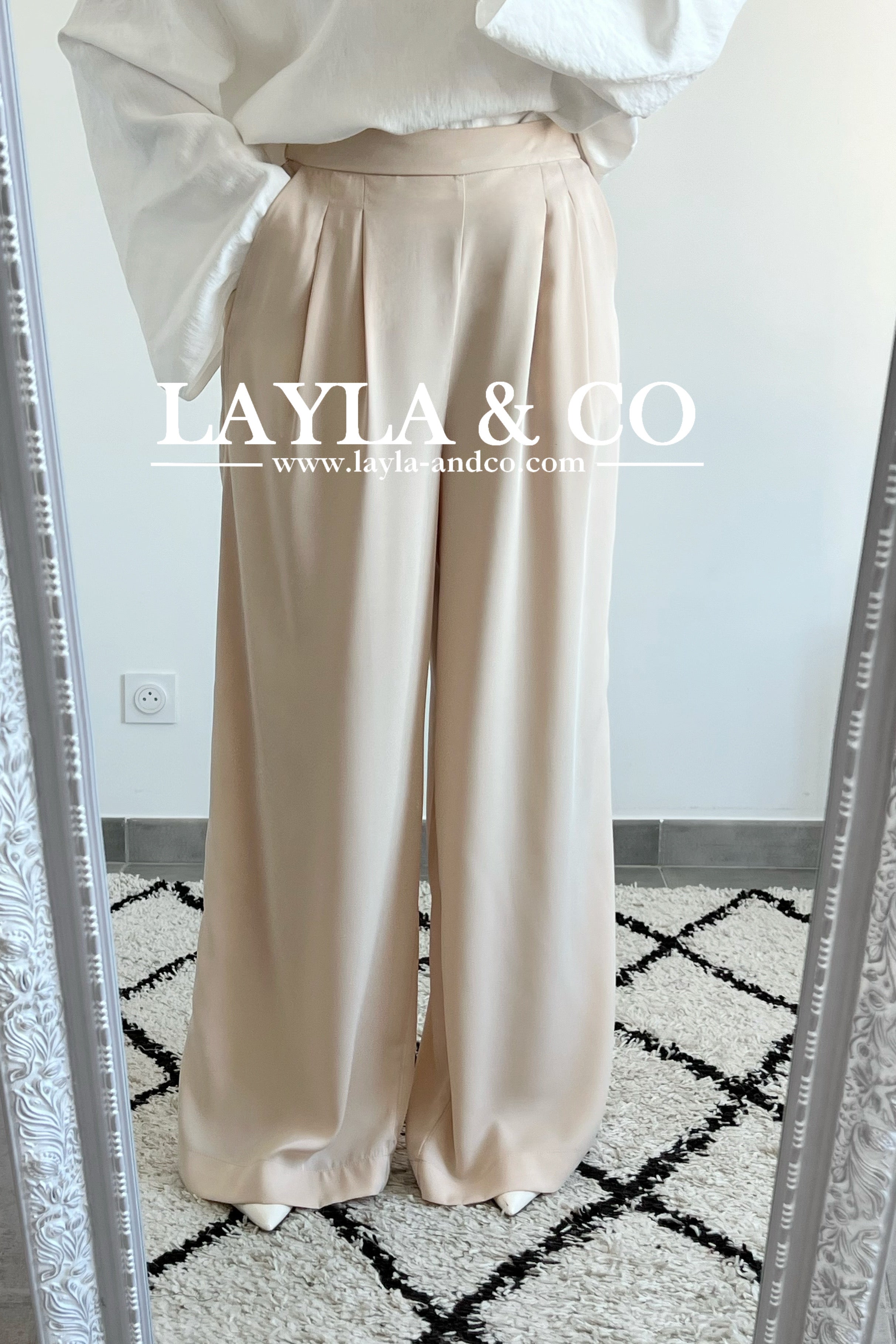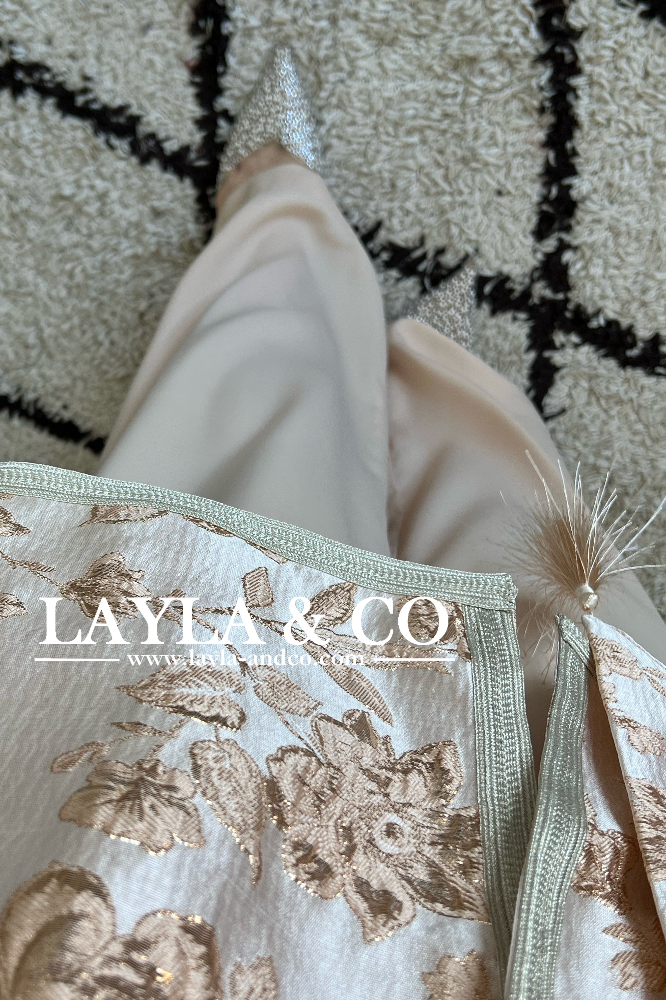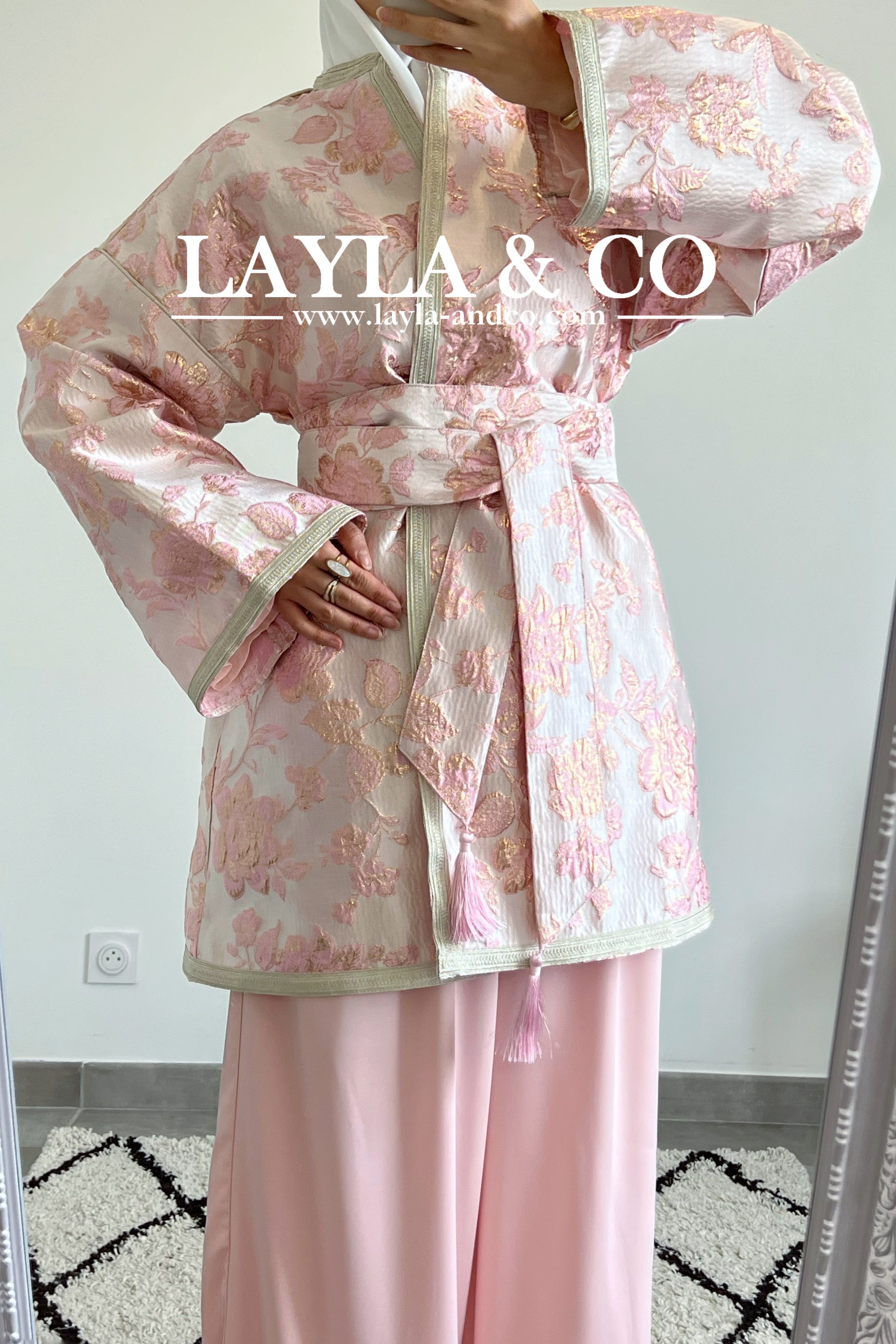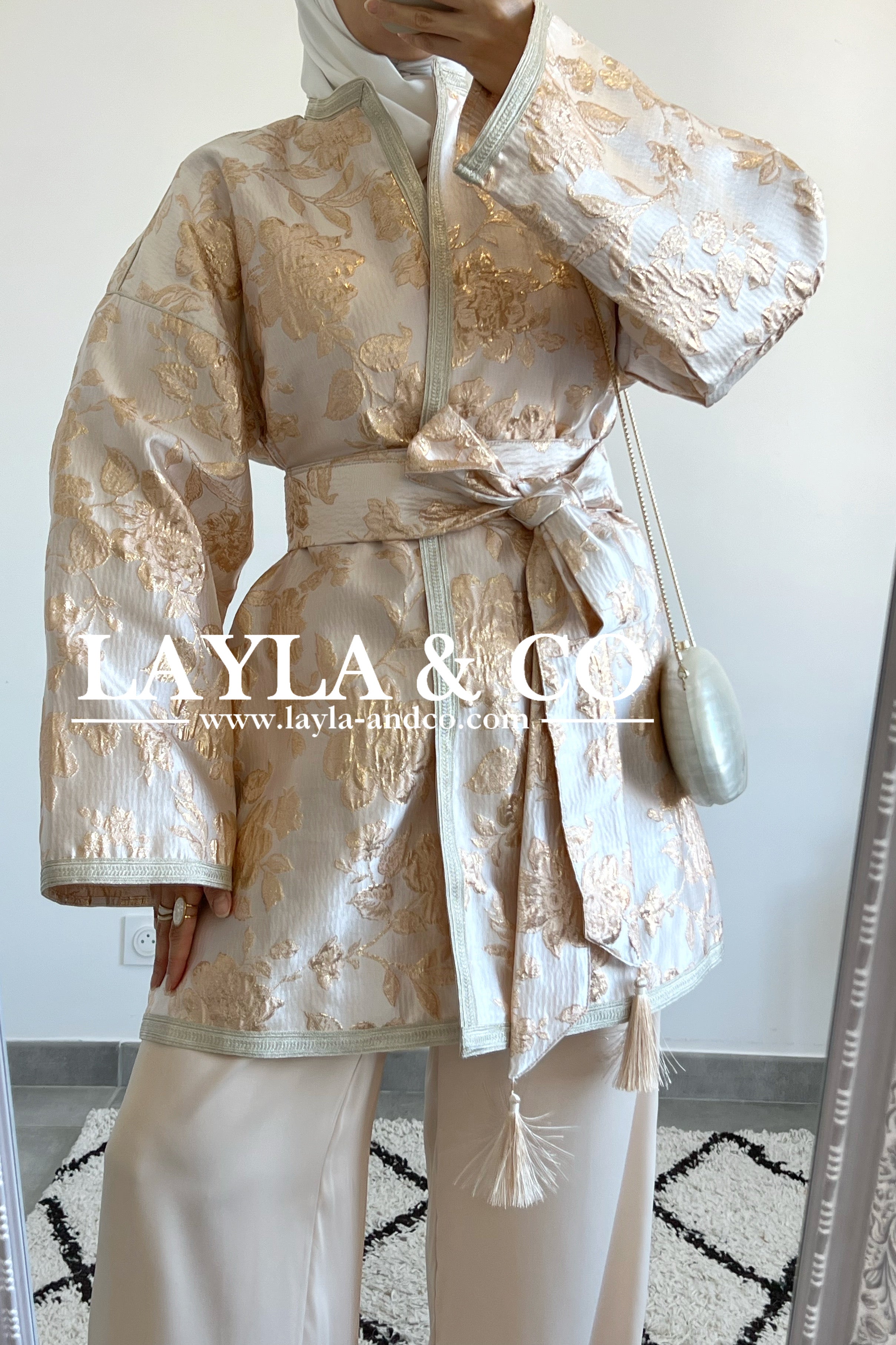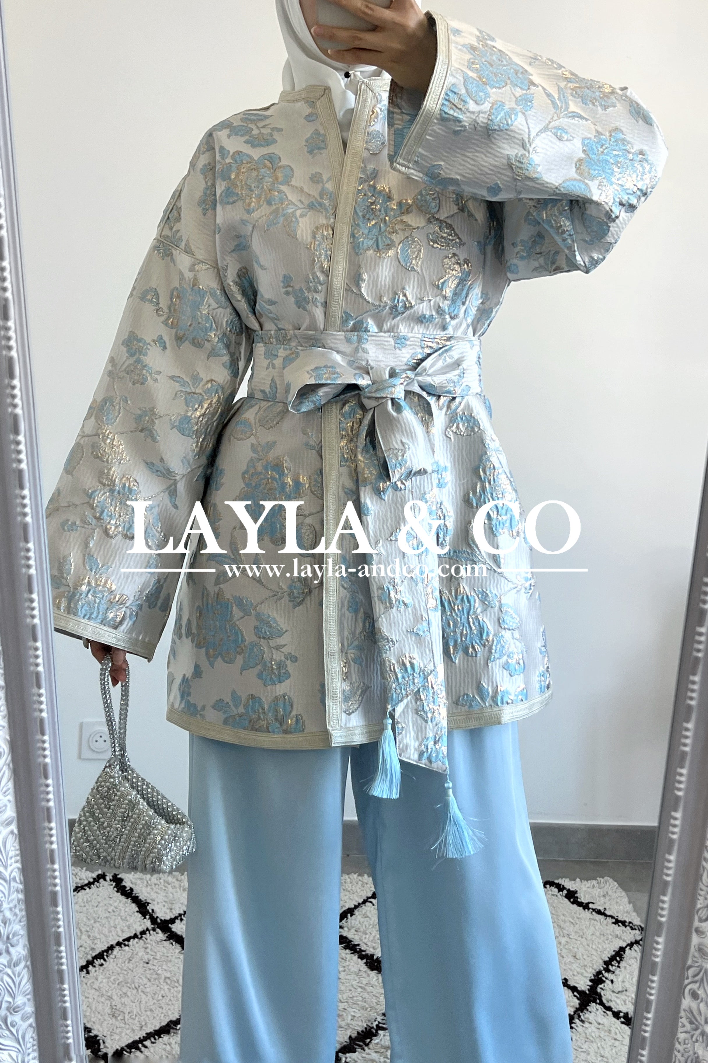 Ensemble 2 pièces composé d’un kimono brocart avec ceinture longue et pantalon satiné.