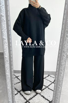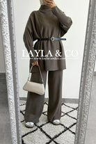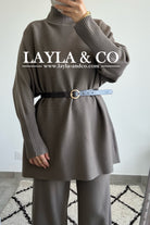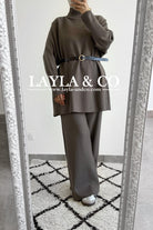 Ensemble composé d’un pull long ample col montant et d’un pantalon élastique à la taille. Ceinture fournie