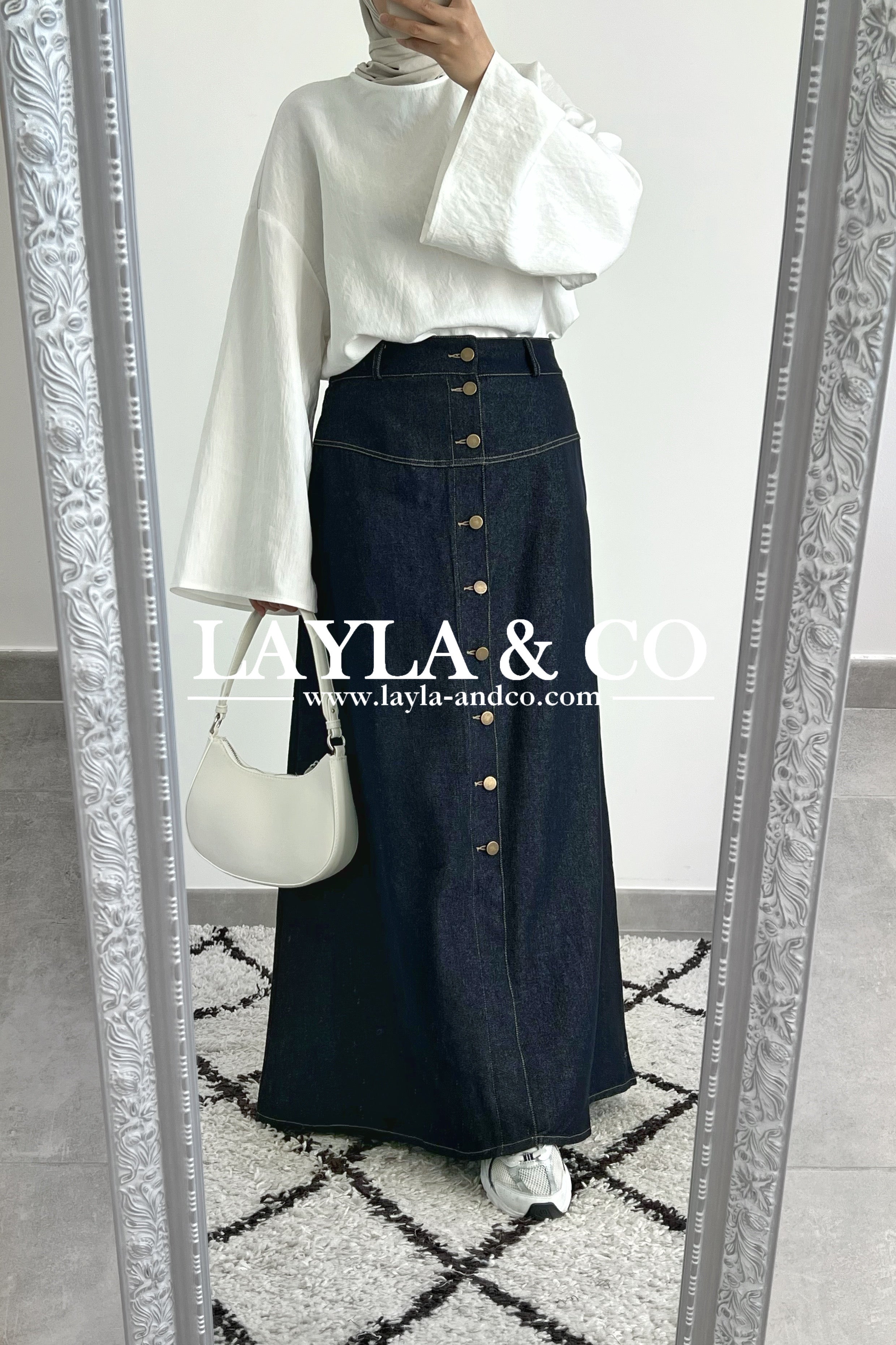 Jupe en jean couleur brut avec boutons et pôches, coupe évasée dans le bas.