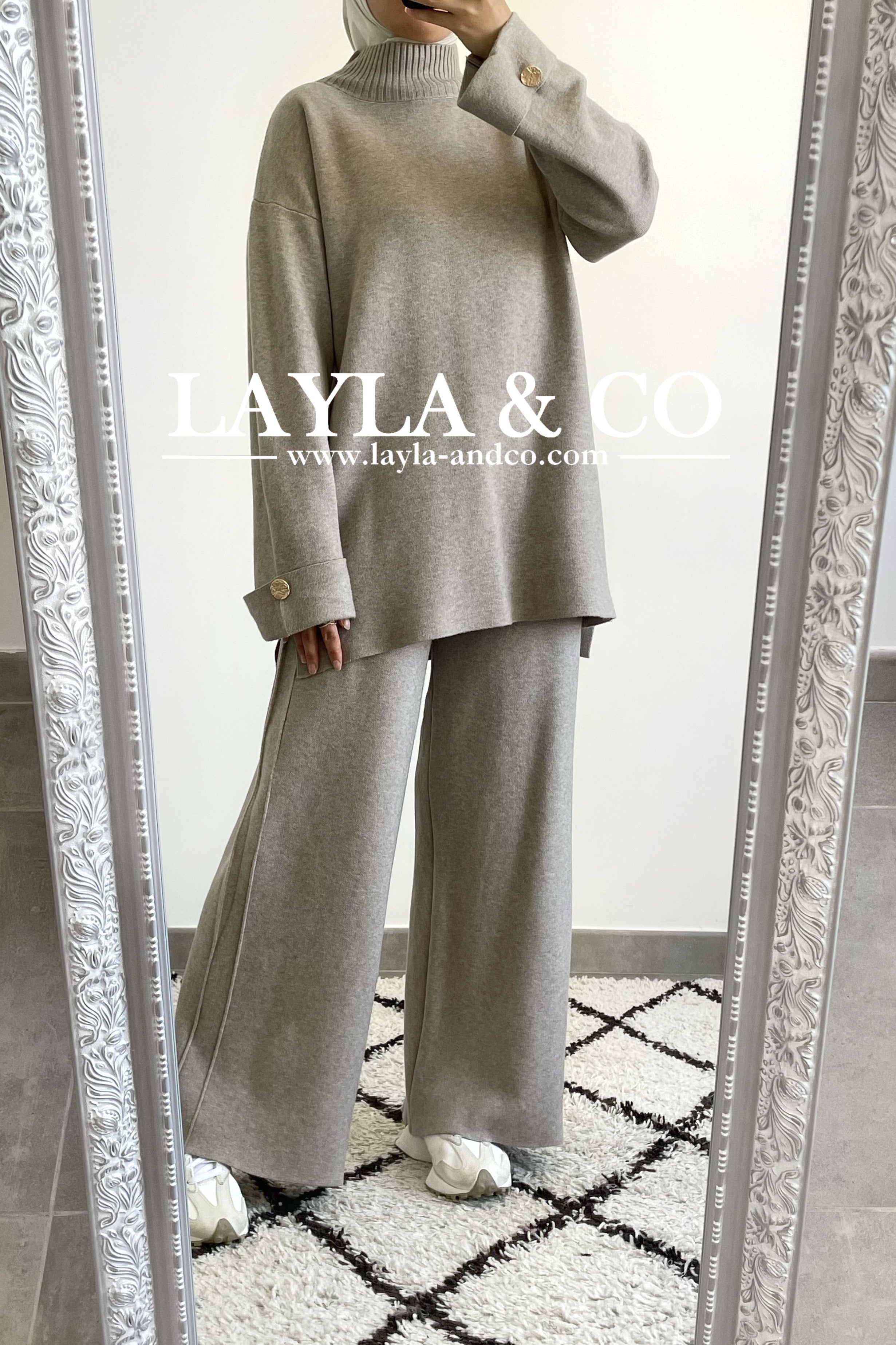 - d’un pull col montant avec manches à revers et bouton doré décoratif. Le pull dispose d’une petite fente sur le côté du pull.