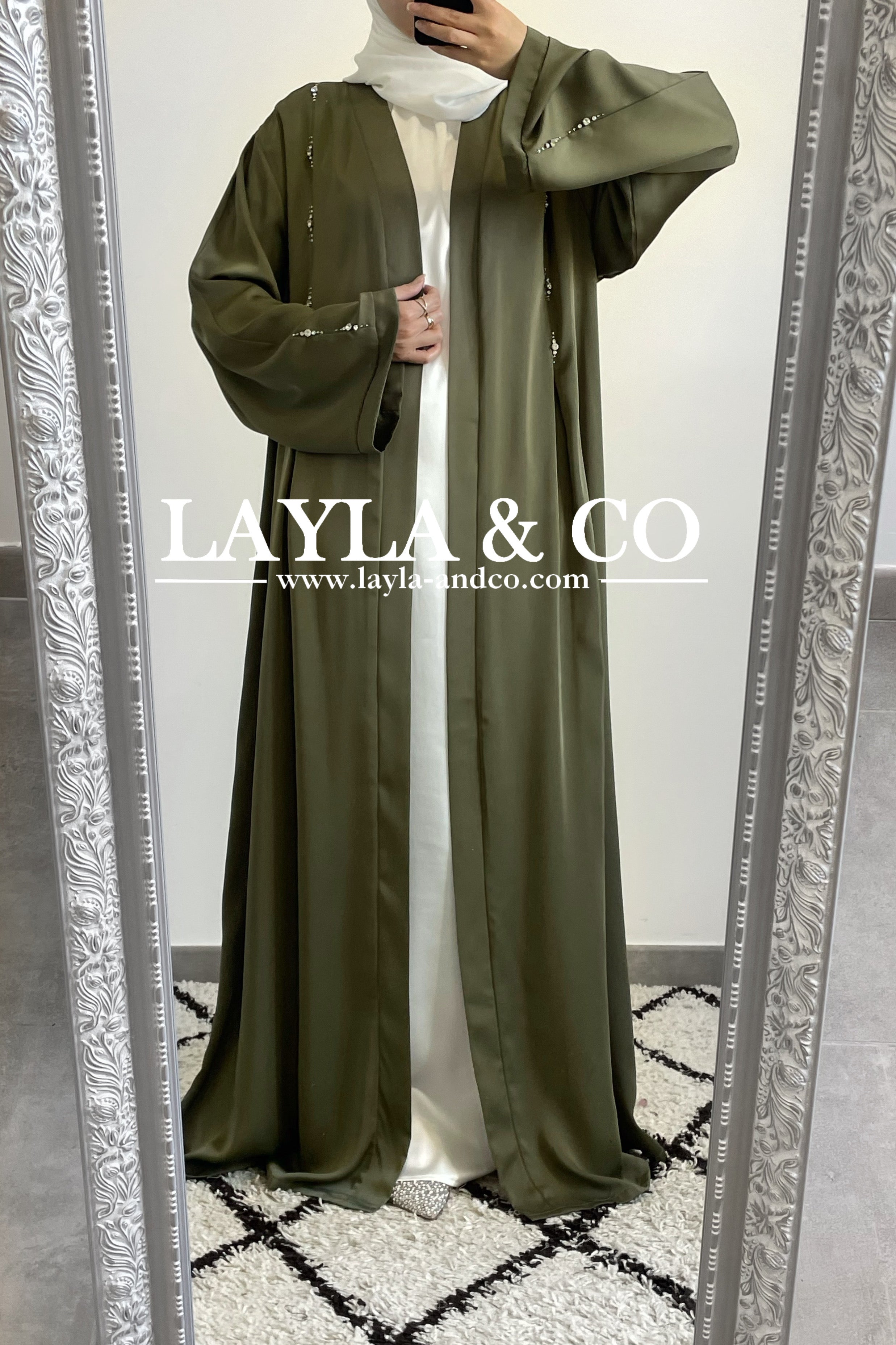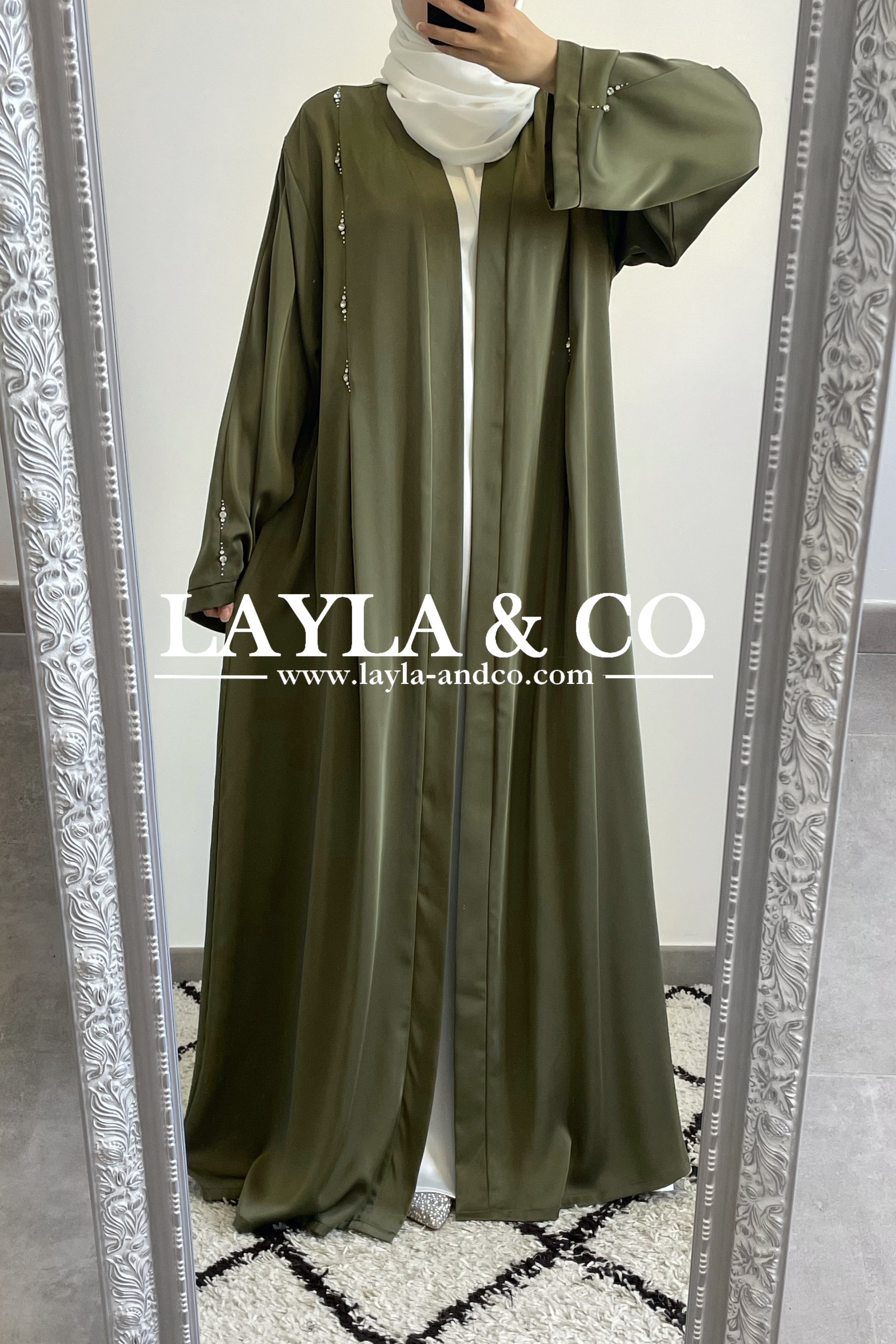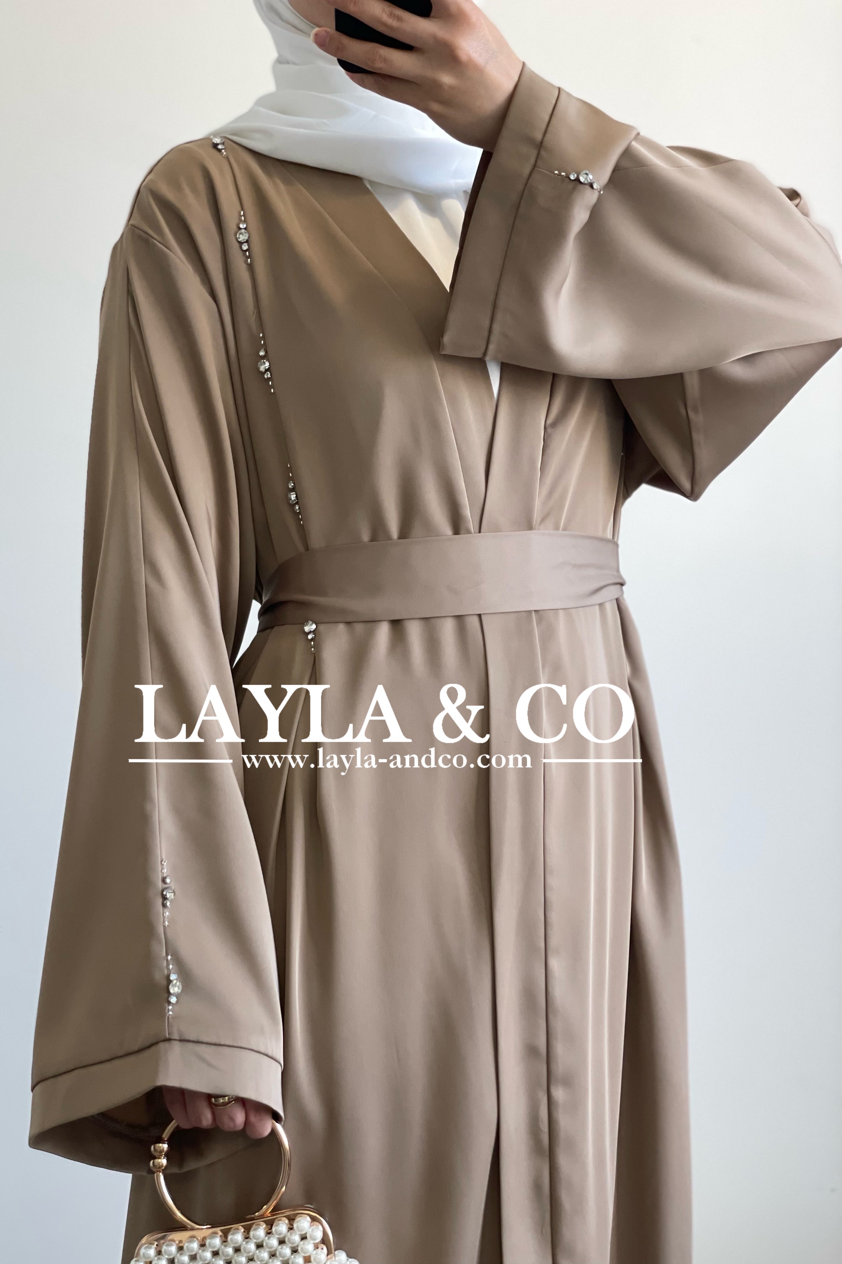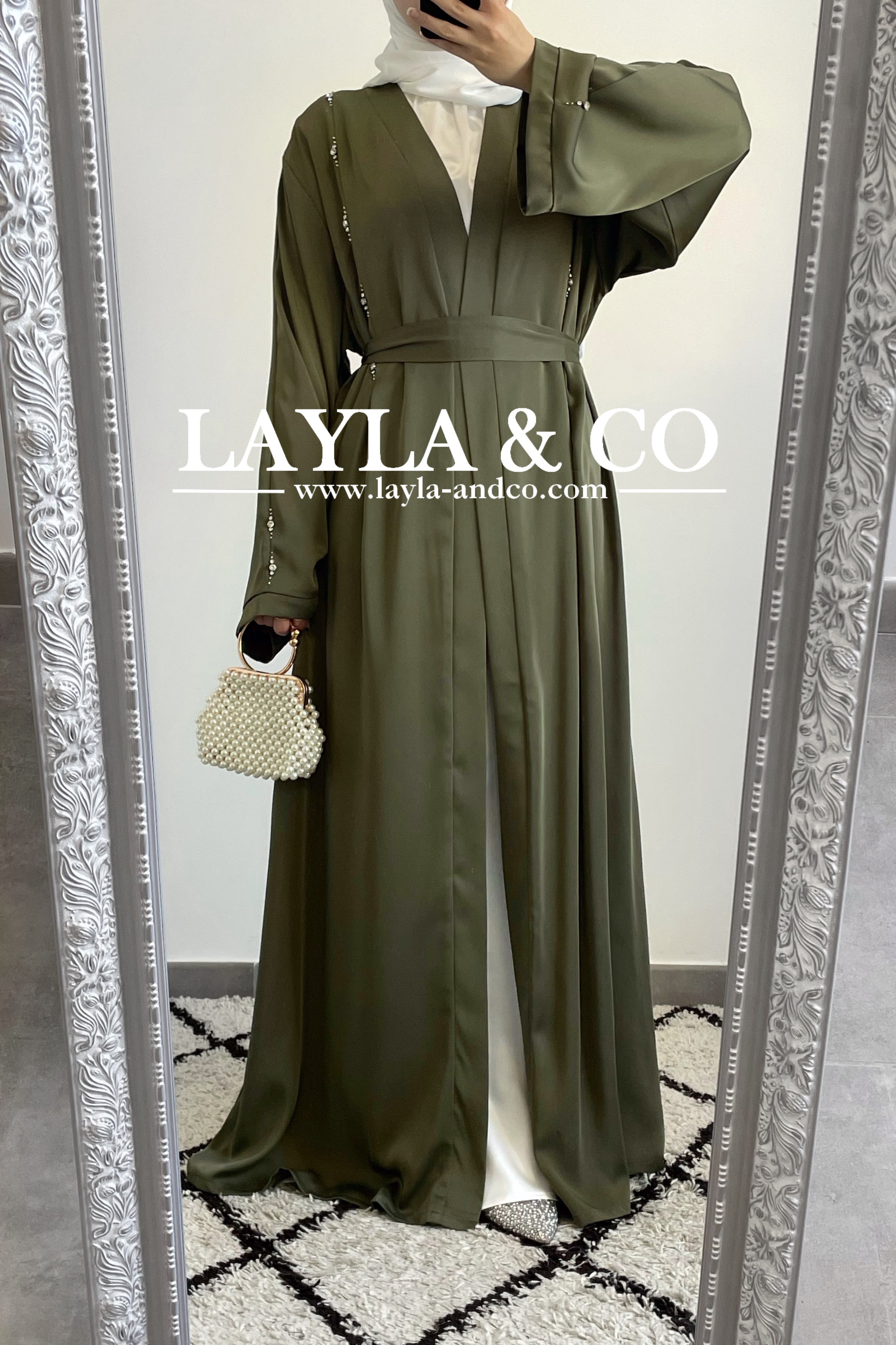 Kimono satiné de qualité supérieure, decoré de strass cousu main. Ceinture fournie