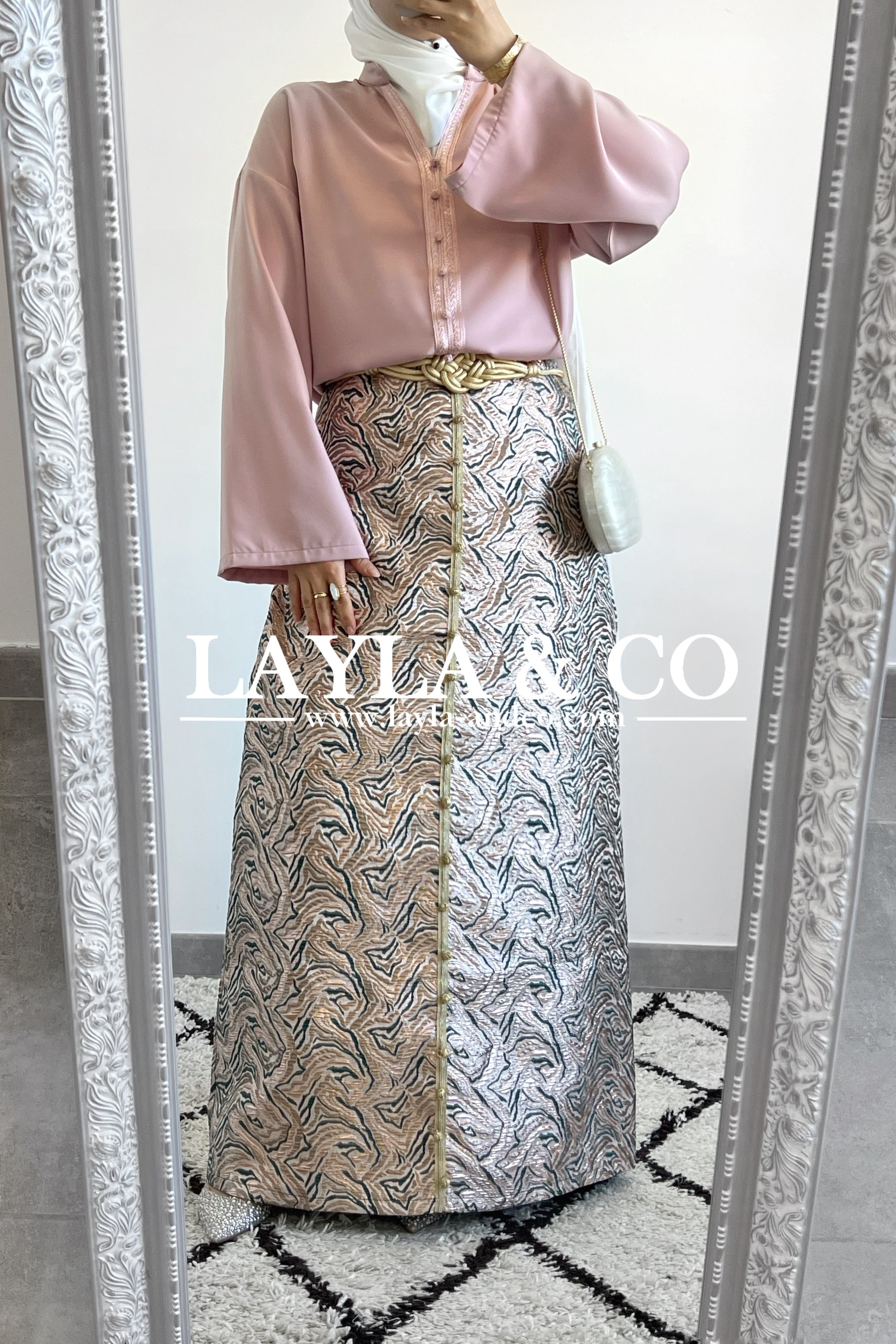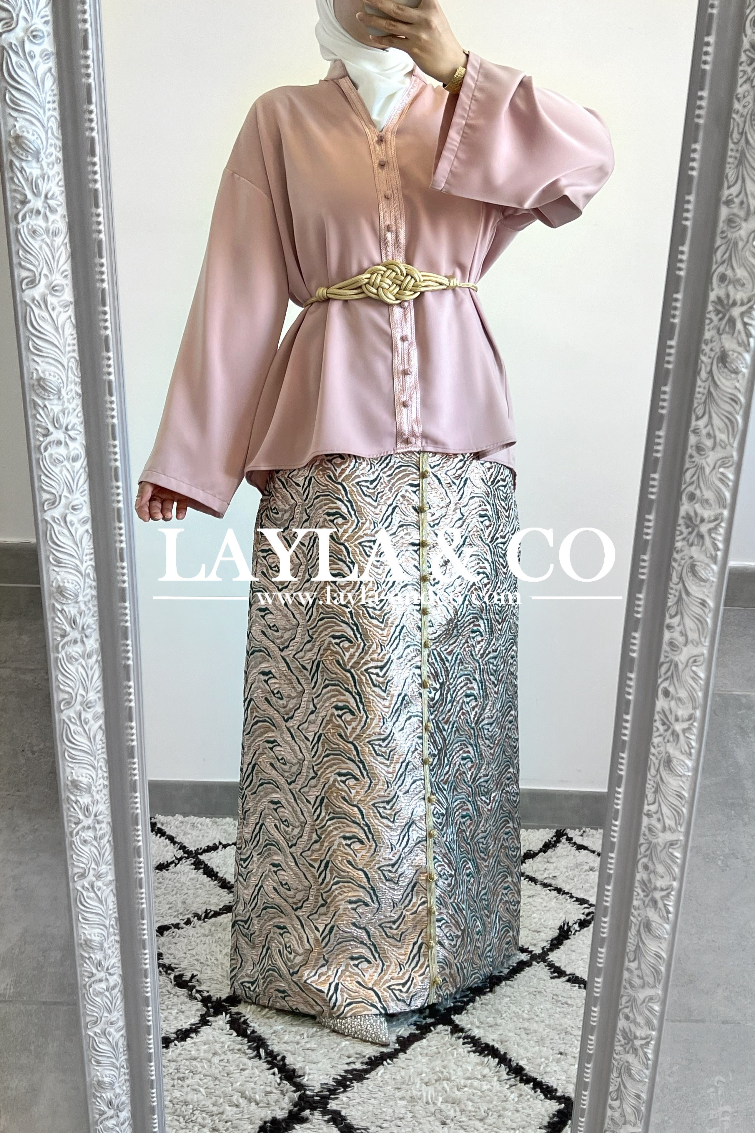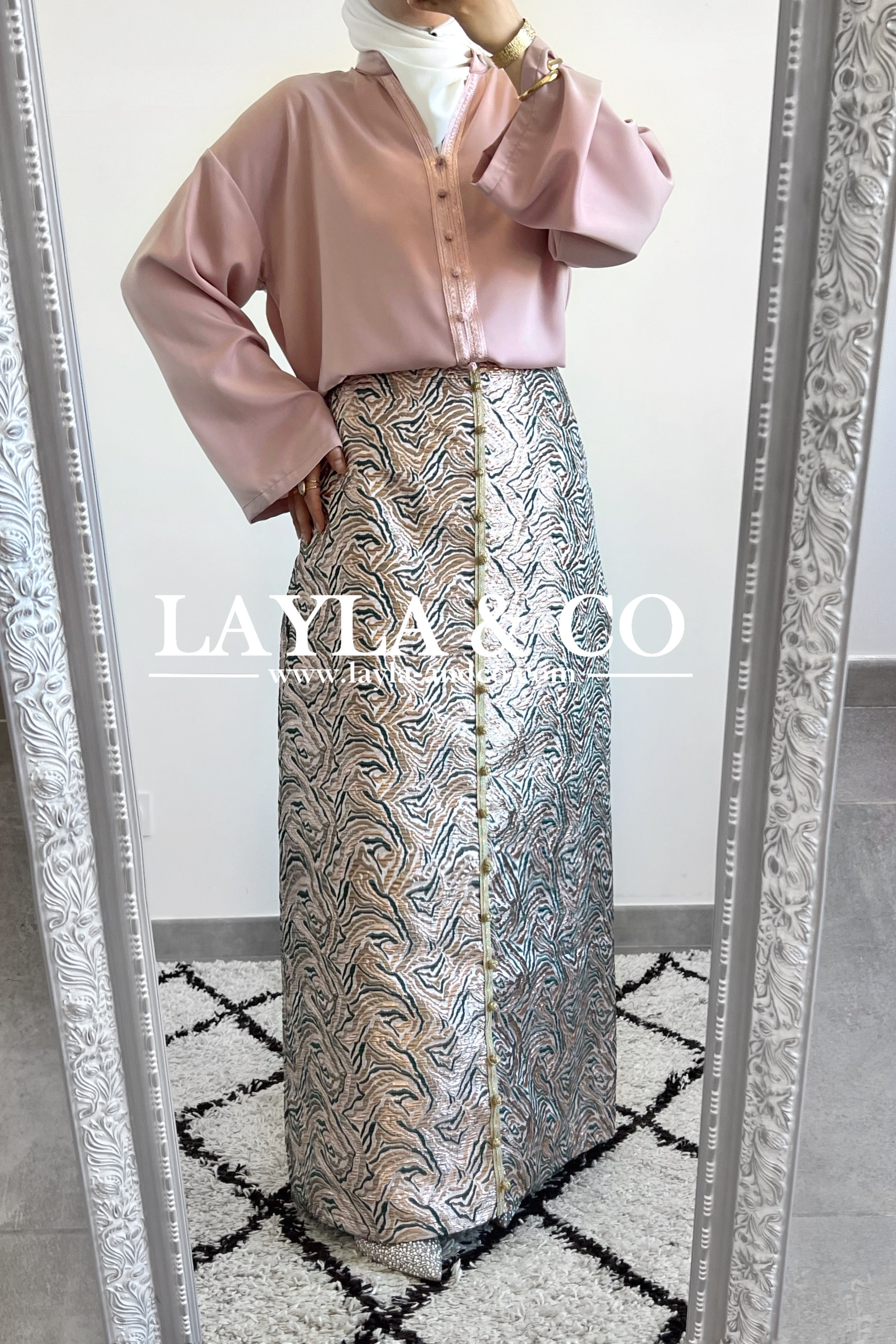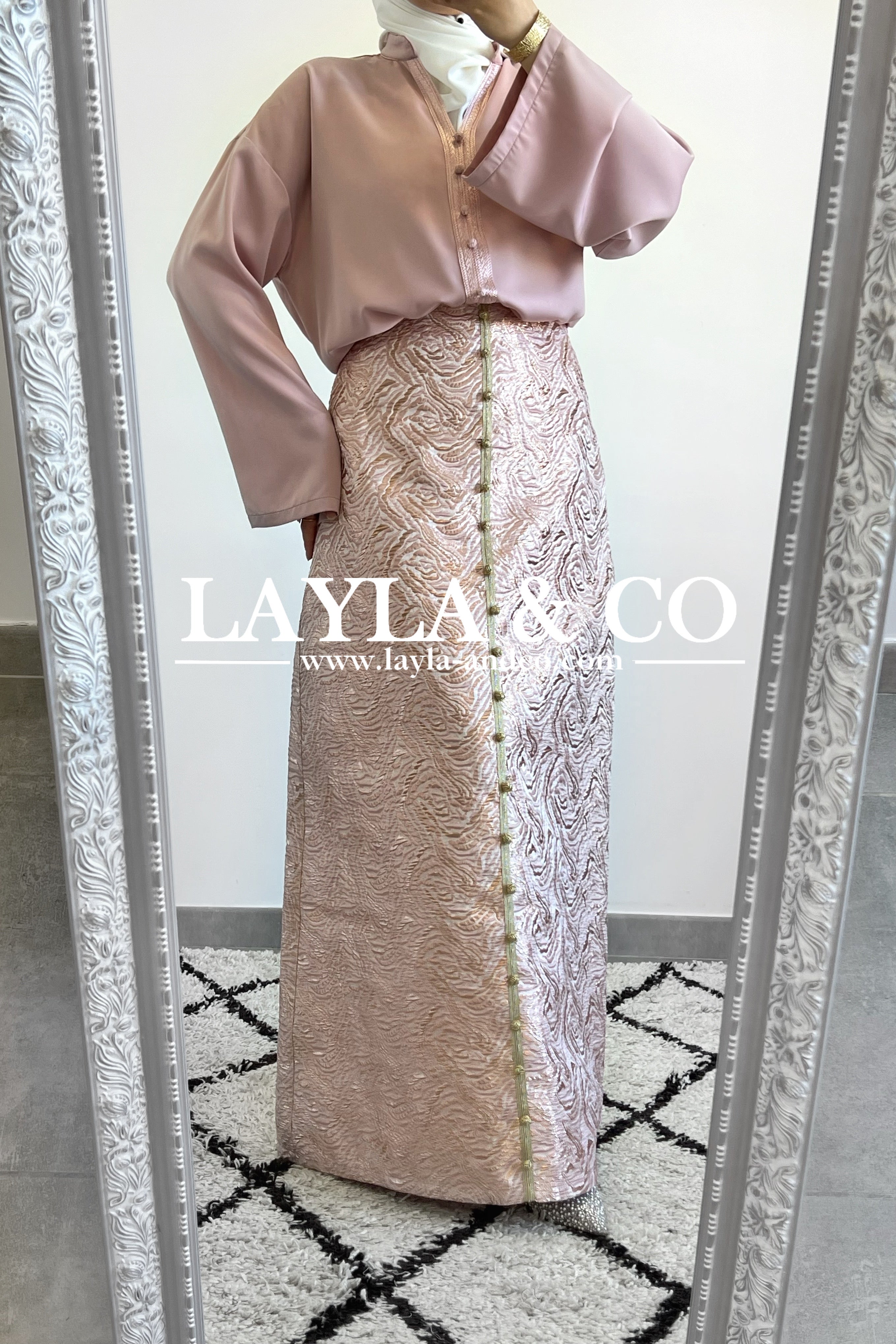 Détails boutons dorés style caftan.