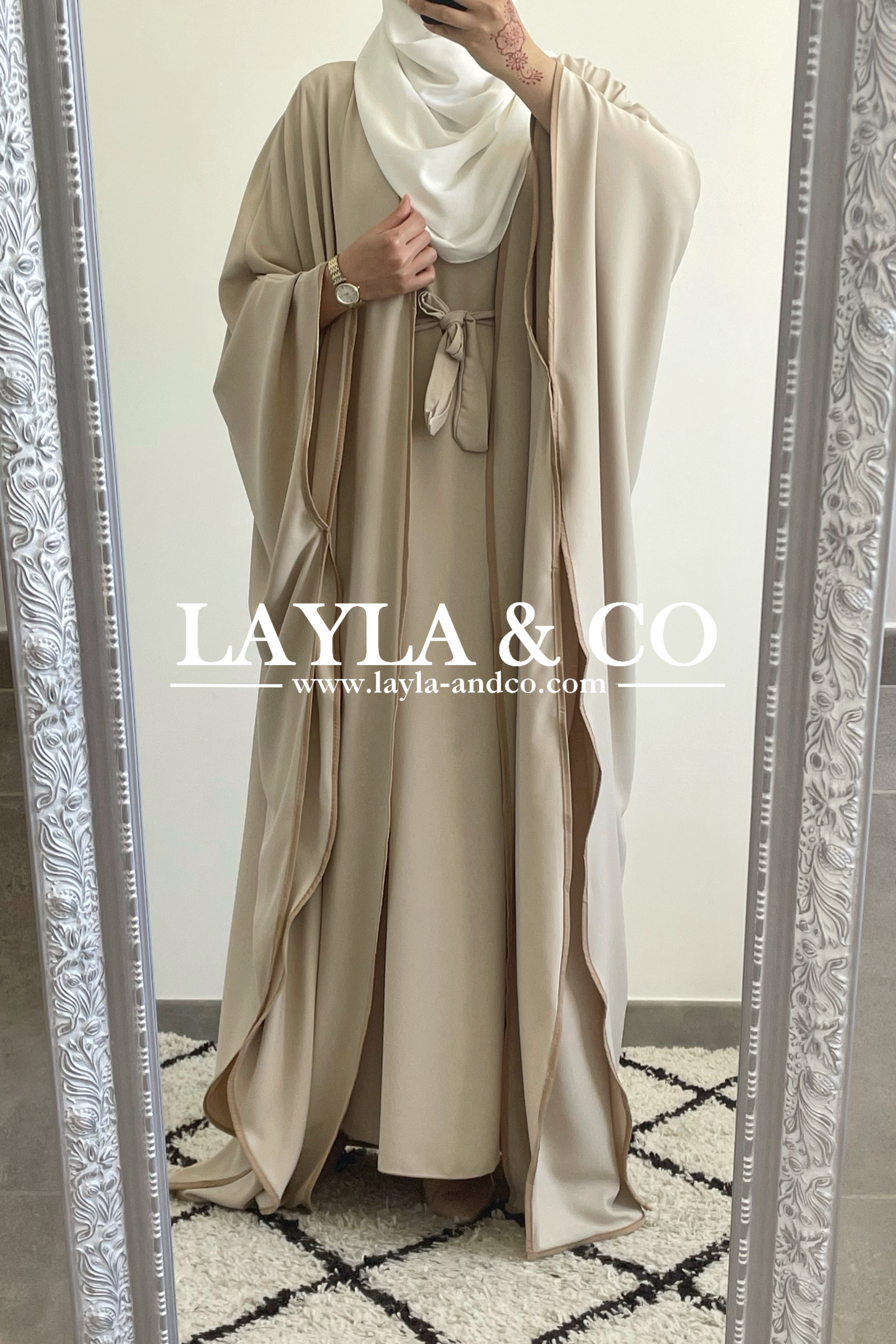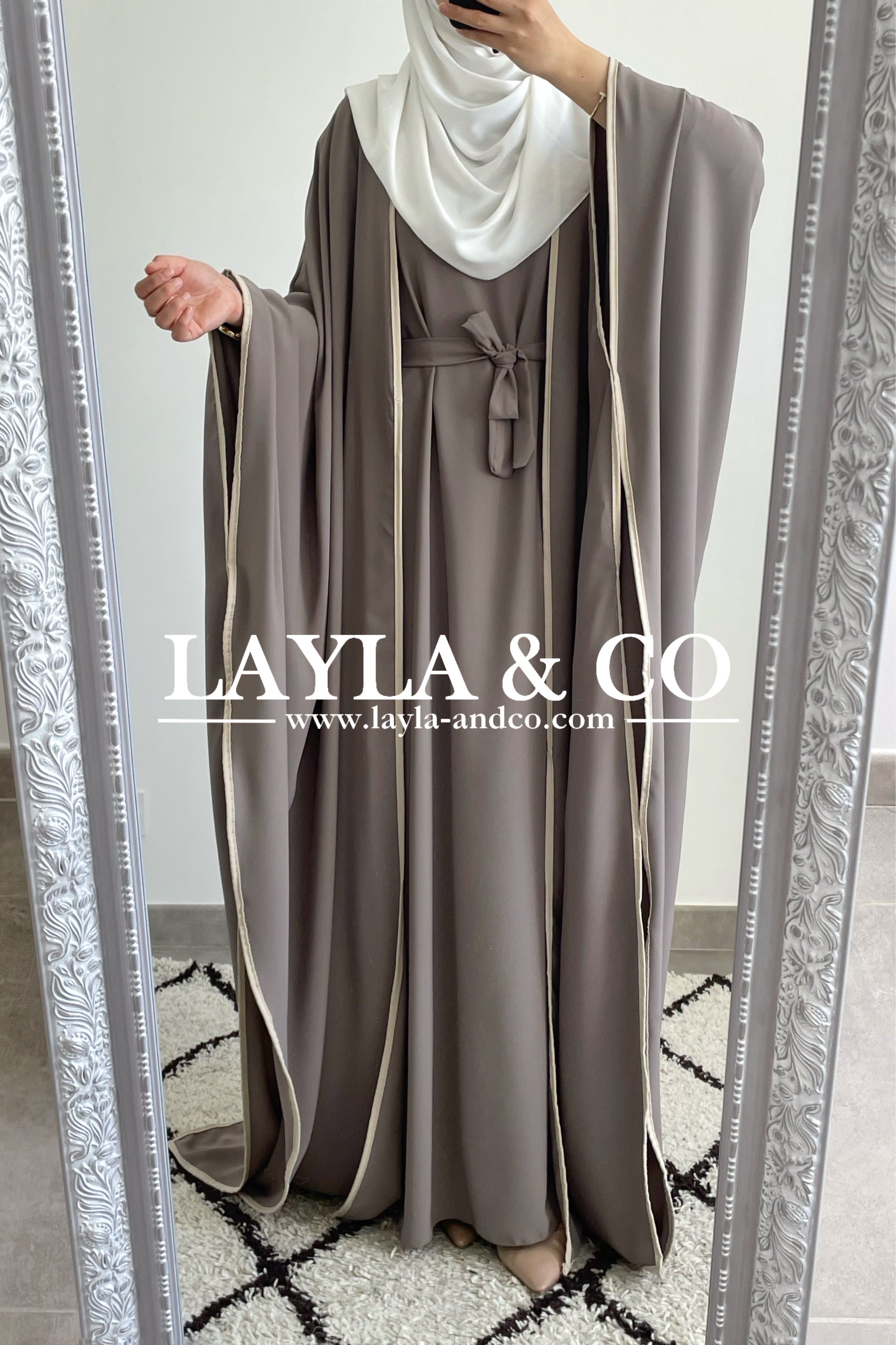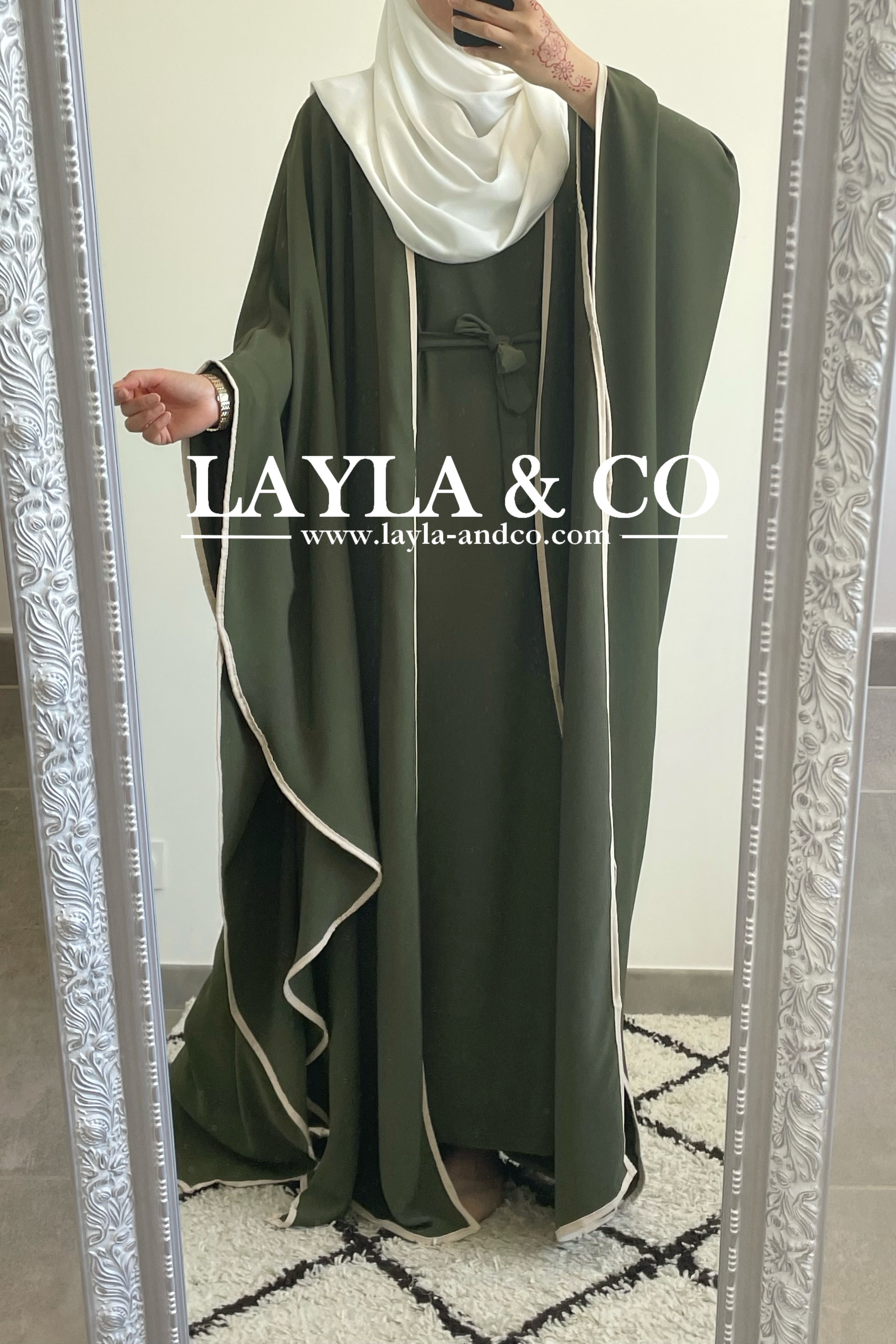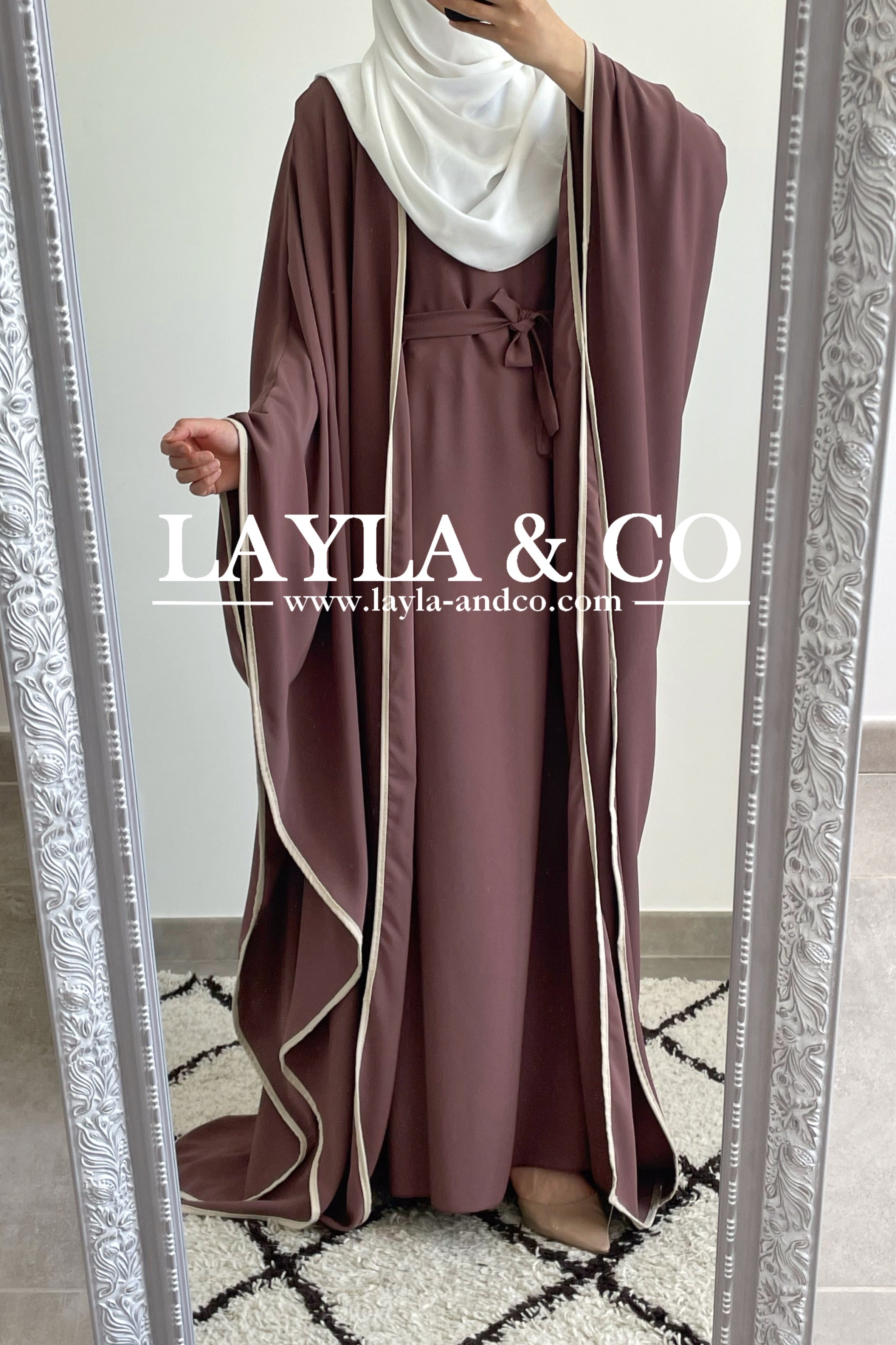 Ensemble 2 pièces composé d’une sous robe débardeur et d’un kimono cape assorti. Détail de bordure en contraste en couleur blanche ou beige selon les couleurs.