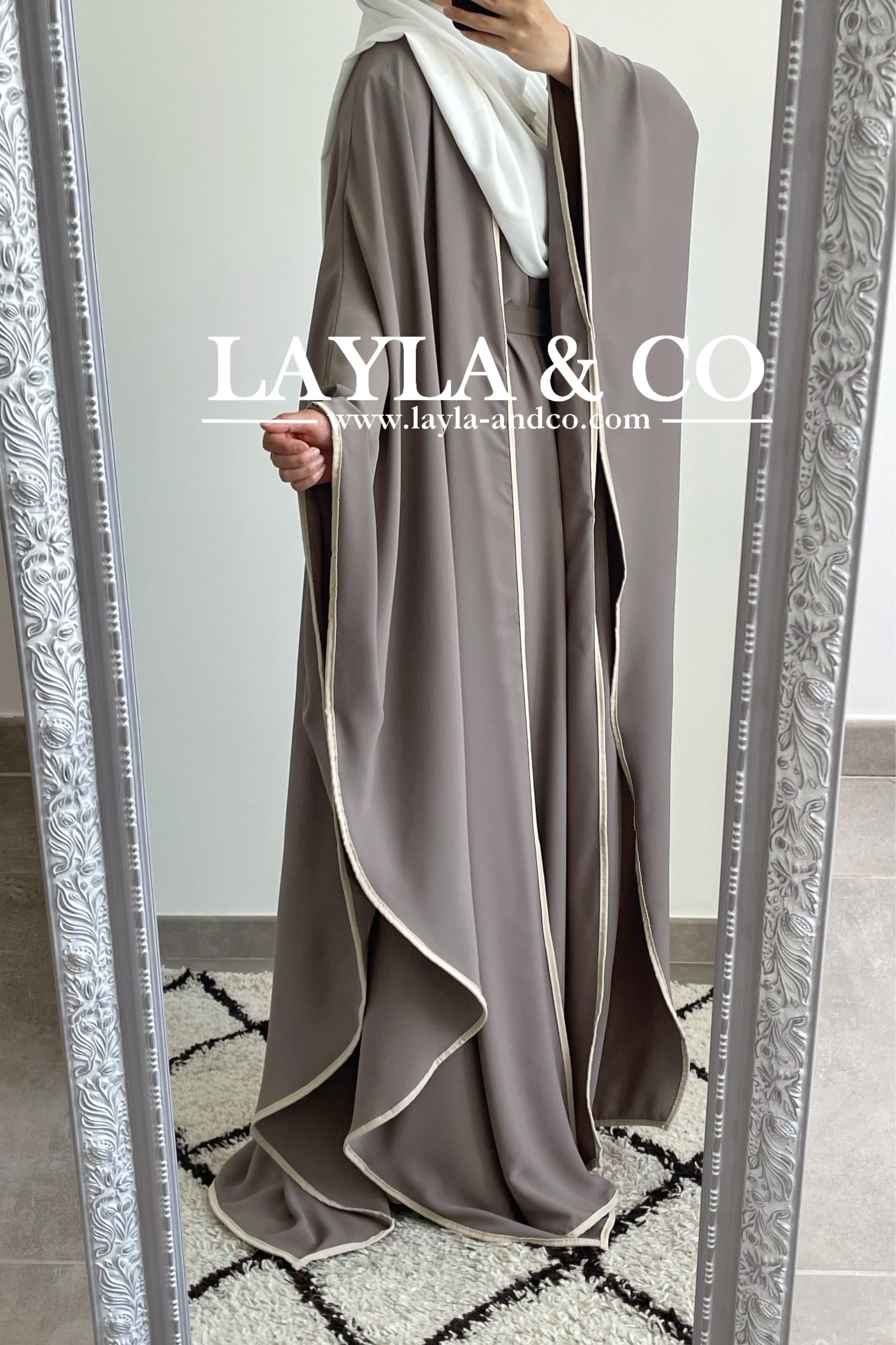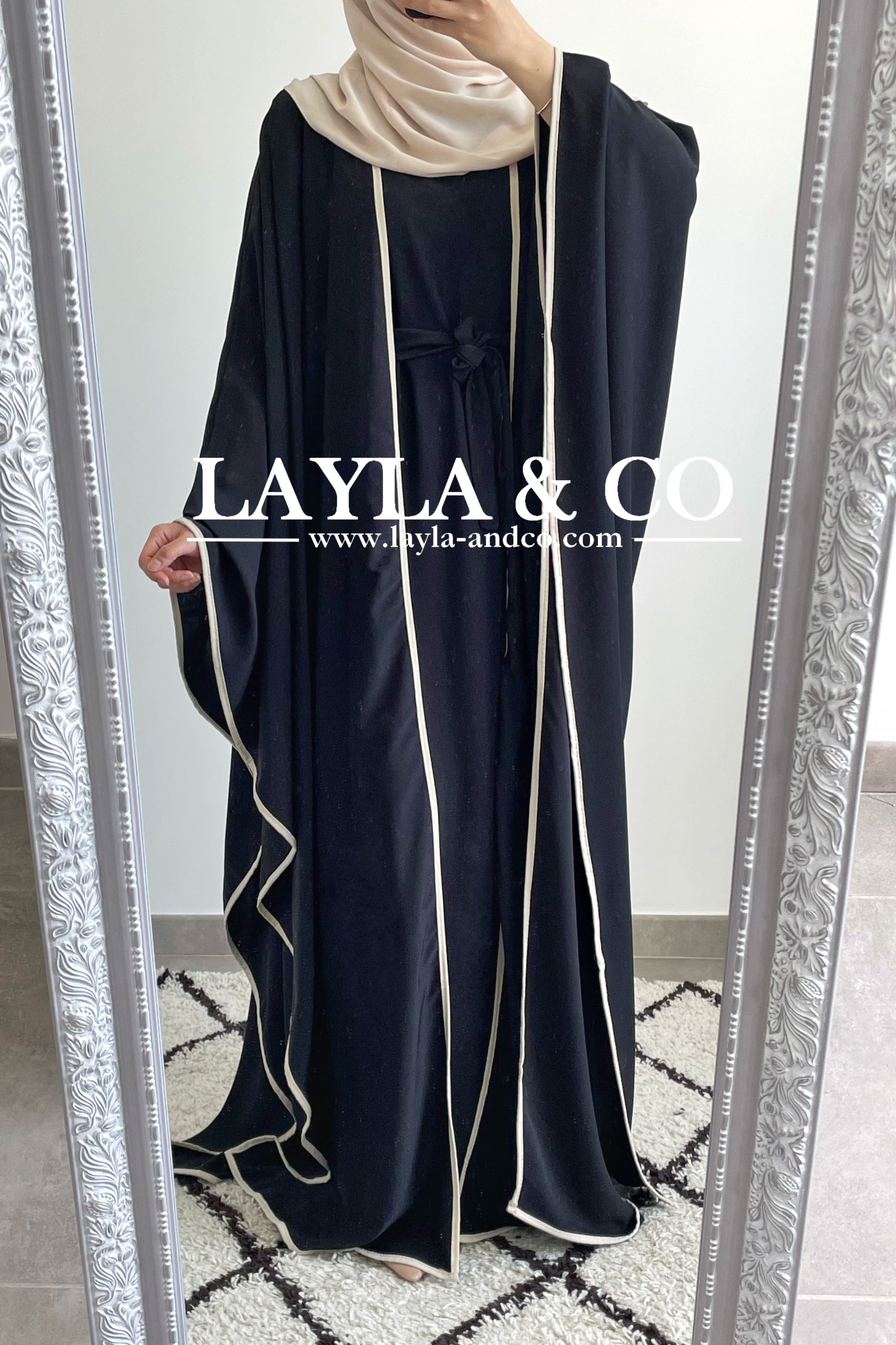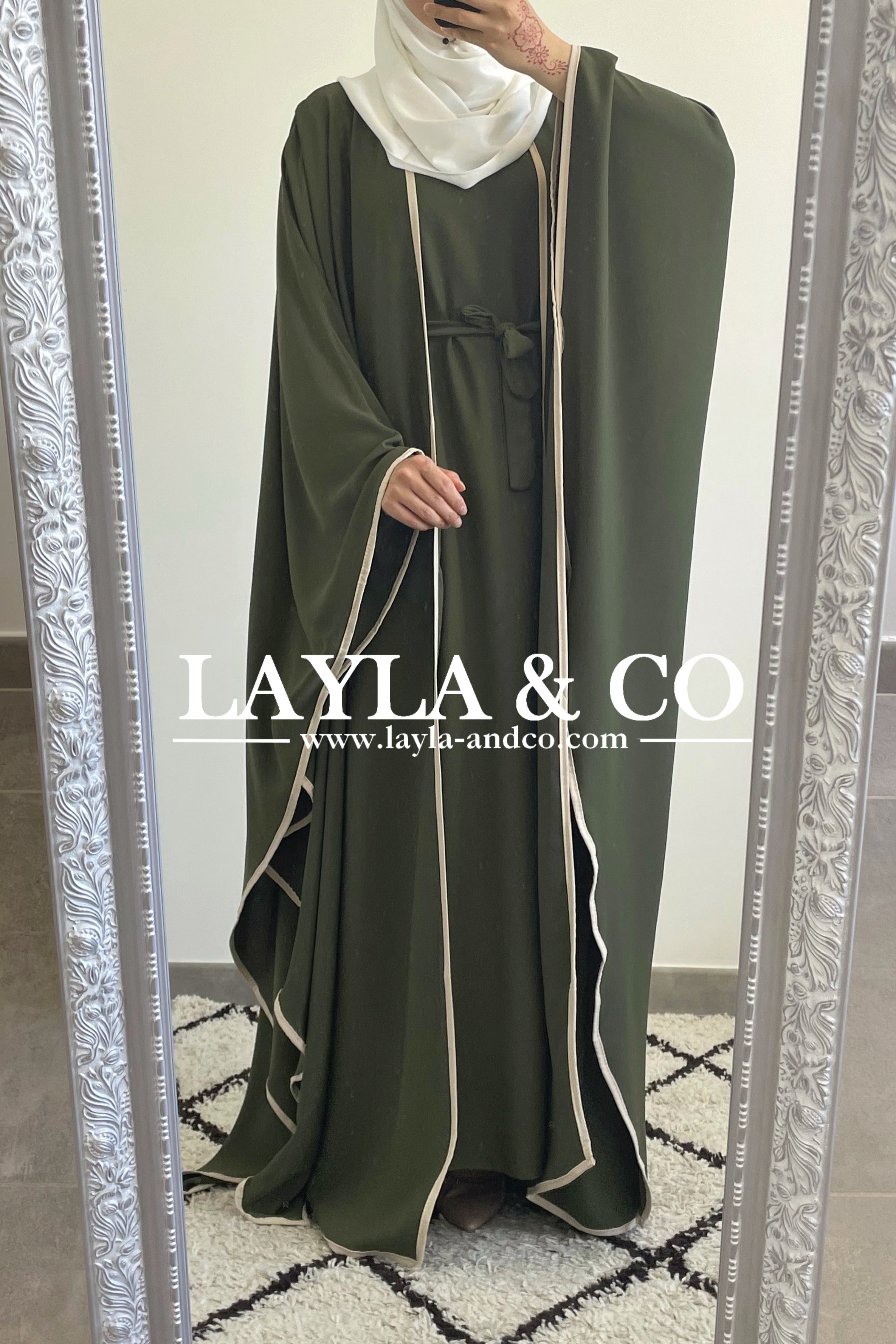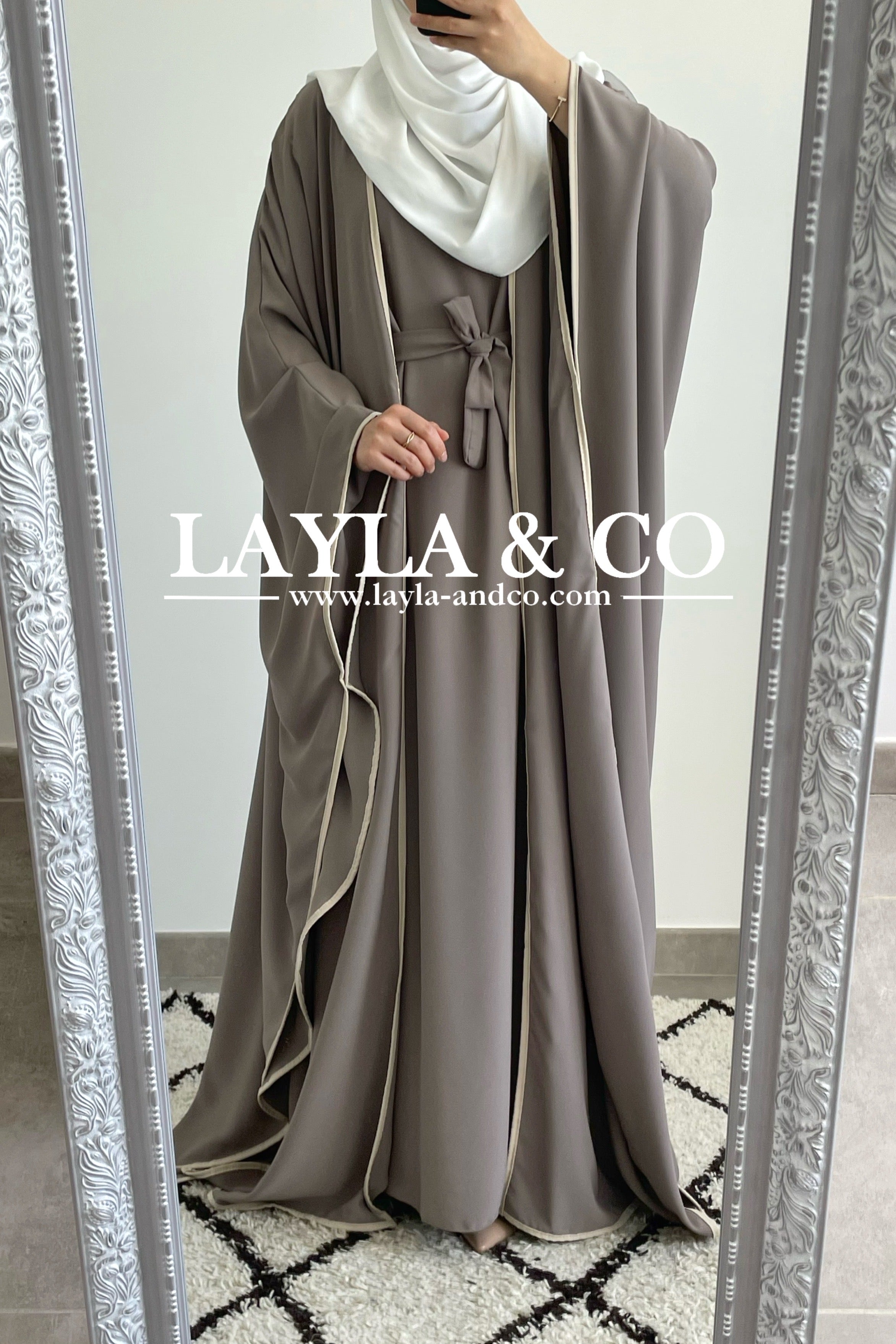 Ensemble 2 pièces composé d’une sous robe débardeur et d’un kimono cape assorti. Détail de bordure en contraste en couleur blanche ou beige selon les couleurs.