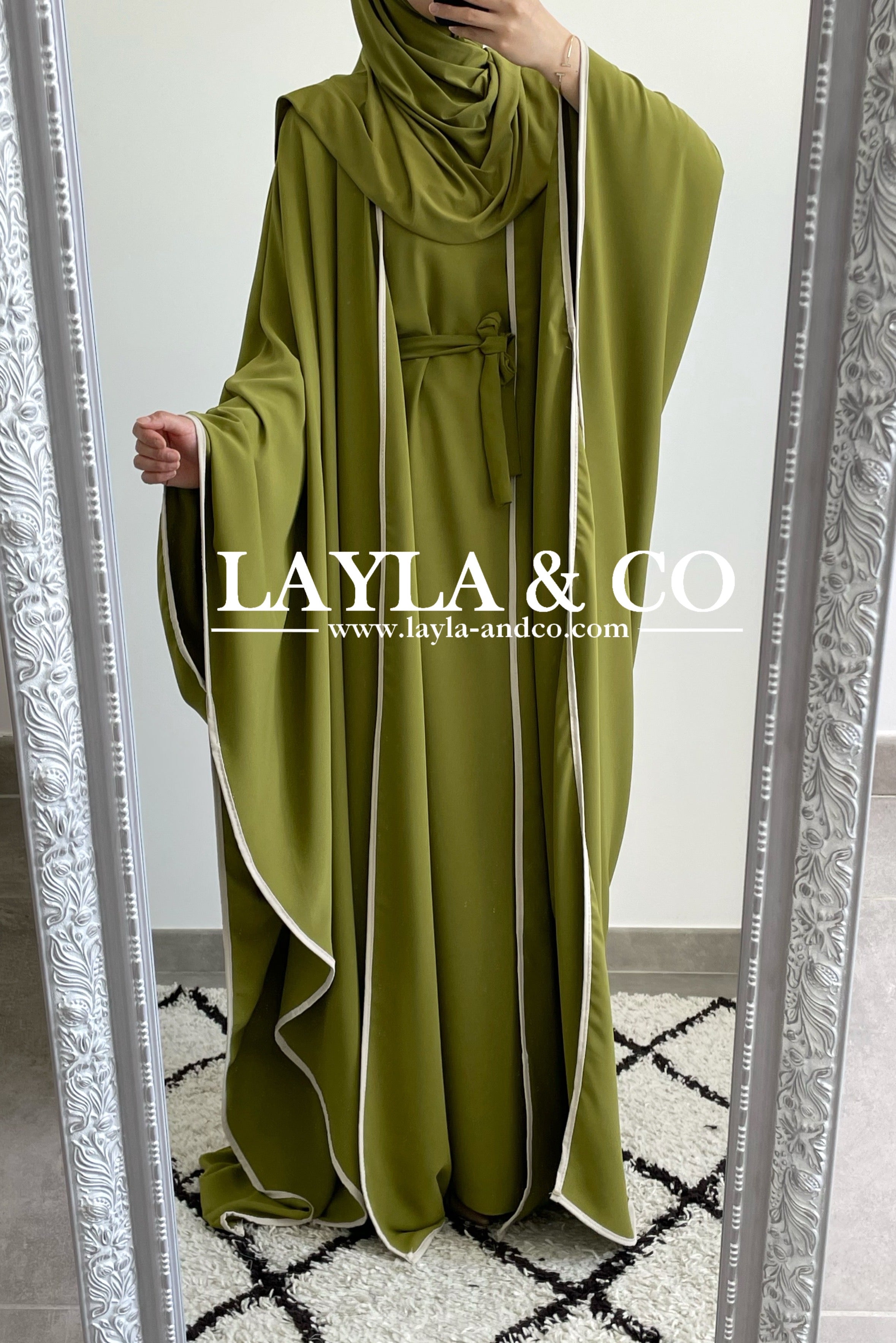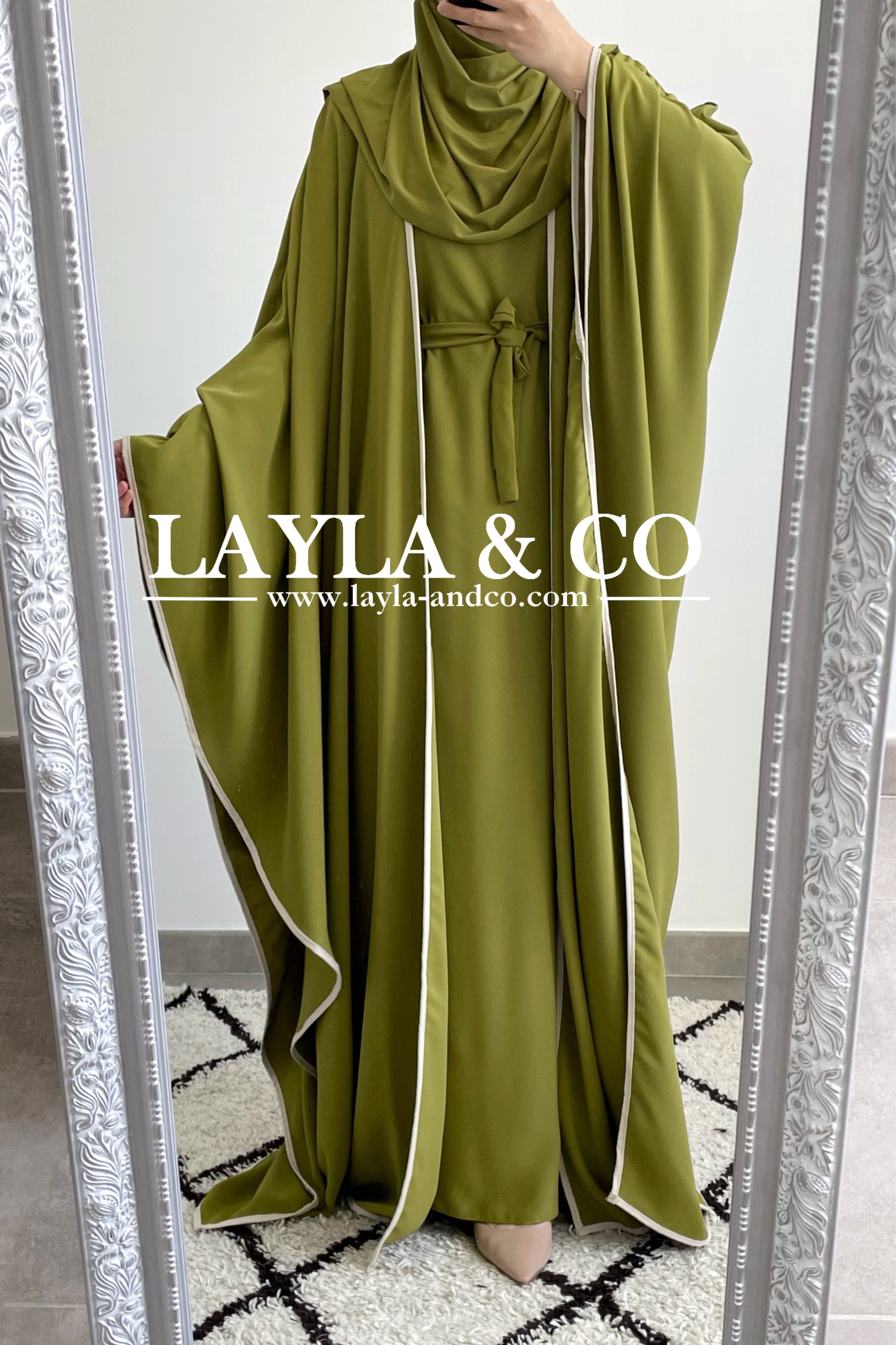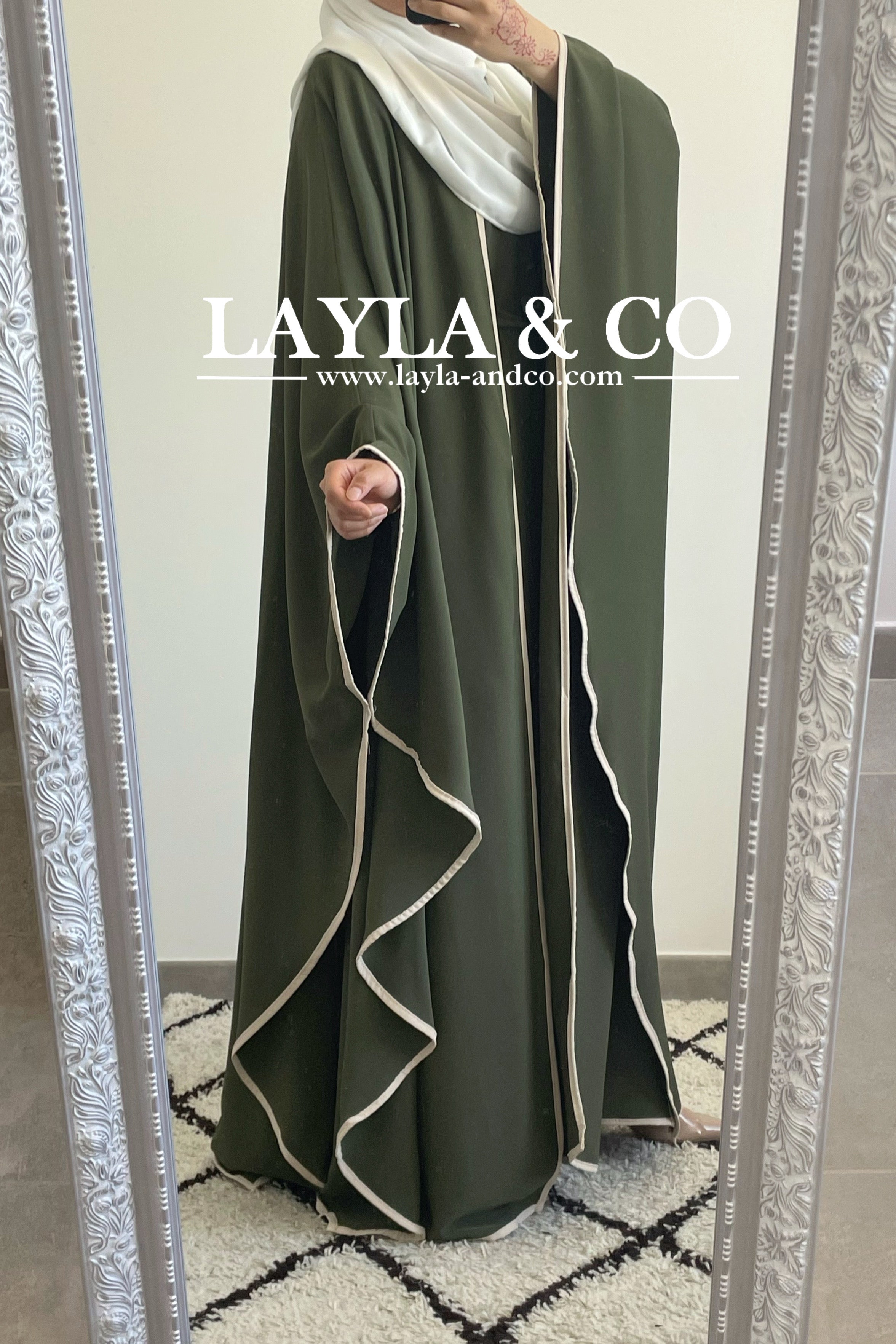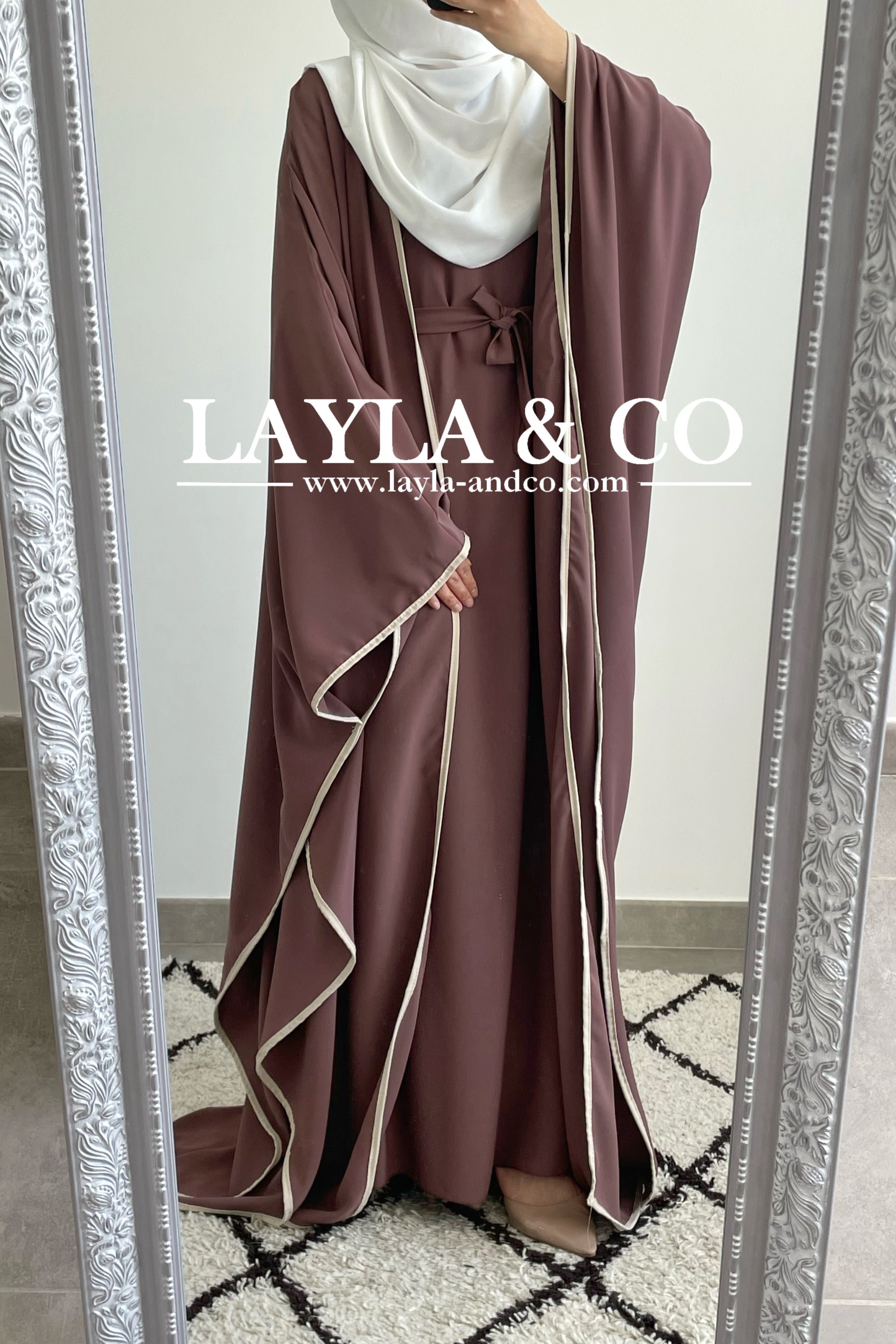 Ensemble 2 pièces composé d’une sous robe débardeur et d’un kimono cape assorti. Détail de bordure en contraste en couleur blanche ou beige selon les couleurs.