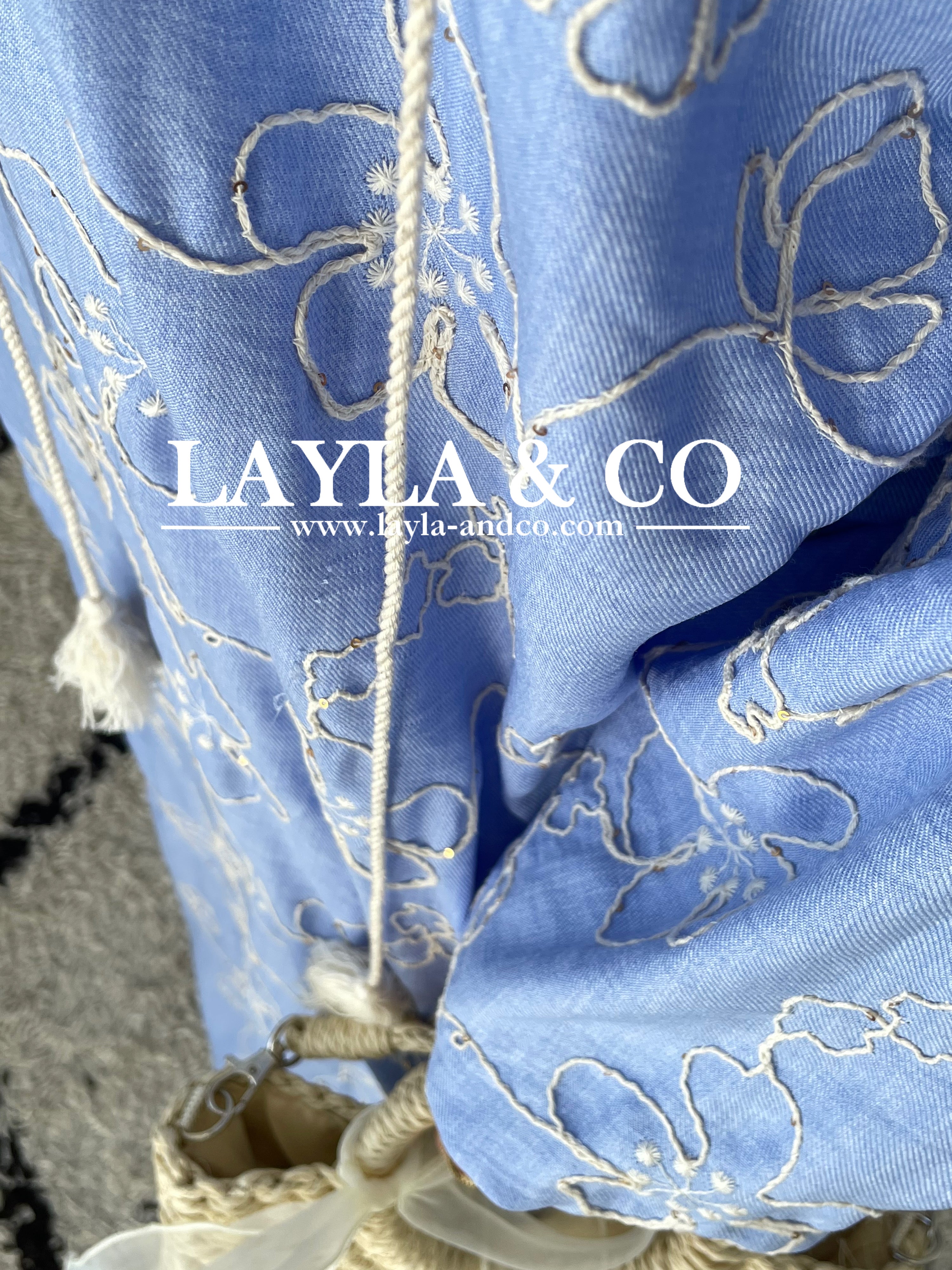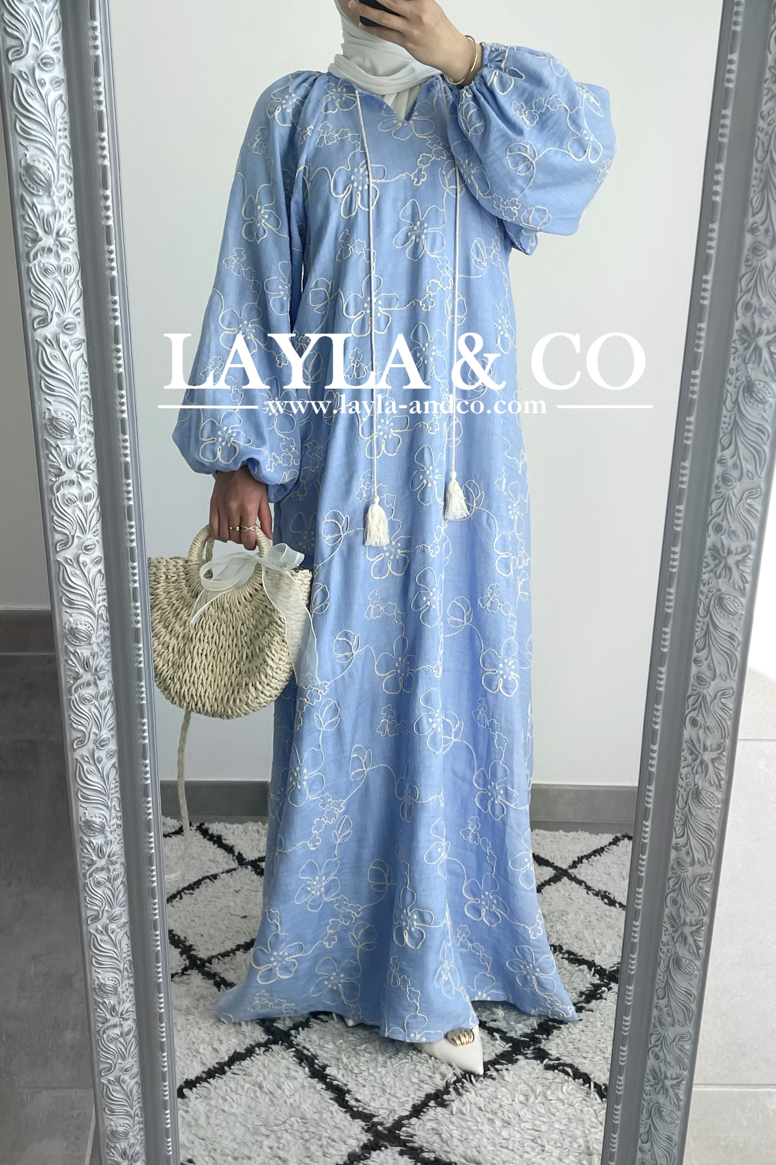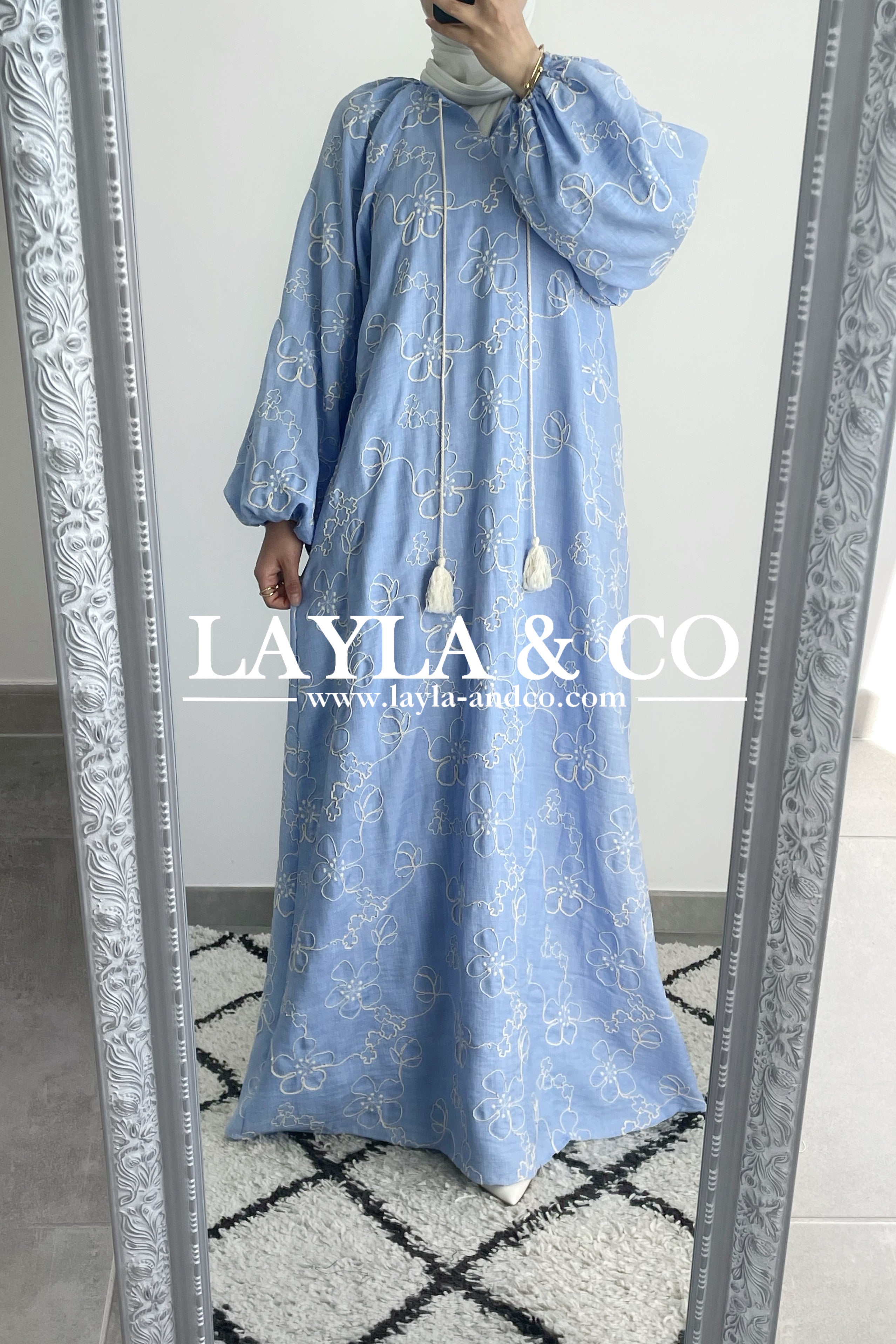 Robe avec broderie fleur et petits sequins très discret. Tissu composé à 50% de coton.