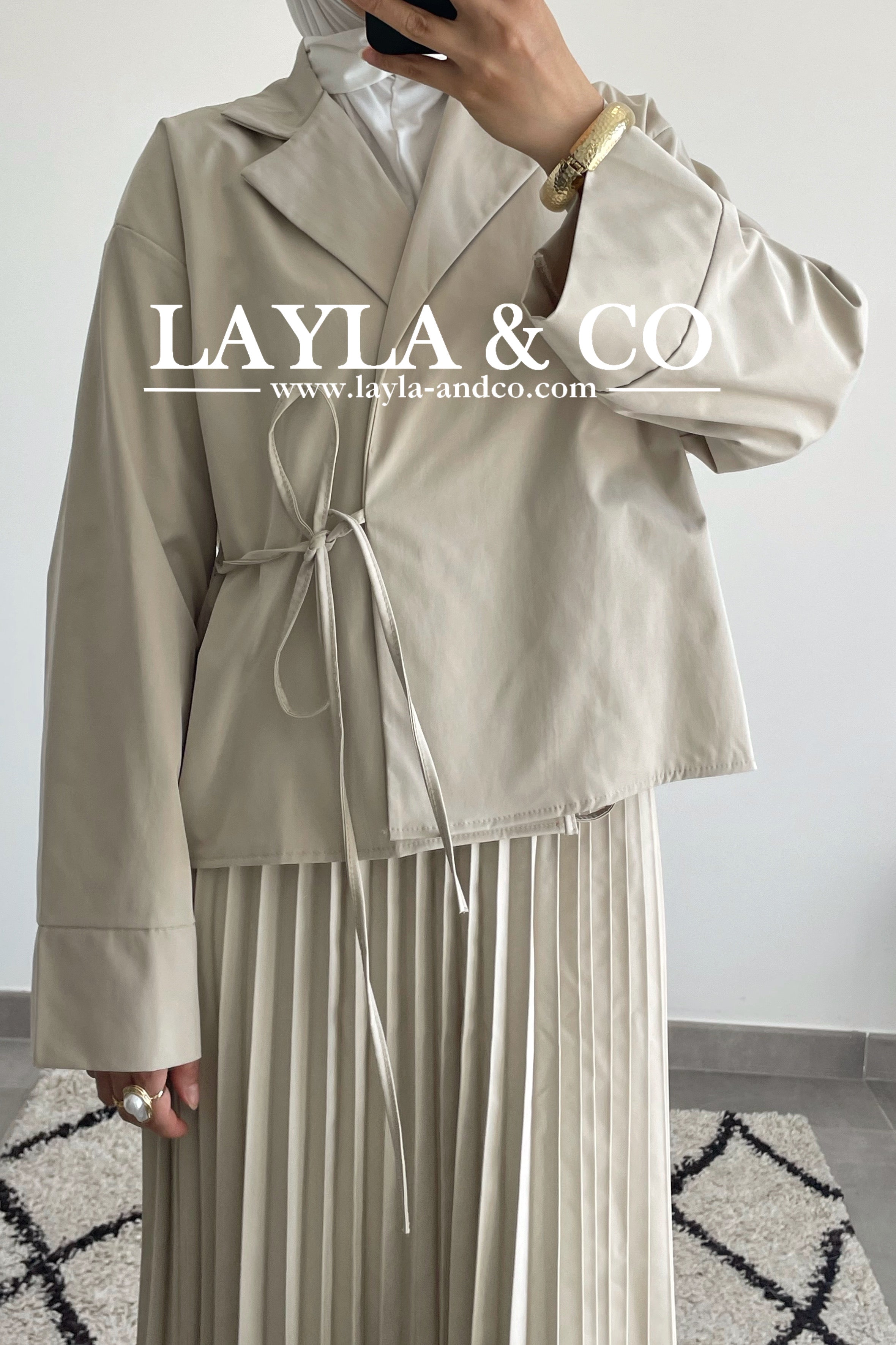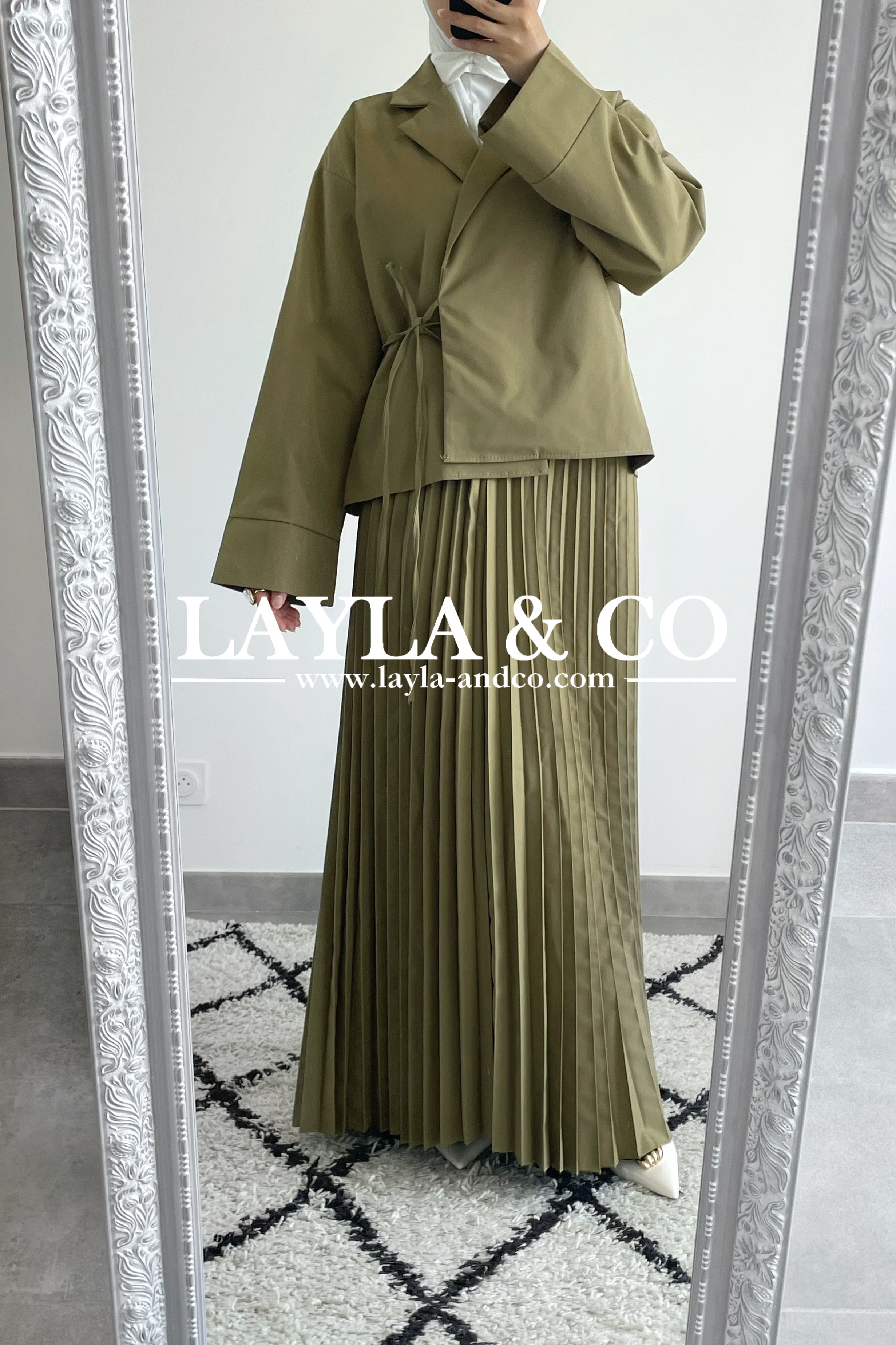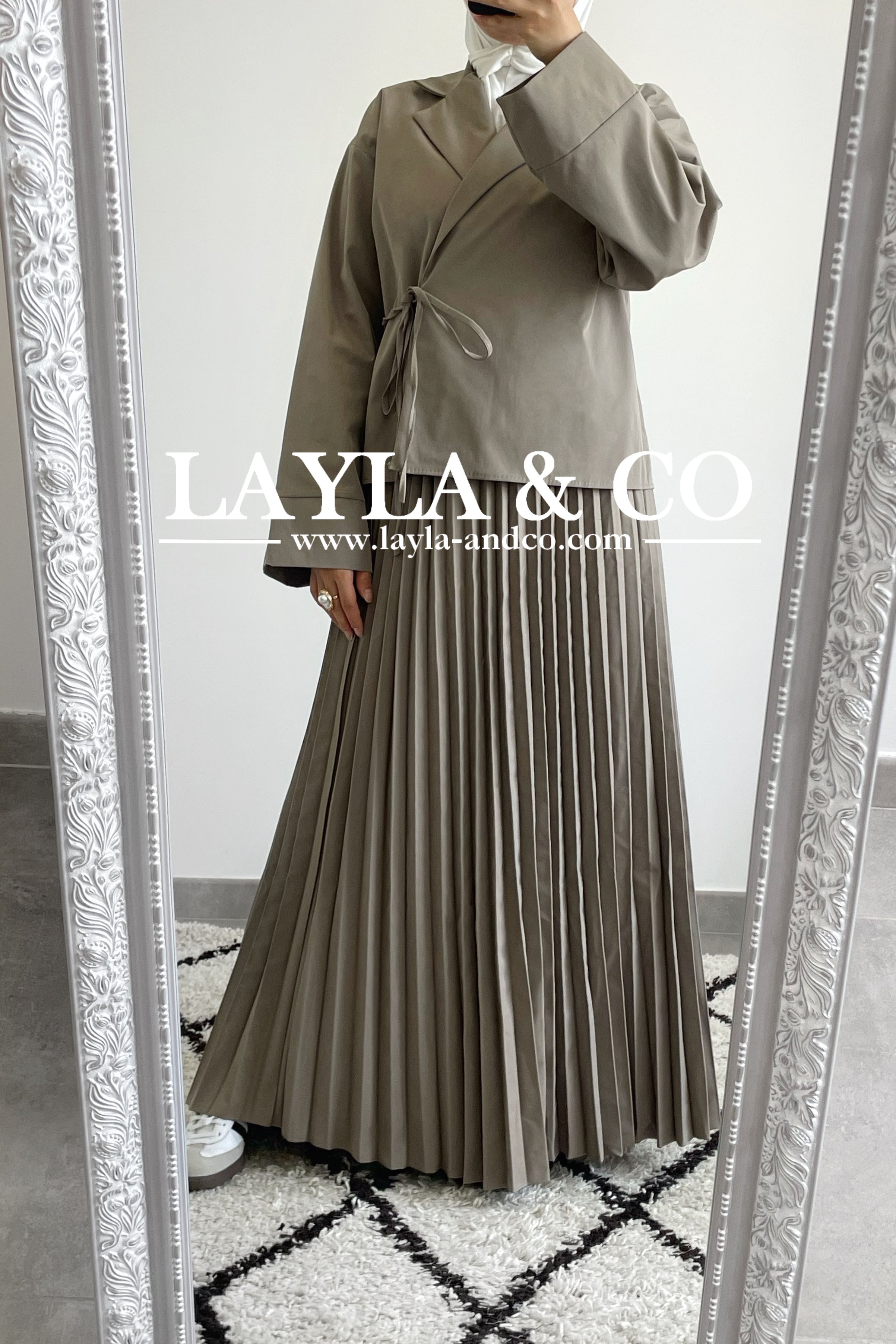 Ensemble composé d’une veste à nouer et d’une jupe plissée élastique à la taille.
