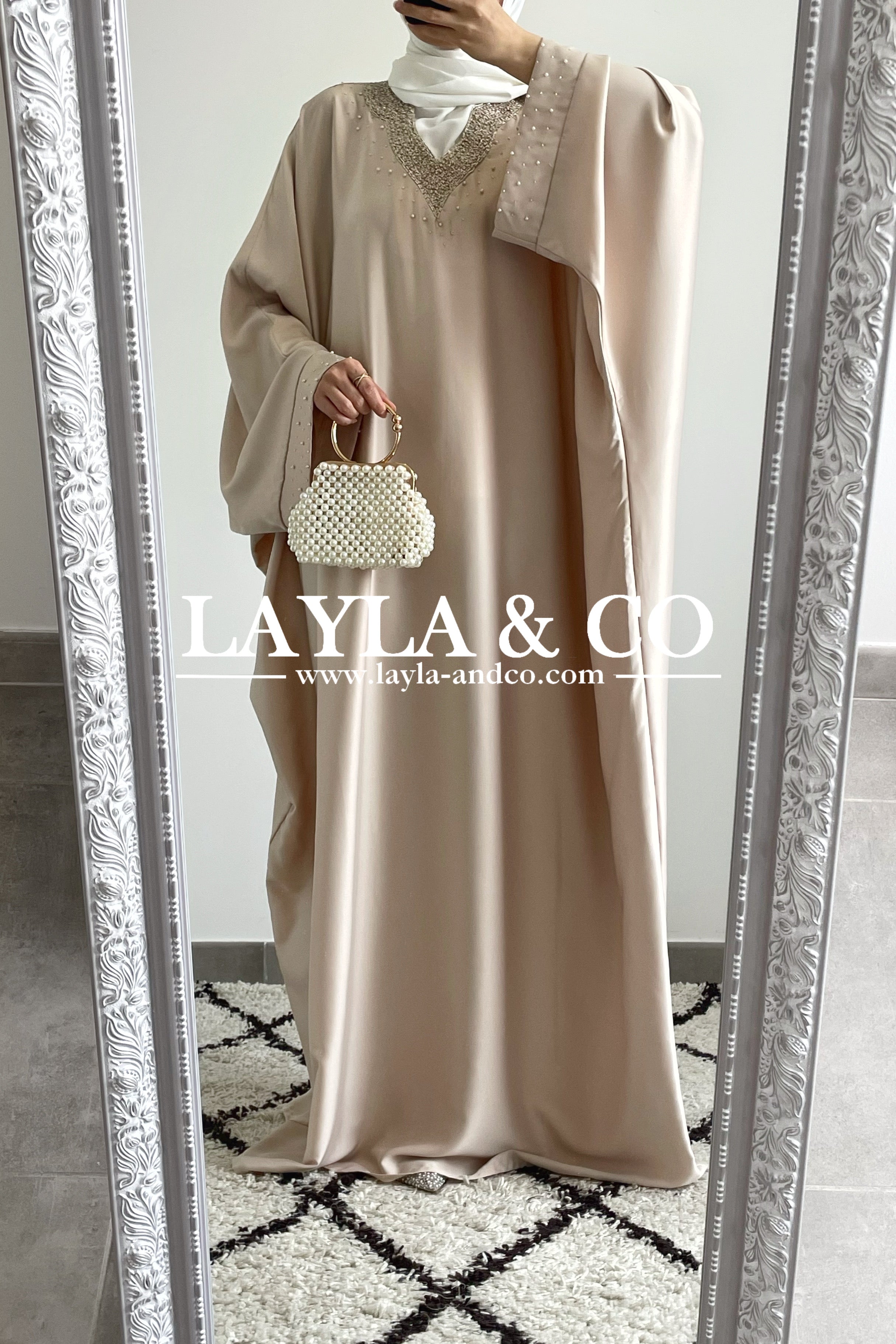 Abaya Farasha tissu satiné orné de perles aux manches et au col. L’abaya dispose de ficelles à l’interieur pour pouvoir cintrer à l’avant tout en laissant le dos non cintré.