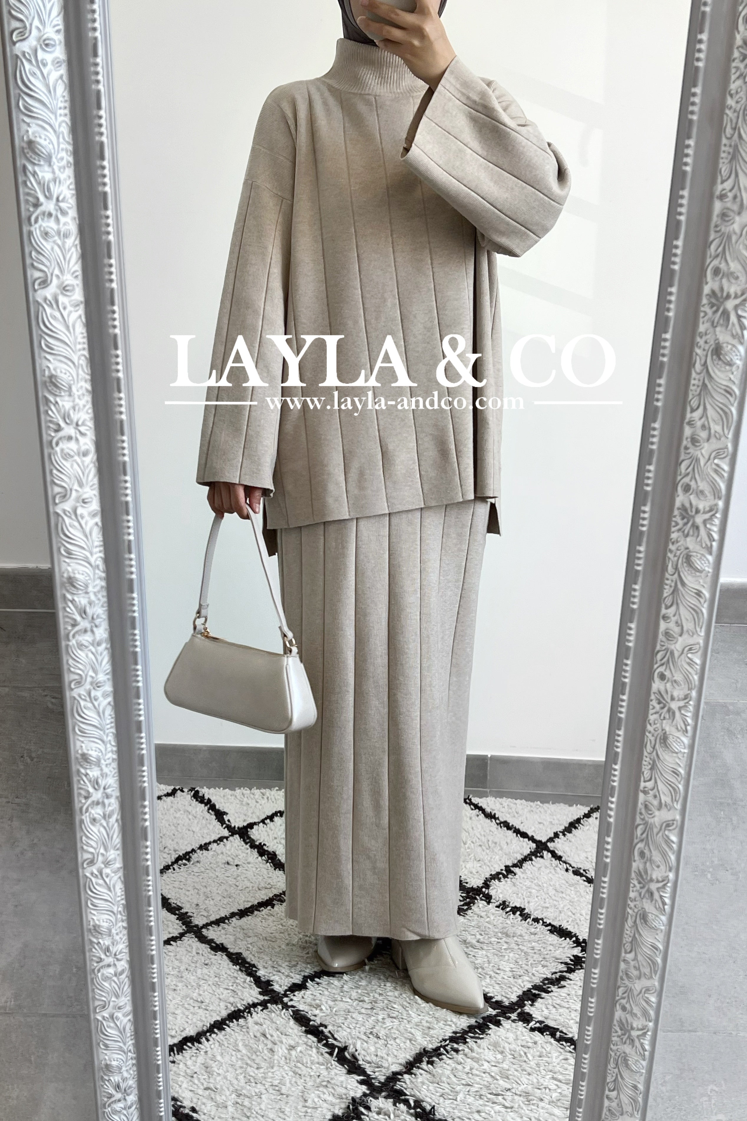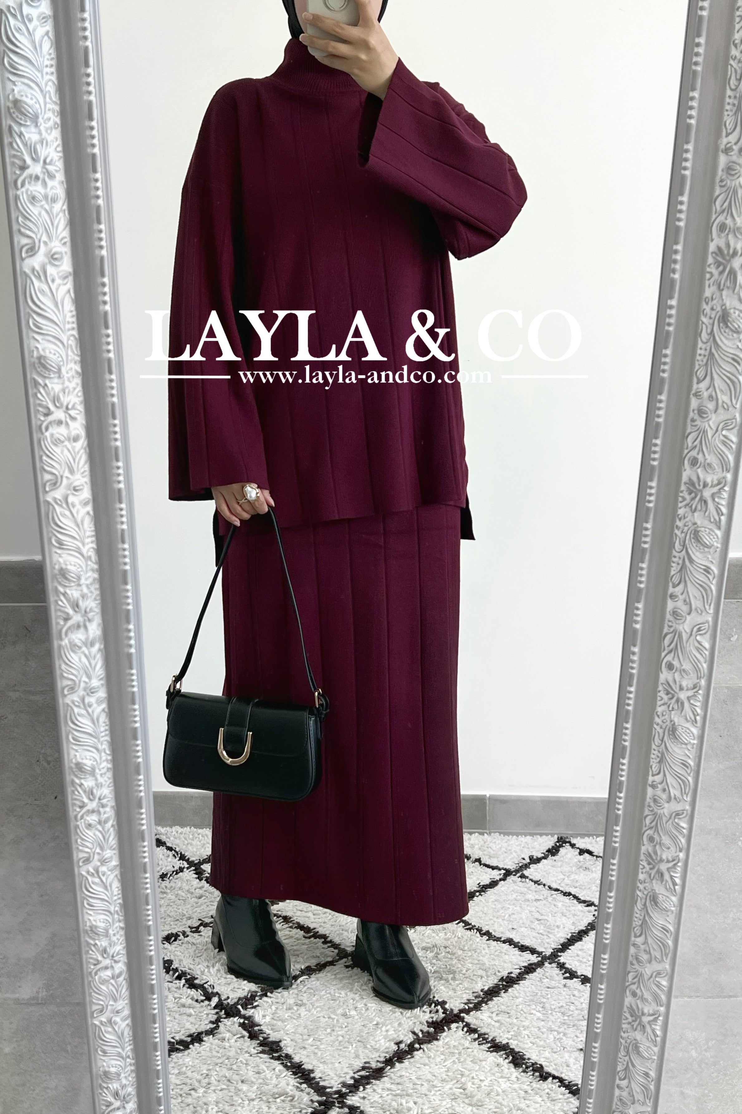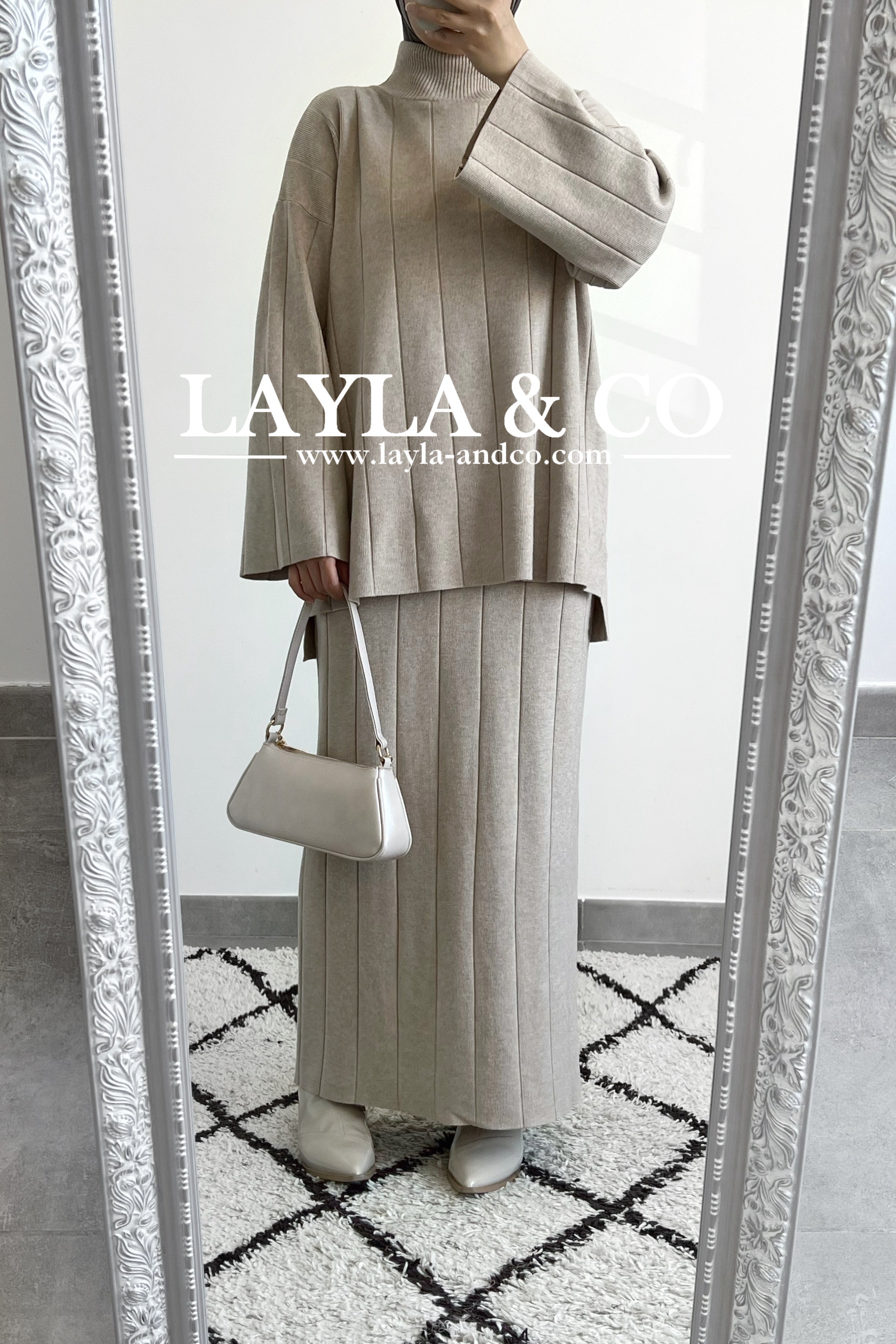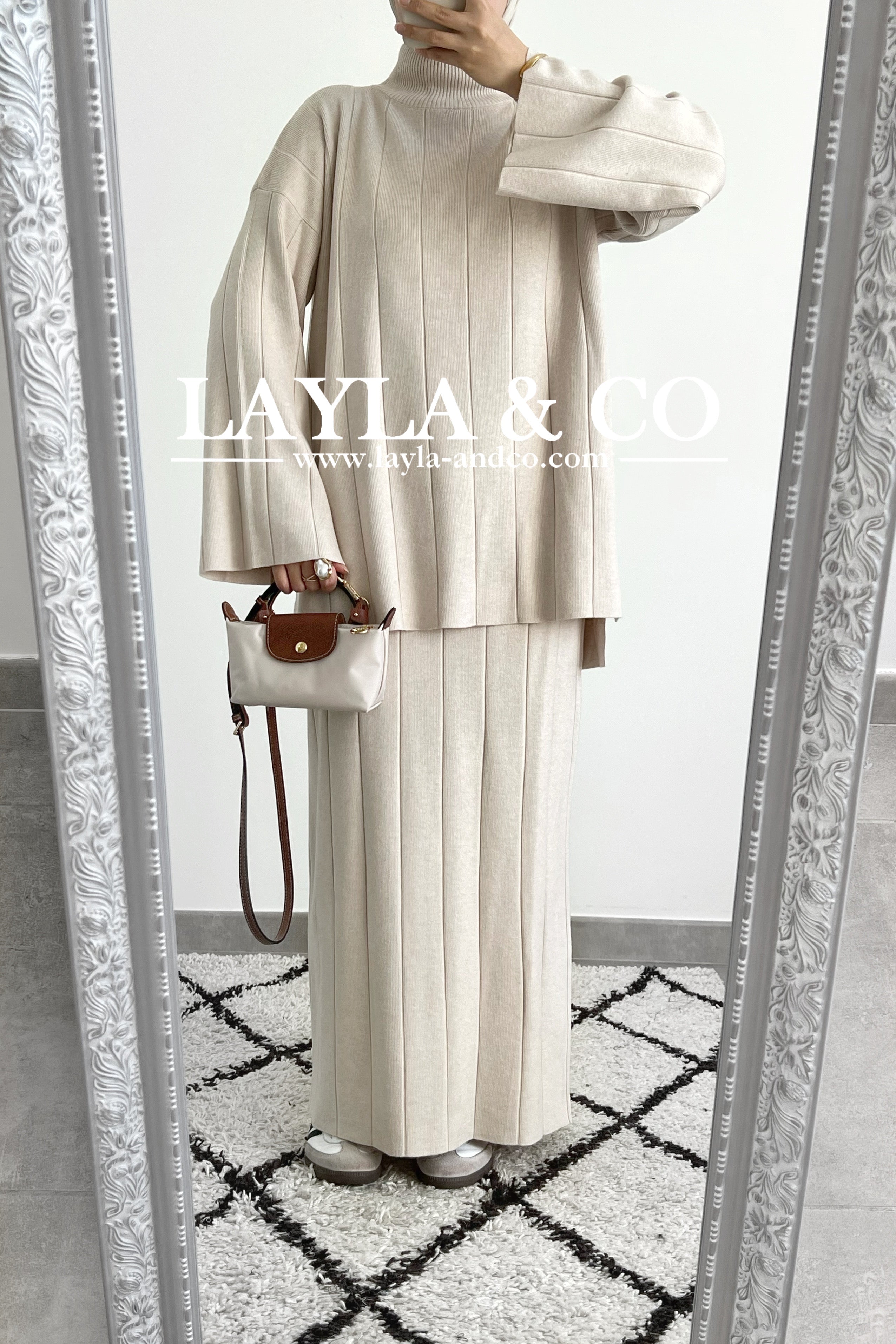 Ensemble 2 pièces composé d’un pull col montant et d’une jupe élastique à la taille.