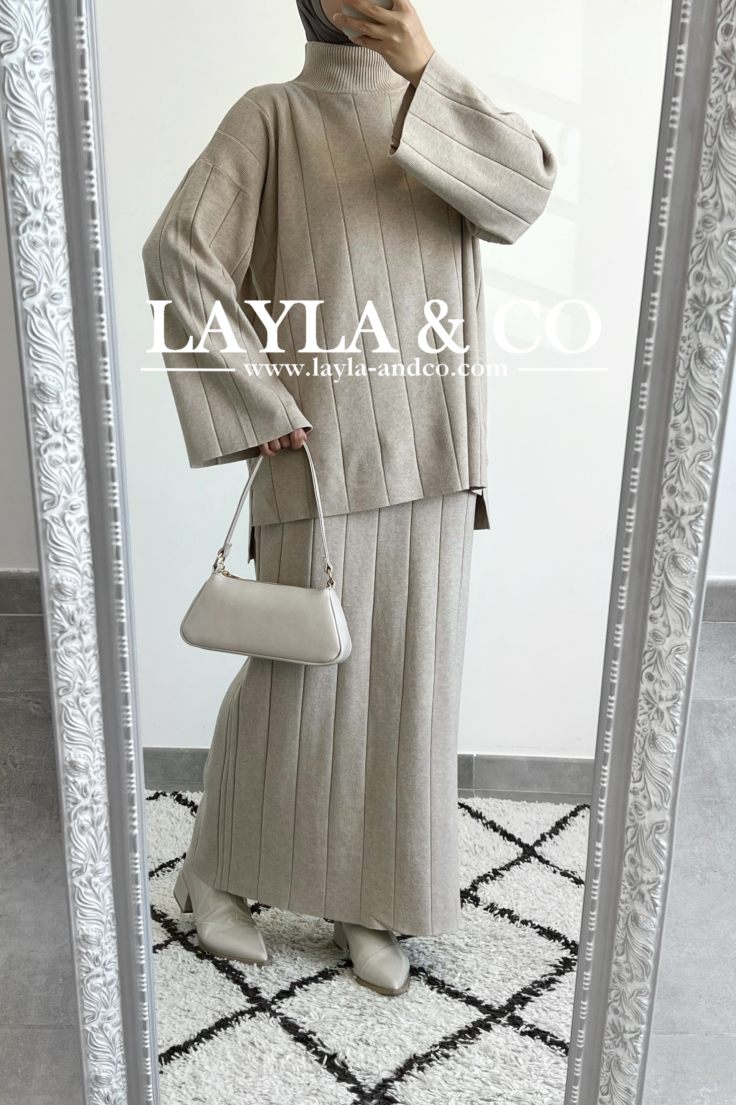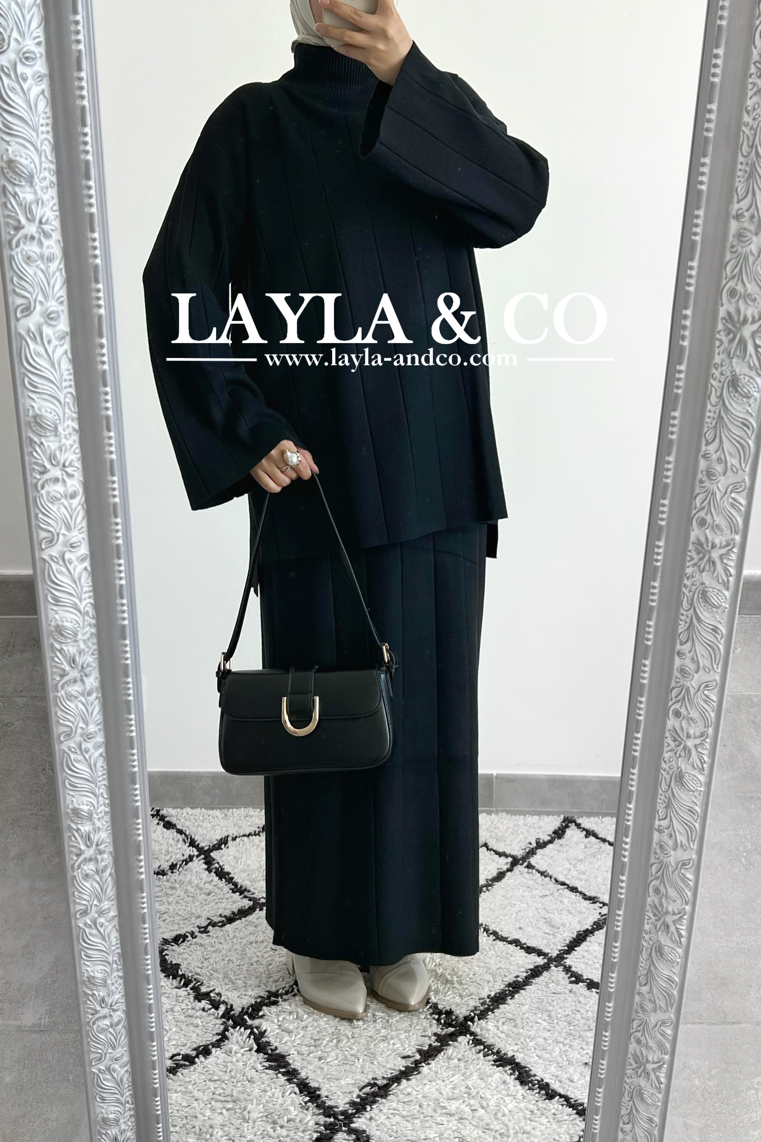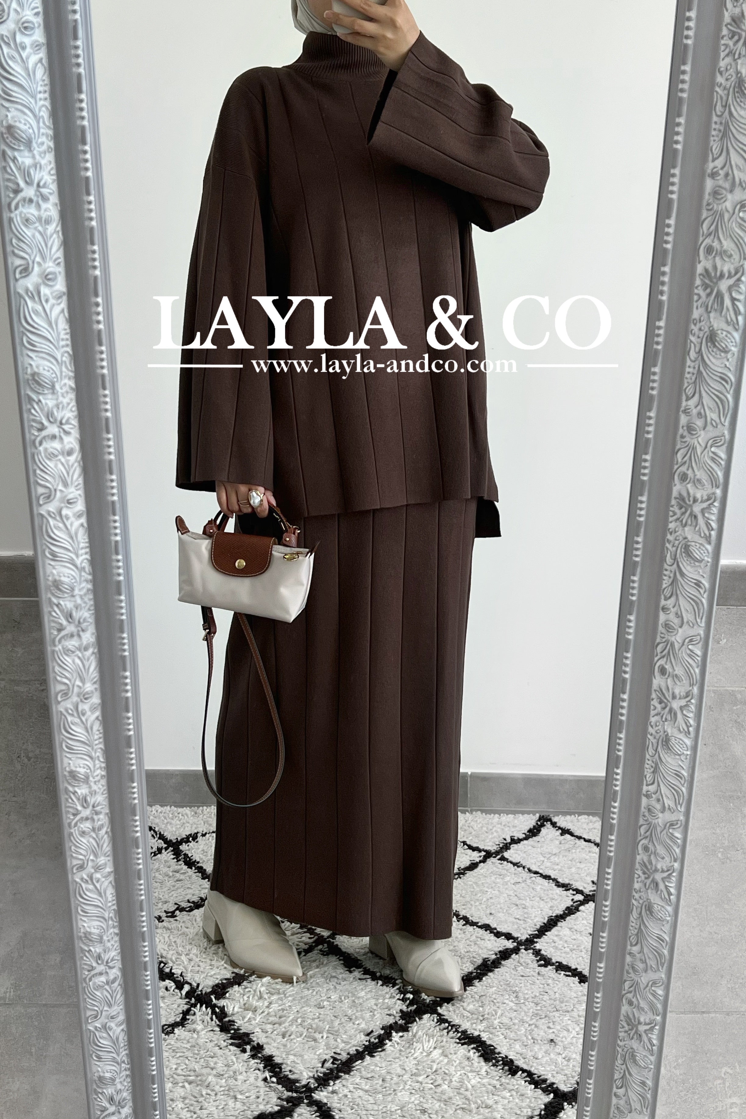 Ensemble 2 pièces composé d’un pull col montant et d’une jupe élastique à la taille.