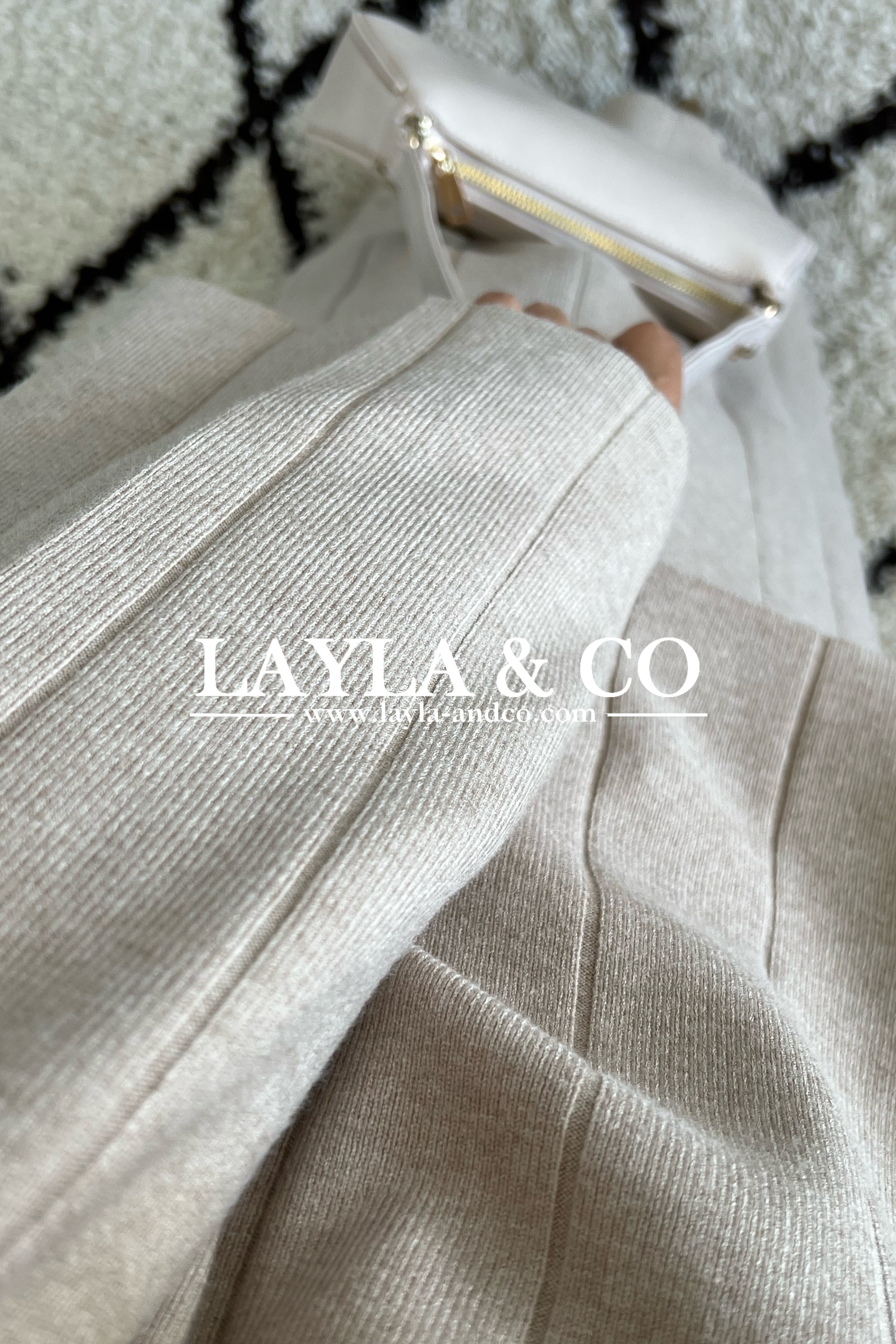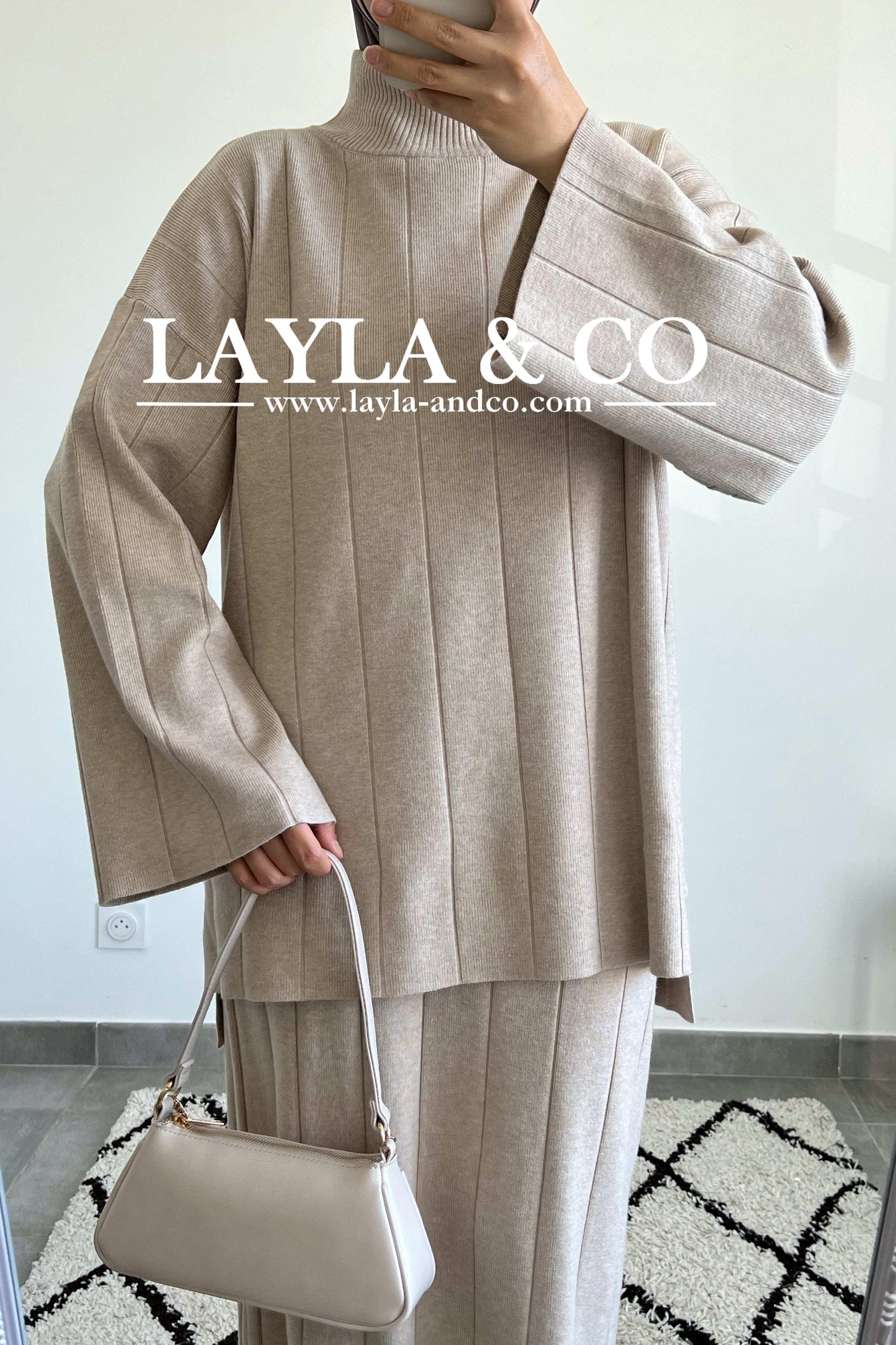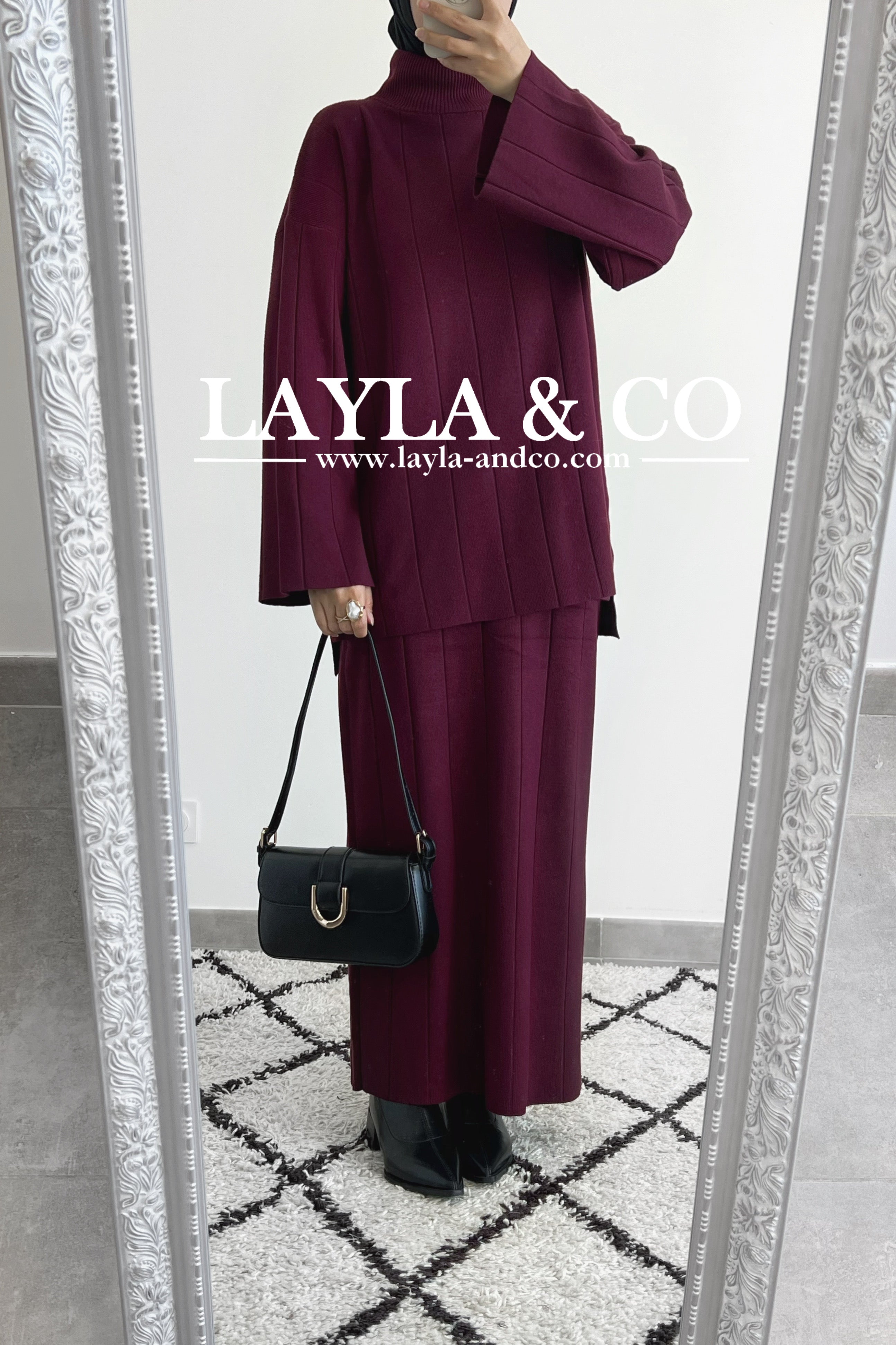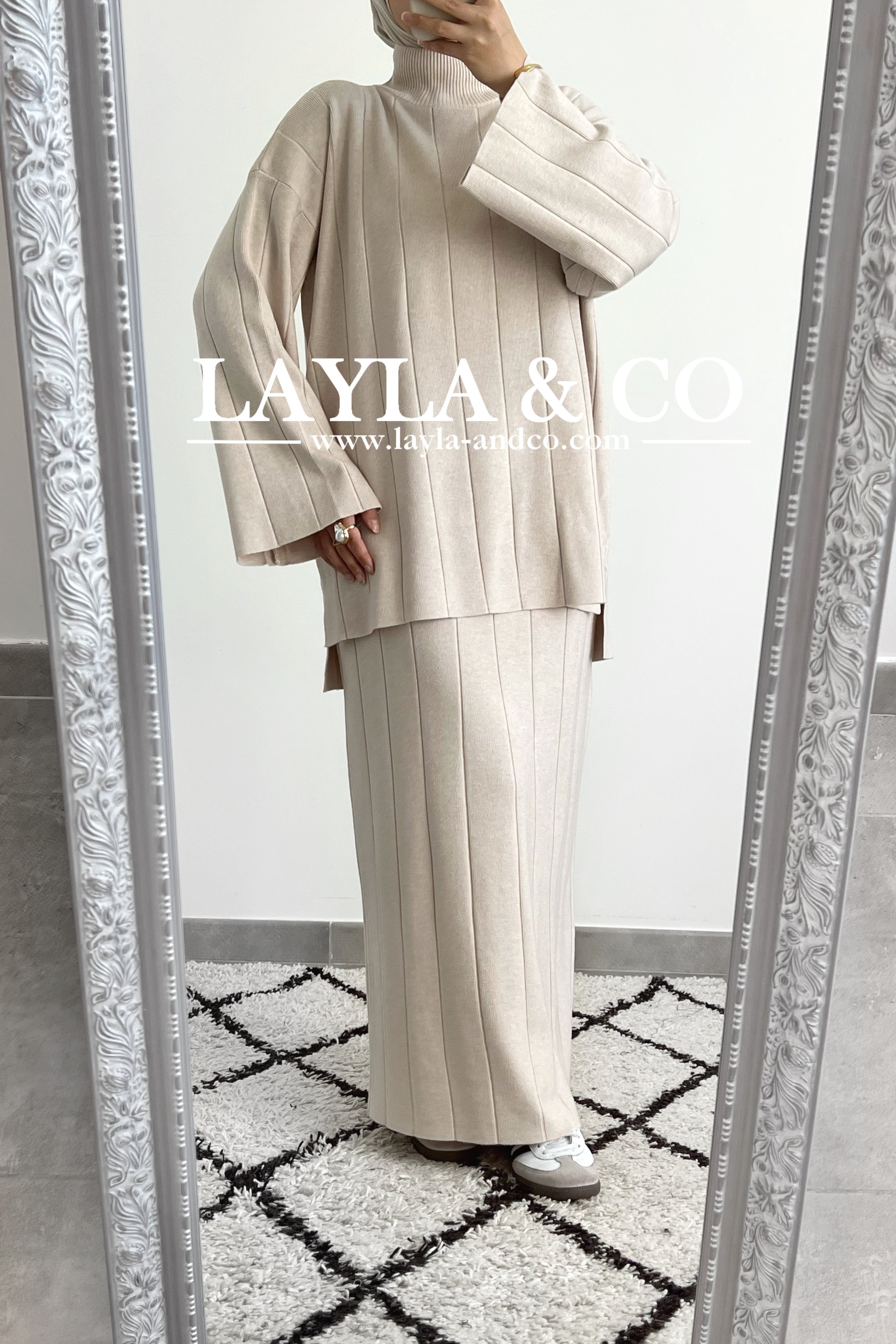 Ensemble 2 pièces composé d’un pull col montant et d’une jupe élastique à la taille.