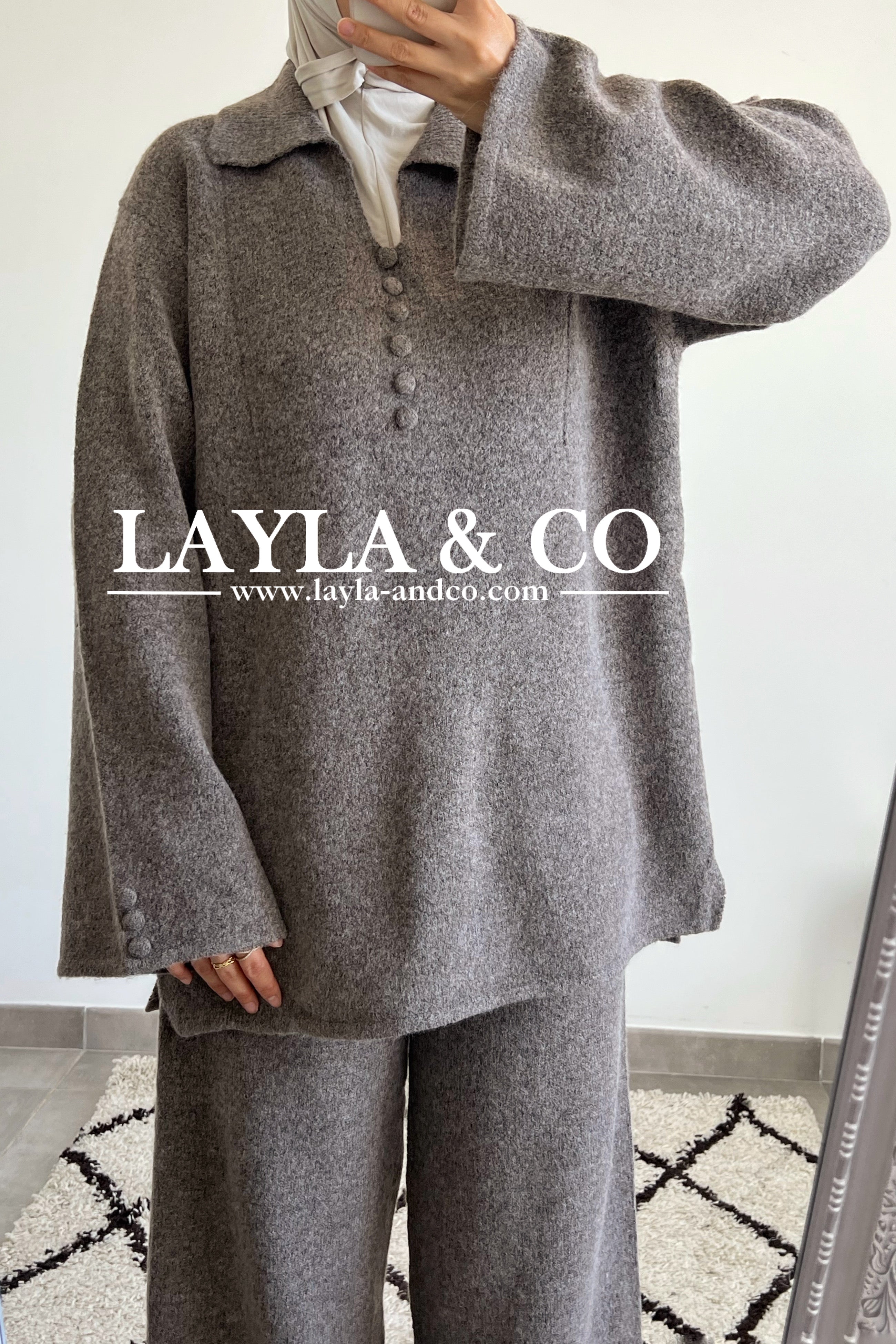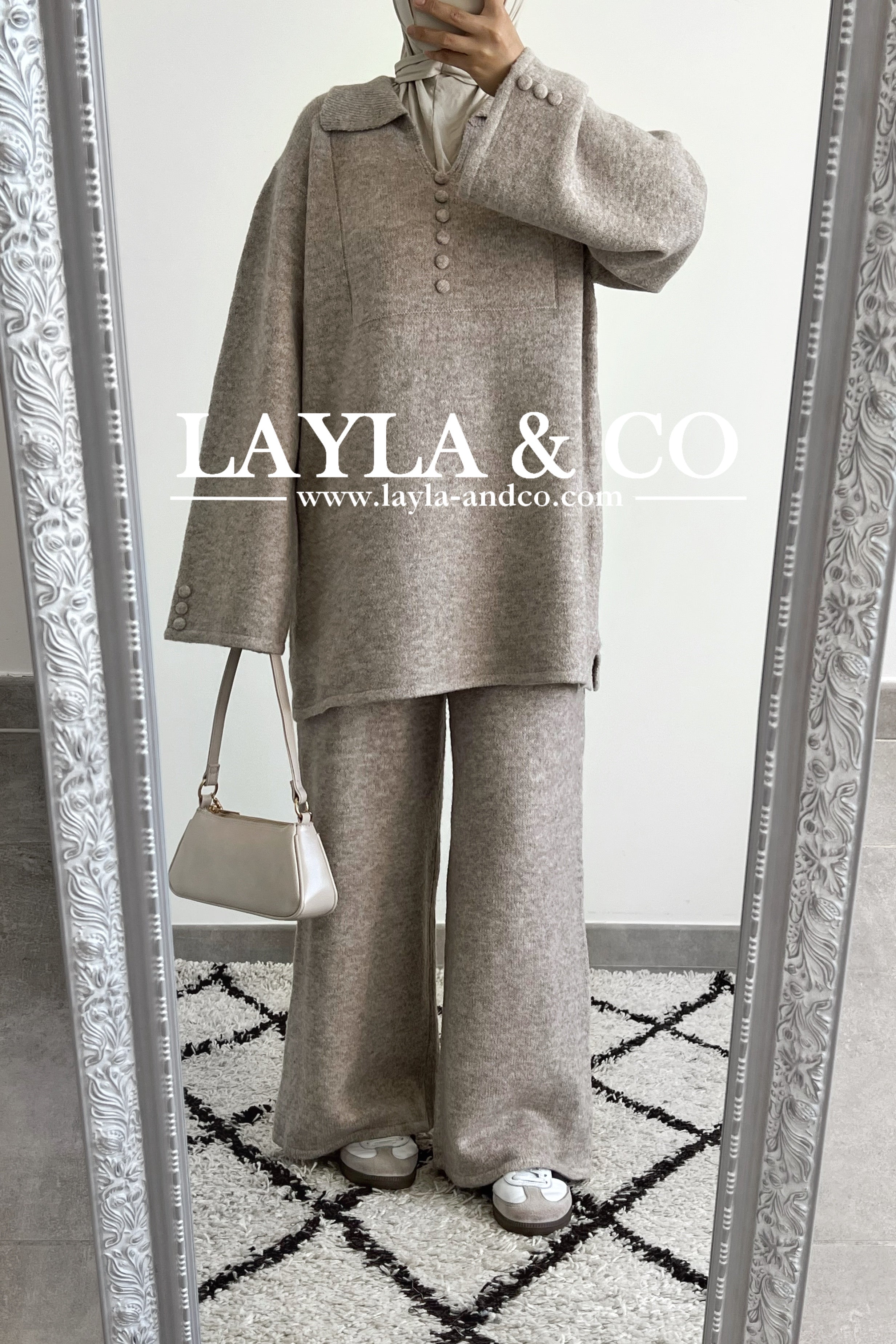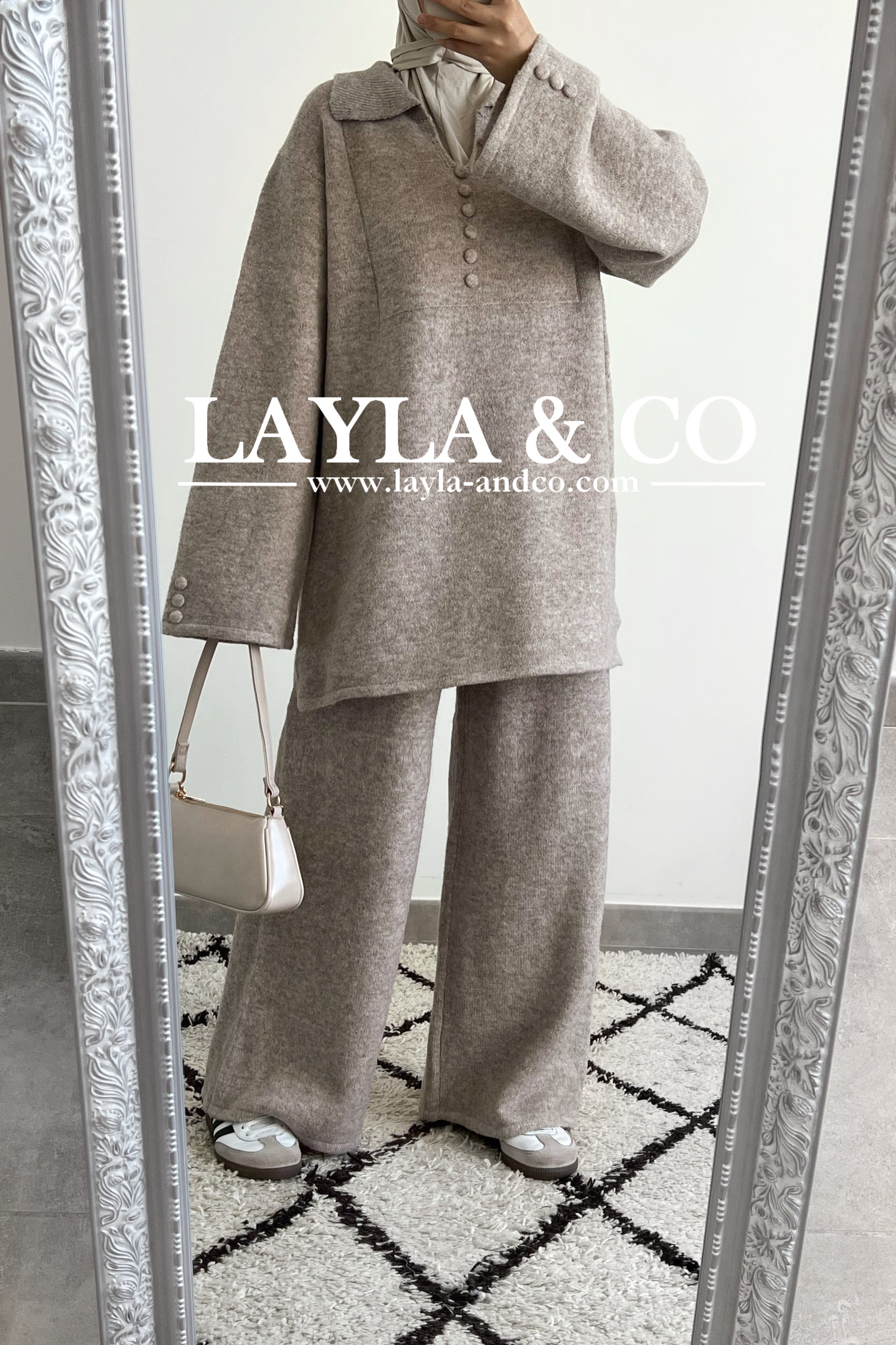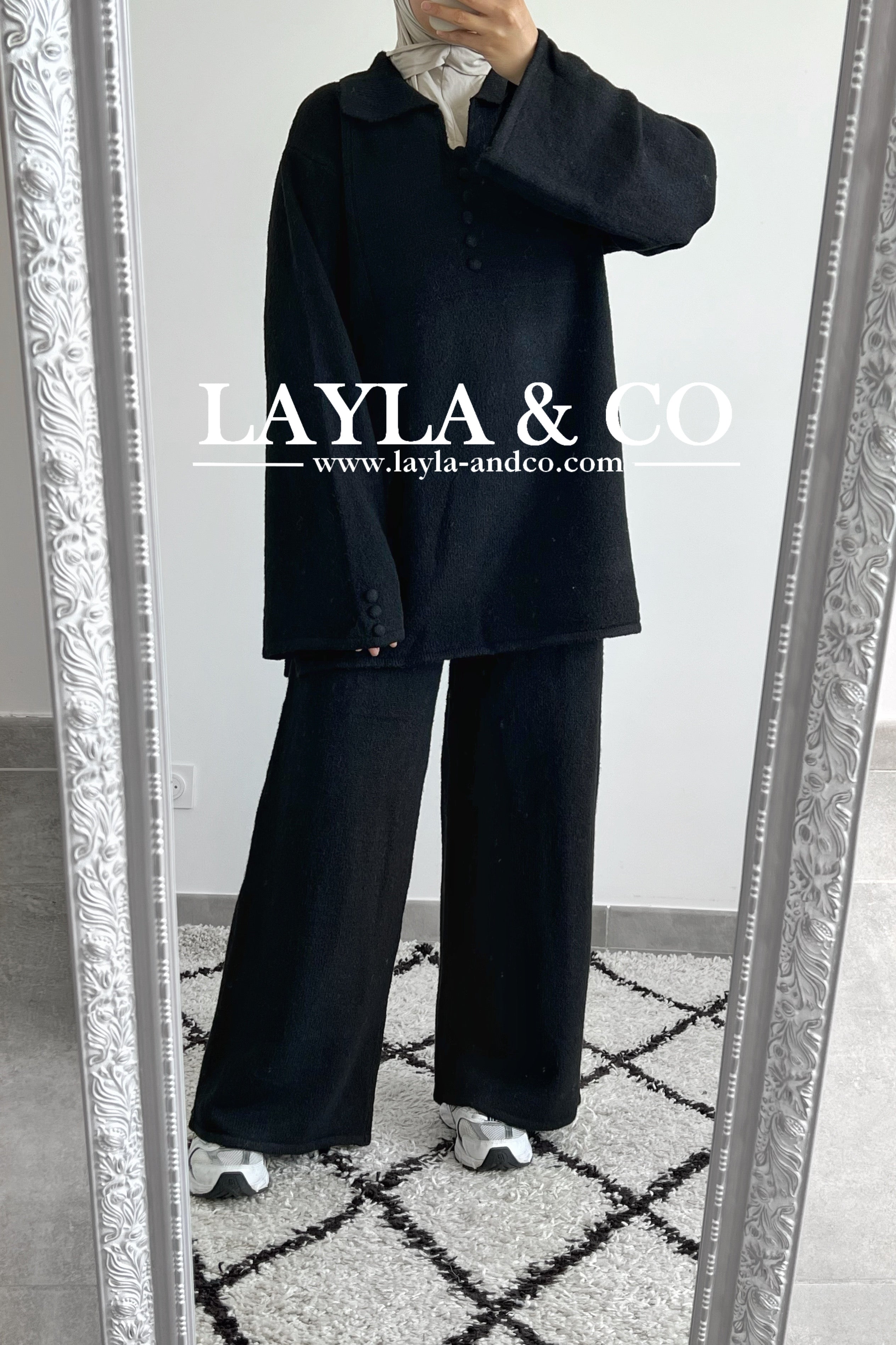 Ensemble 2 pièces composé d’un polo avec boutons décoratifs et d’un pantalon assorti. Maille chaude pour l’hiver avec laine mélangée.