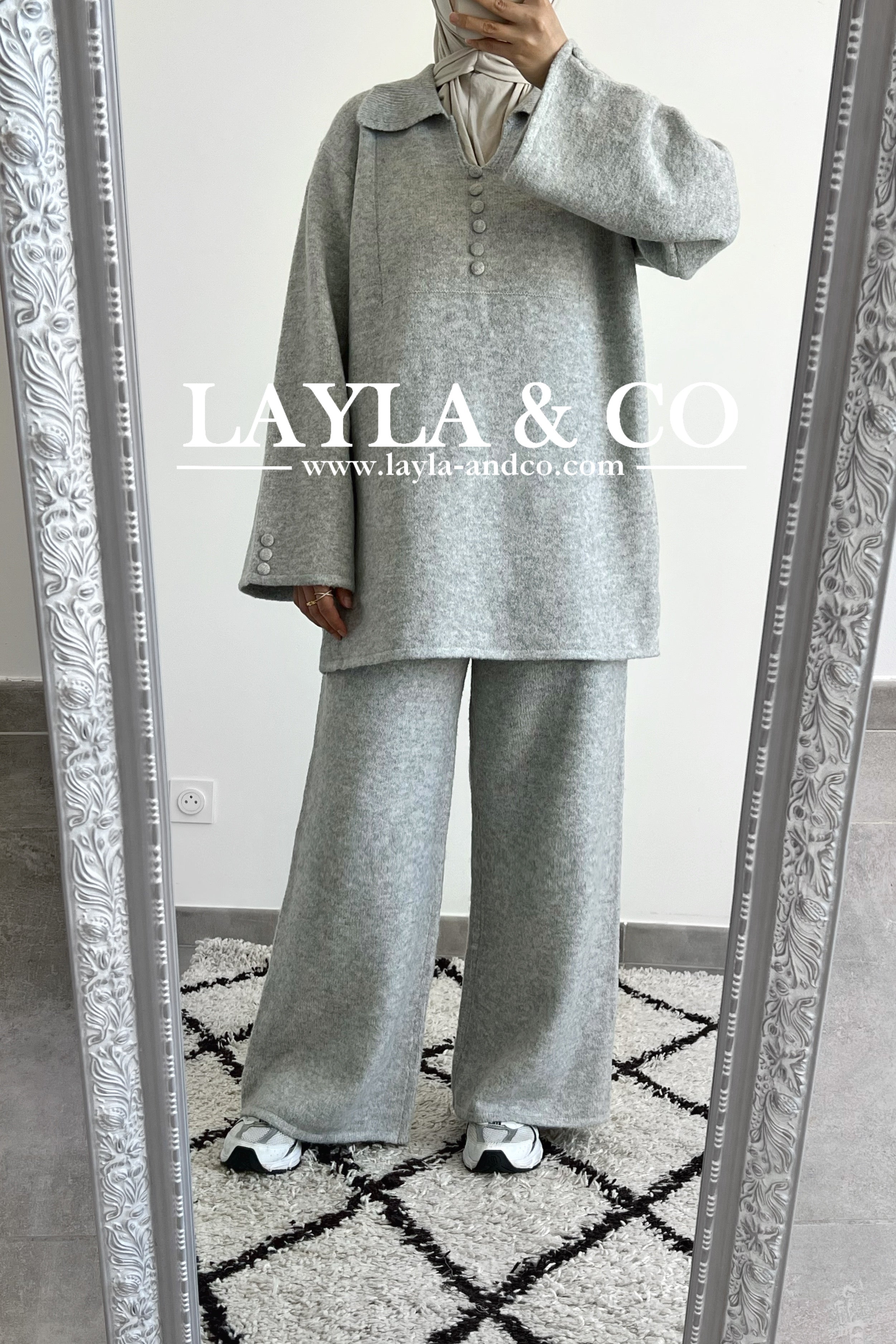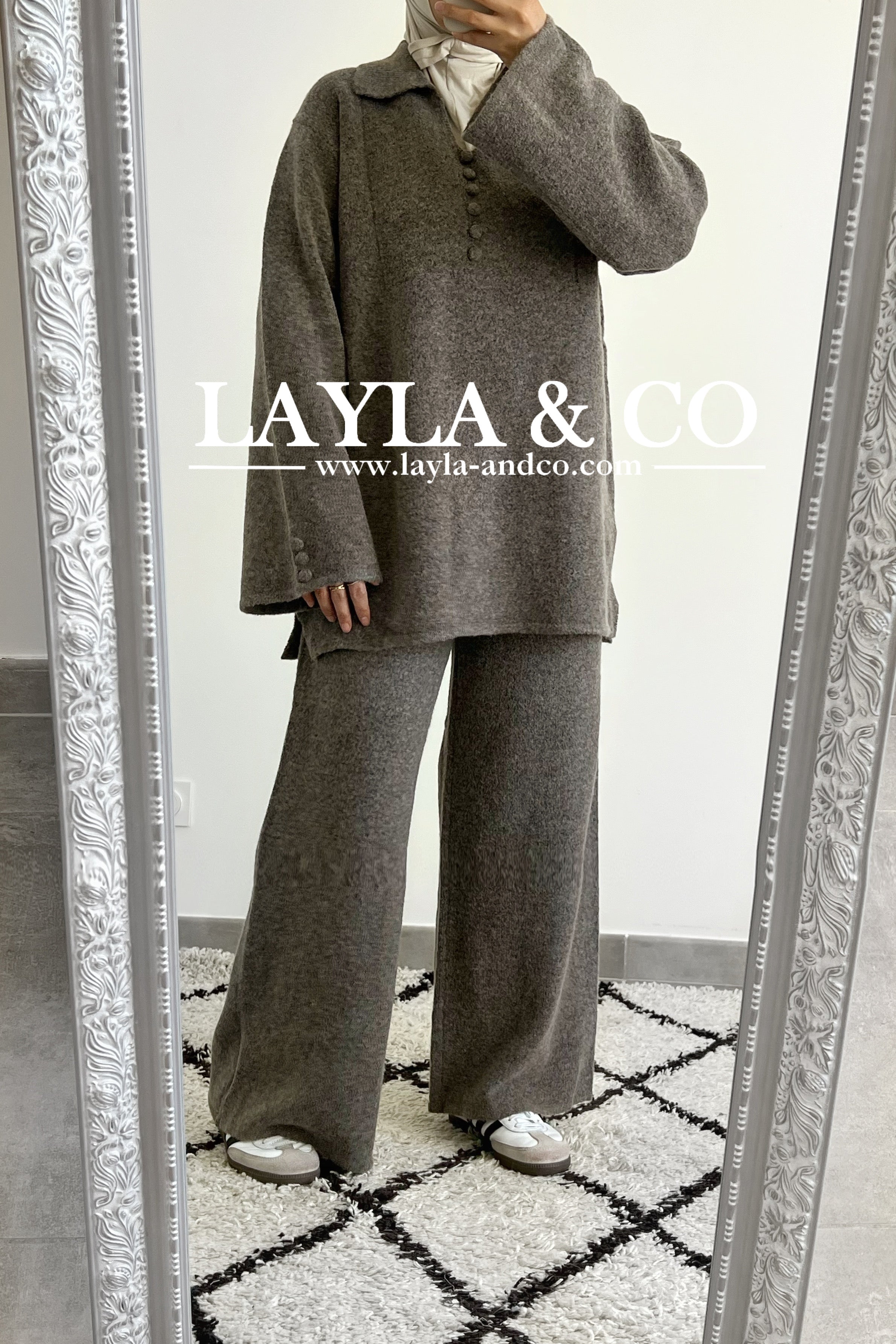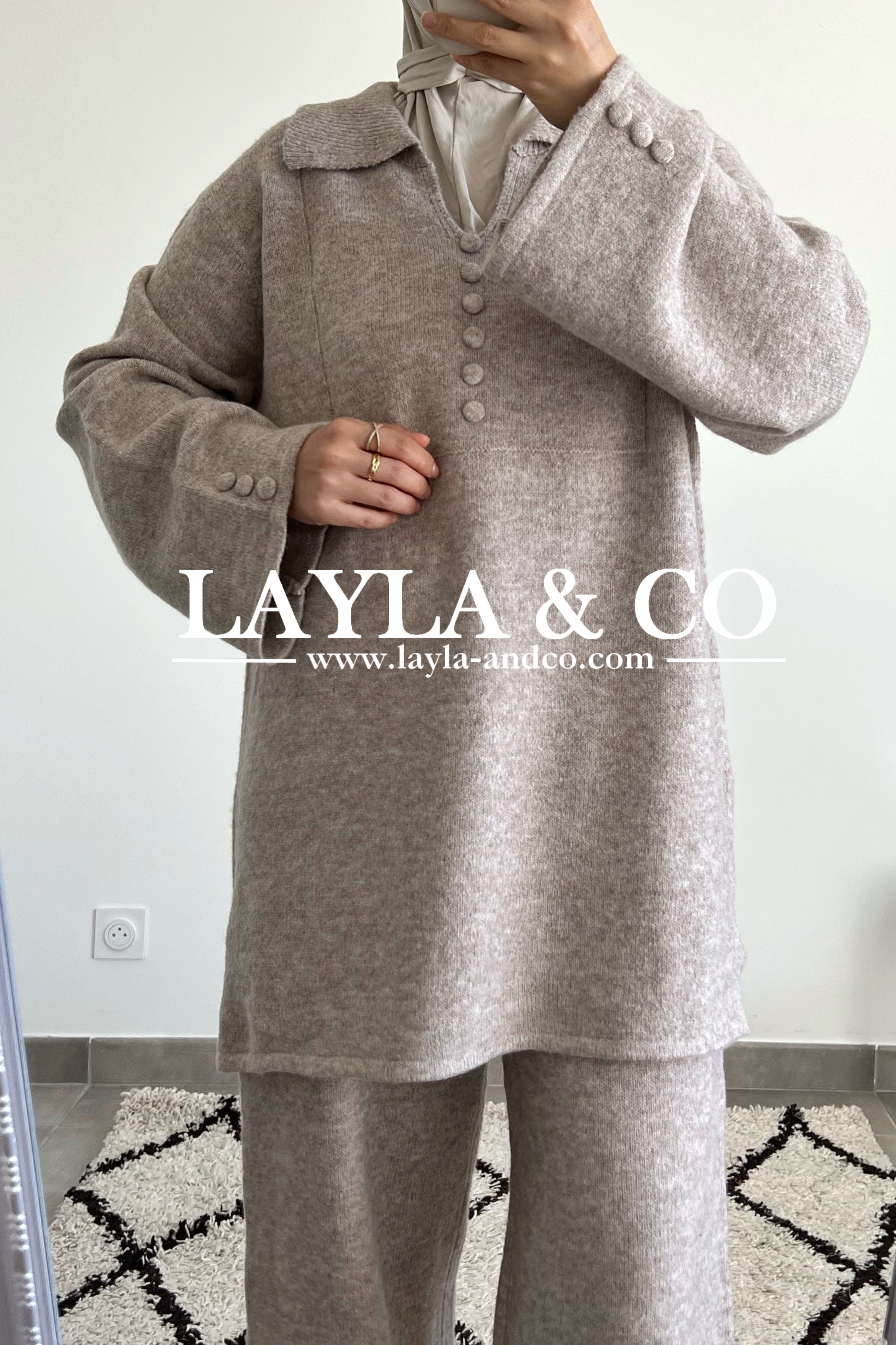 Ensemble 2 pièces composé d’un polo avec boutons décoratifs et d’un pantalon assorti. Maille chaude pour l’hiver avec laine mélangée.