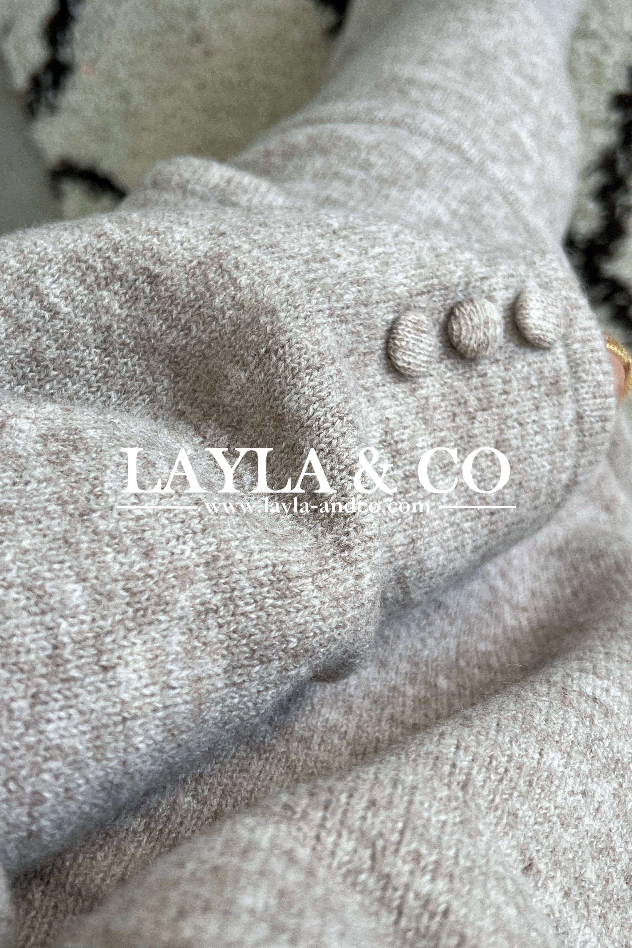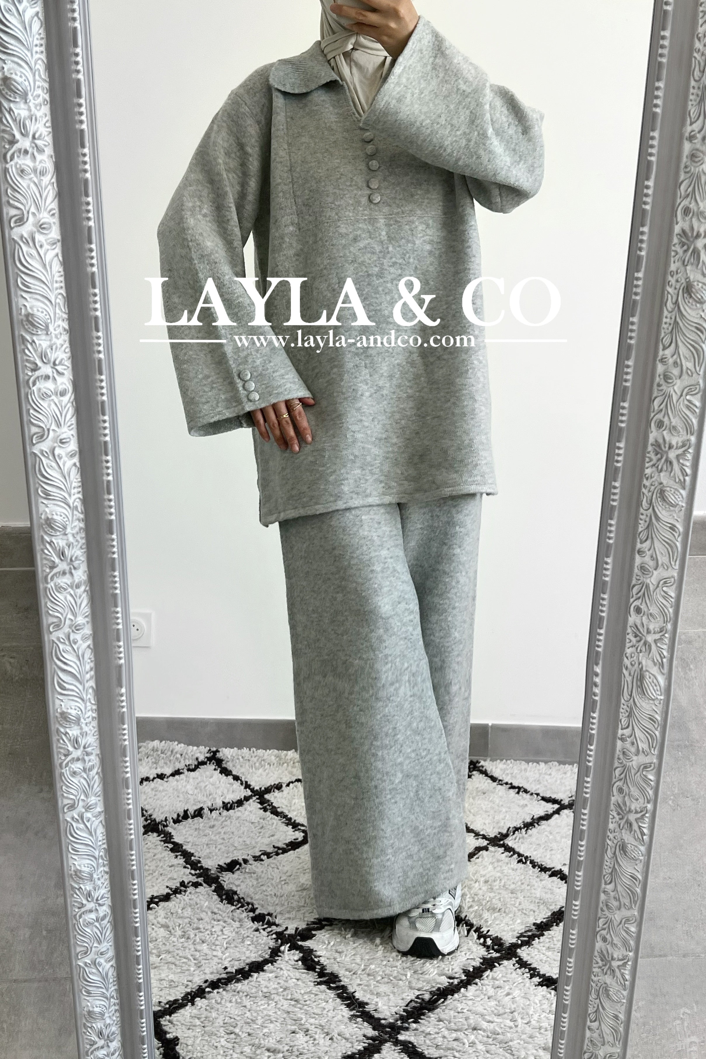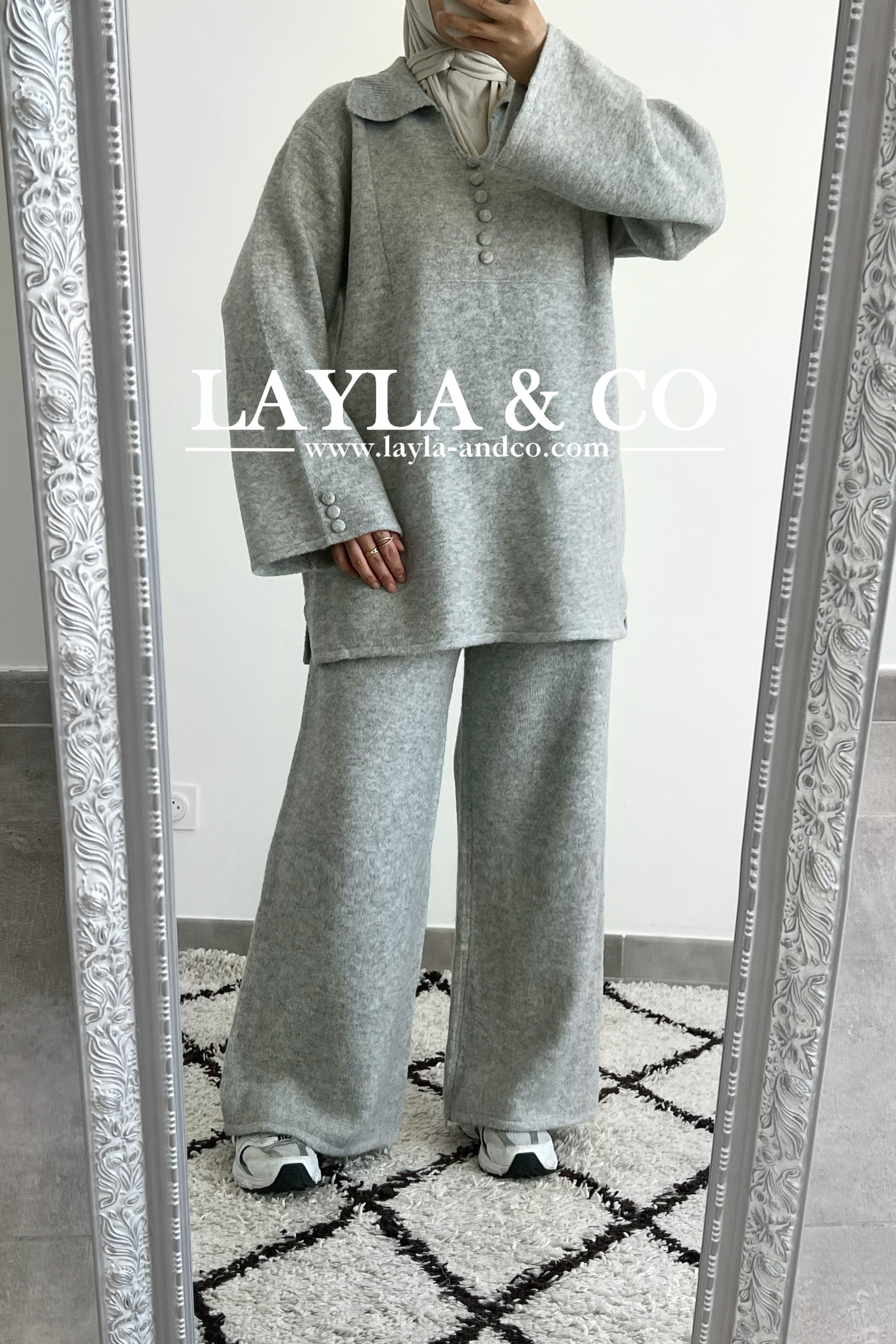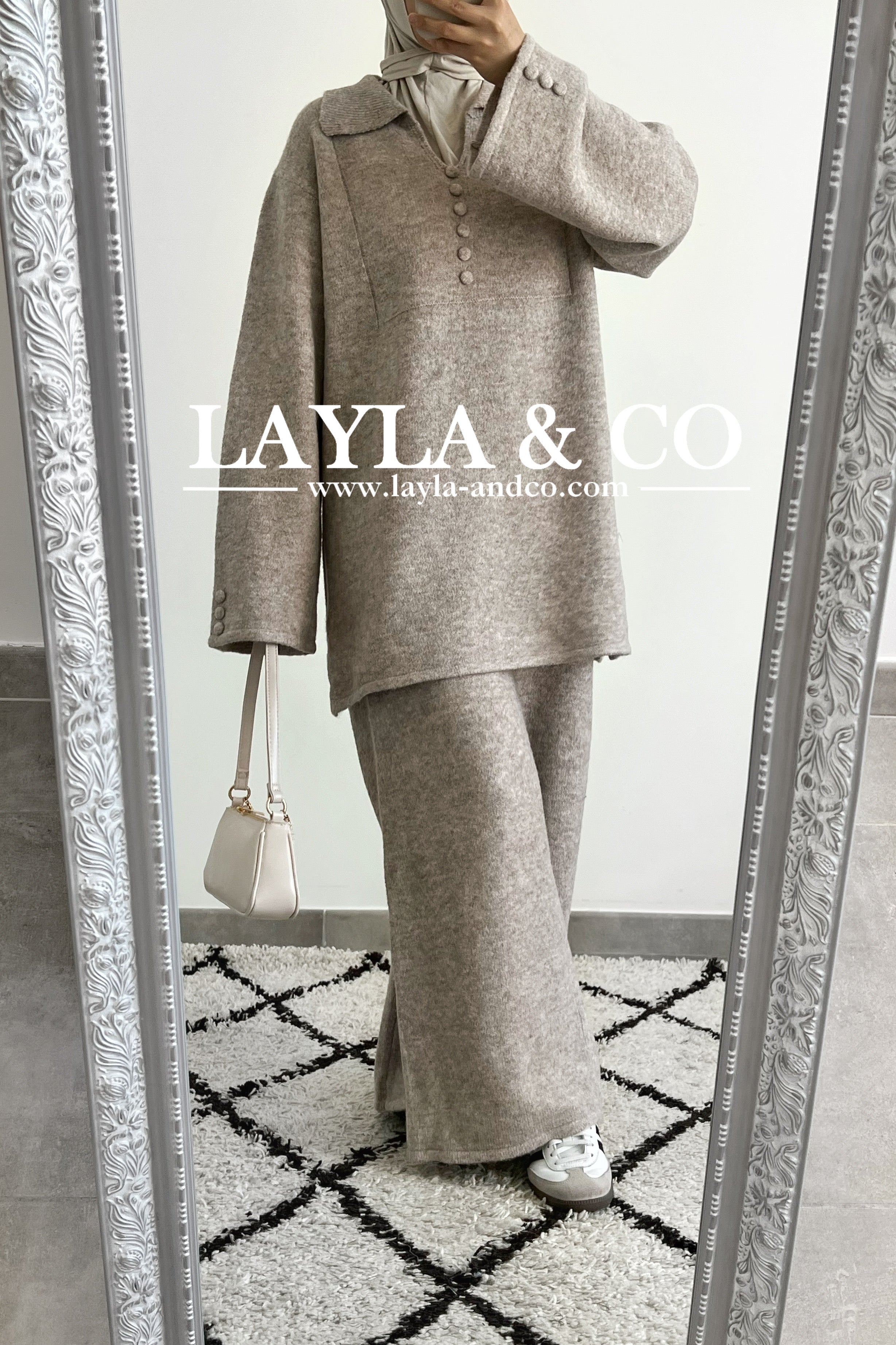 Ensemble 2 pièces composé d’un polo avec boutons décoratifs et d’un pantalon assorti. Maille chaude pour l’hiver avec laine mélangée.