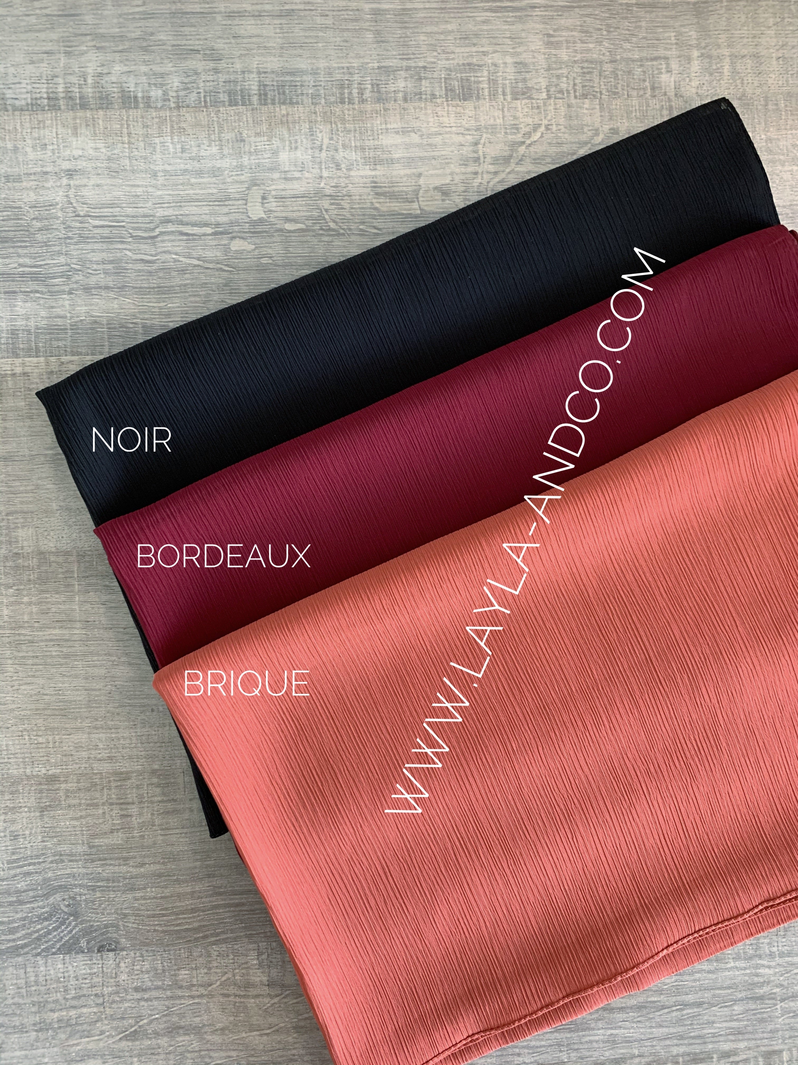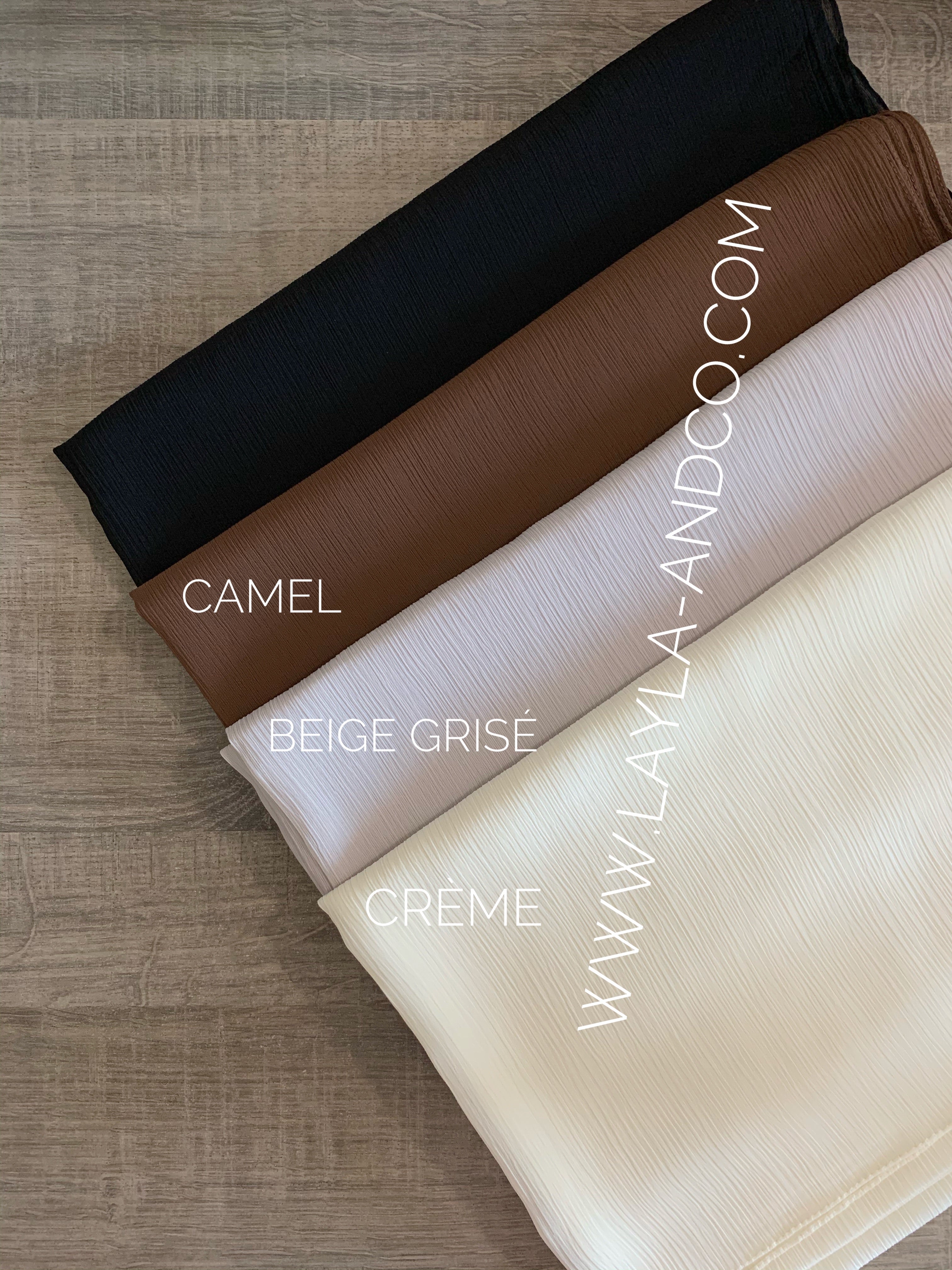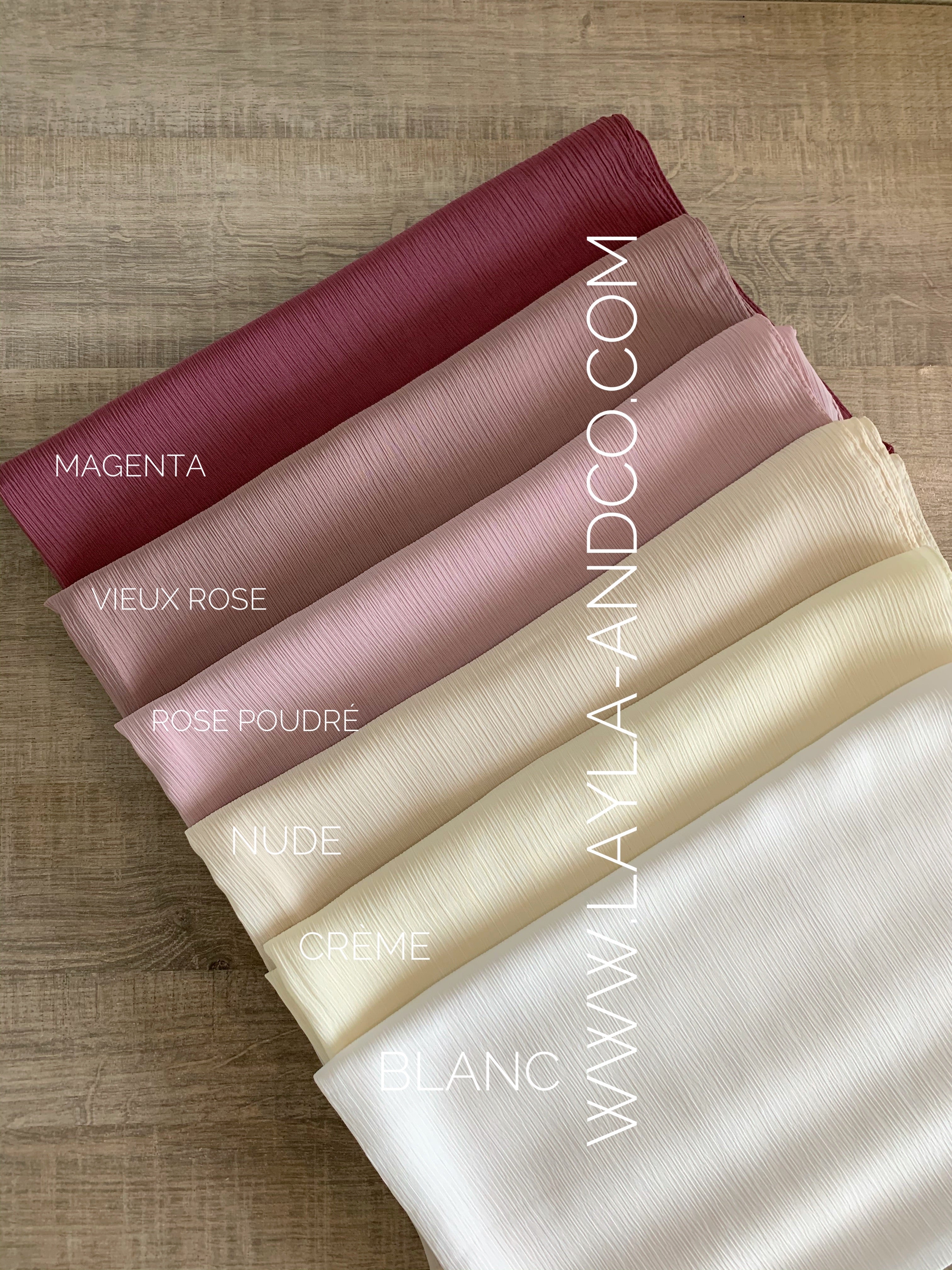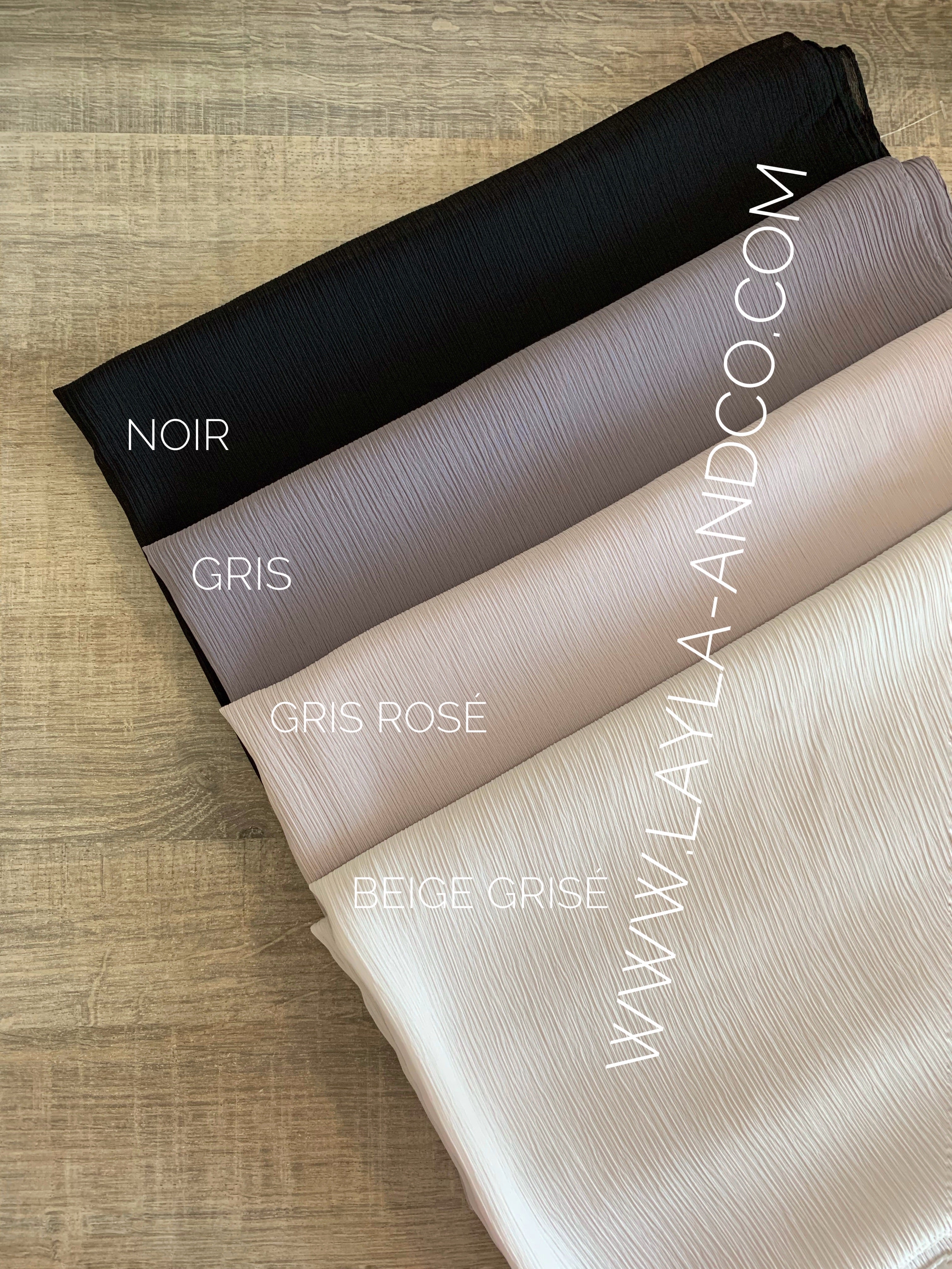 contrairement au foulard plissé classique il n’est pas bouffant, rendu fluide et léger comme le mousseline, l’effet « plissé » ne se déplisse pas et reste discret.