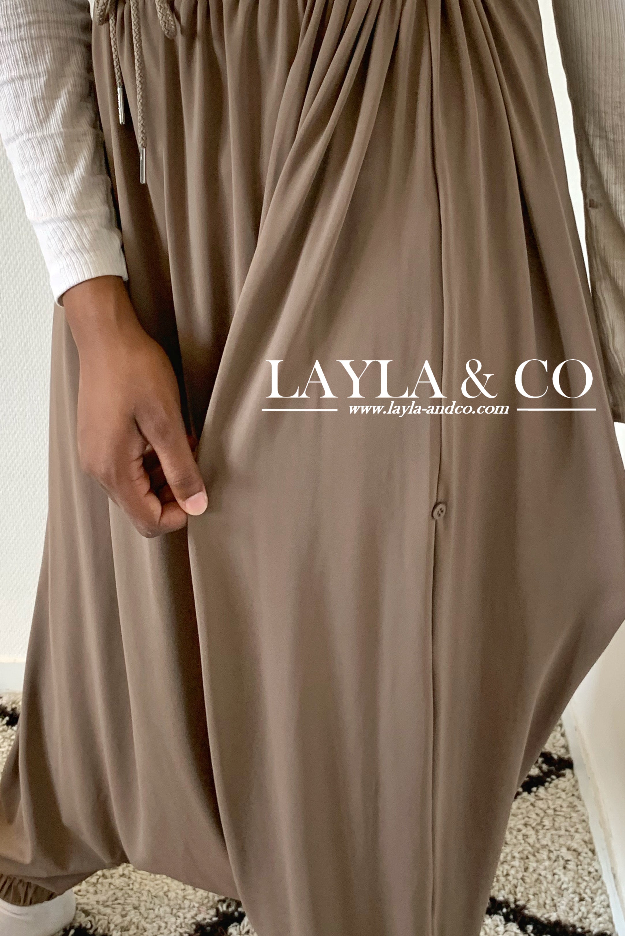 Le sarouel contient un bouton de chaque côté pour venir attacher à l’aide d’un lien la tunique pour un maintien parfait. ( le lien peut être noir ou de couleur transparente )