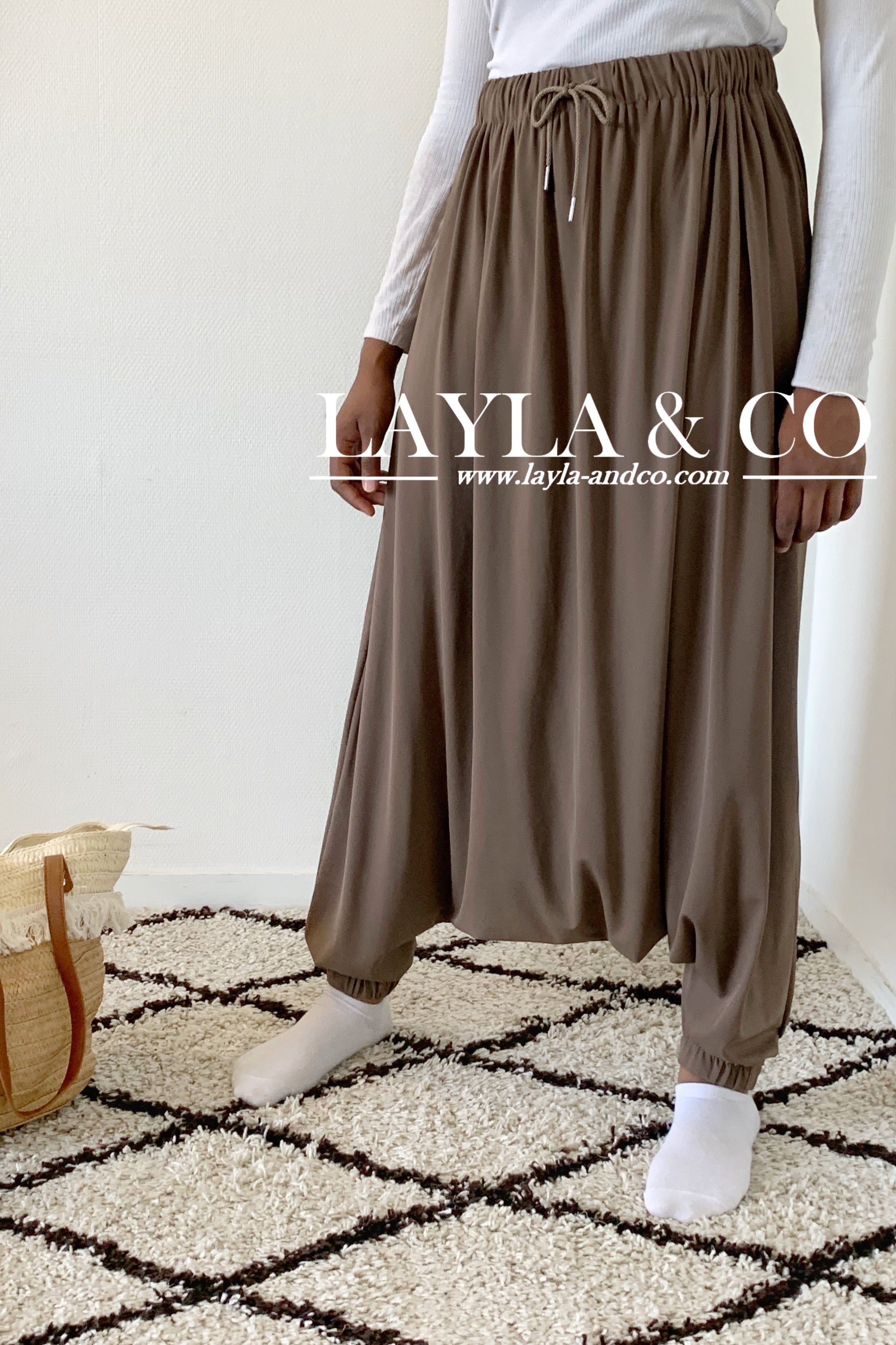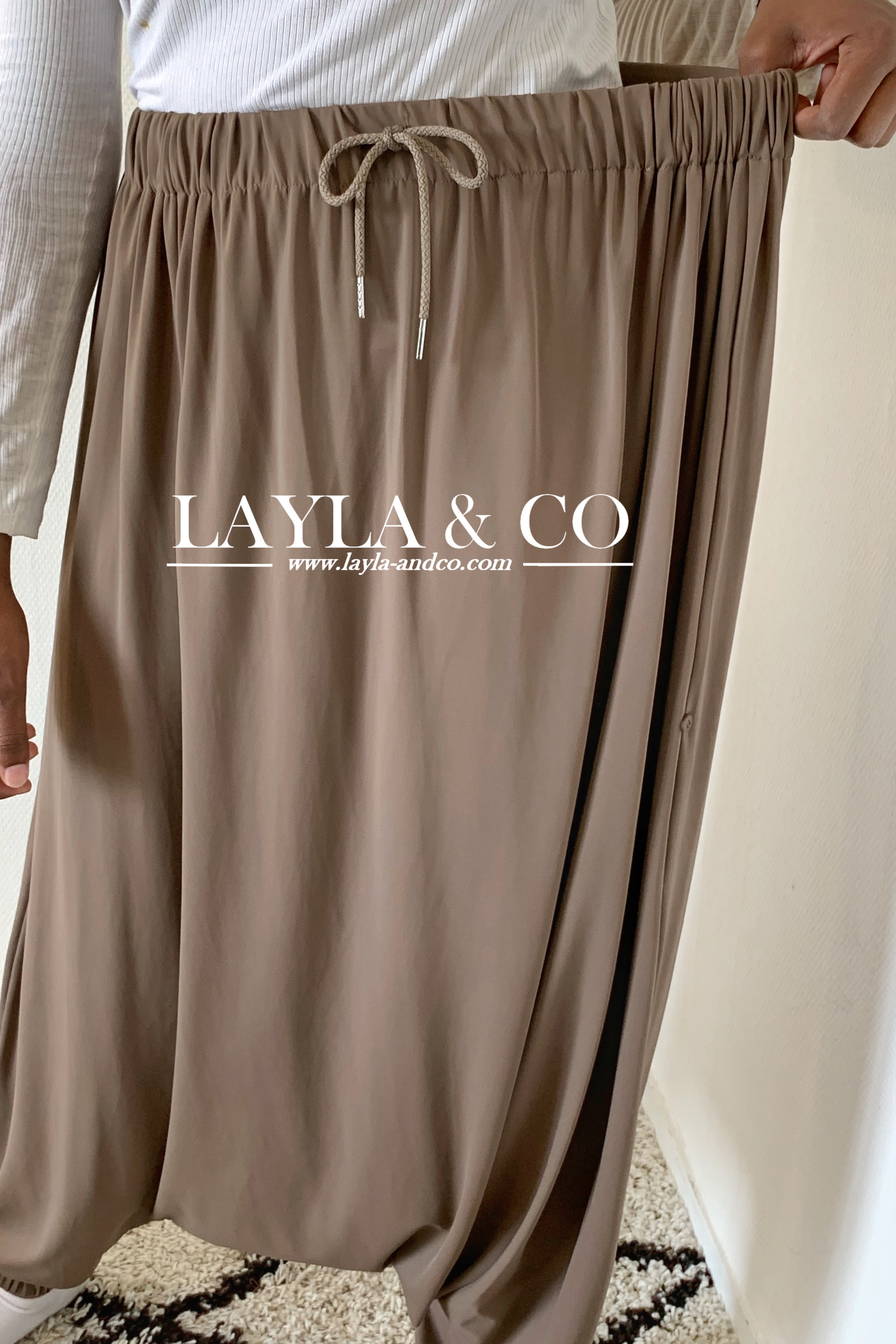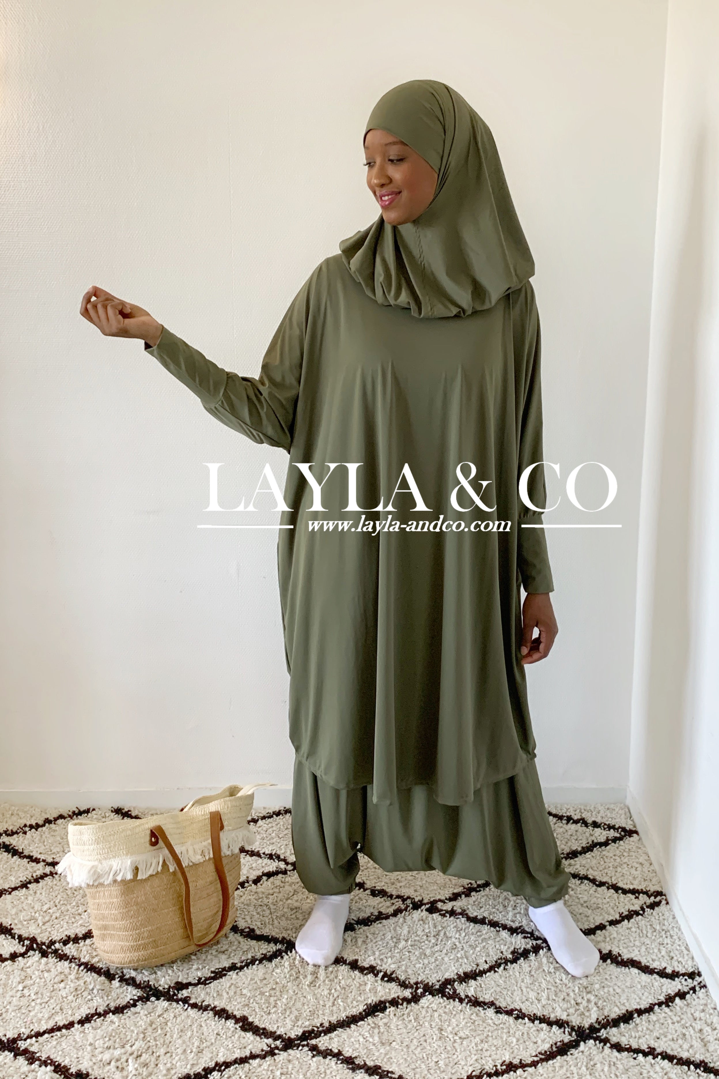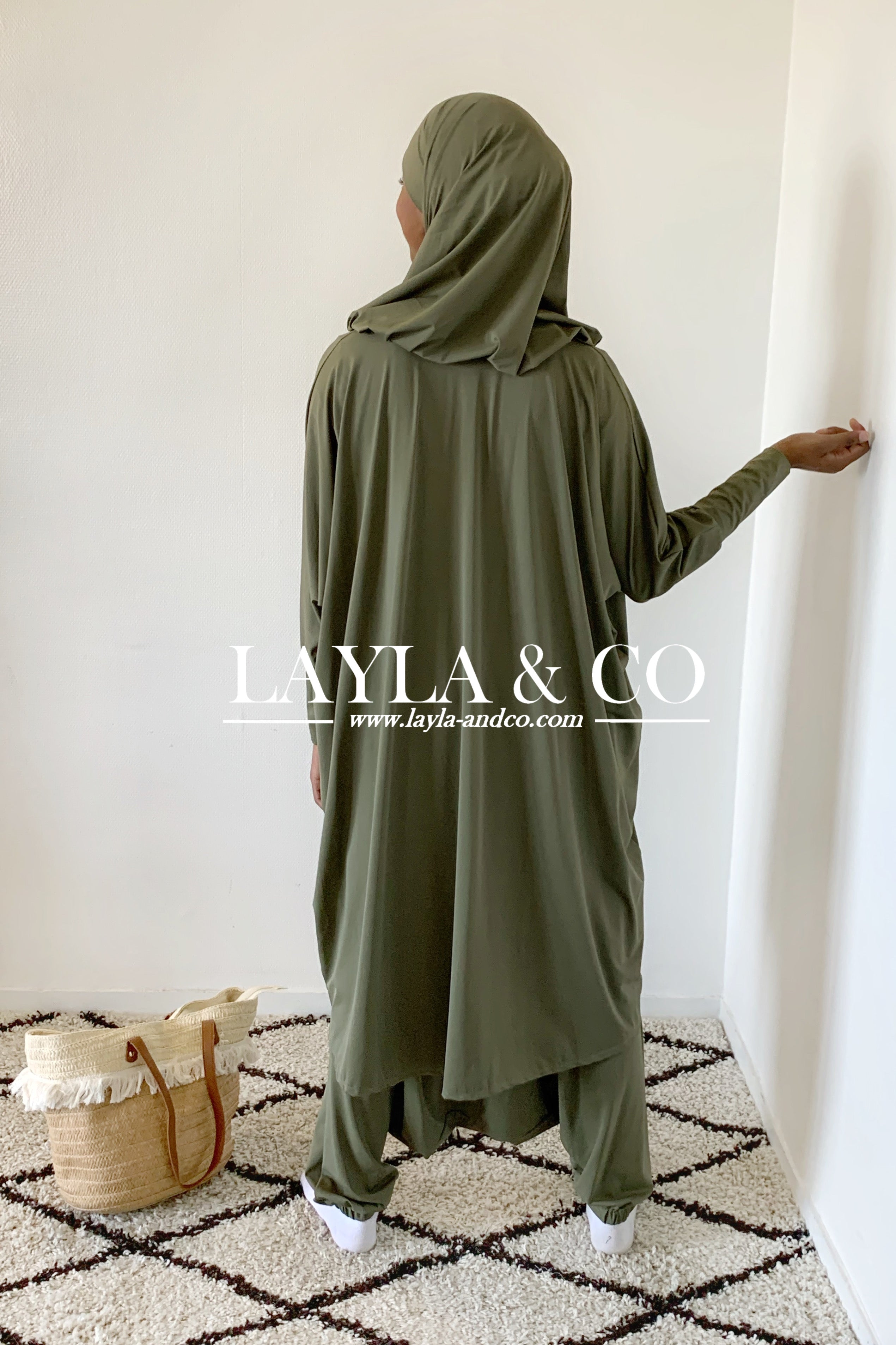 une tunique longue coupe papillon avec hijab cousu à enfiler comme un jilbeb et d’un pantalon sarouel élastique à la taille.