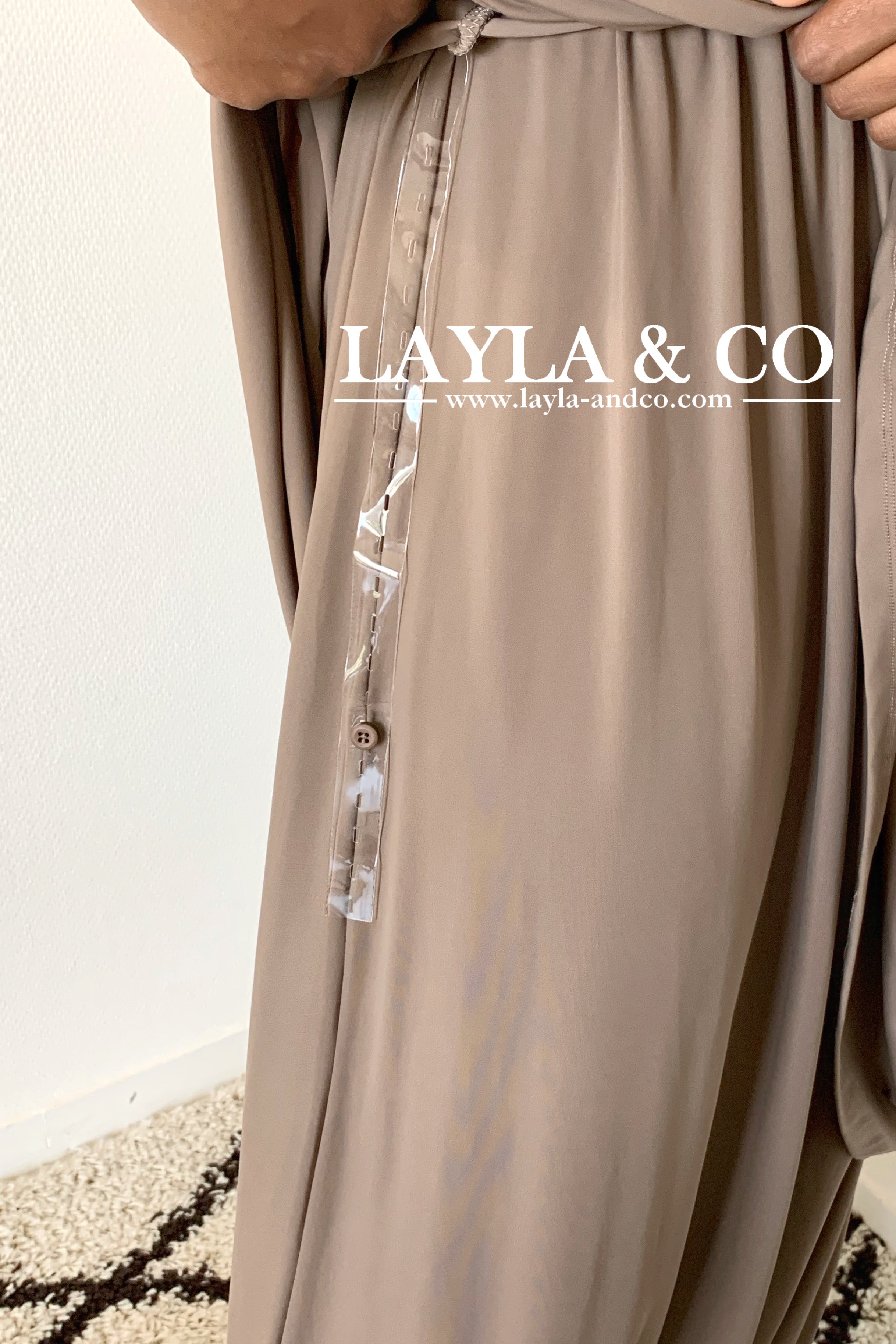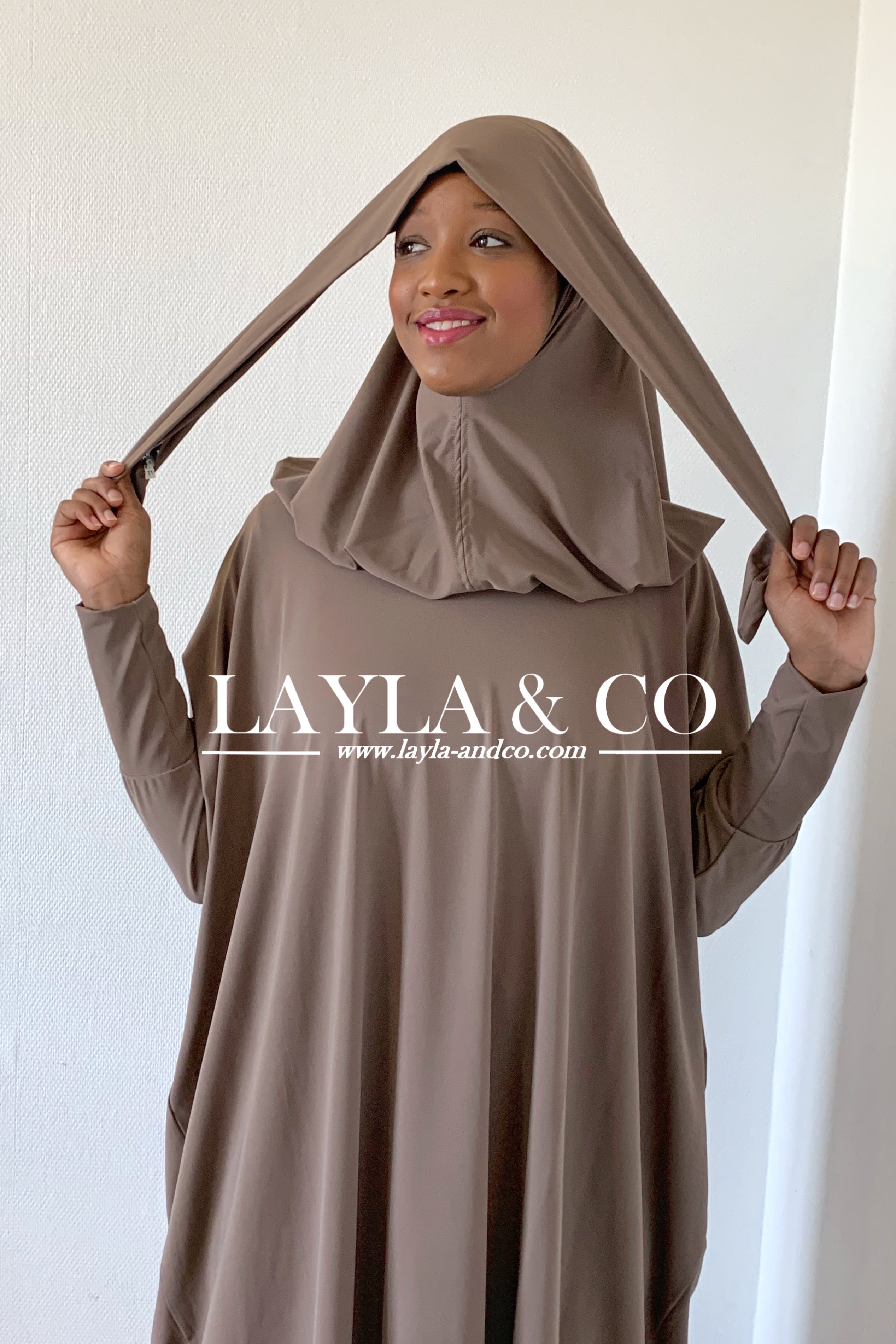 Le hijab est cousu directement à la tunique et a un effet bouffant au cou lorsqu’il est porté, il s’attache à l’aide de deux bandes comme un jilbeb.