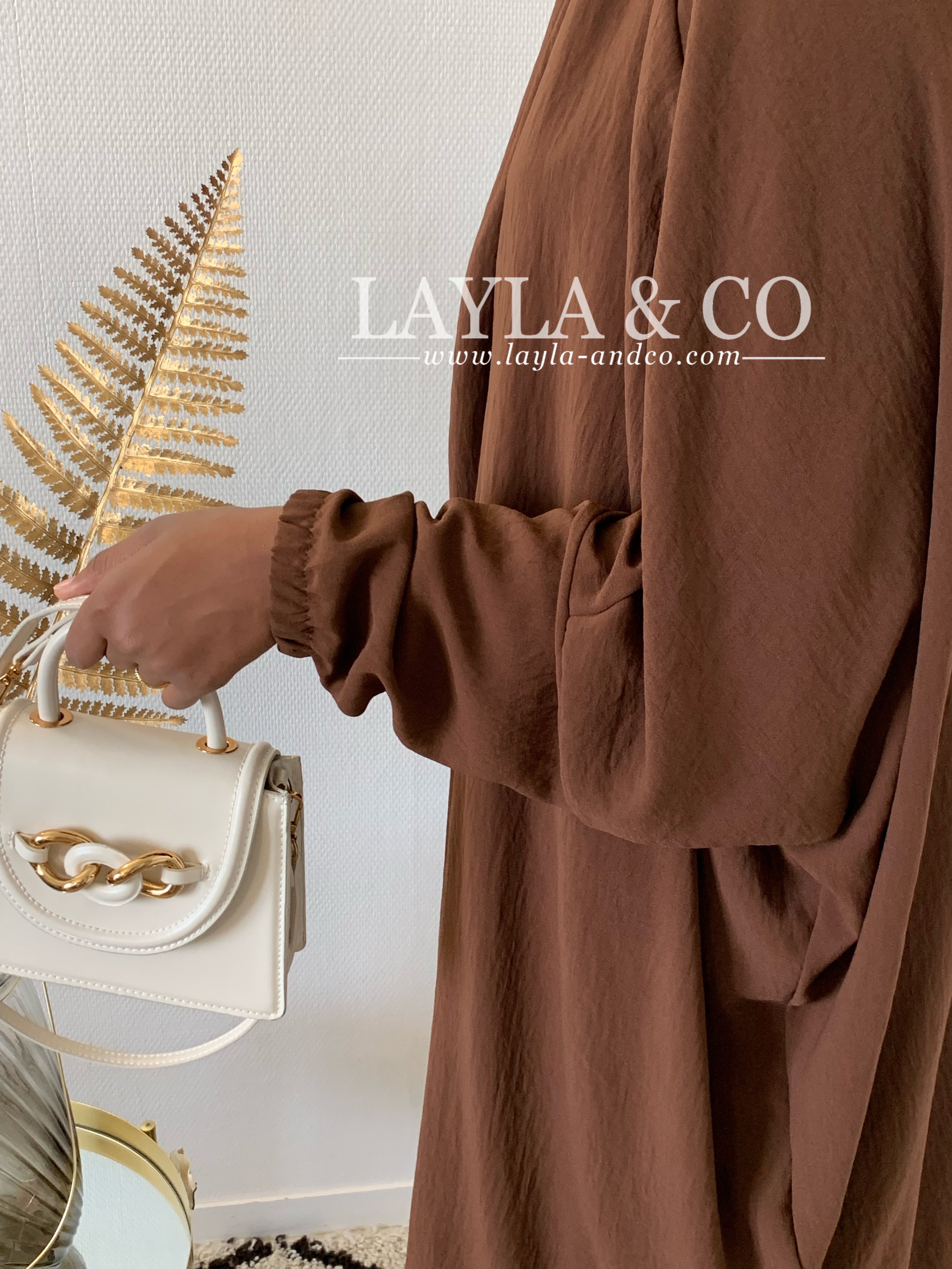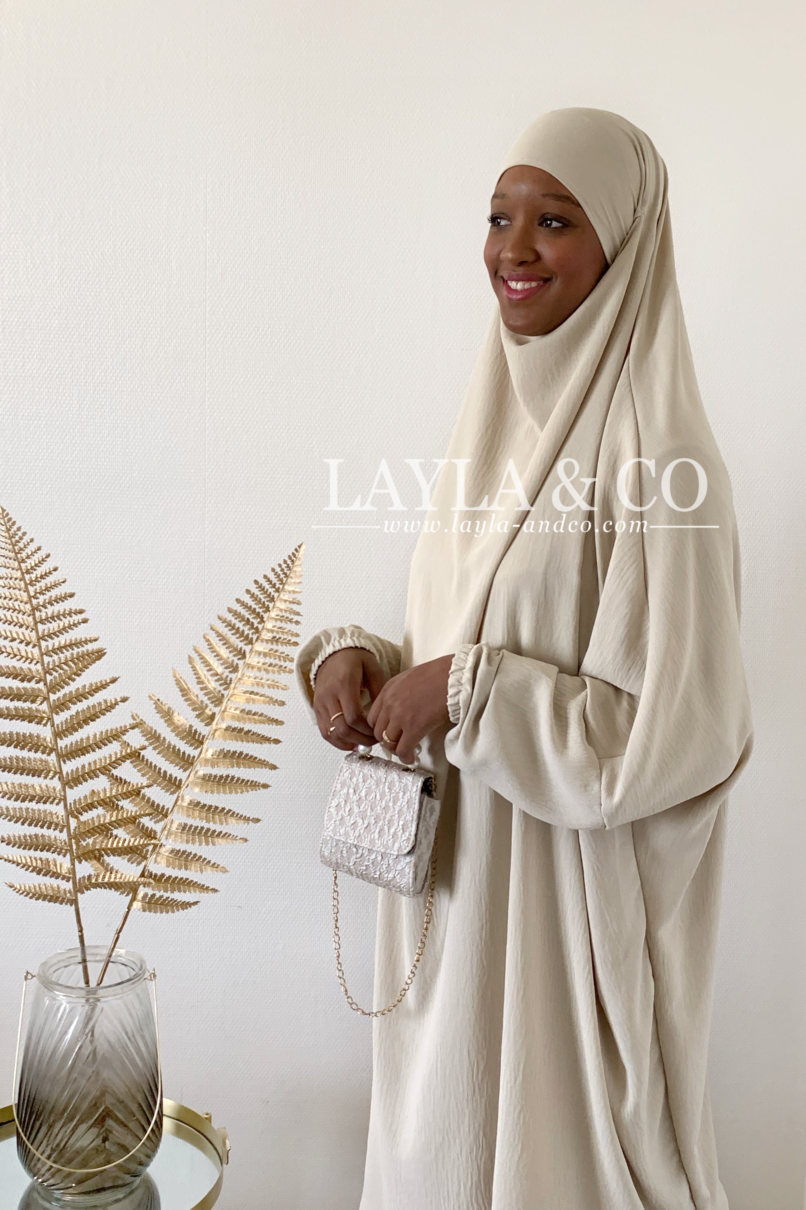 Jupe élastique à la taille et poignets élastique. La cape du jilbeb s’attache à l’aide de deux bandes derrière la nuque.