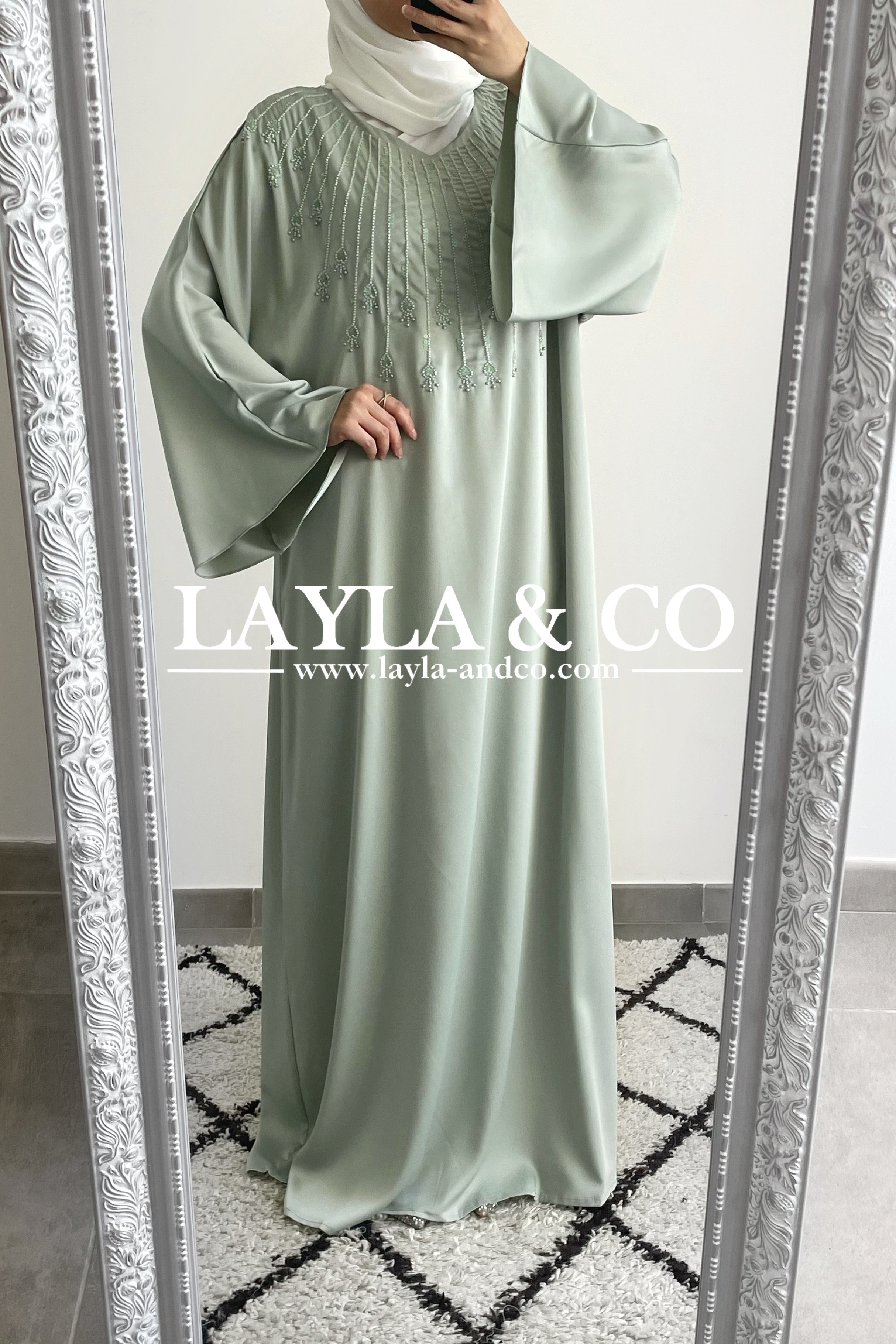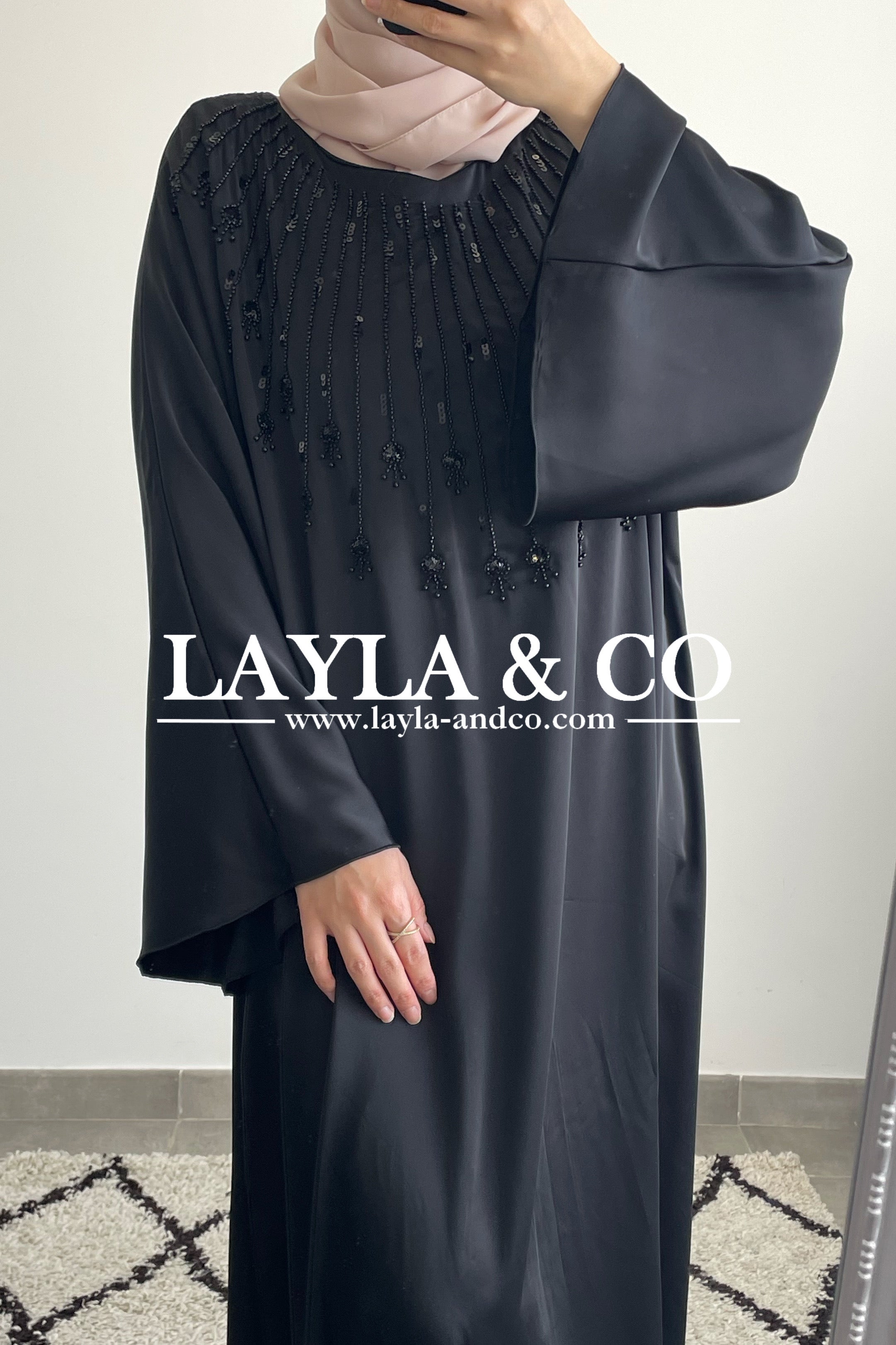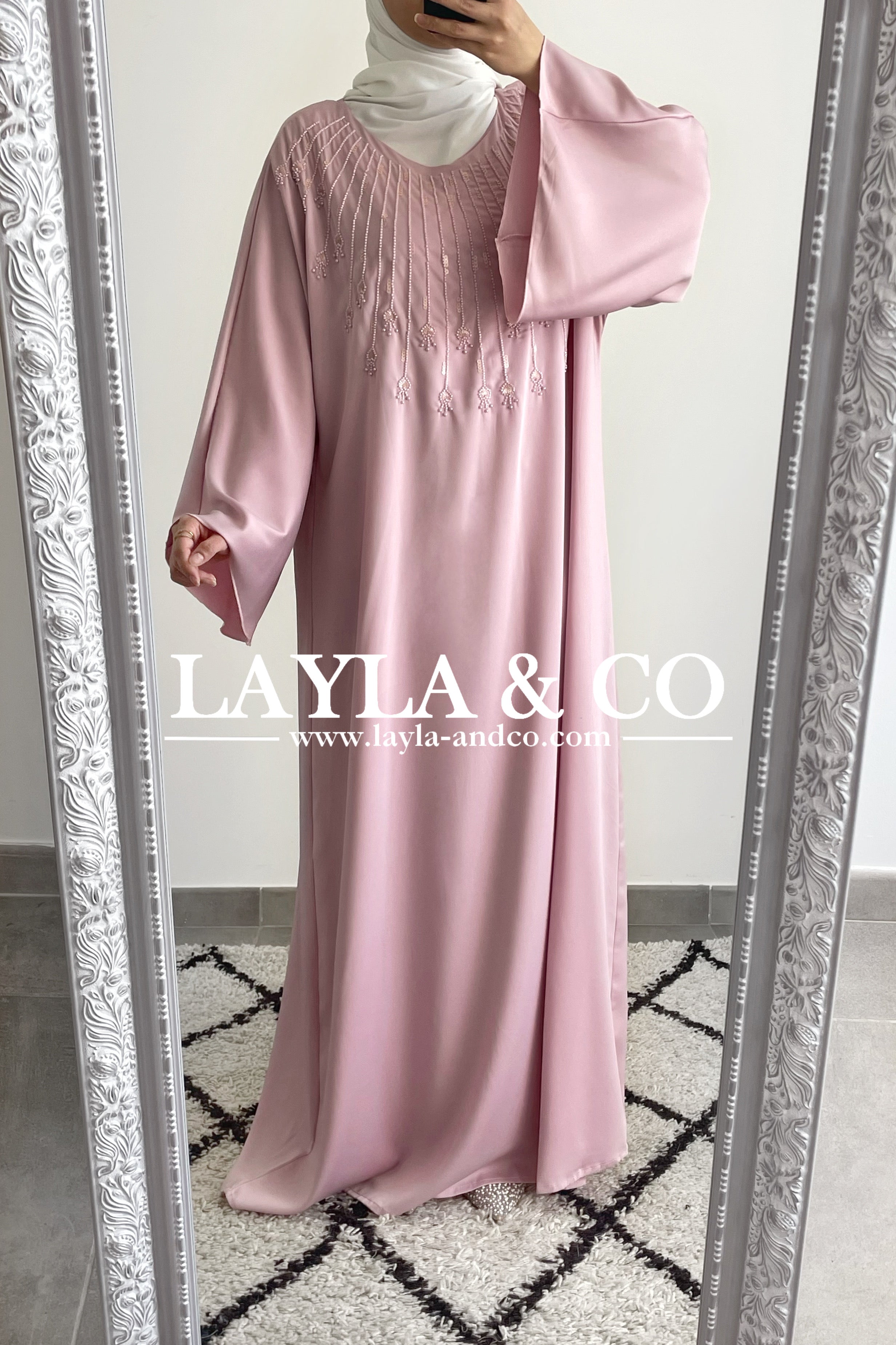 Abaya coupe ample satinée avec perles cousues main sur le long du buste.