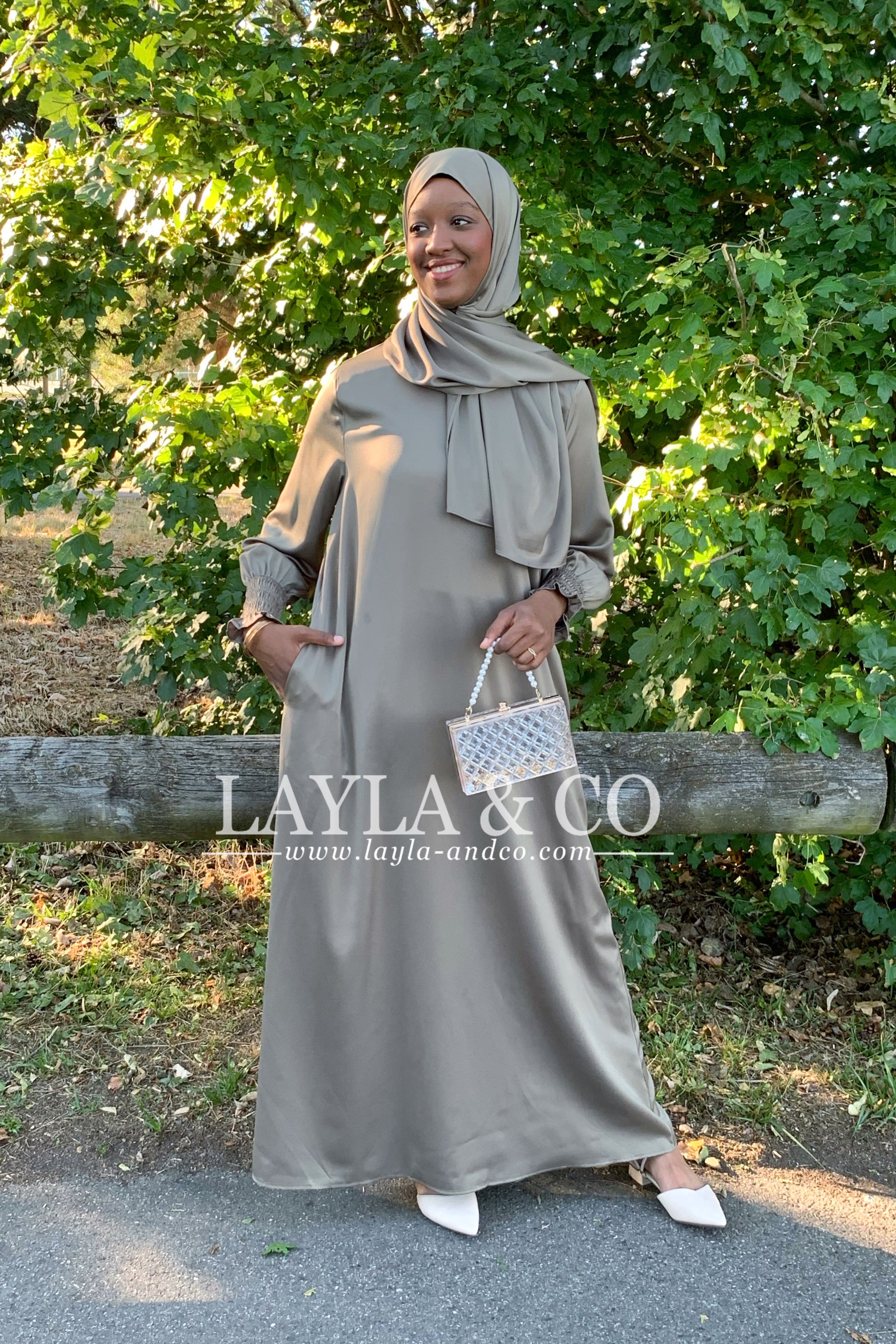 Abaya set composé d’une robe à manches froncées avec pôches et d’un foulard satin assorti.