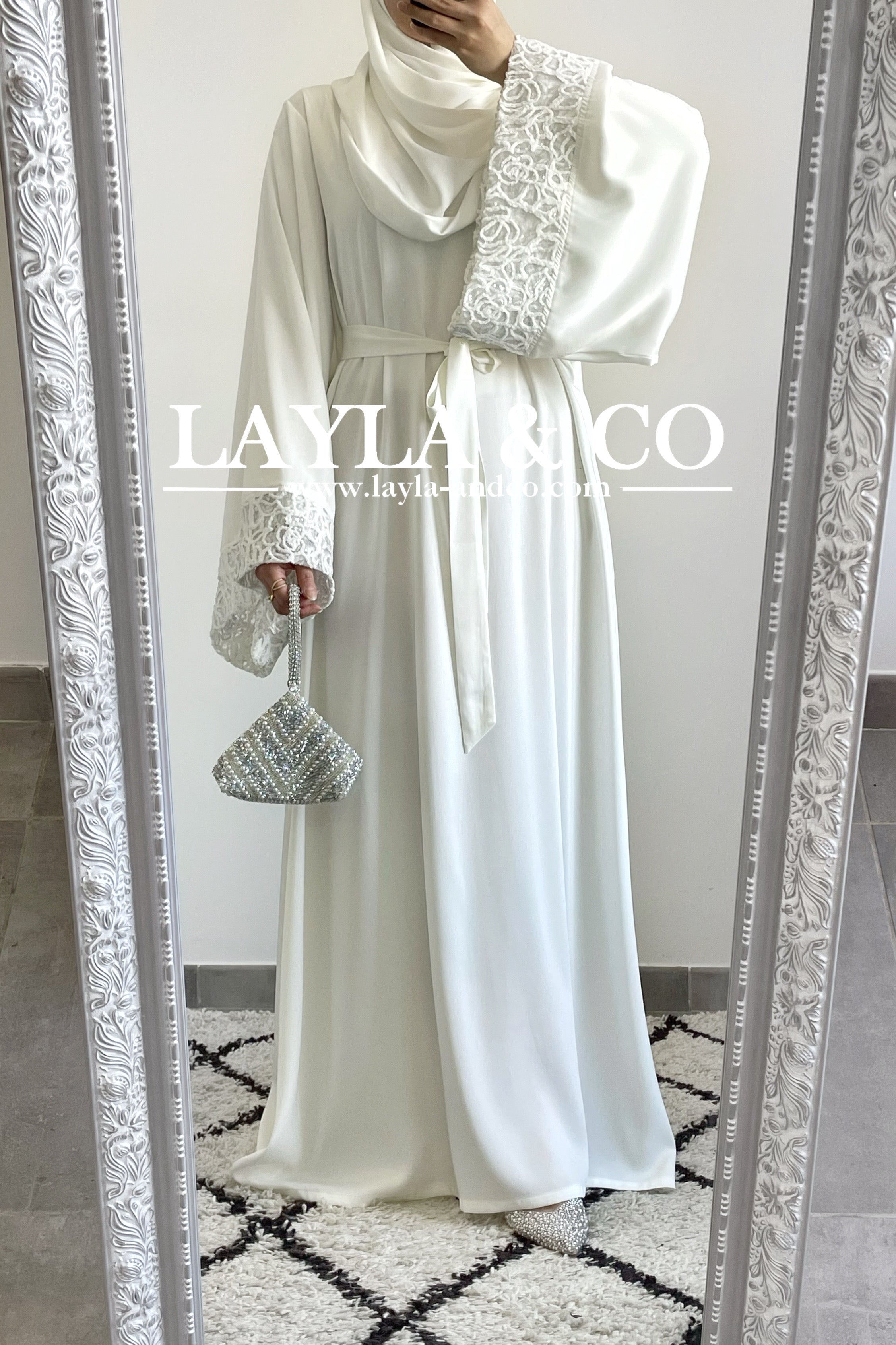 Abaya tissu satiné avec manches évasées et détail résille velours et sequins. Pôches sur le côté.