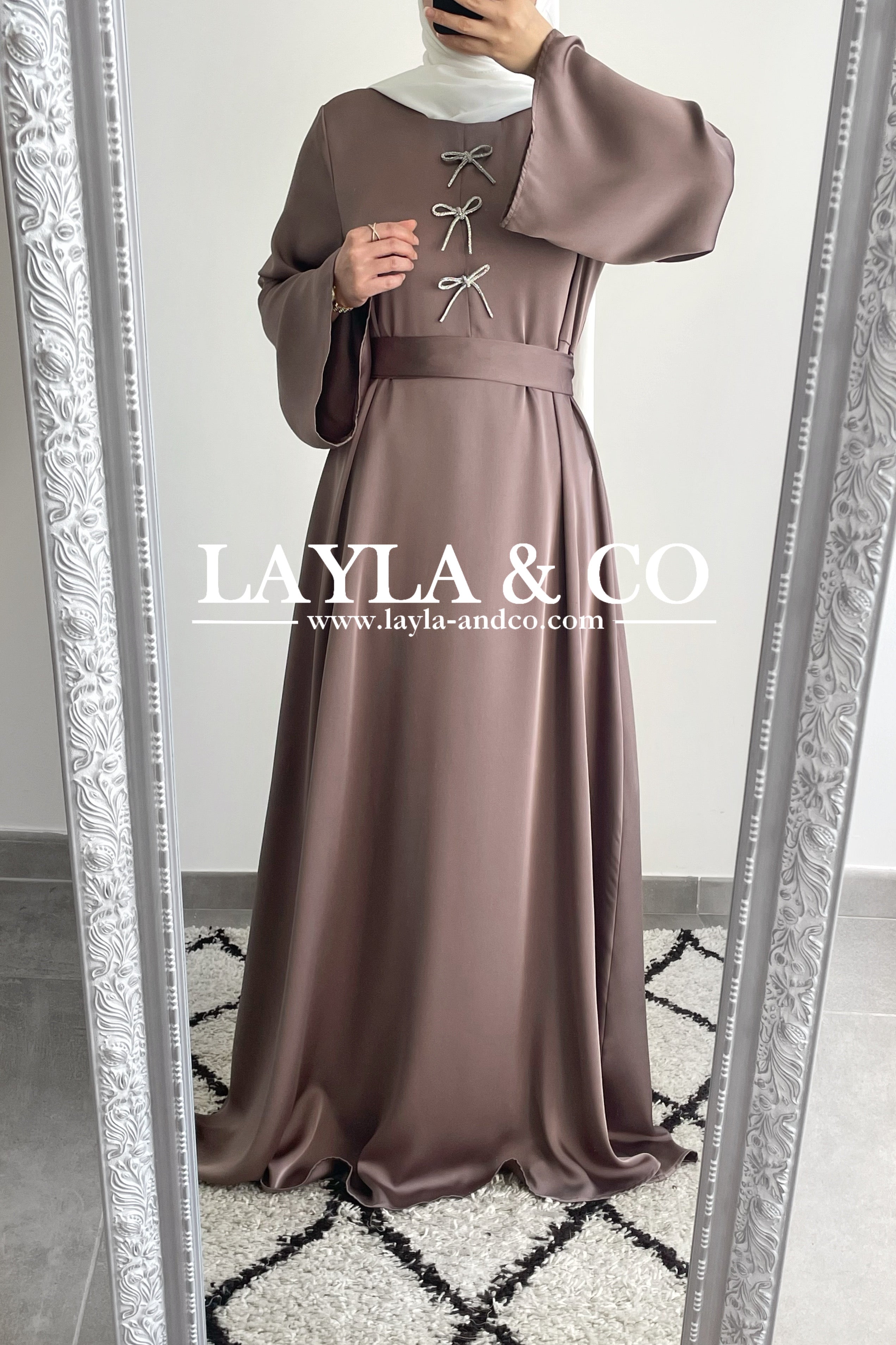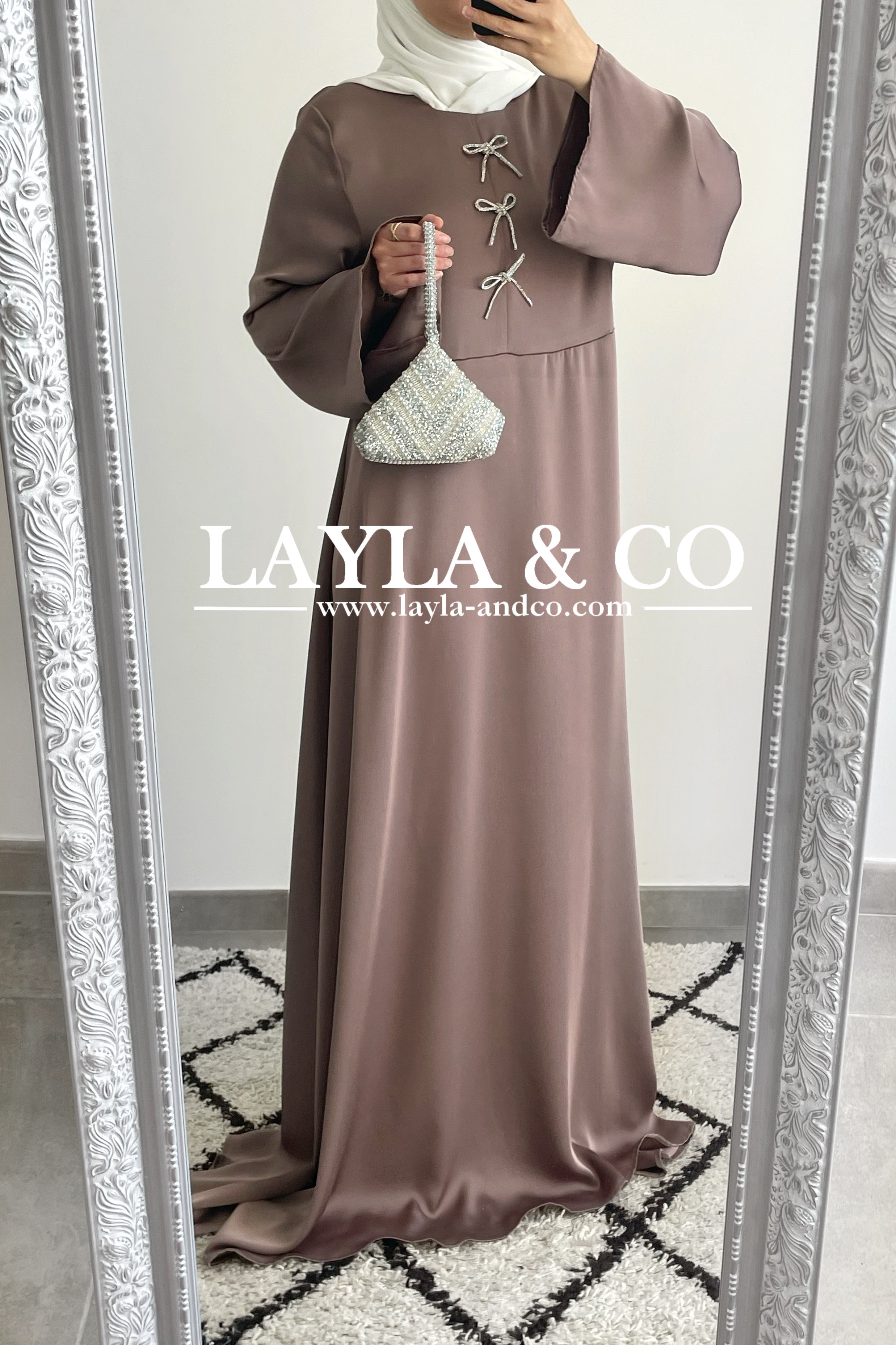Abaya satinée coupe évasée tissu qualité supérieure. La robe dispose de broches noeud qui peuvent être retirées et positionnées à votre goût.