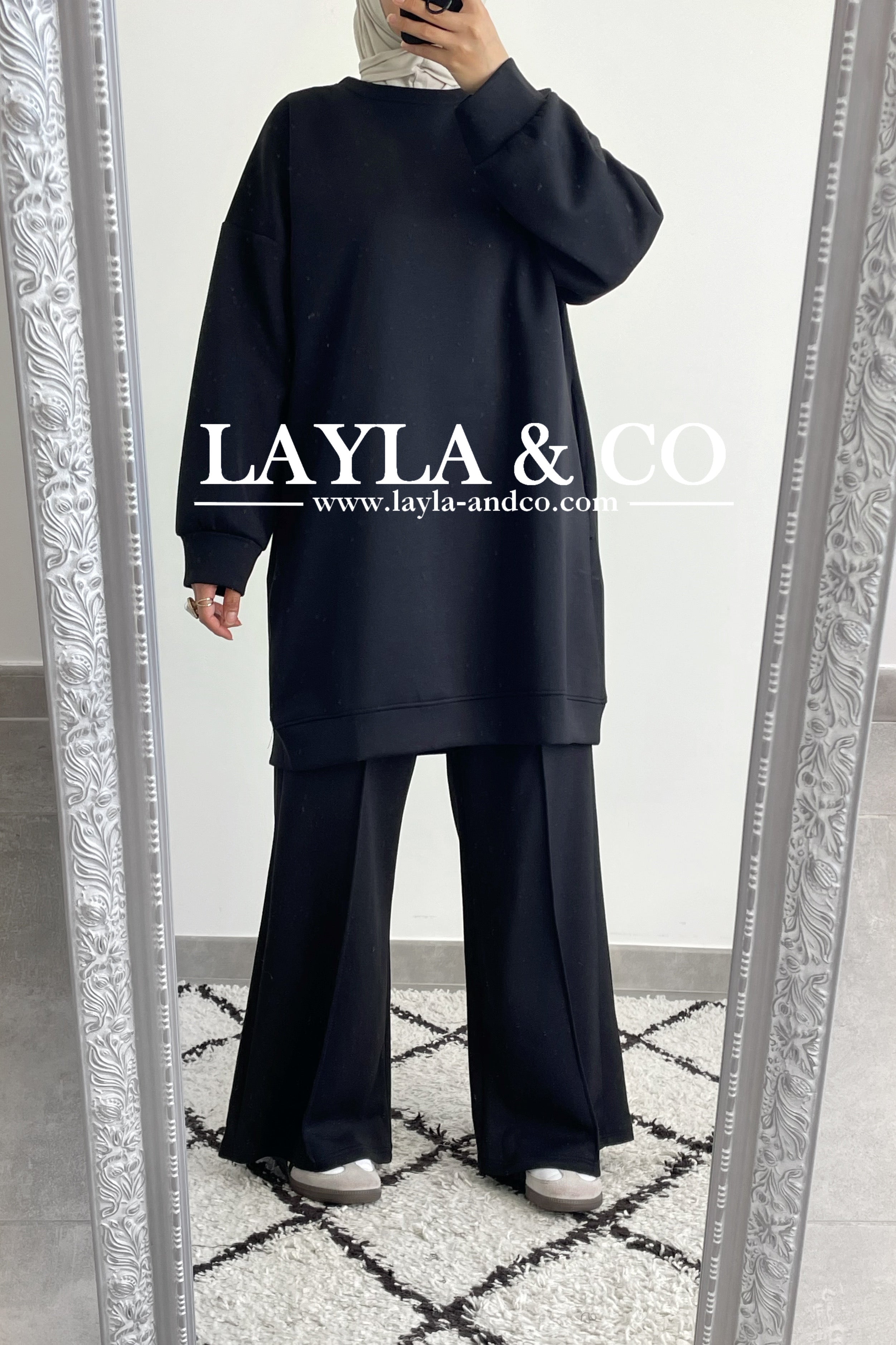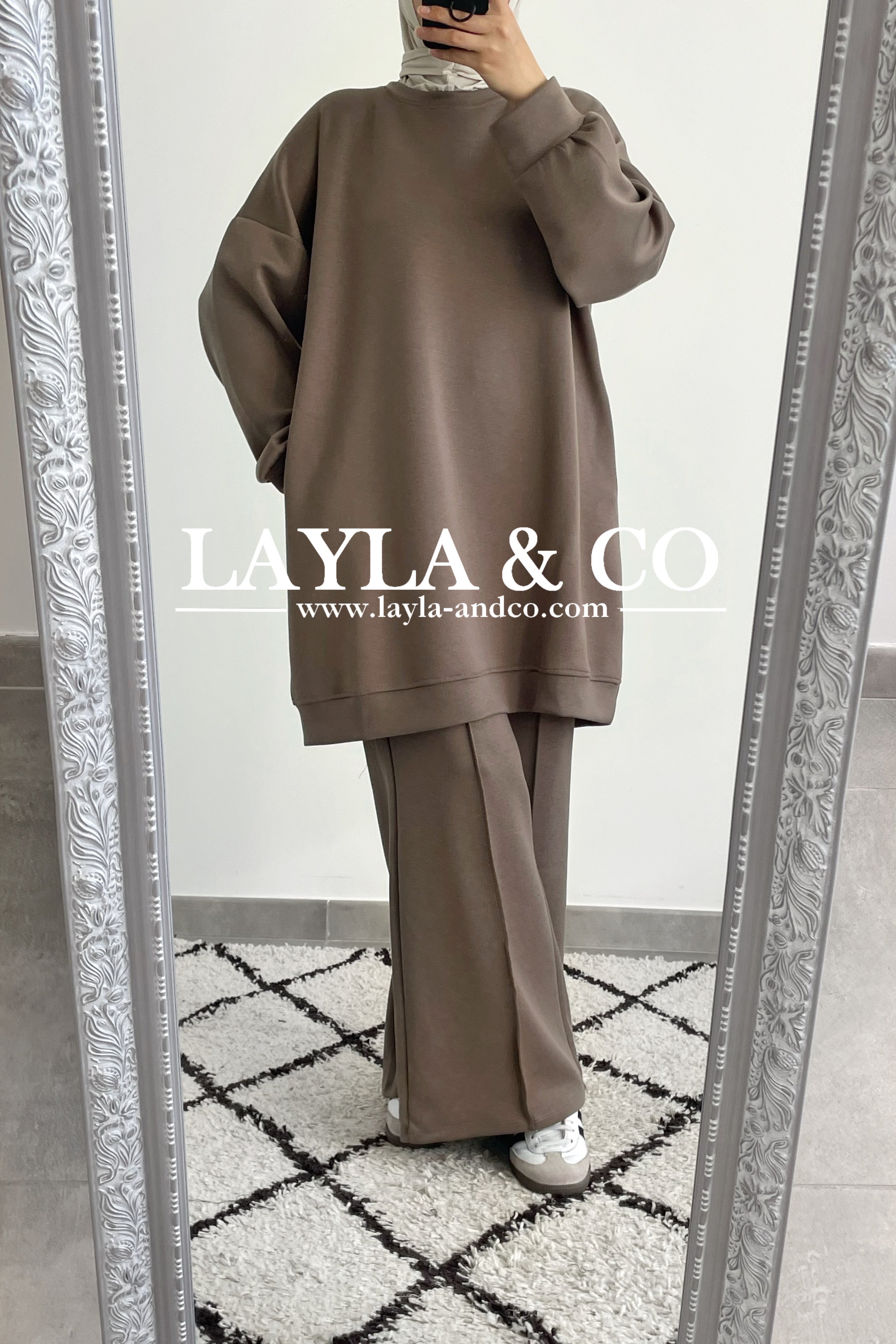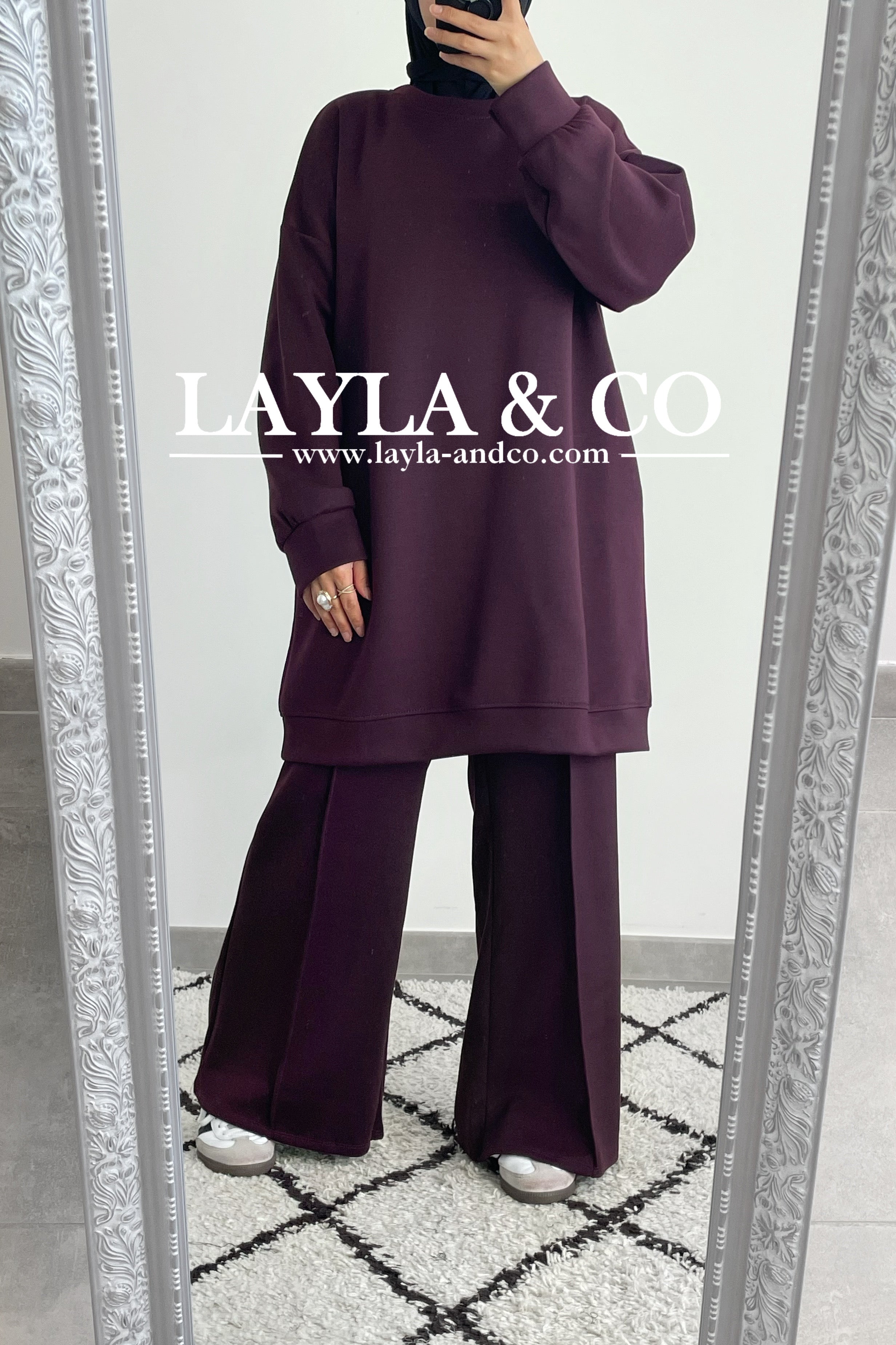 Ensemble 2 pièces composé d’un sweat long et d’un pantalon élastique à la taille. Tissu sweat très confortable.