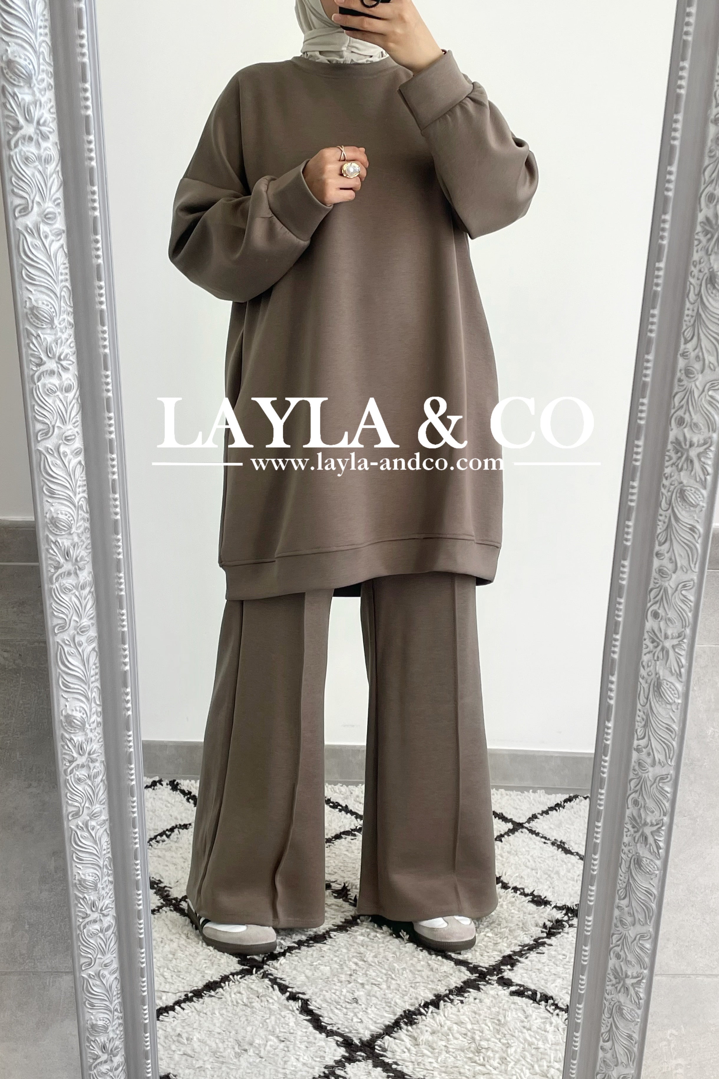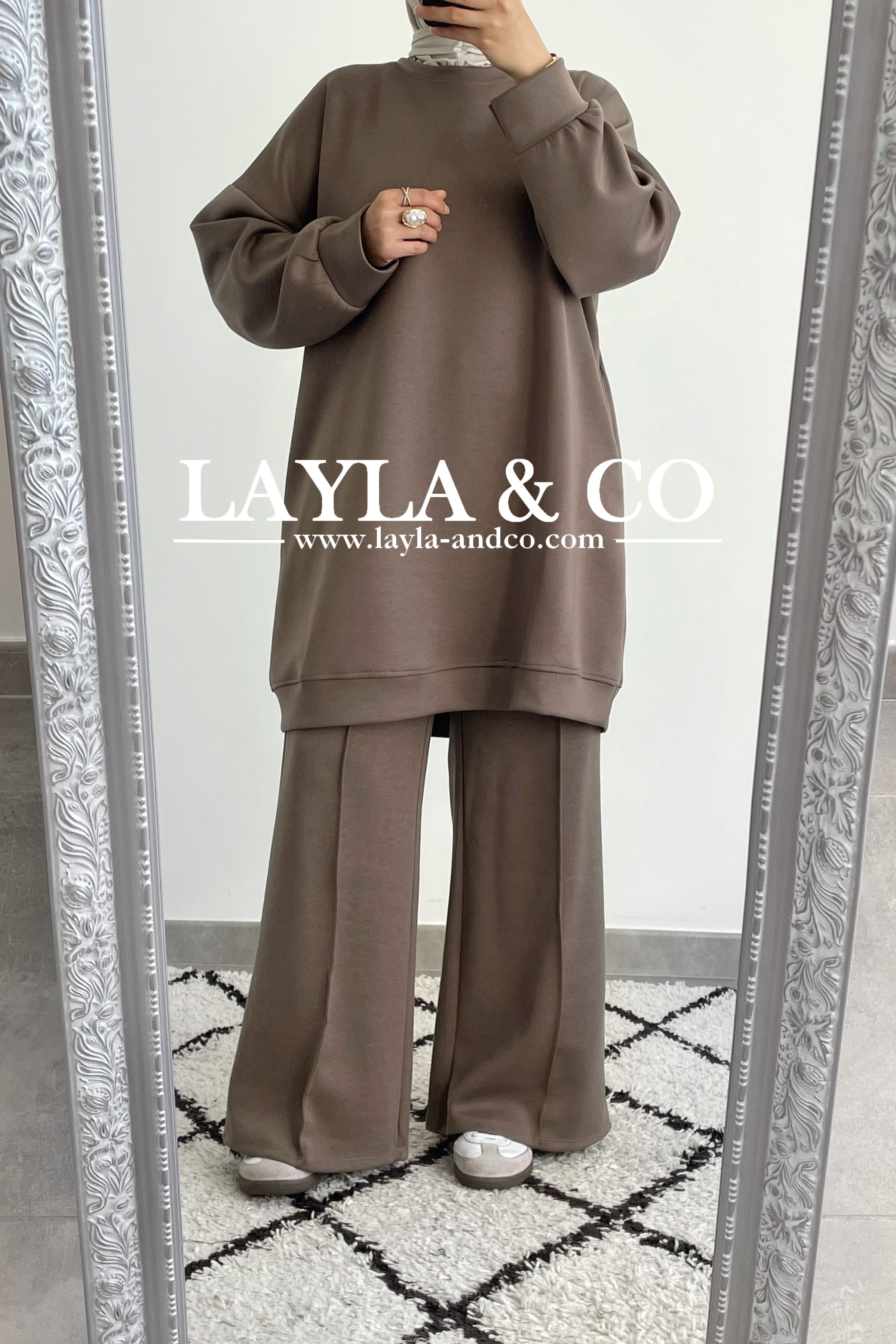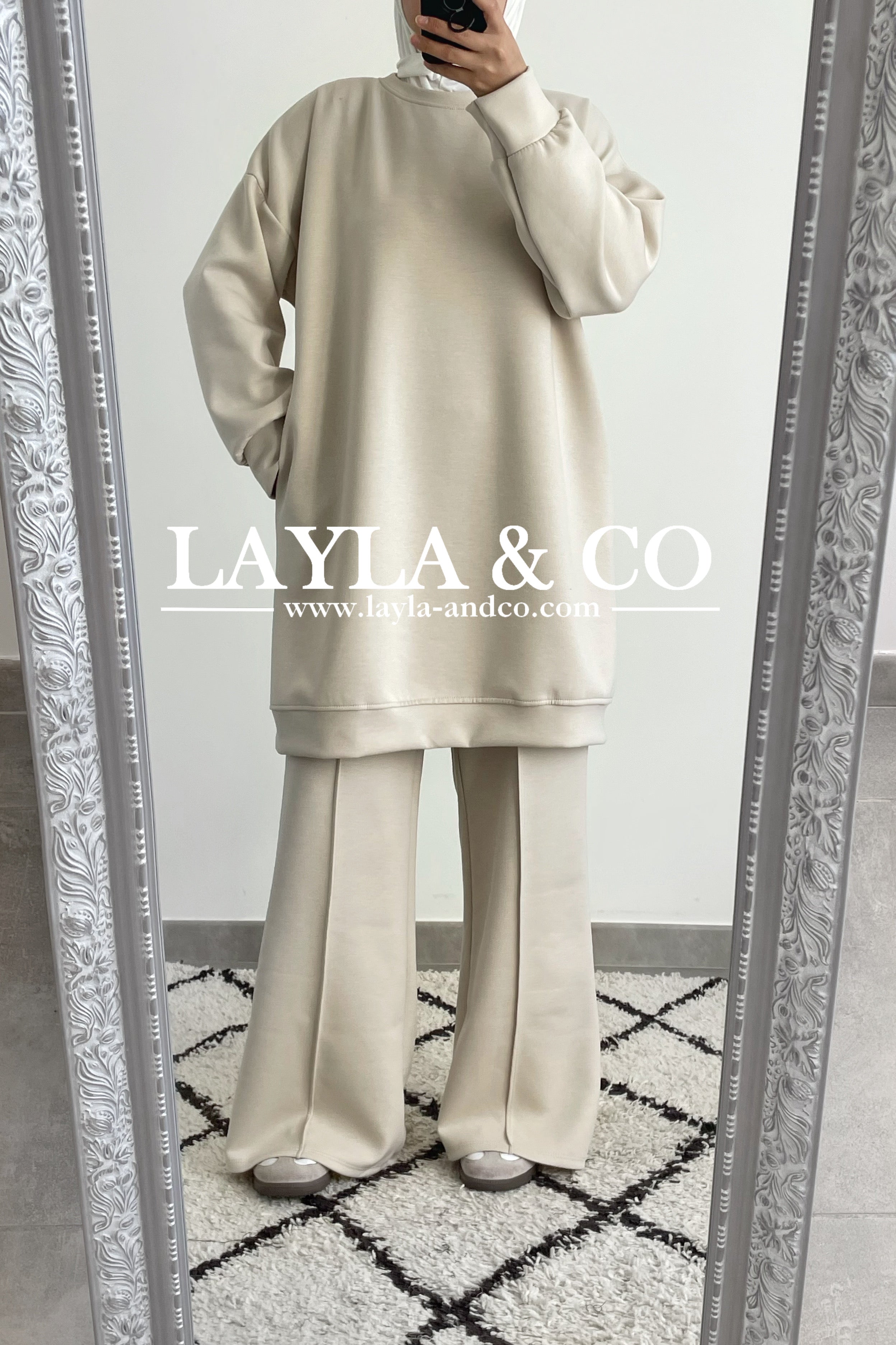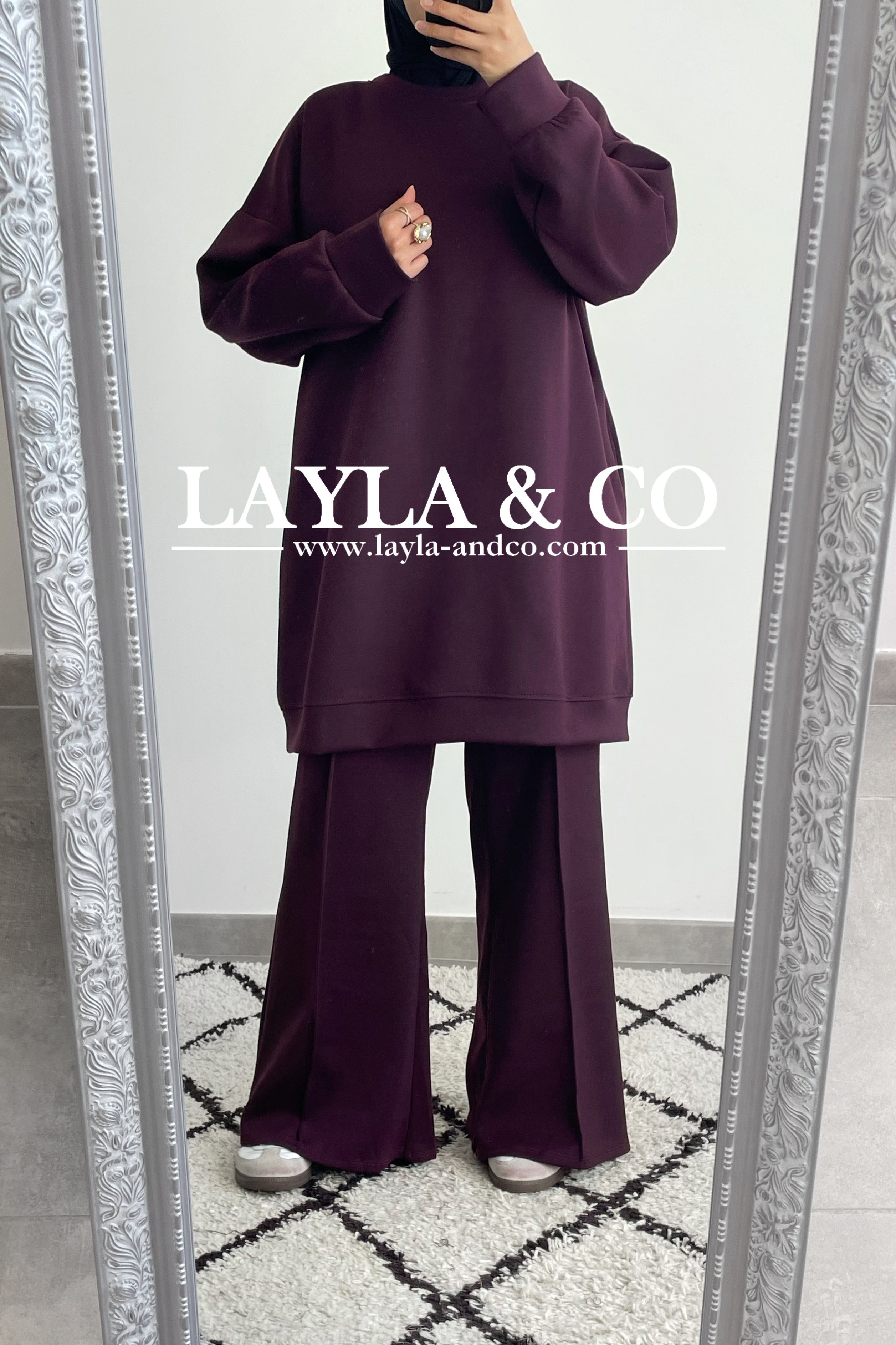 Ensemble 2 pièces composé d’un sweat long et d’un pantalon élastique à la taille. Tissu sweat très confortable.