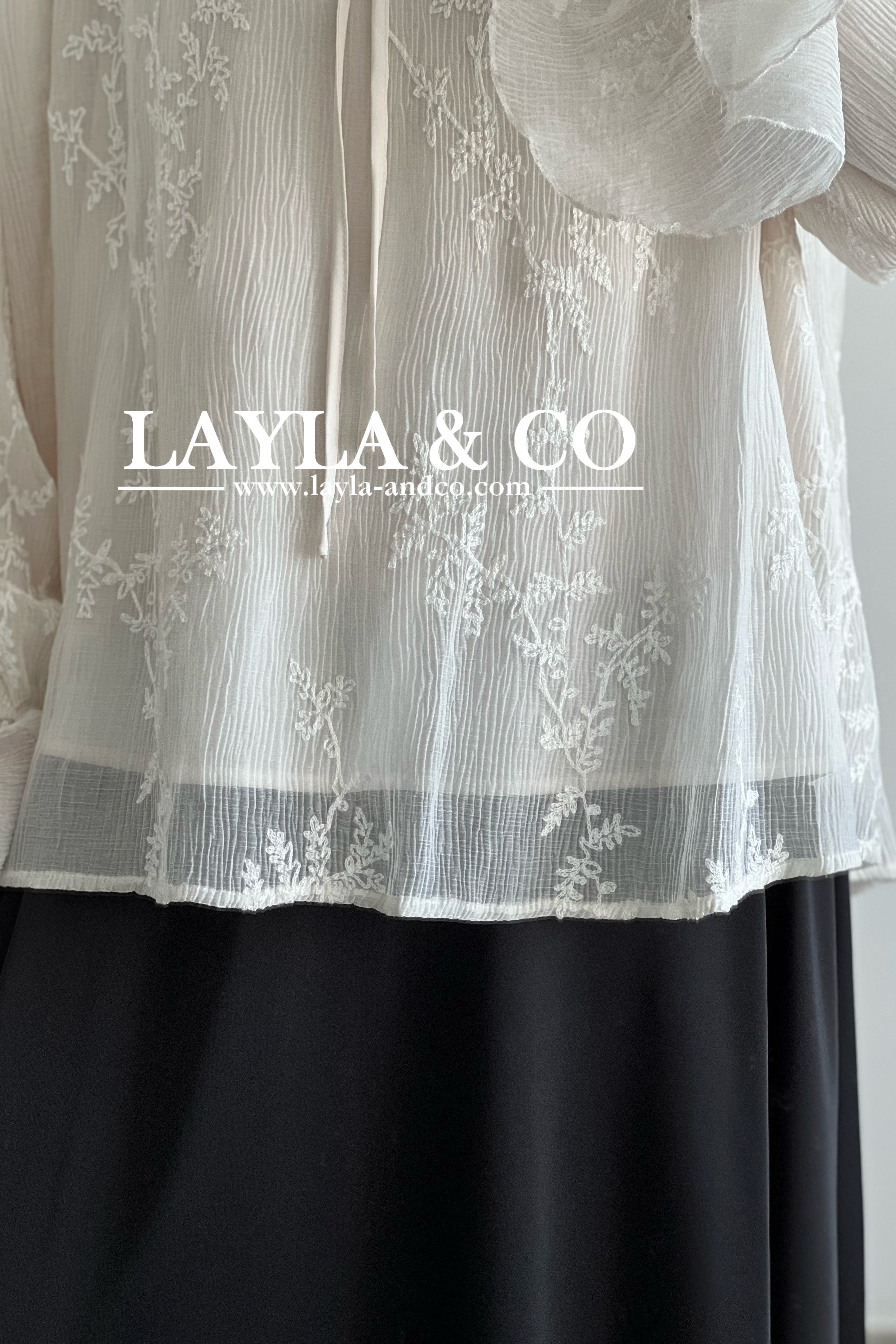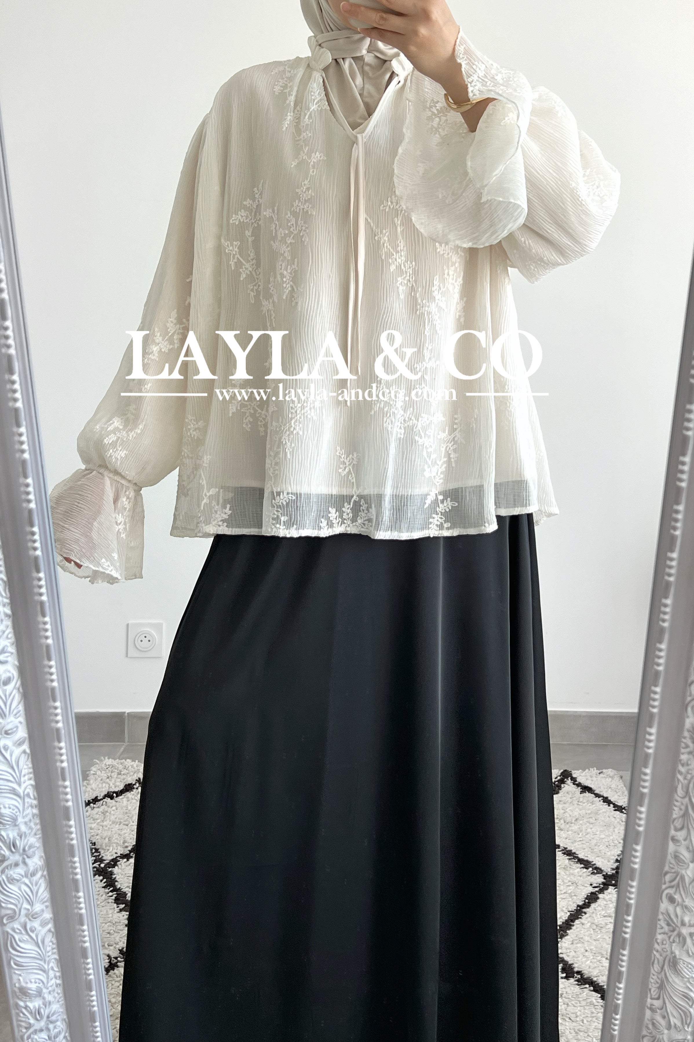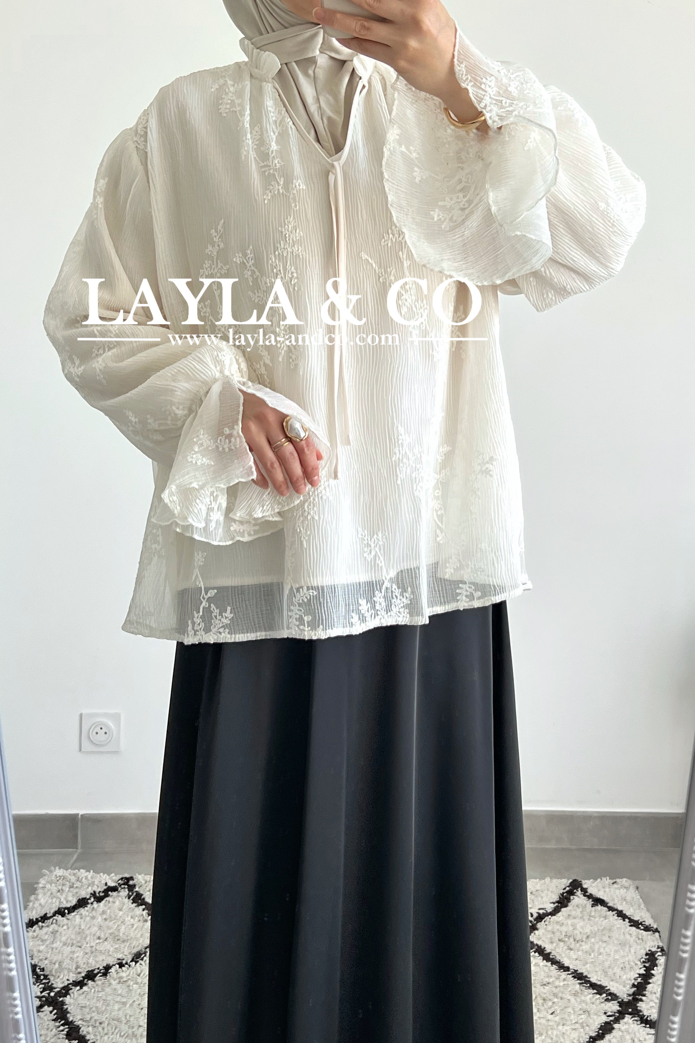 Blouse à voilage broderie entièrement doublée, manches volants fendues.