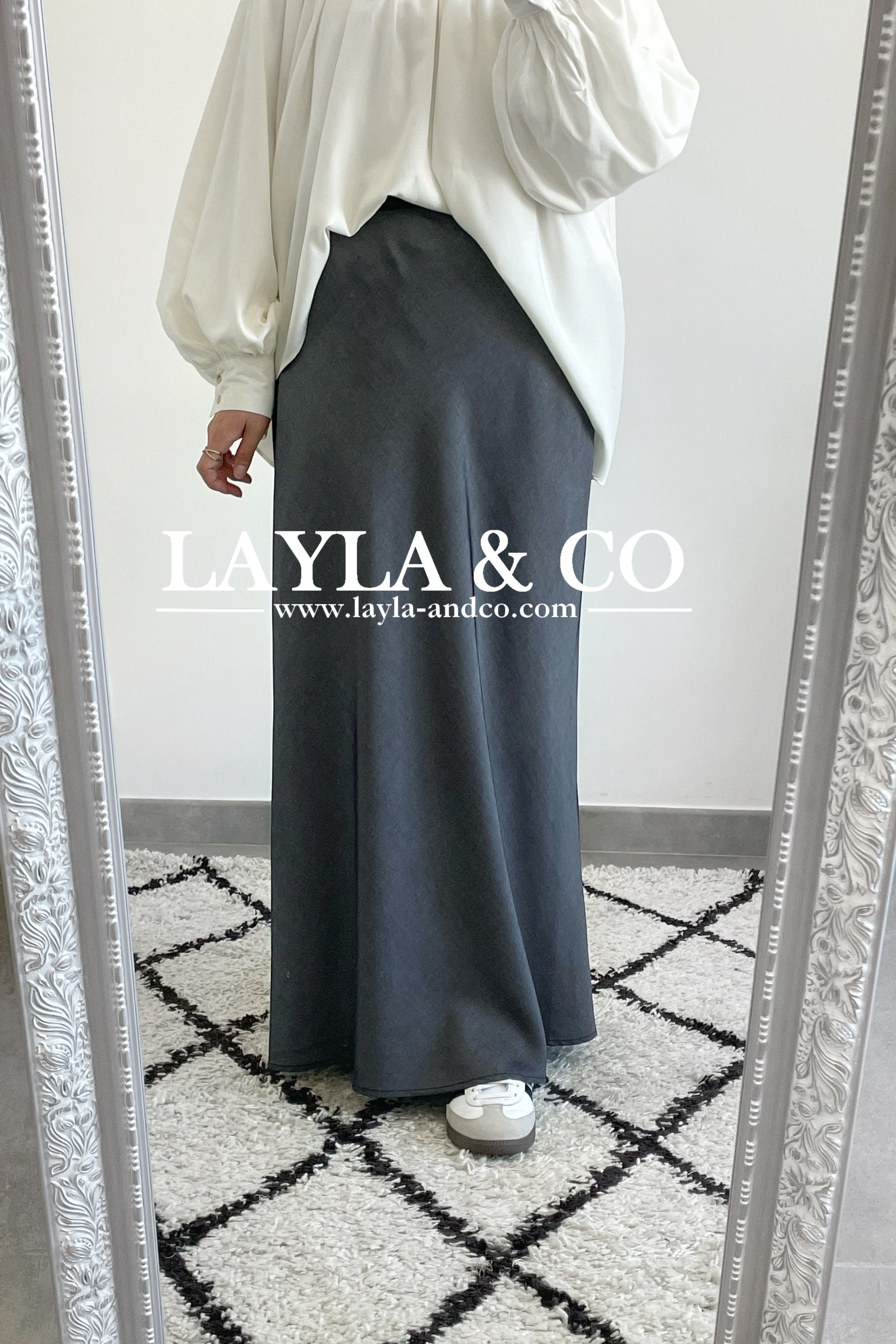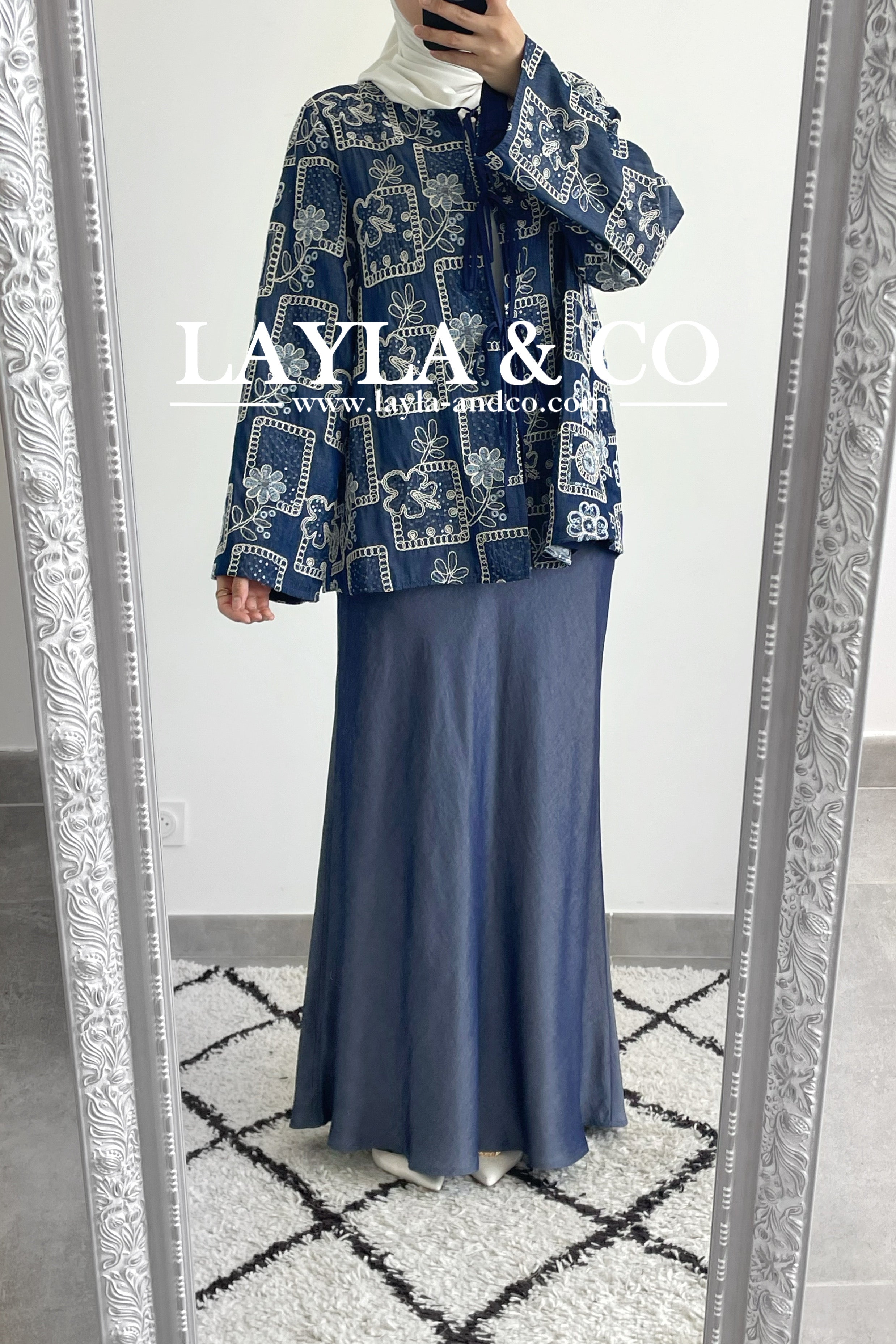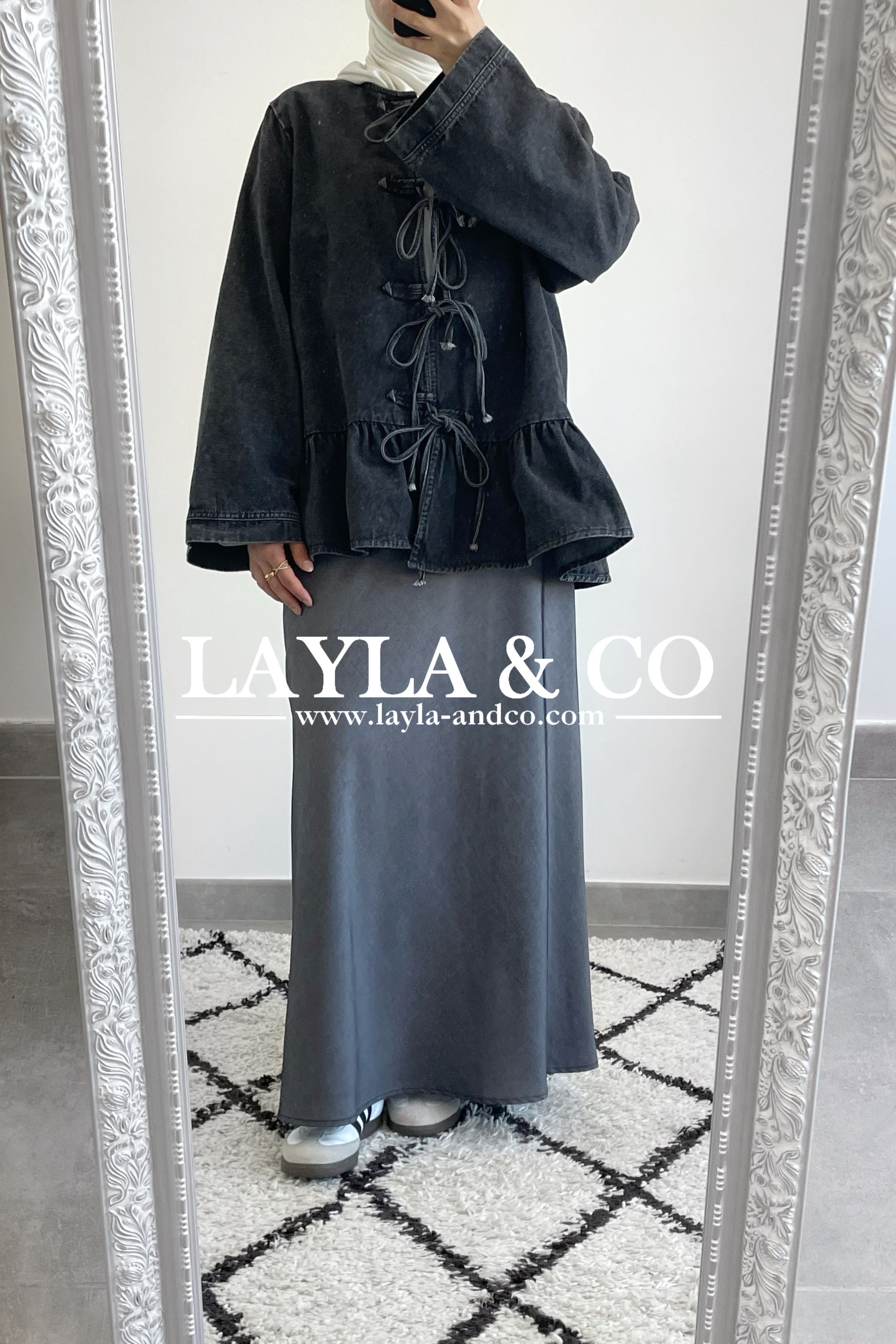 Jupe sirène effet jean, tissu composé à 70% de coton. La jupe dispose d’un élastique à la taille. La coupe est ajustée aux hanches, se porte idéalement avec un haut long ou kimono par dessus.