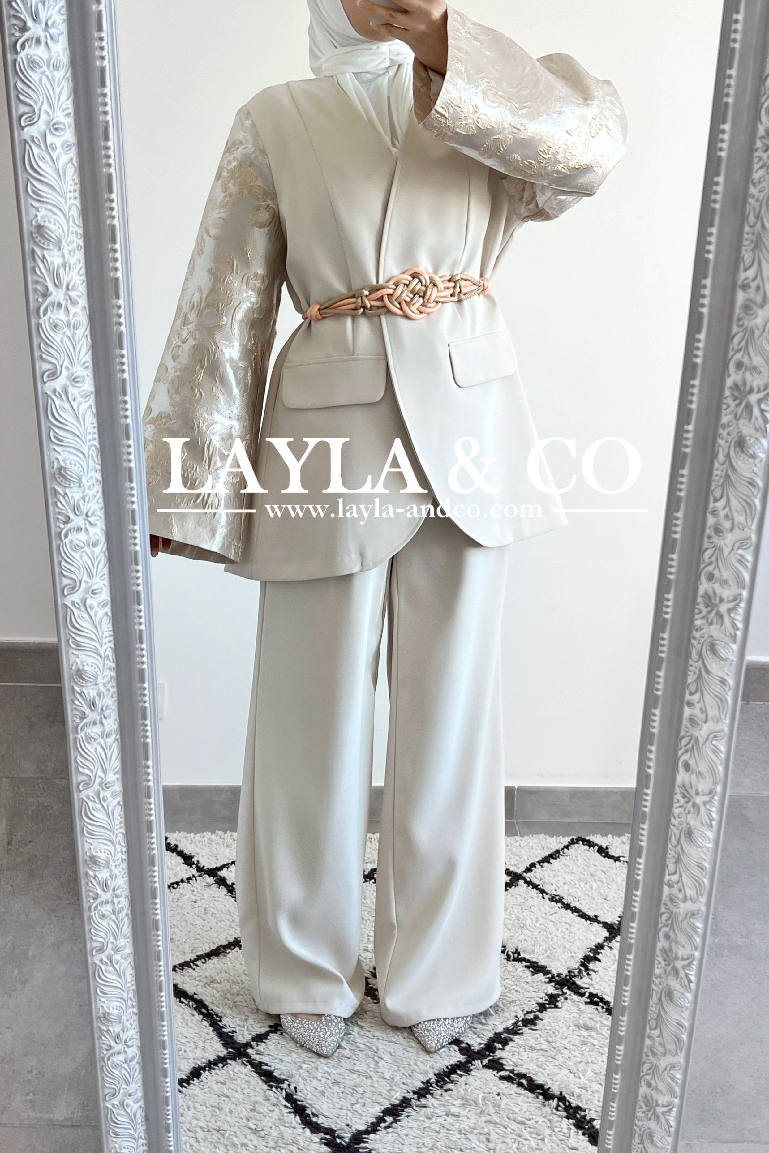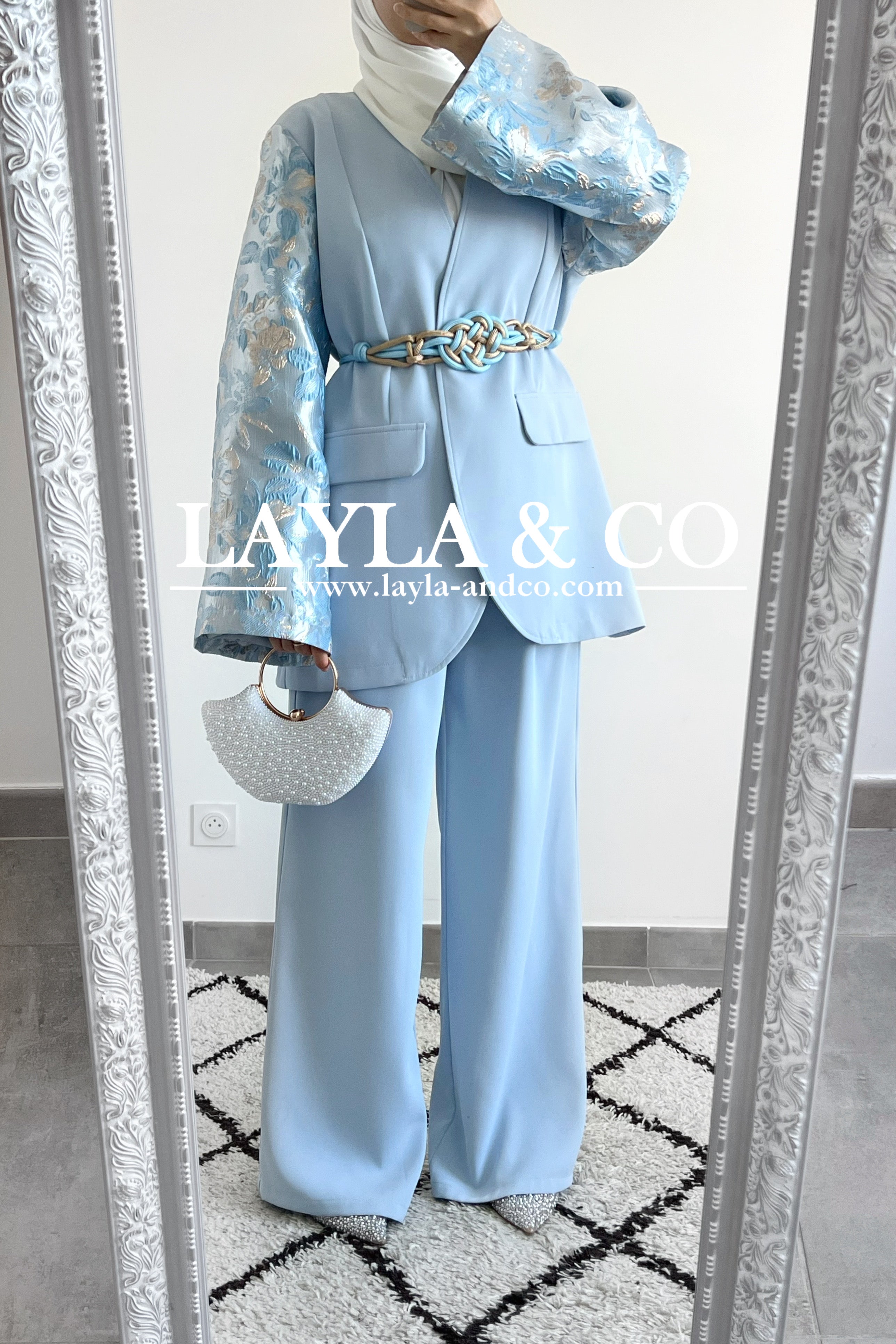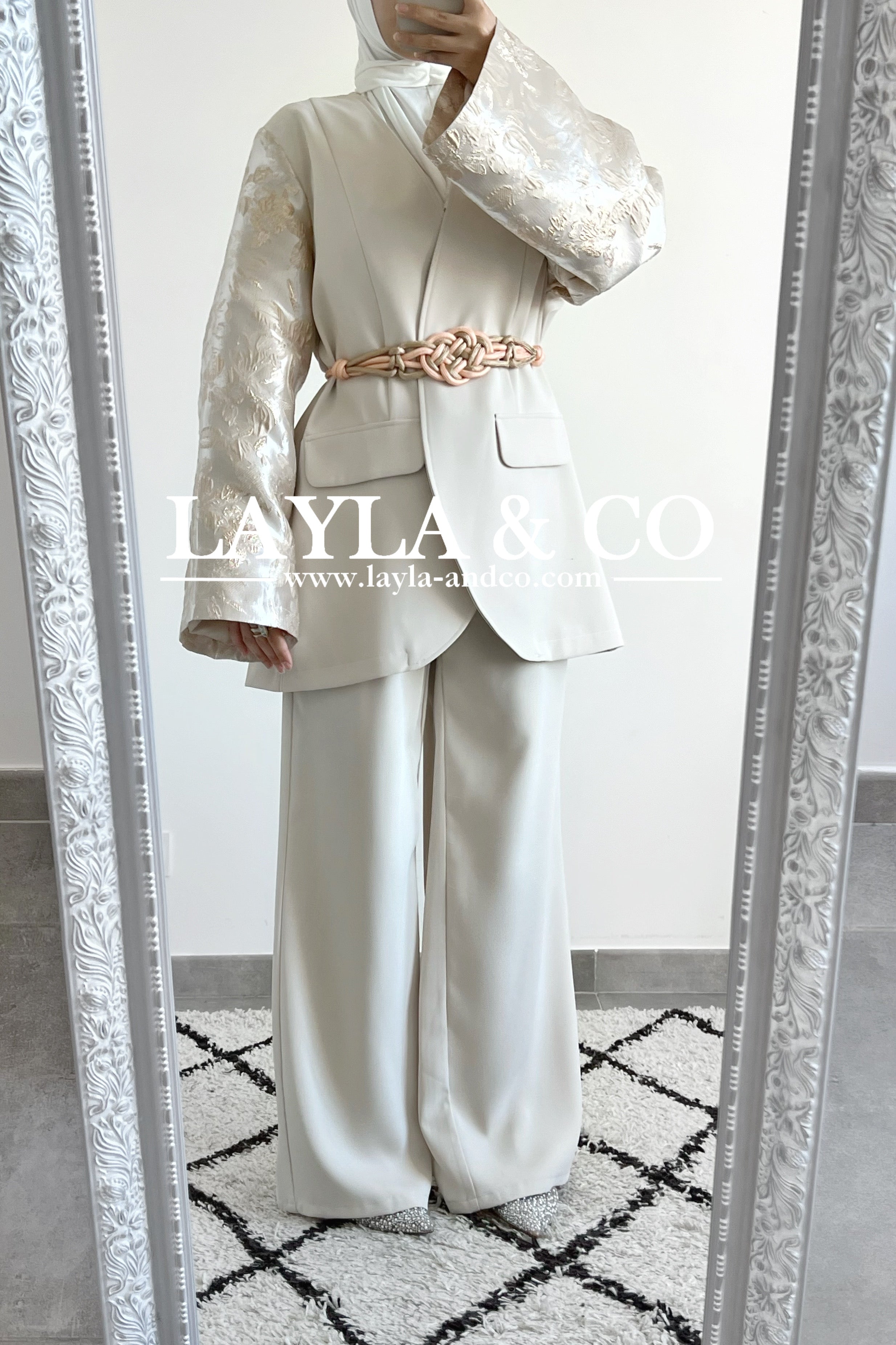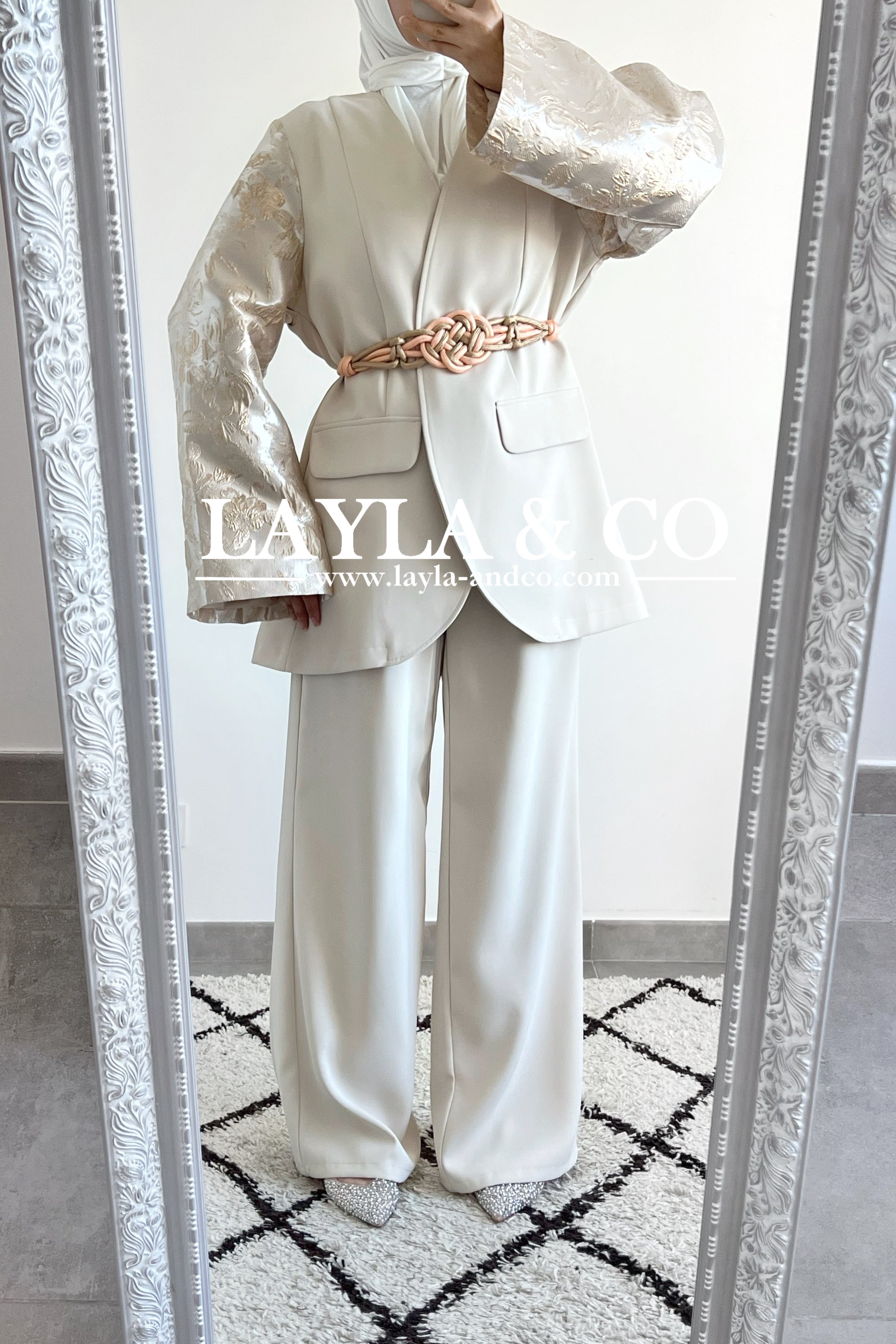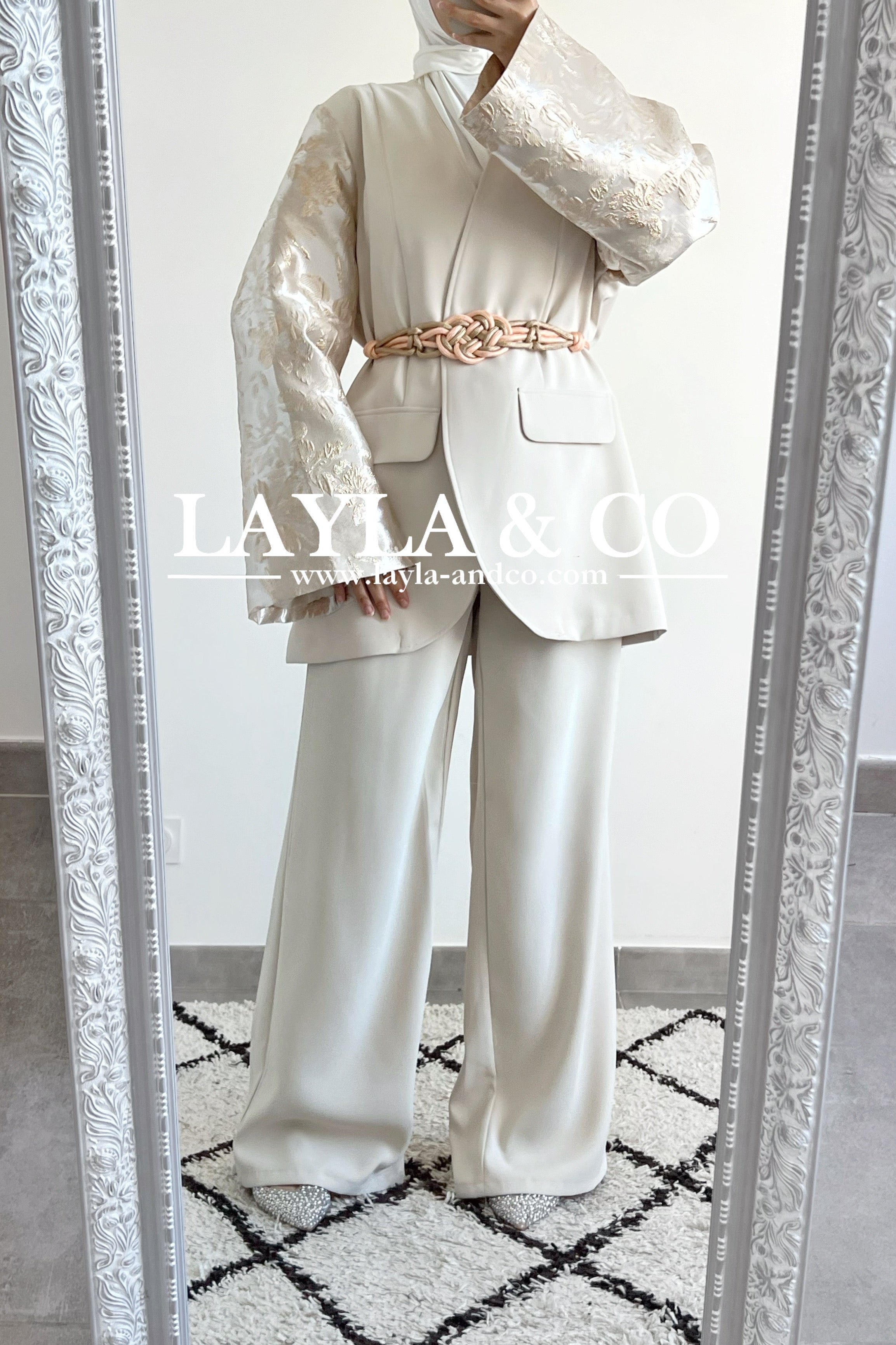 Ensemble 2 pièces composé d’un blazer manches brocart et d’un pantalon large. Une ceinture cordon style caftan est assortie avec la tenue.