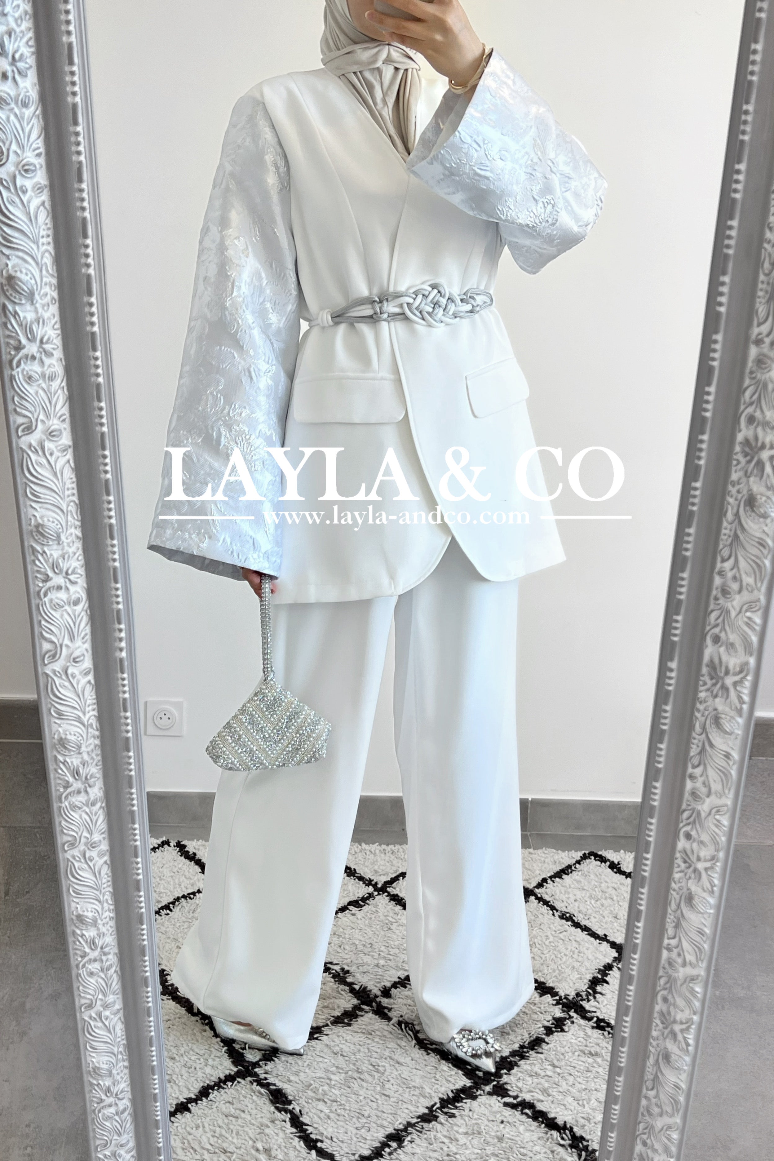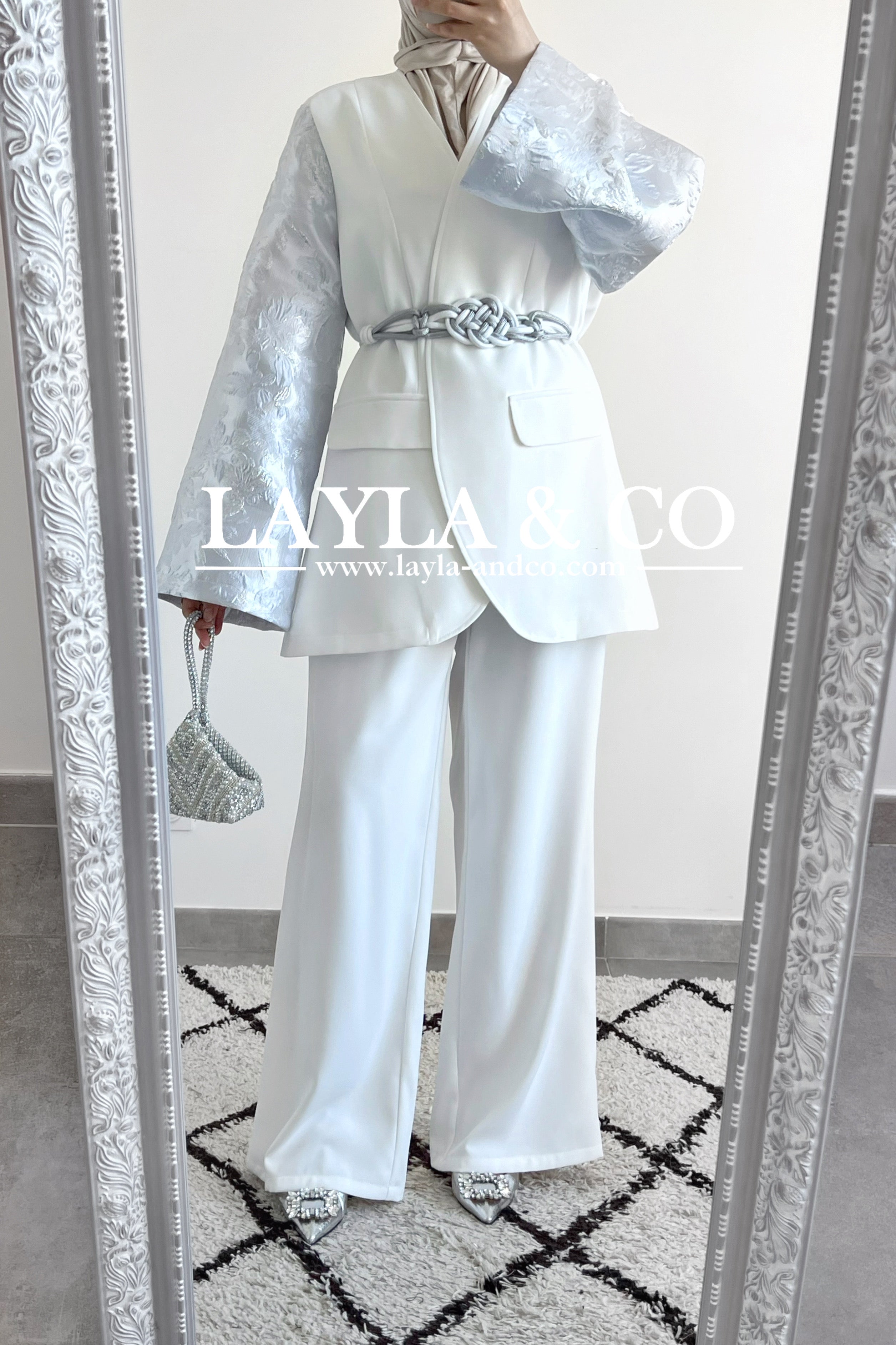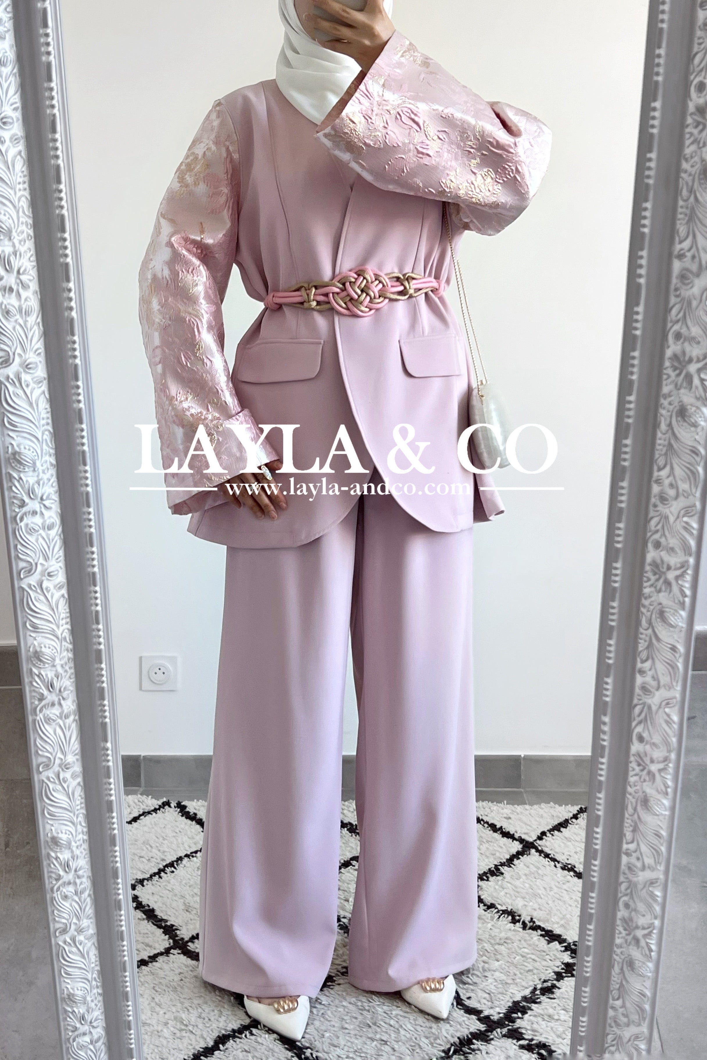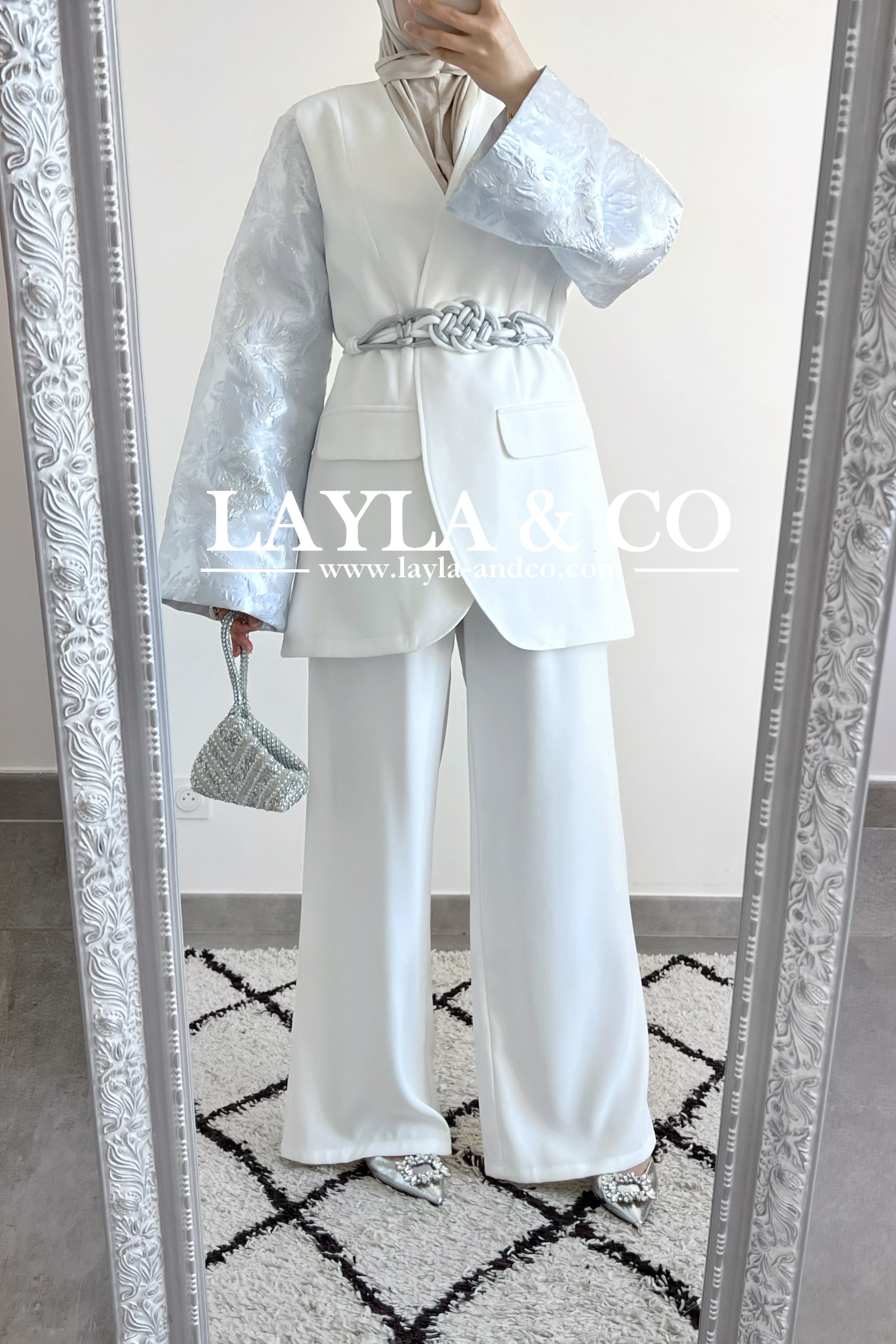 Ensemble 2 pièces composé d’un blazer manches brocart et d’un pantalon large. Une ceinture cordon style caftan est assortie avec la tenue.