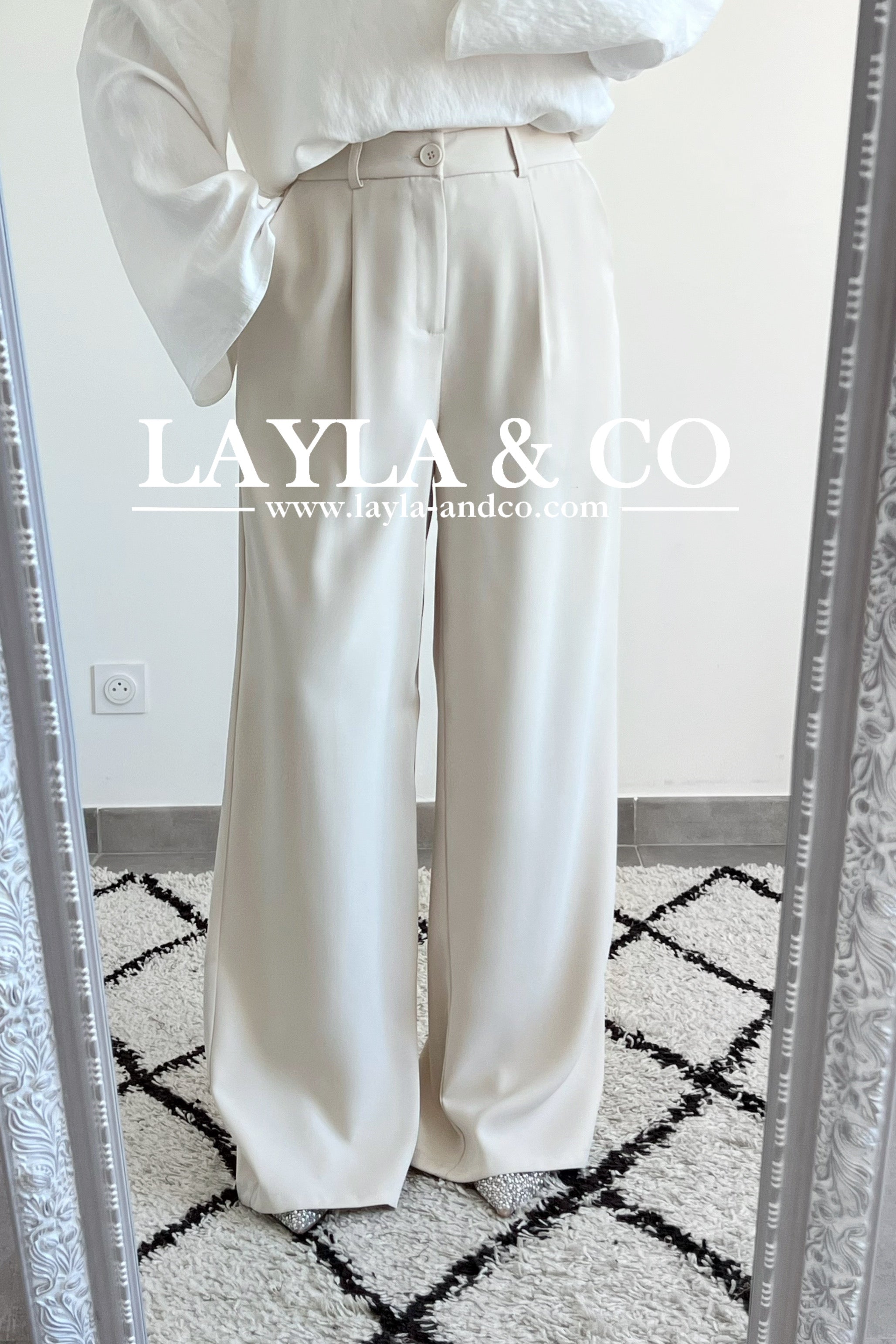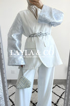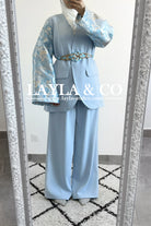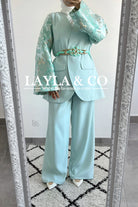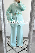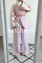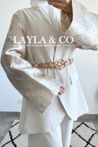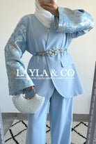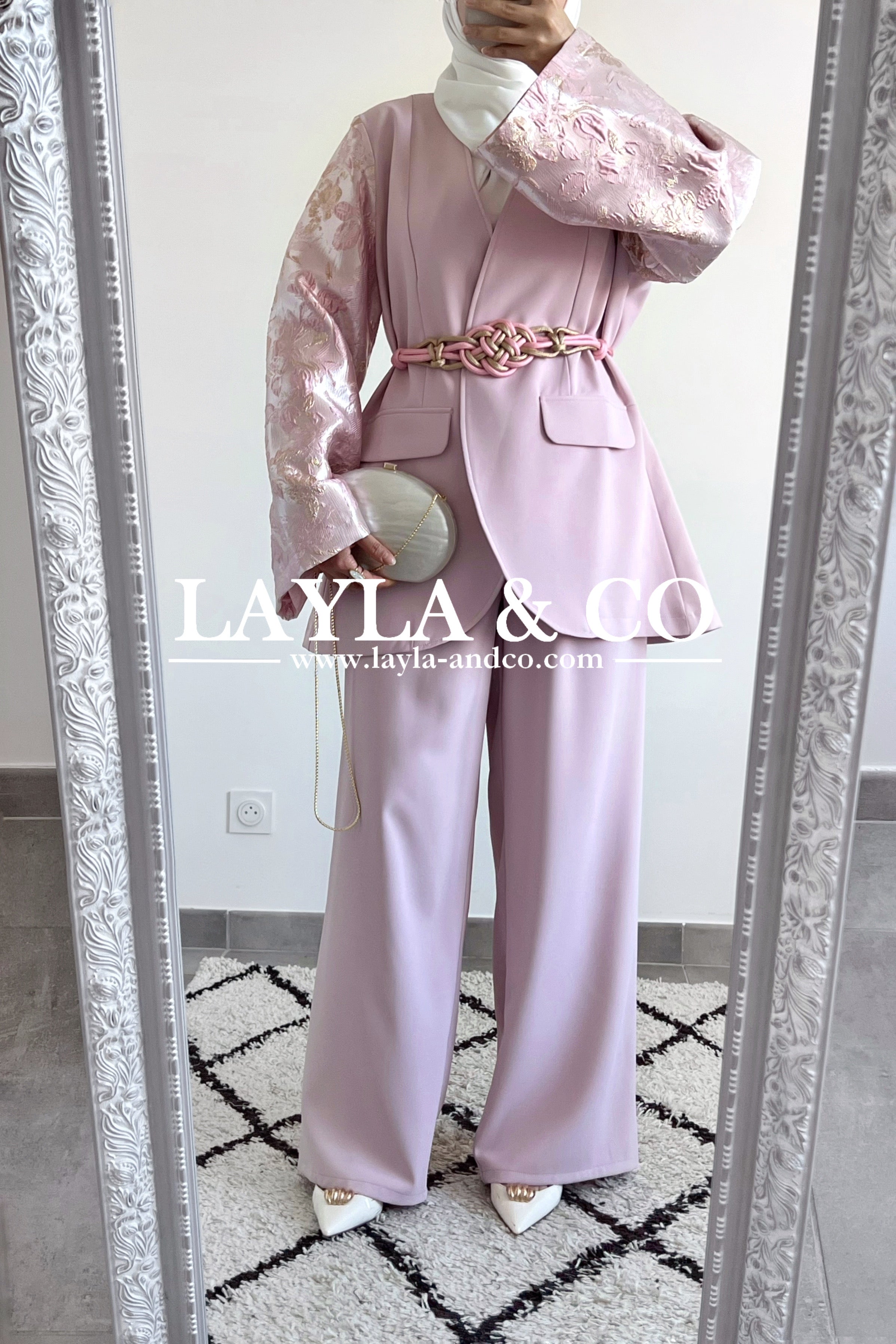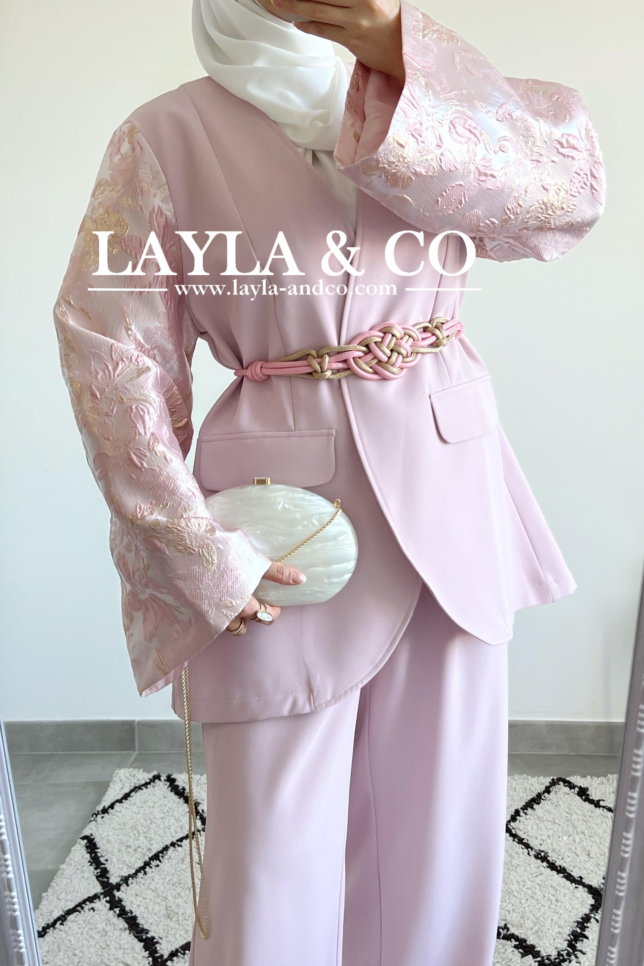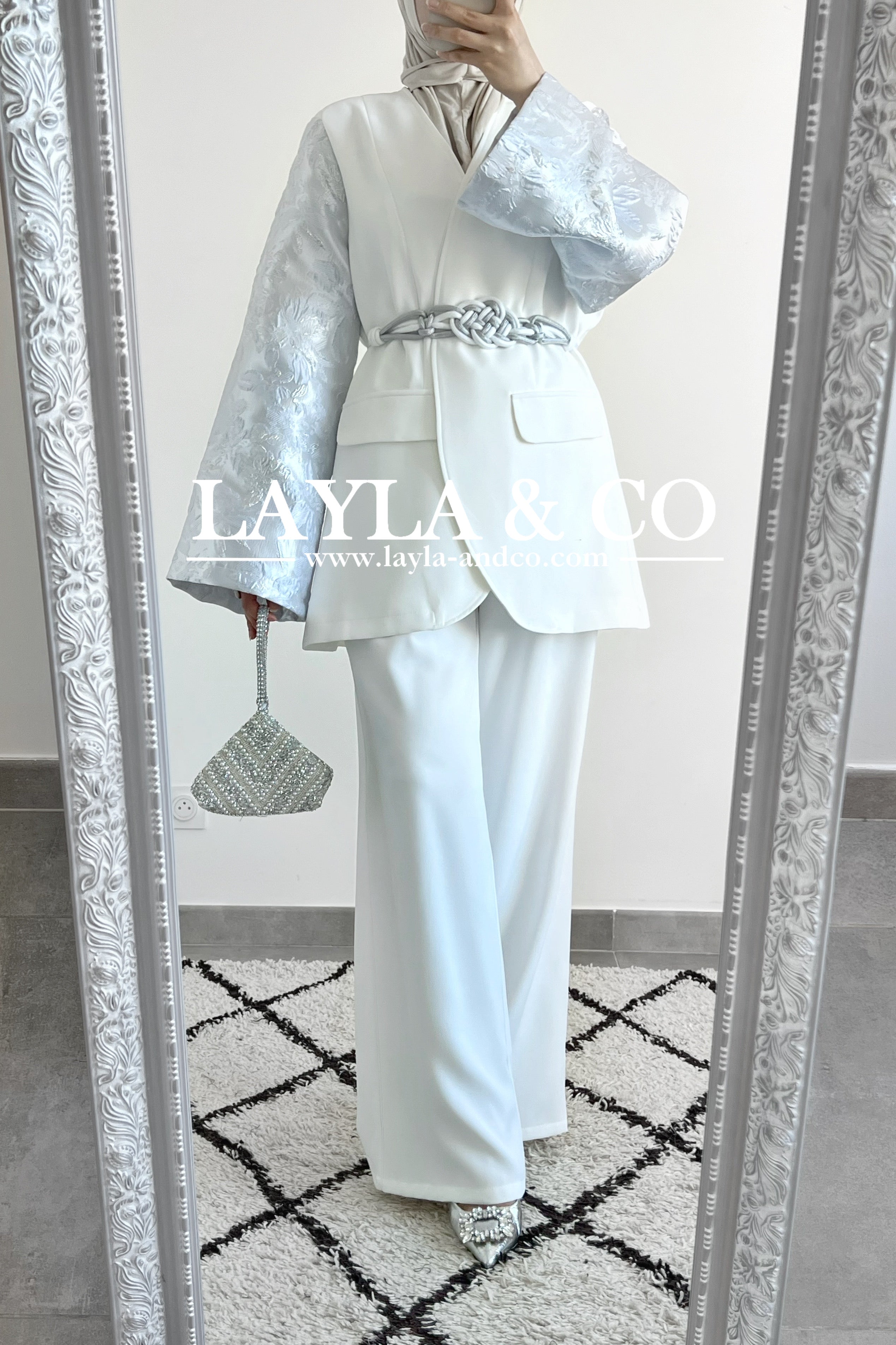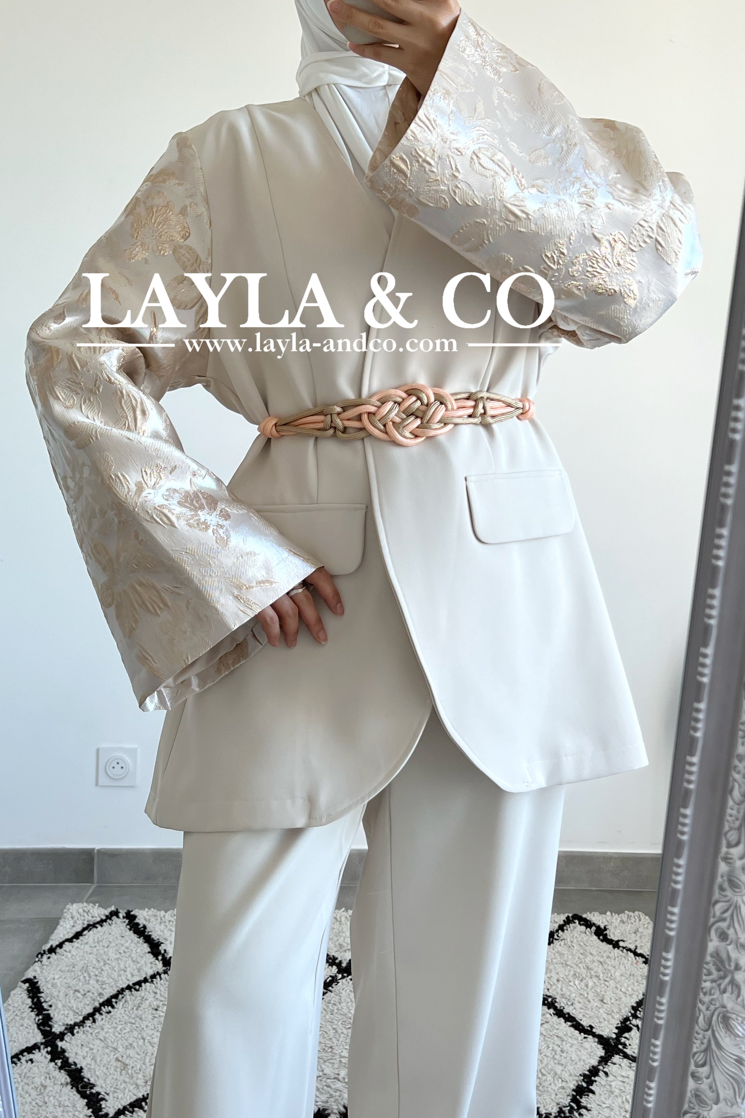 Ensemble 2 pièces composé d’un blazer manches brocart et d’un pantalon large. Une ceinture cordon style caftan est assortie avec la tenue.